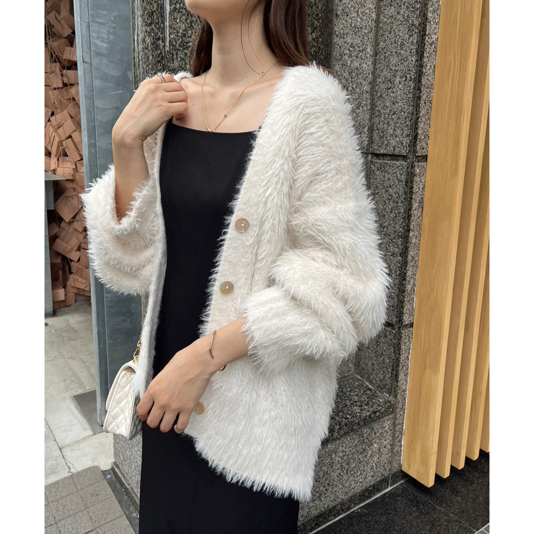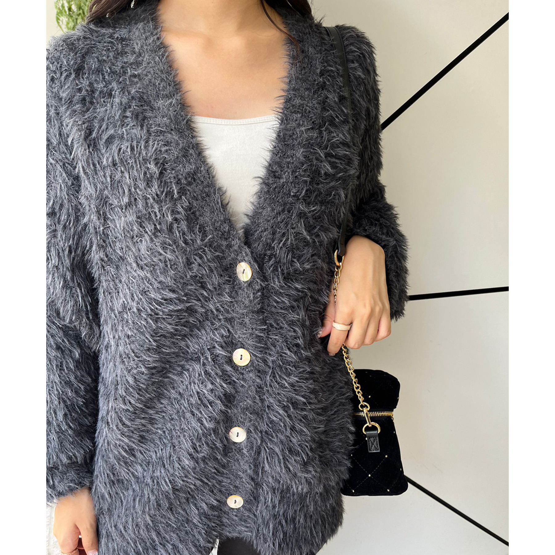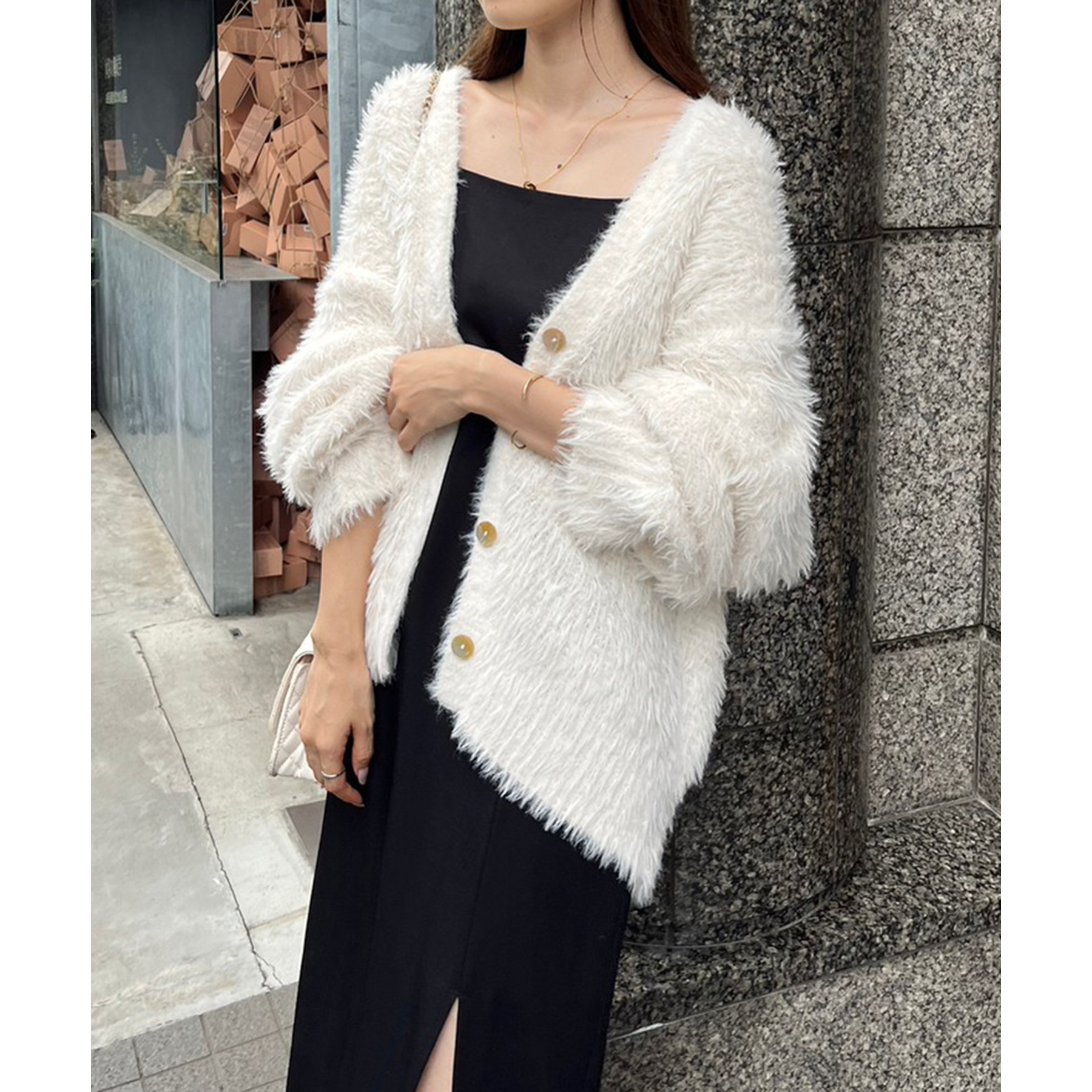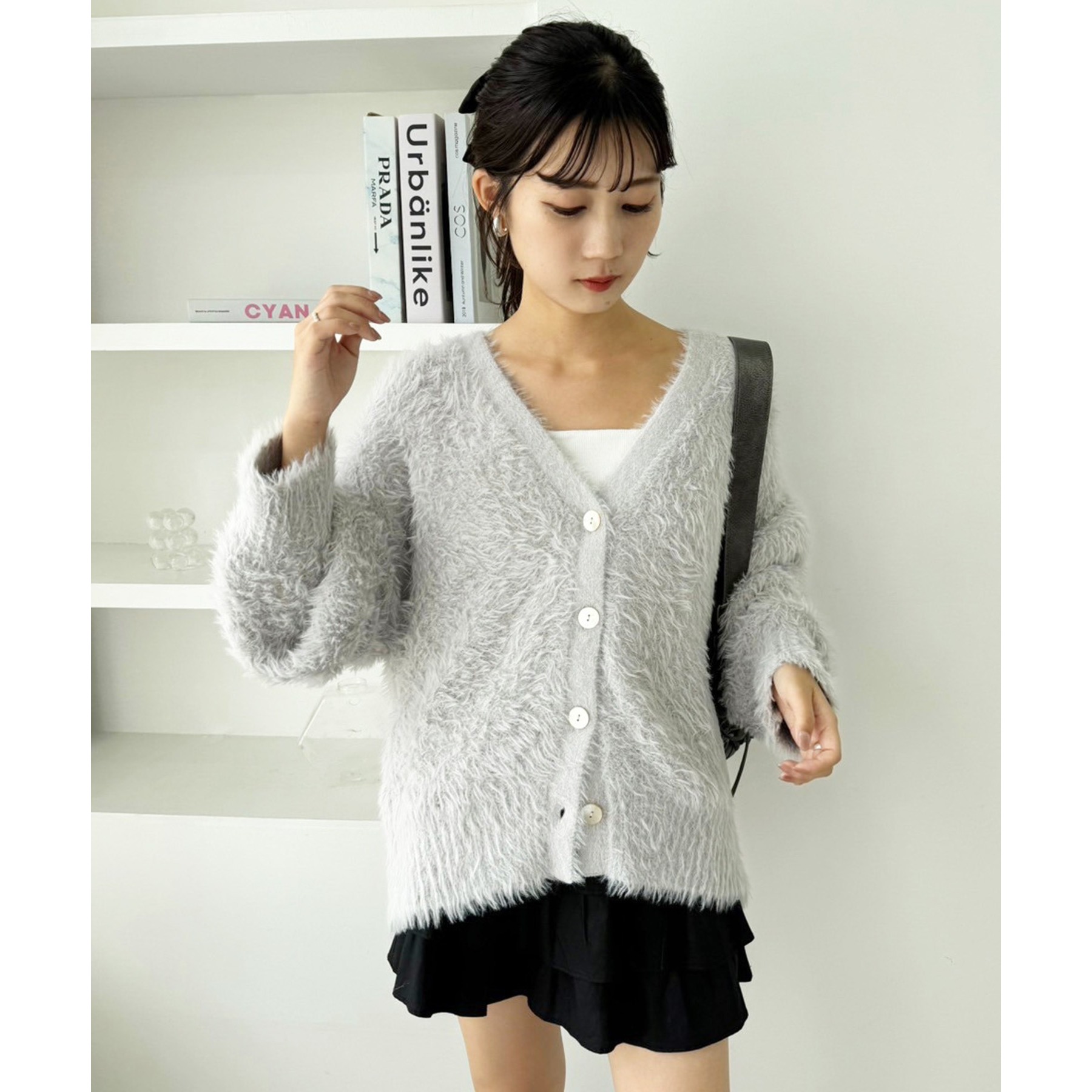 柔らかい毛足のフェザーを使ったナイスクラップらしいニットカーディガン。