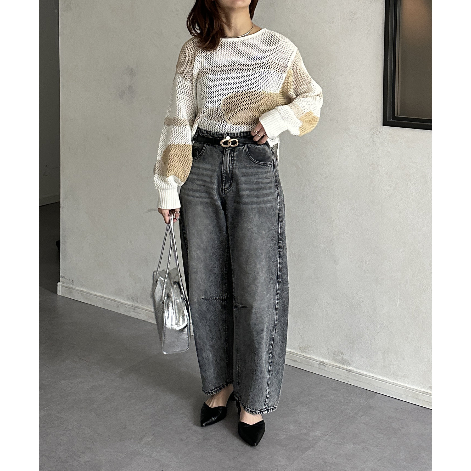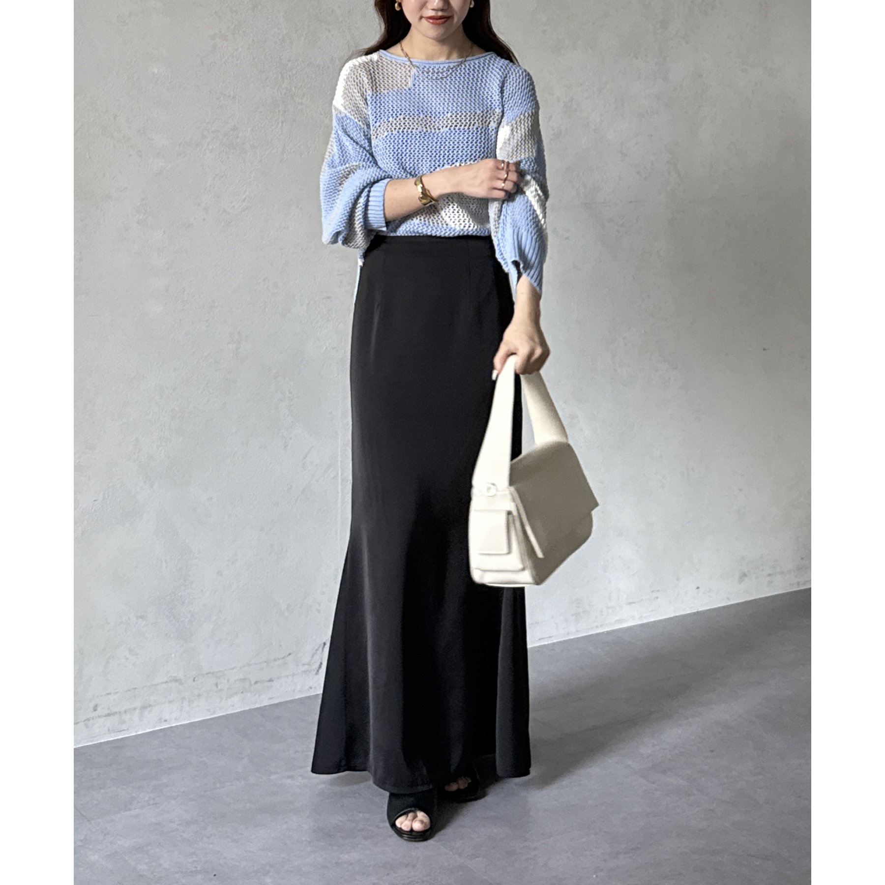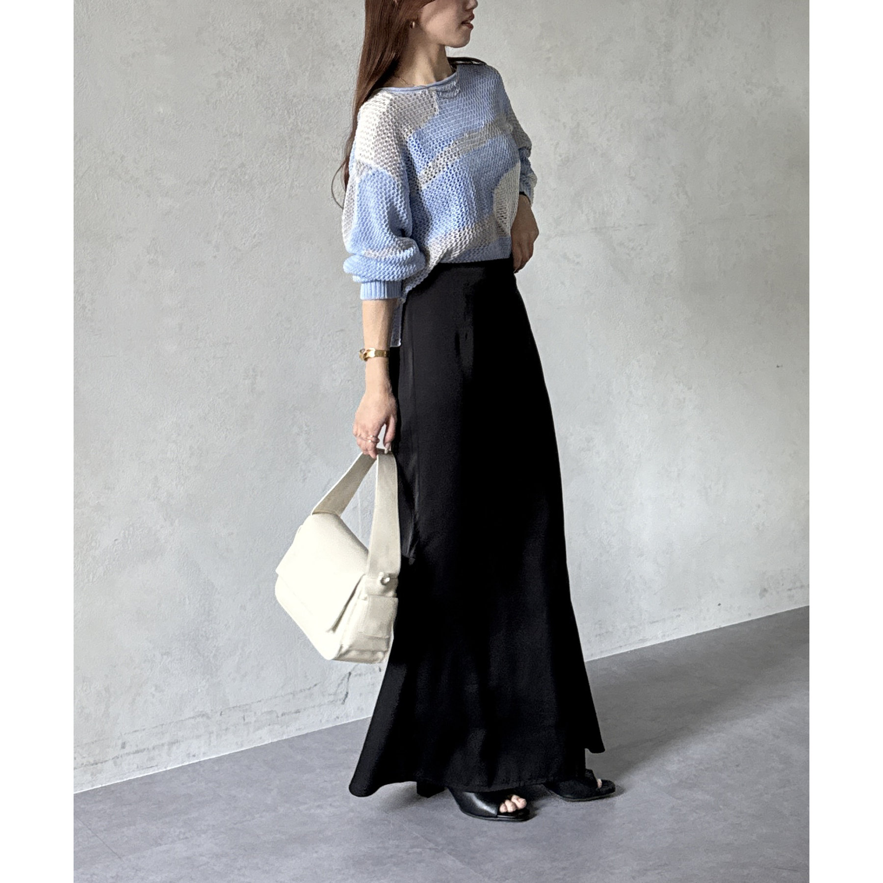 1枚で華やかなニットなので、ボトムスはシンプルなものを