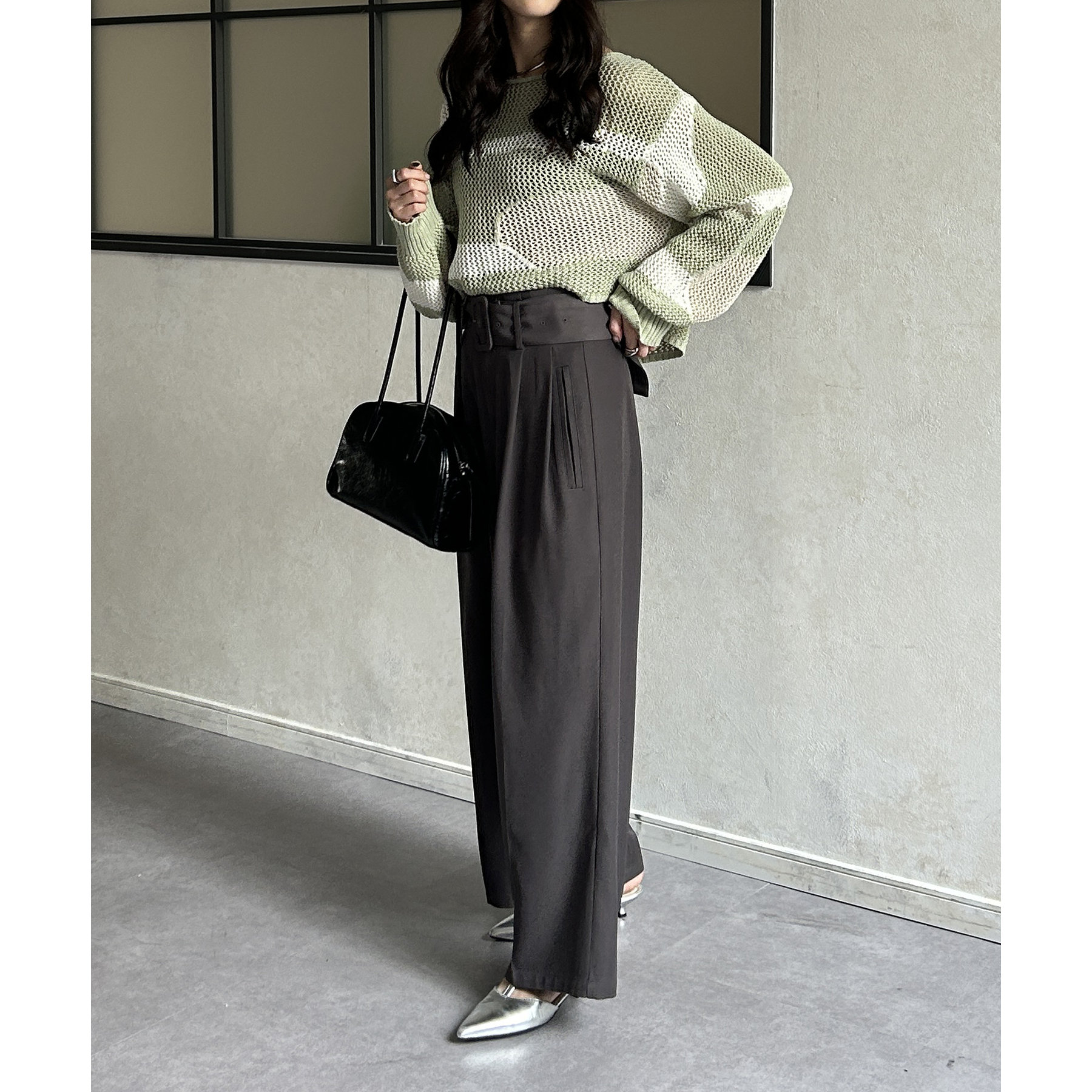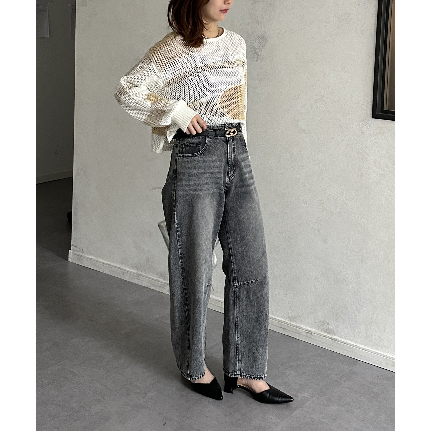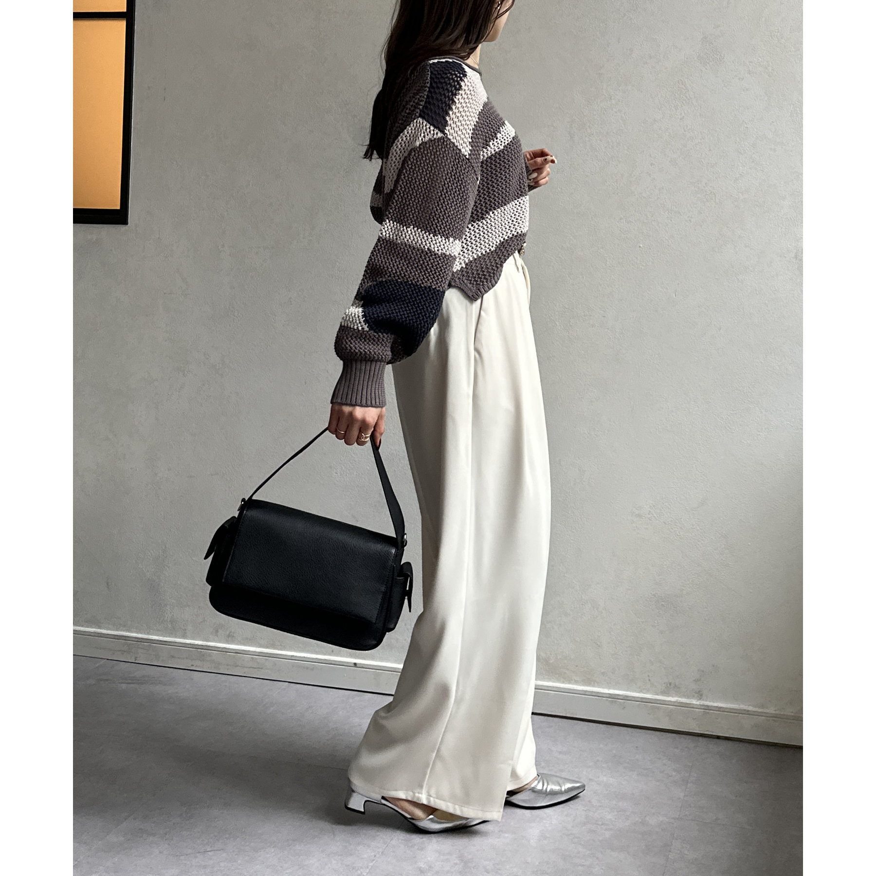 1枚で華やかなニットなので、ボトムスはシンプルなものを