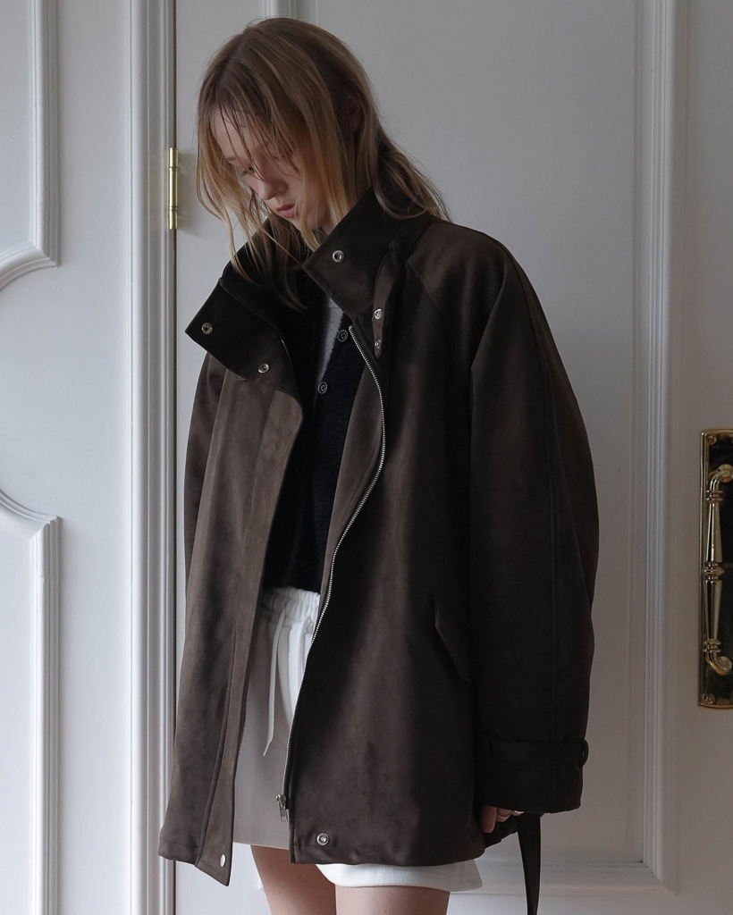 ネックと袖のストラップディテールにより、シルエットの調整が可能で、防寒性も高めています。