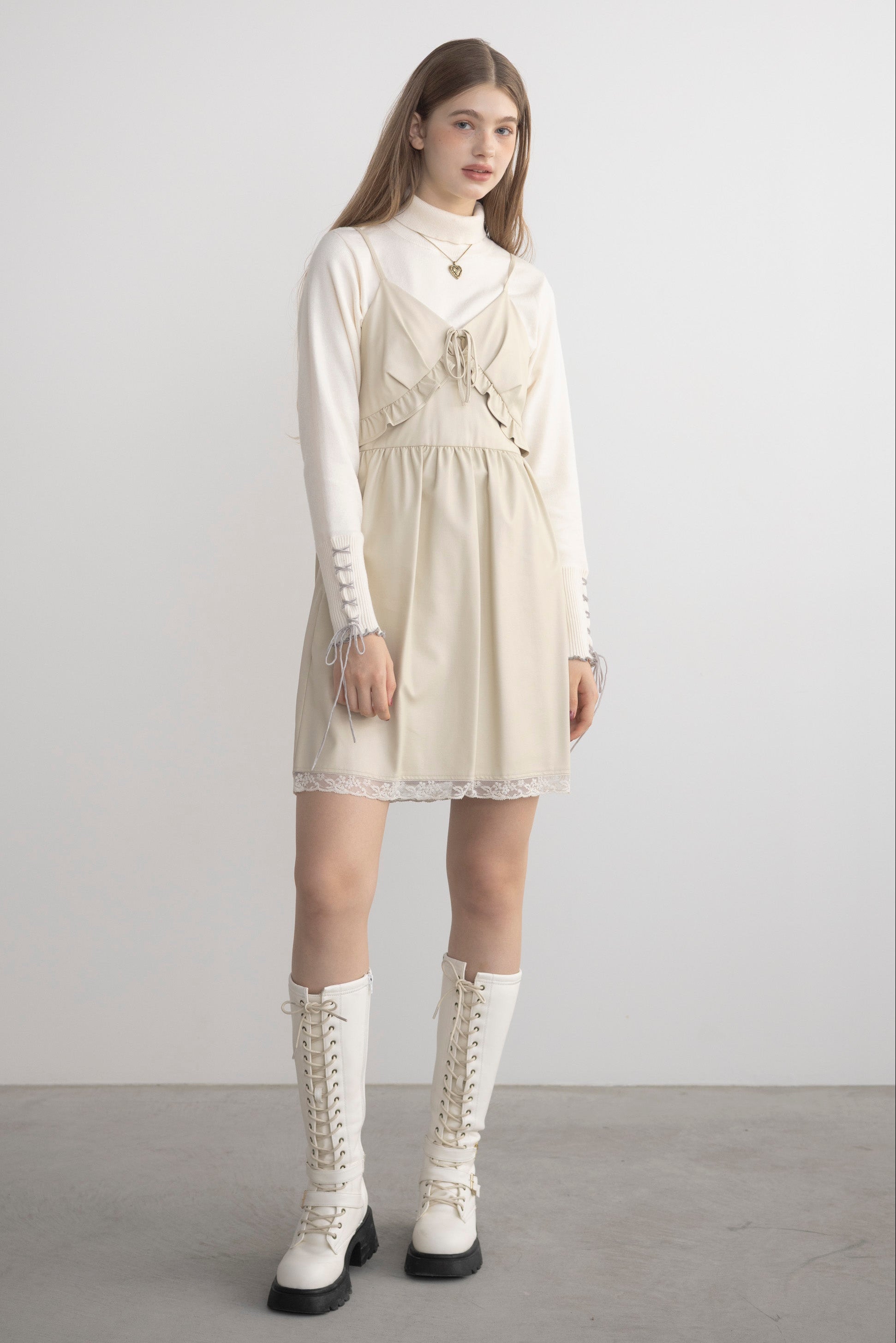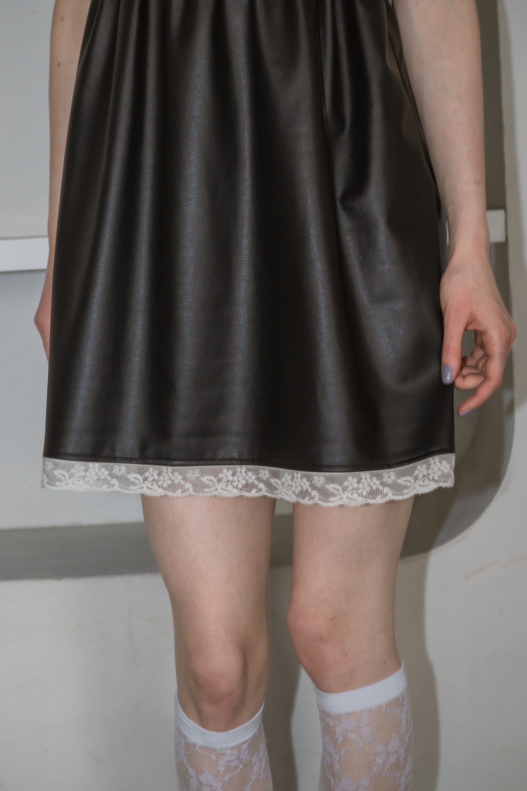 フリル&レースがアクセントの レザーミニワンピ。