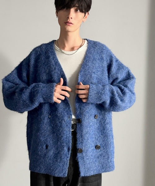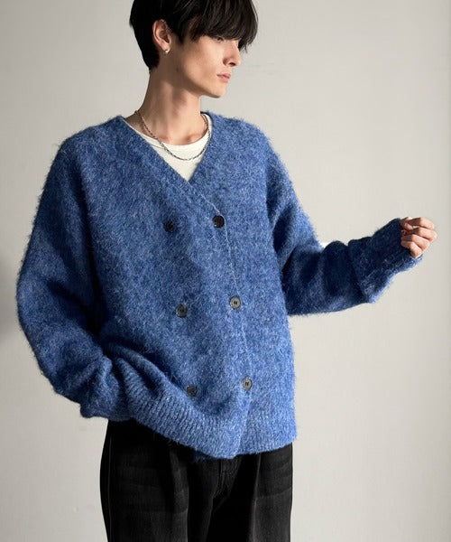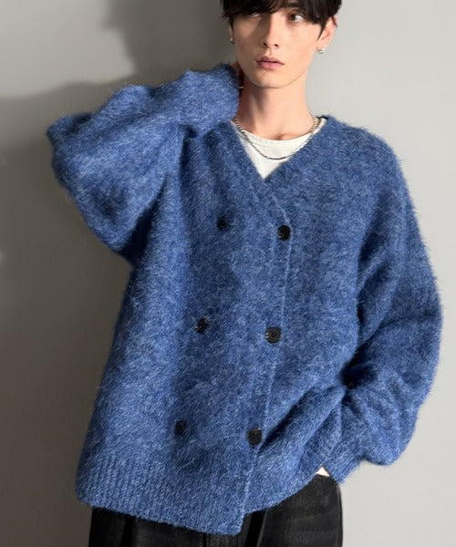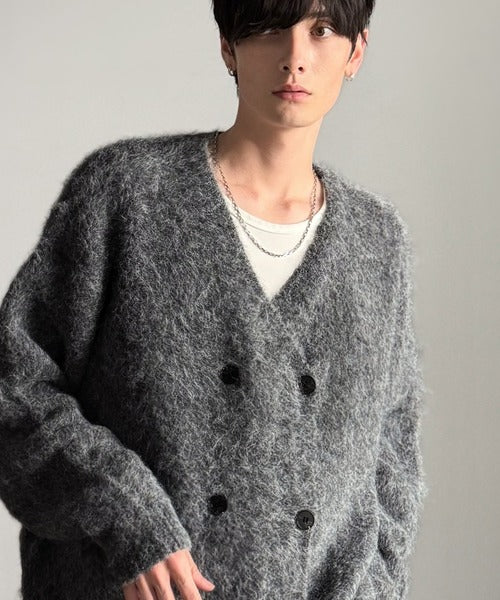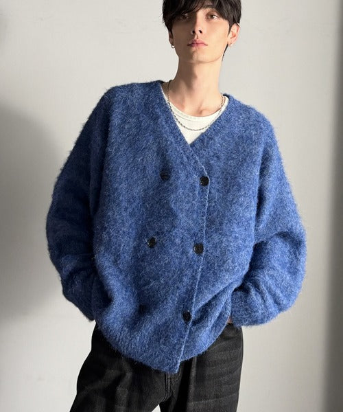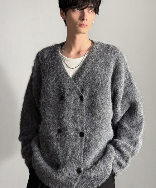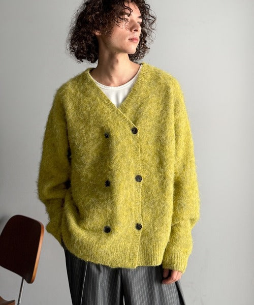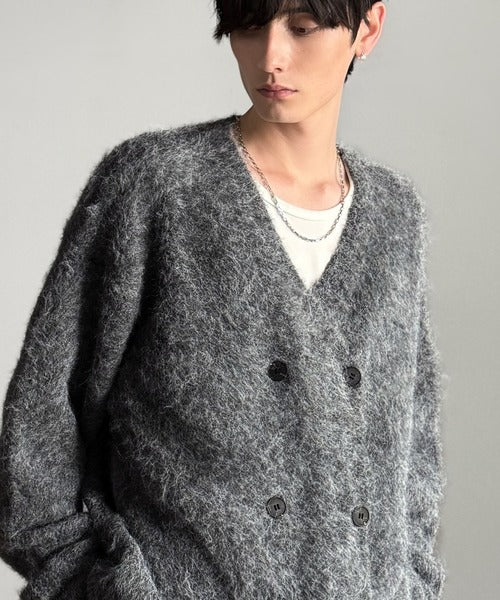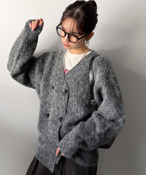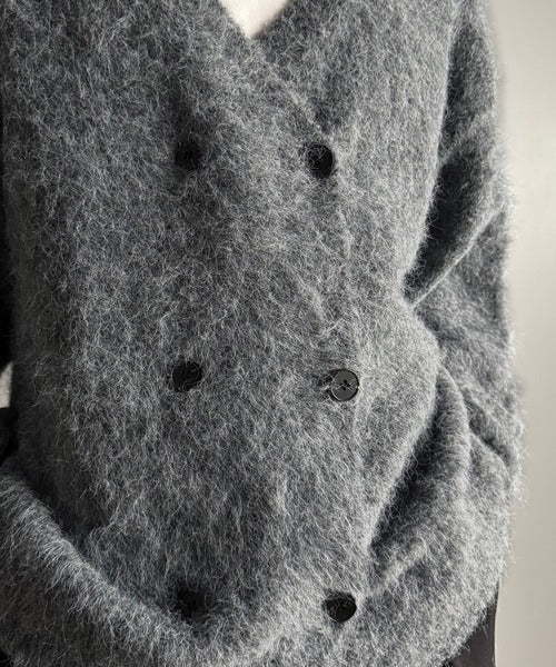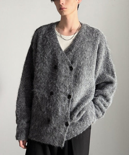 ミックスシャギー素材を使用した、ダブルテーラード仕立てのニットカーディガン。