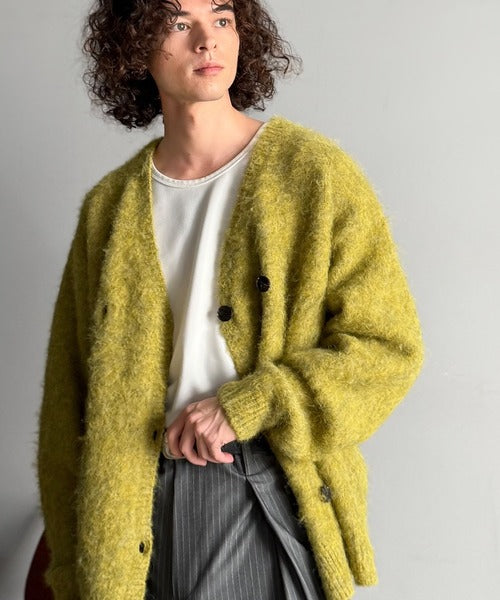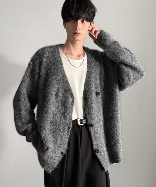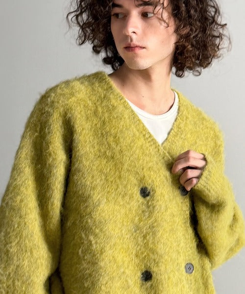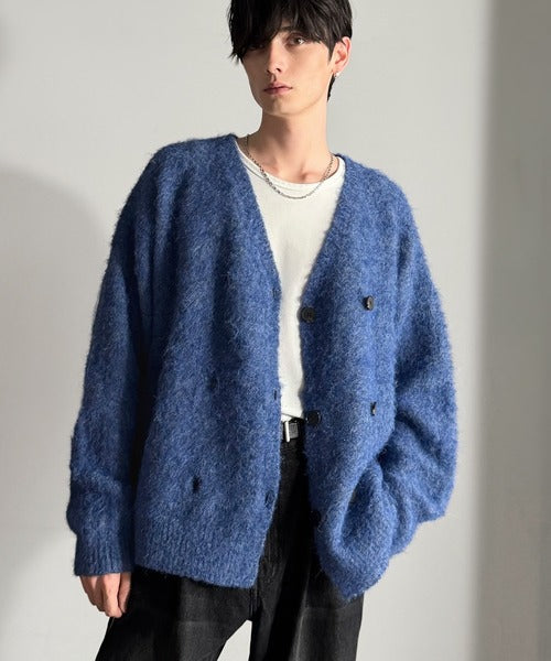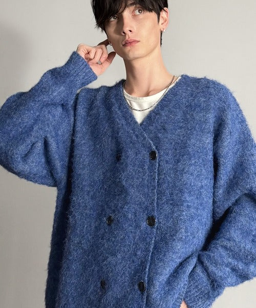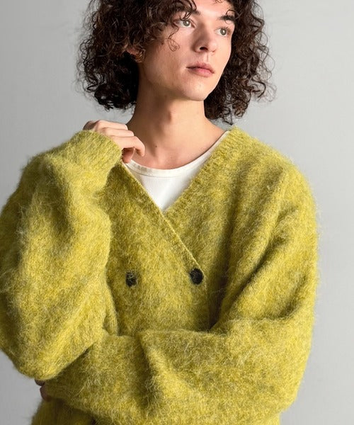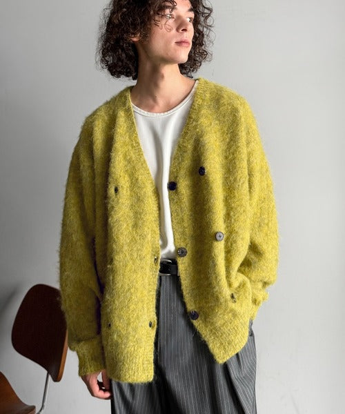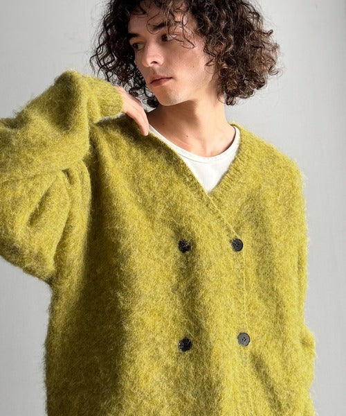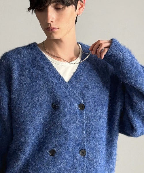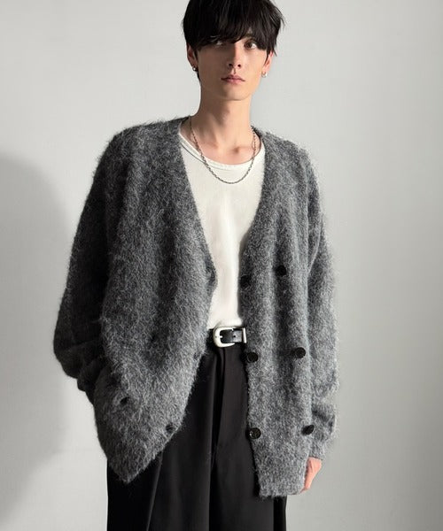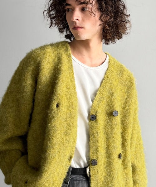 ミックスシャギー素材を使用した、ダブルテーラード仕立てのニットカーディガン。