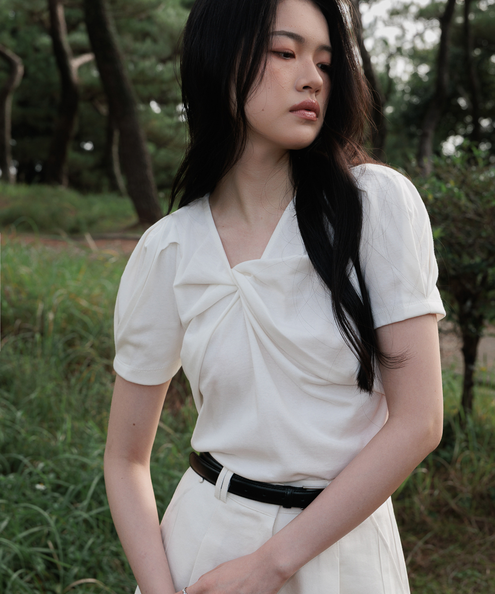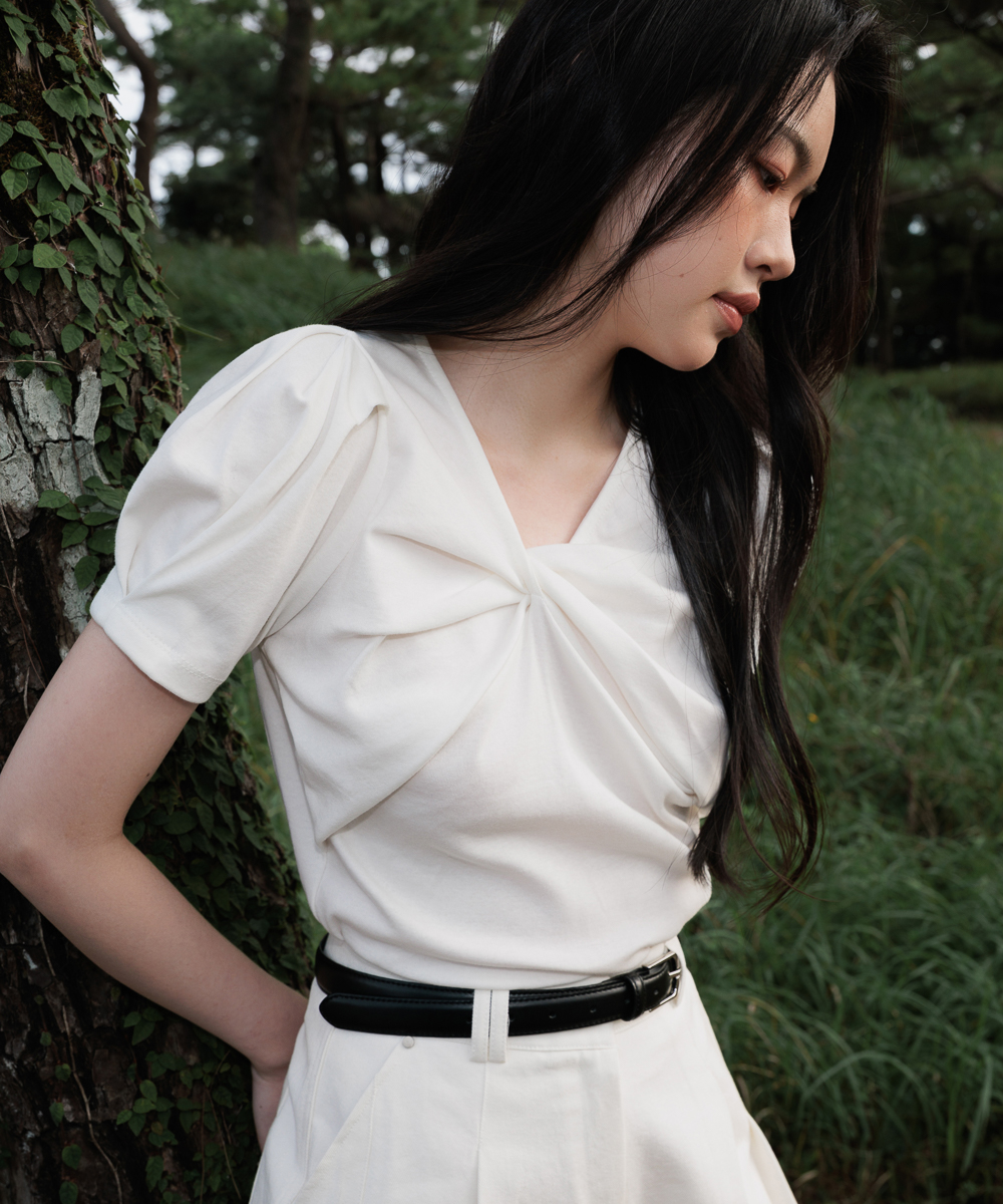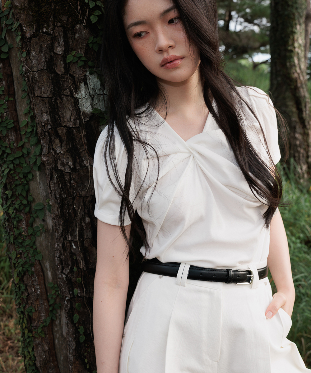 ネックラインのツイストディテールが際立つ半袖Tシャツです。