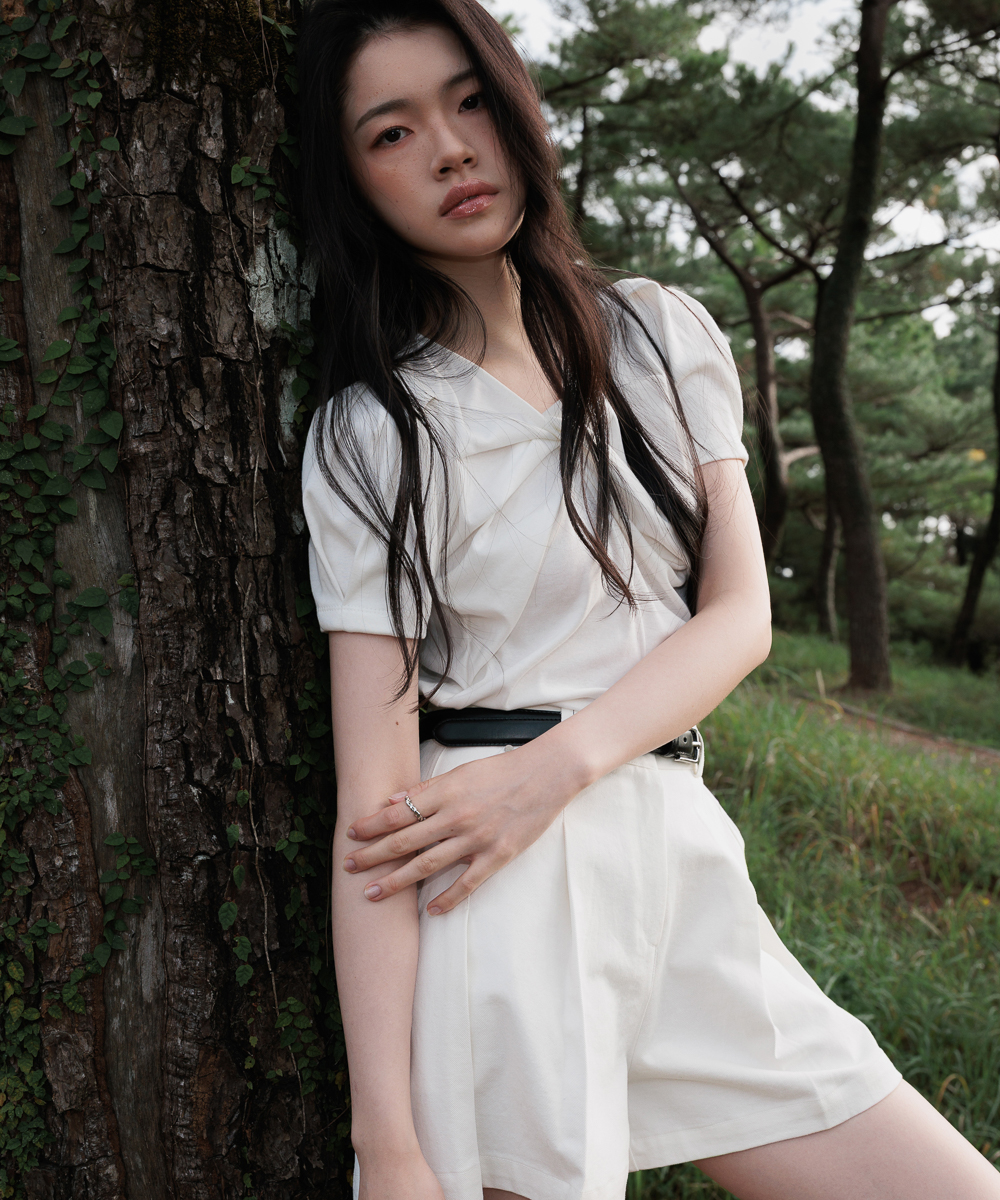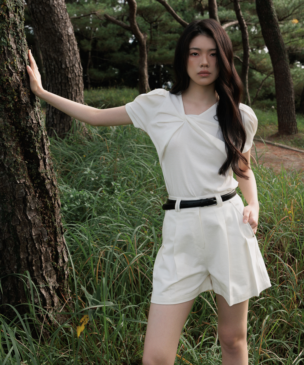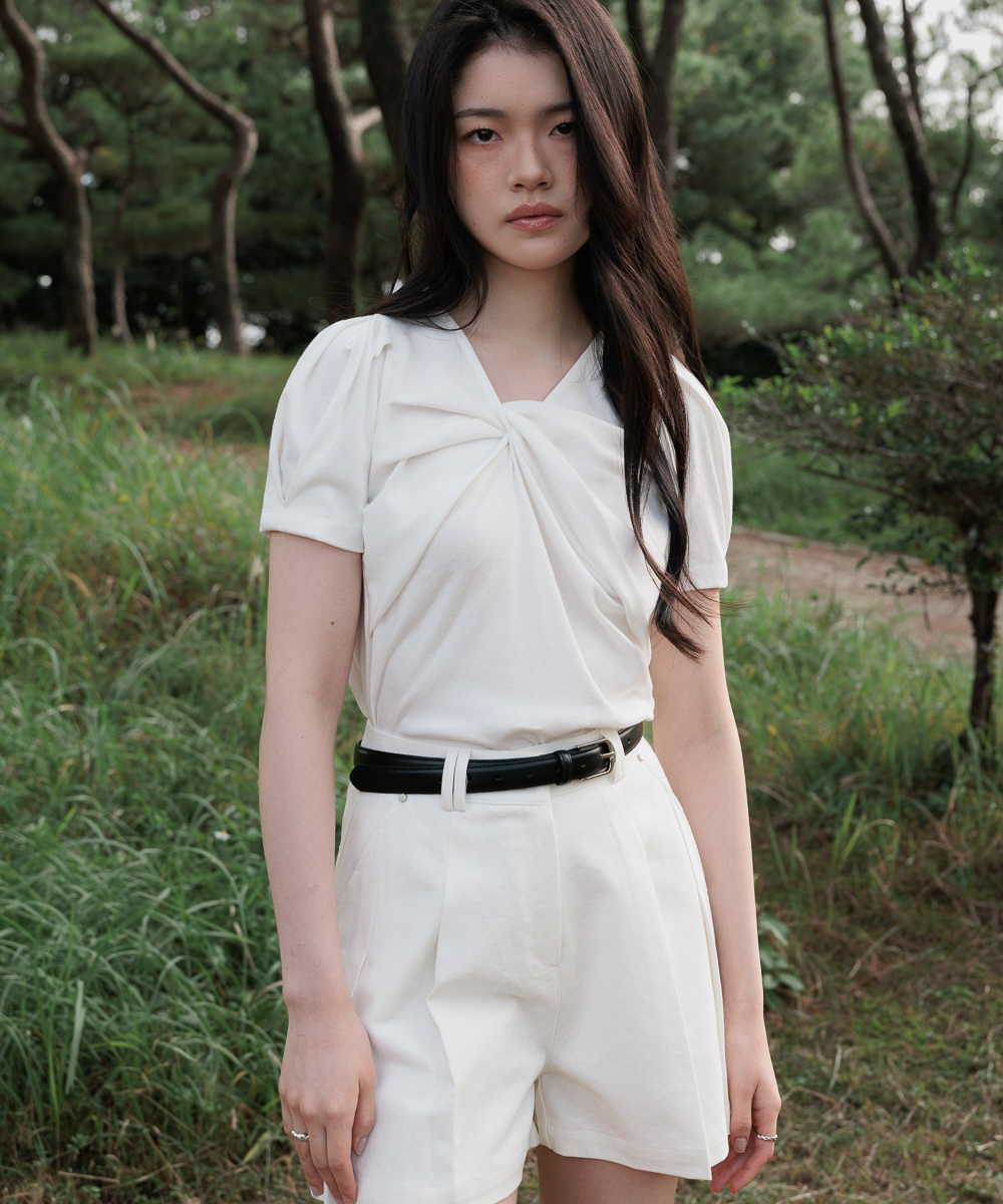 ネックラインのツイストディテールが際立つ半袖Tシャツです。