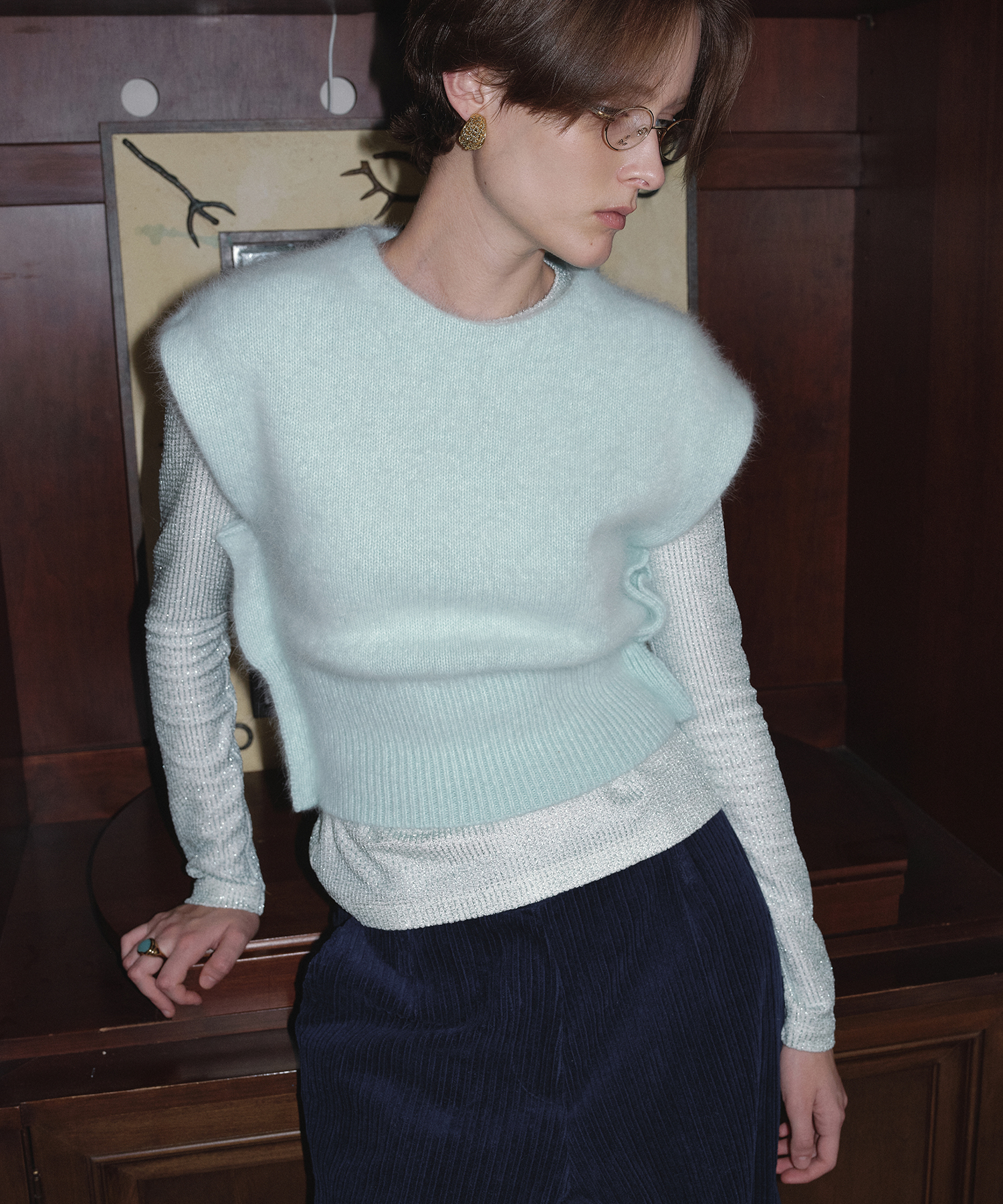 ミニマルなシルエットに素材感が際立つデザインで、温かみのあるアイボリーカラーの上にアイシーミントトーンのメタル糸がミックスされたユニークなニット混紡生地を使用しました。