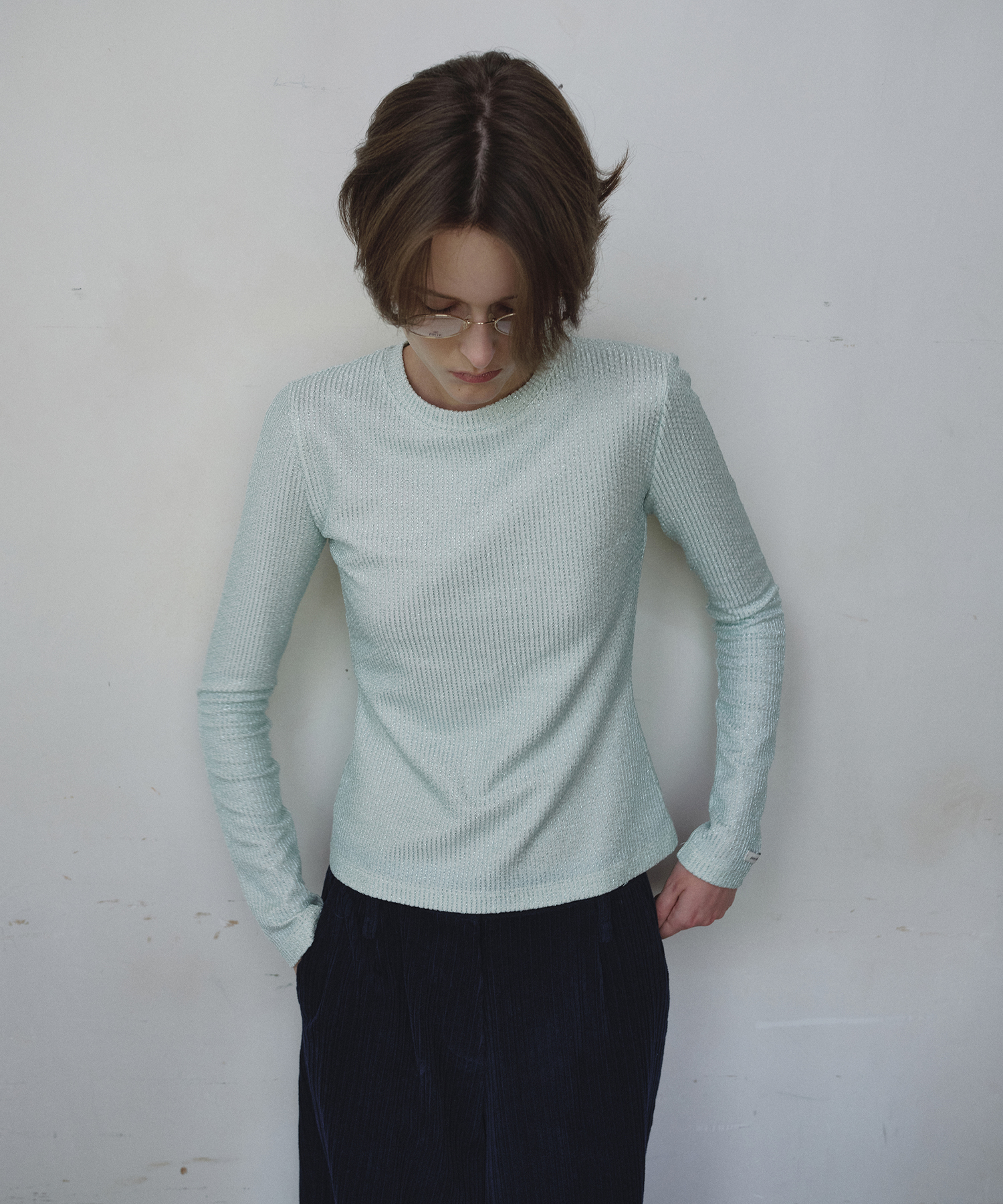 メタル糸のリブ組織感が特徴のグリッターTシャツです。