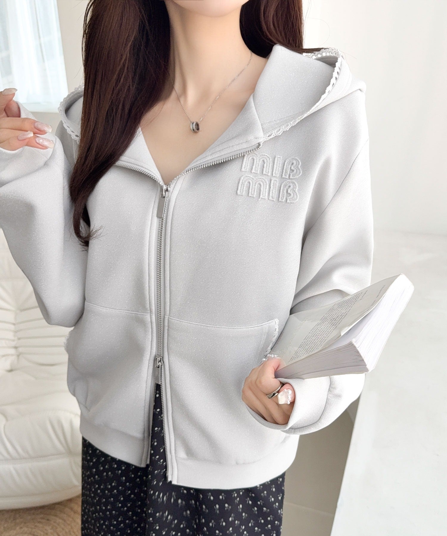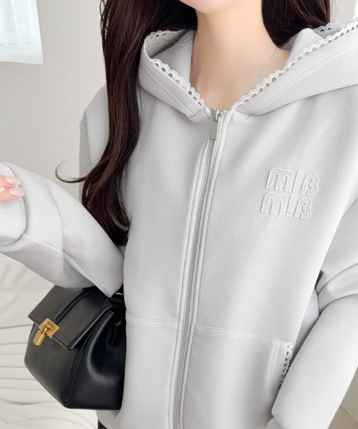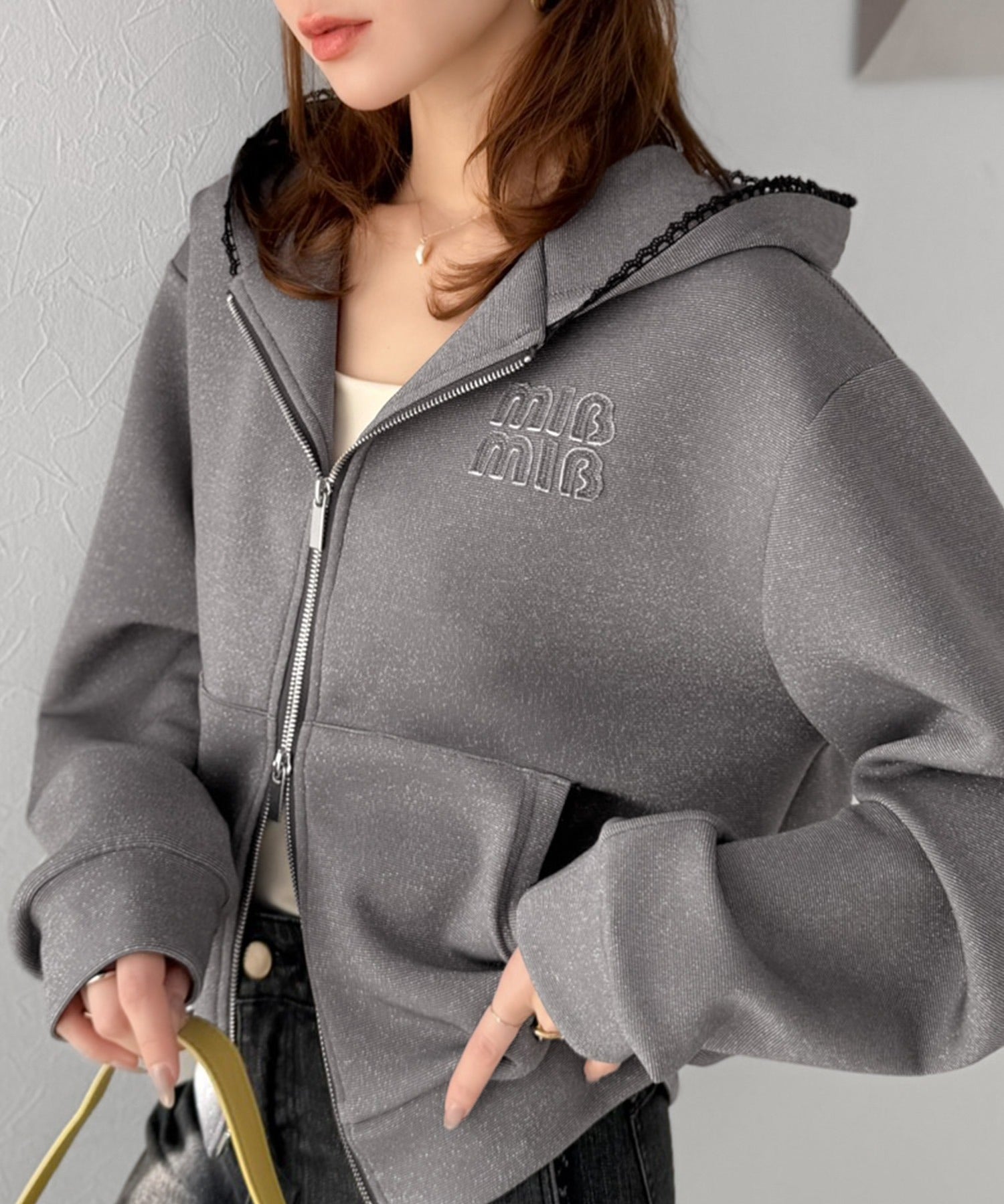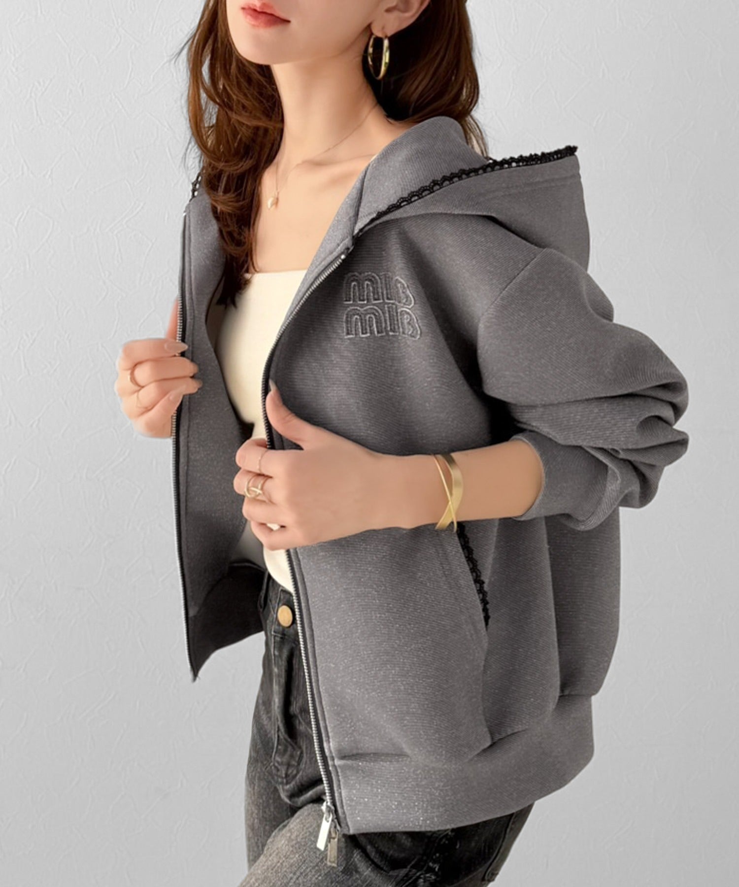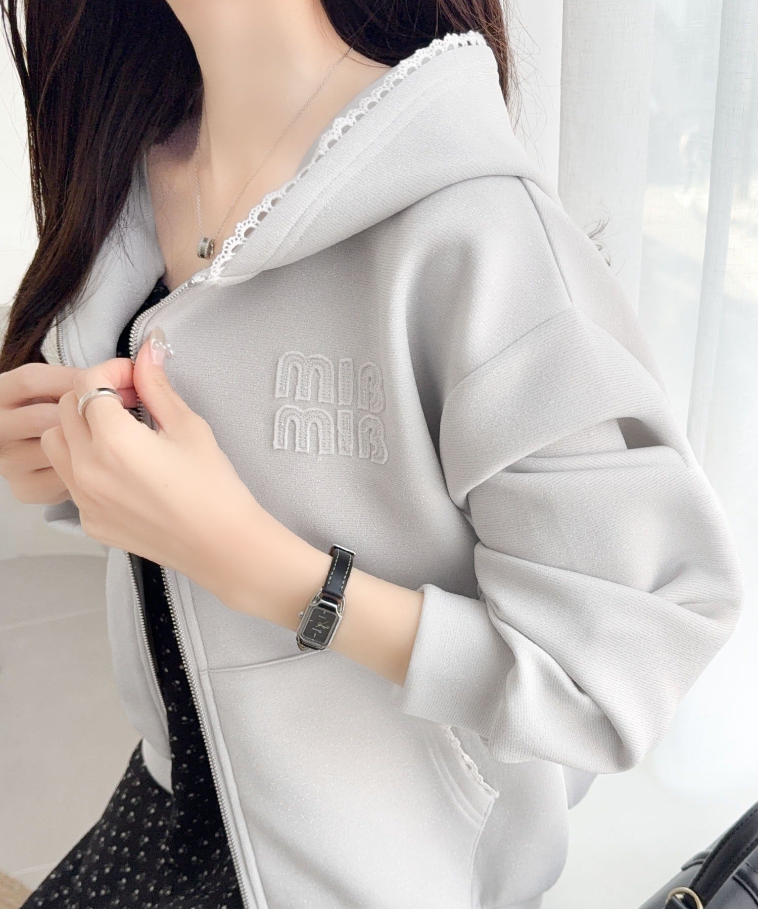 【mily bilet】きらっとラメが映える♪ワッペン付きダブルジップピコレース使いラメパーカー(長袖) mi1329094