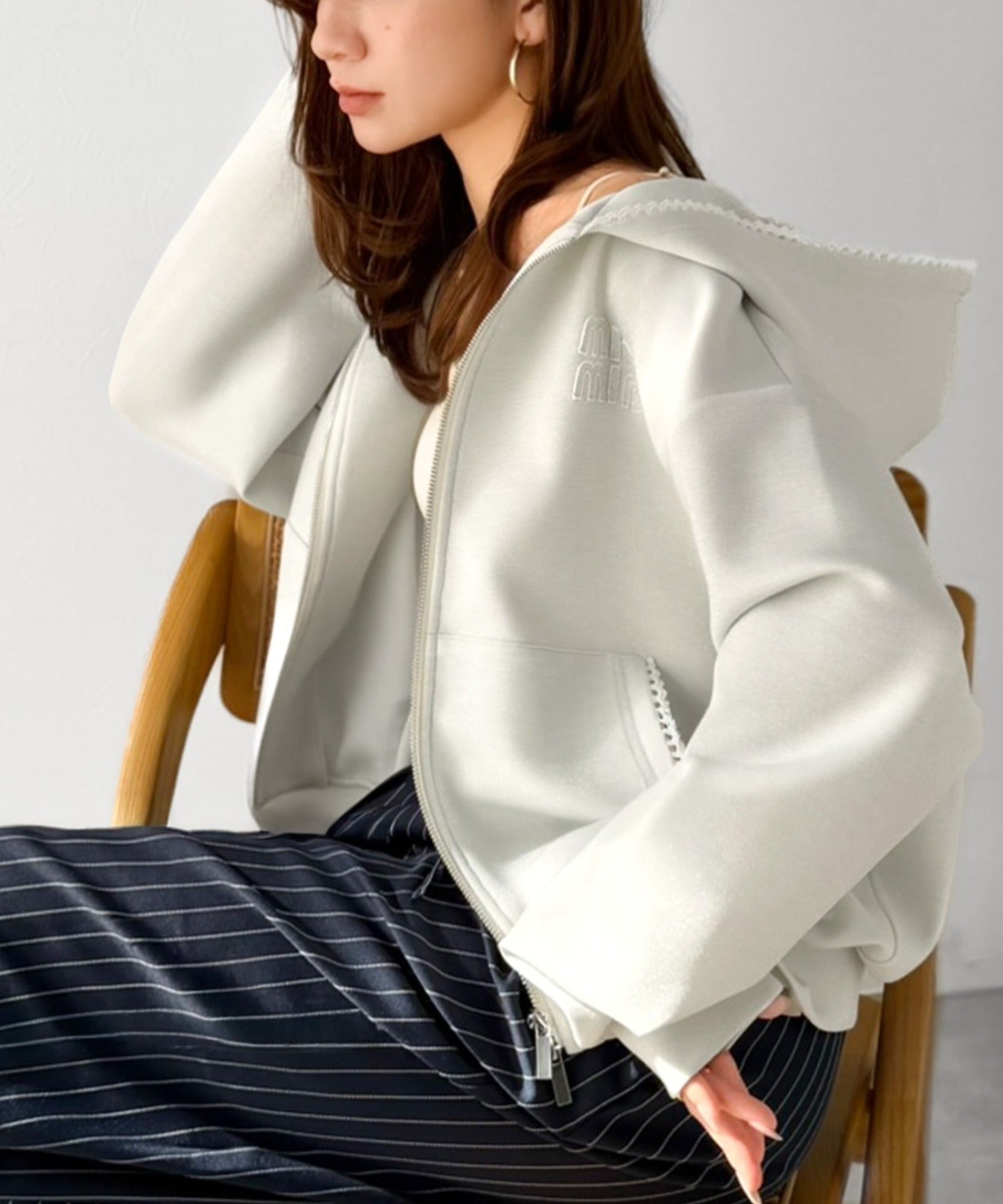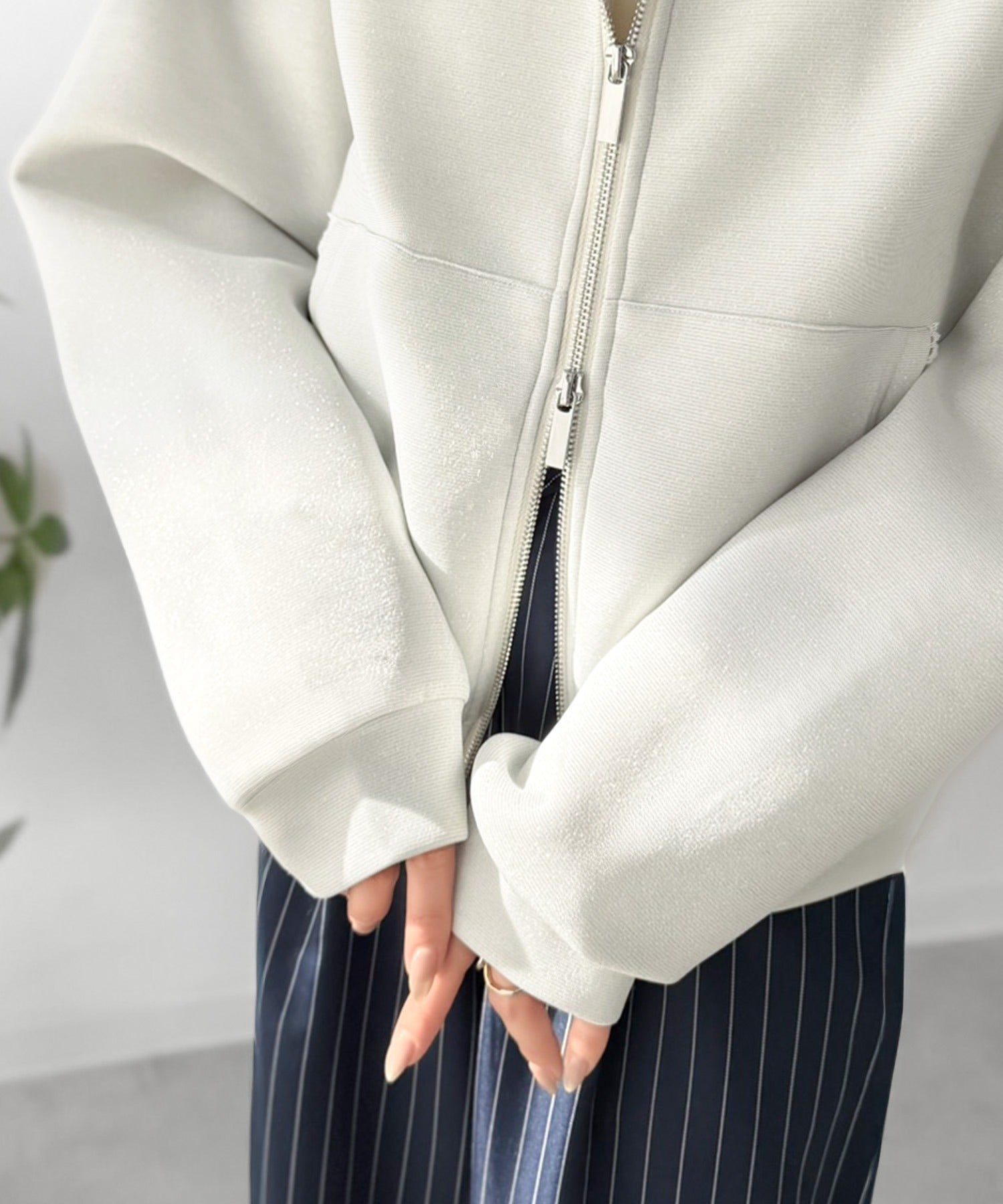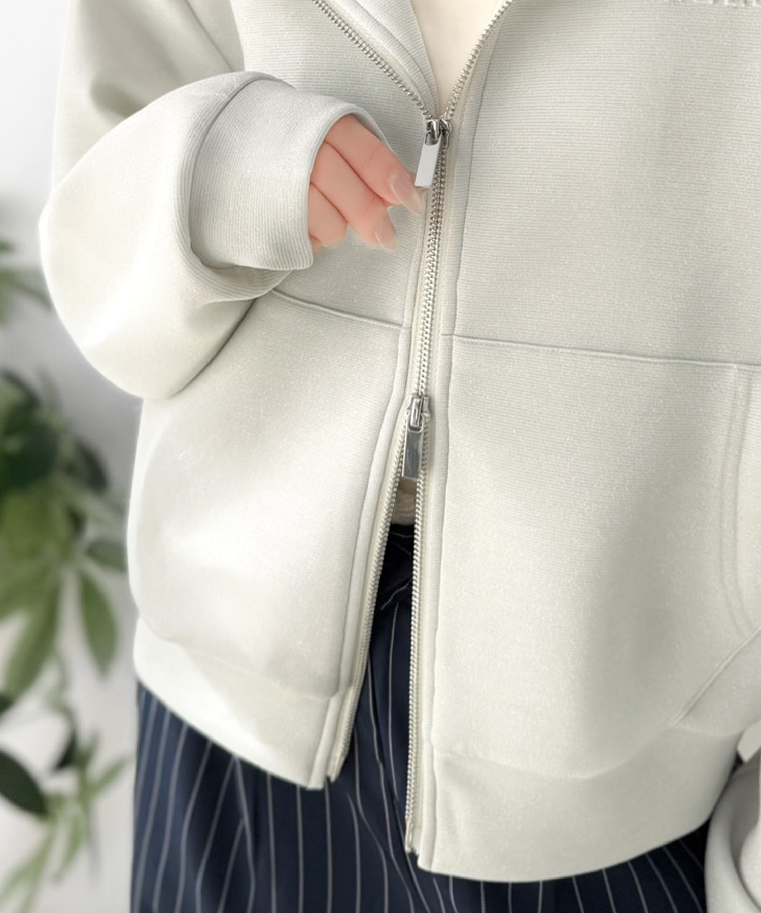 トレンドのダブルジップは、上下の開け方次第でパッと抜け感を演出♪