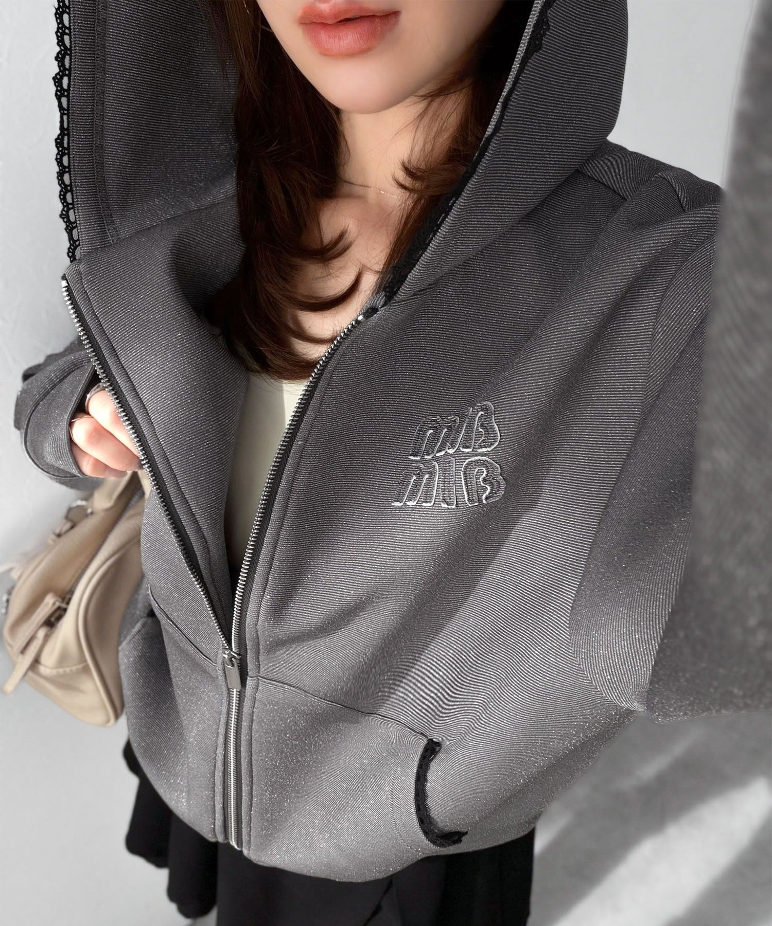 キラリと輝くラメ素材×ダブルジップがアクセント。