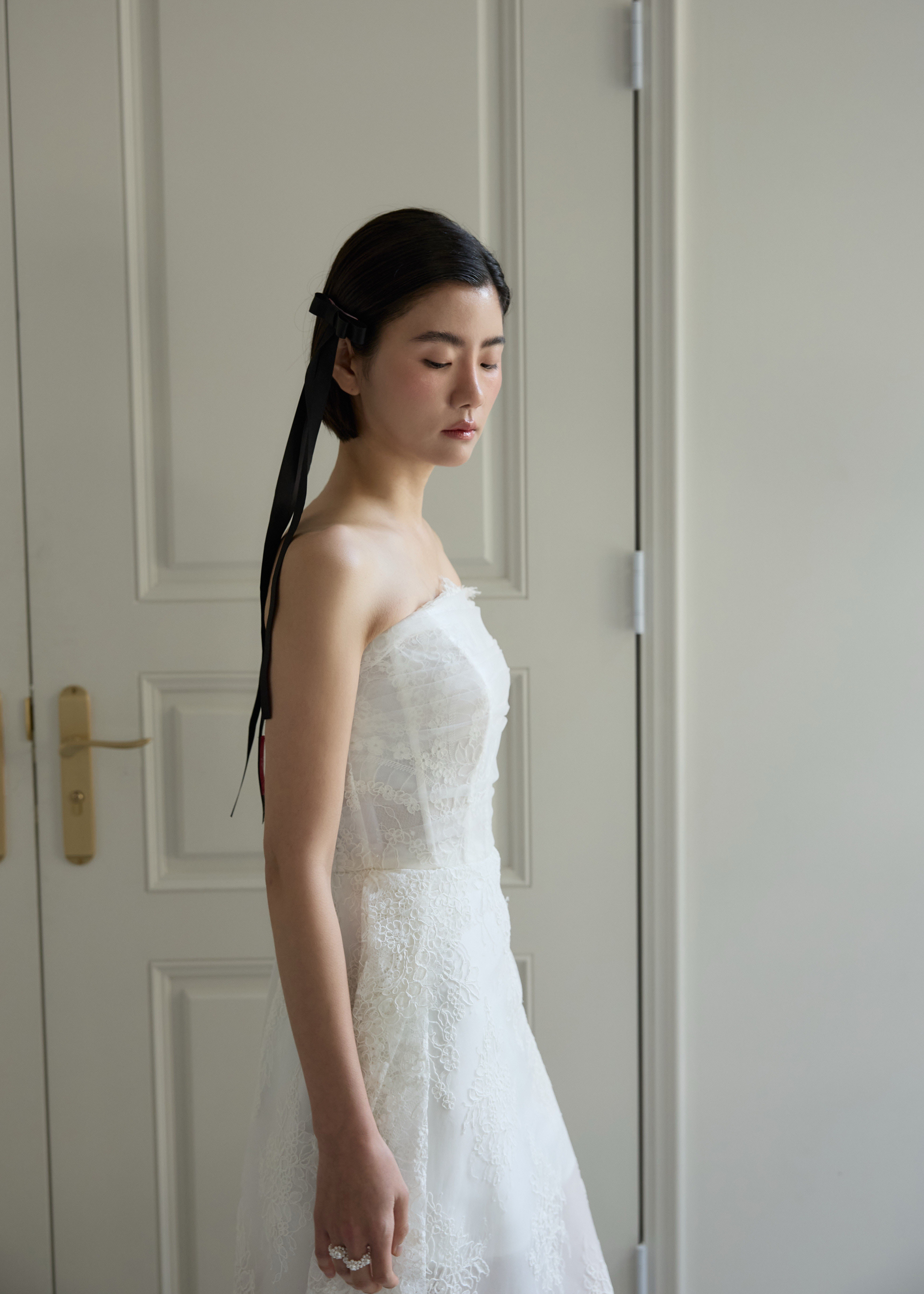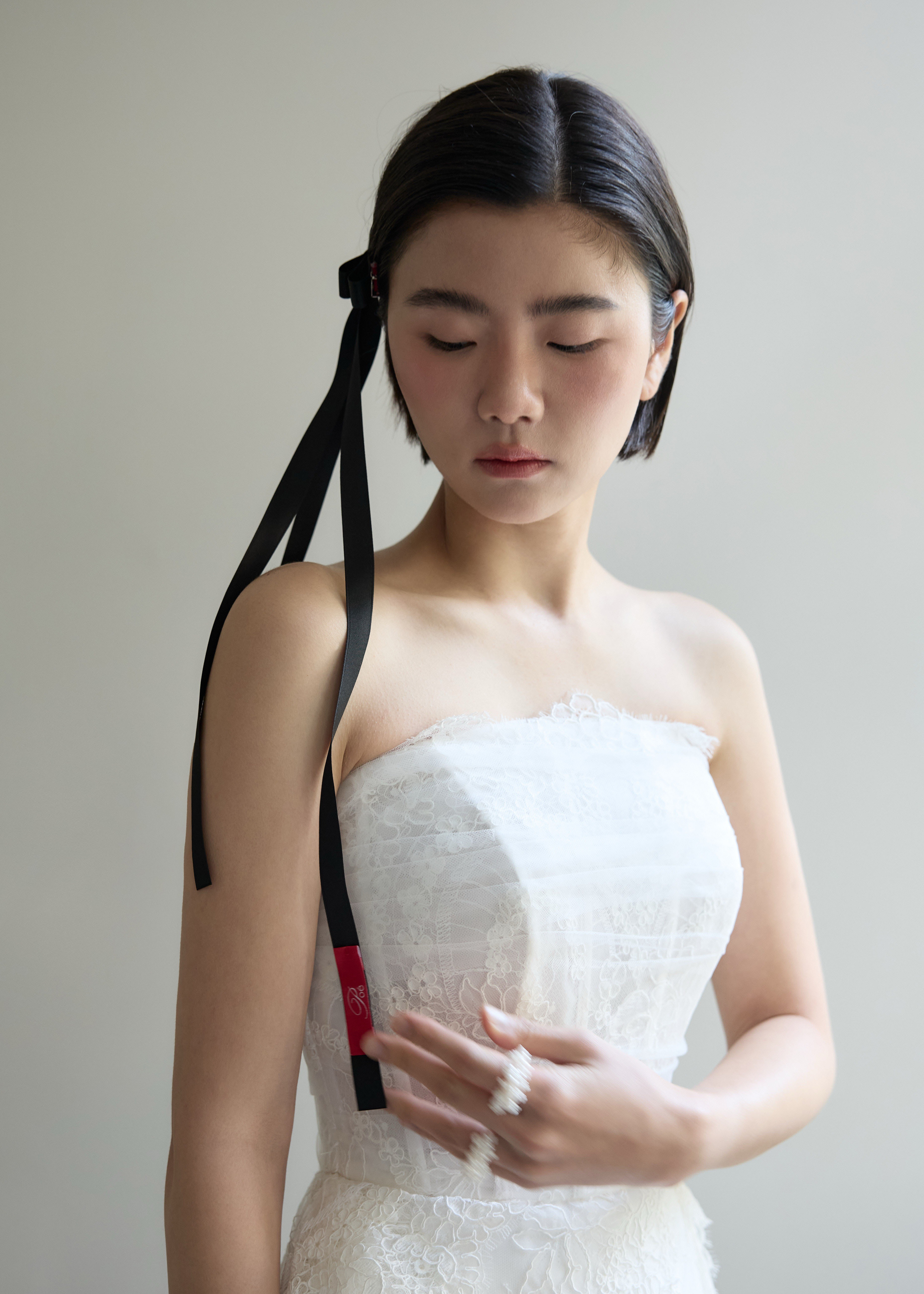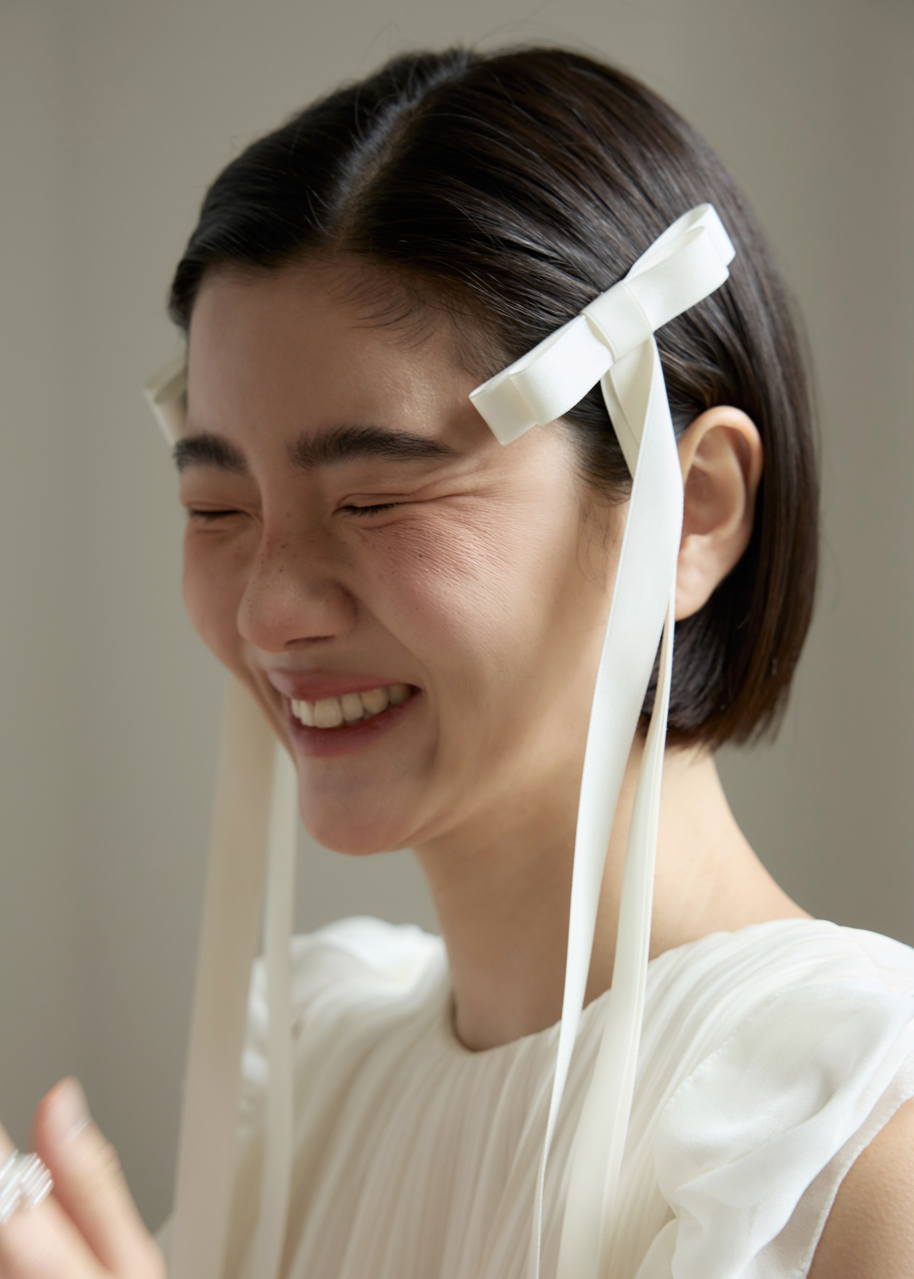 長く垂れるリボン紐がドレスと調和し、花嫁さまをより一層輝かせます。