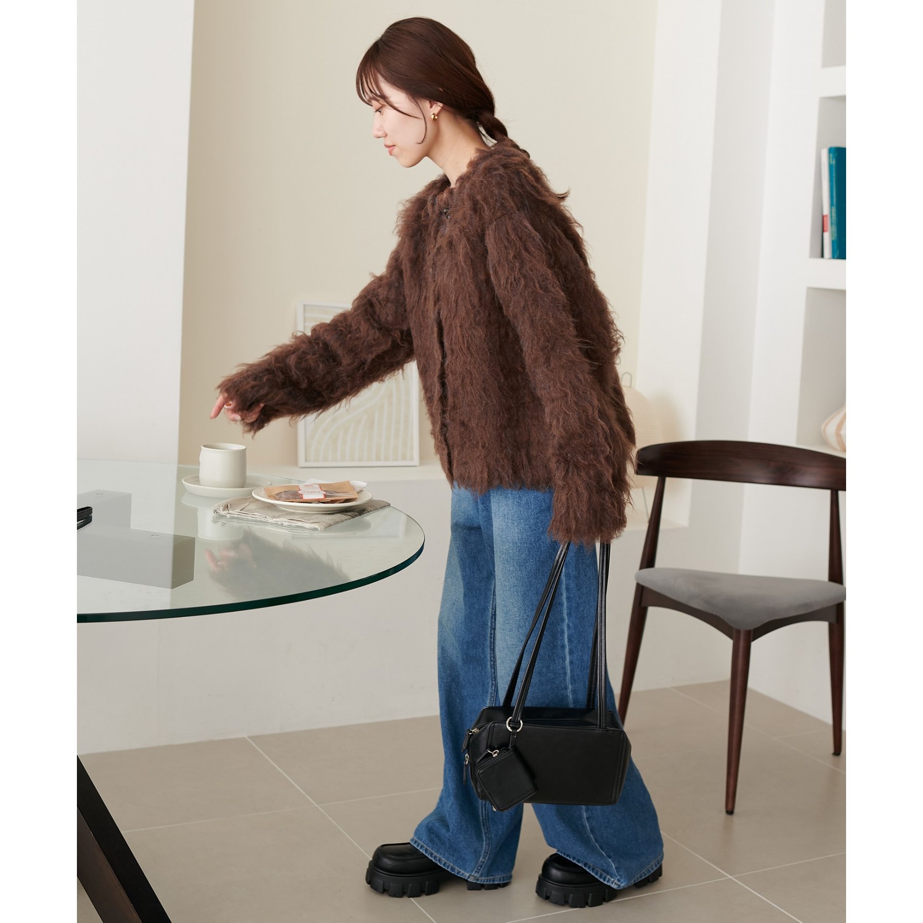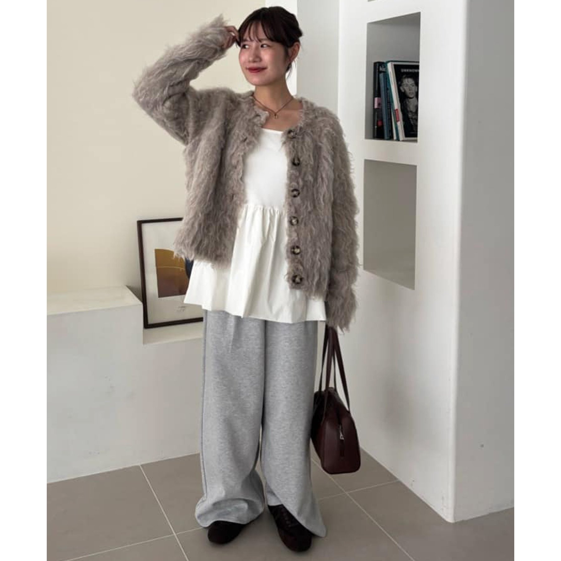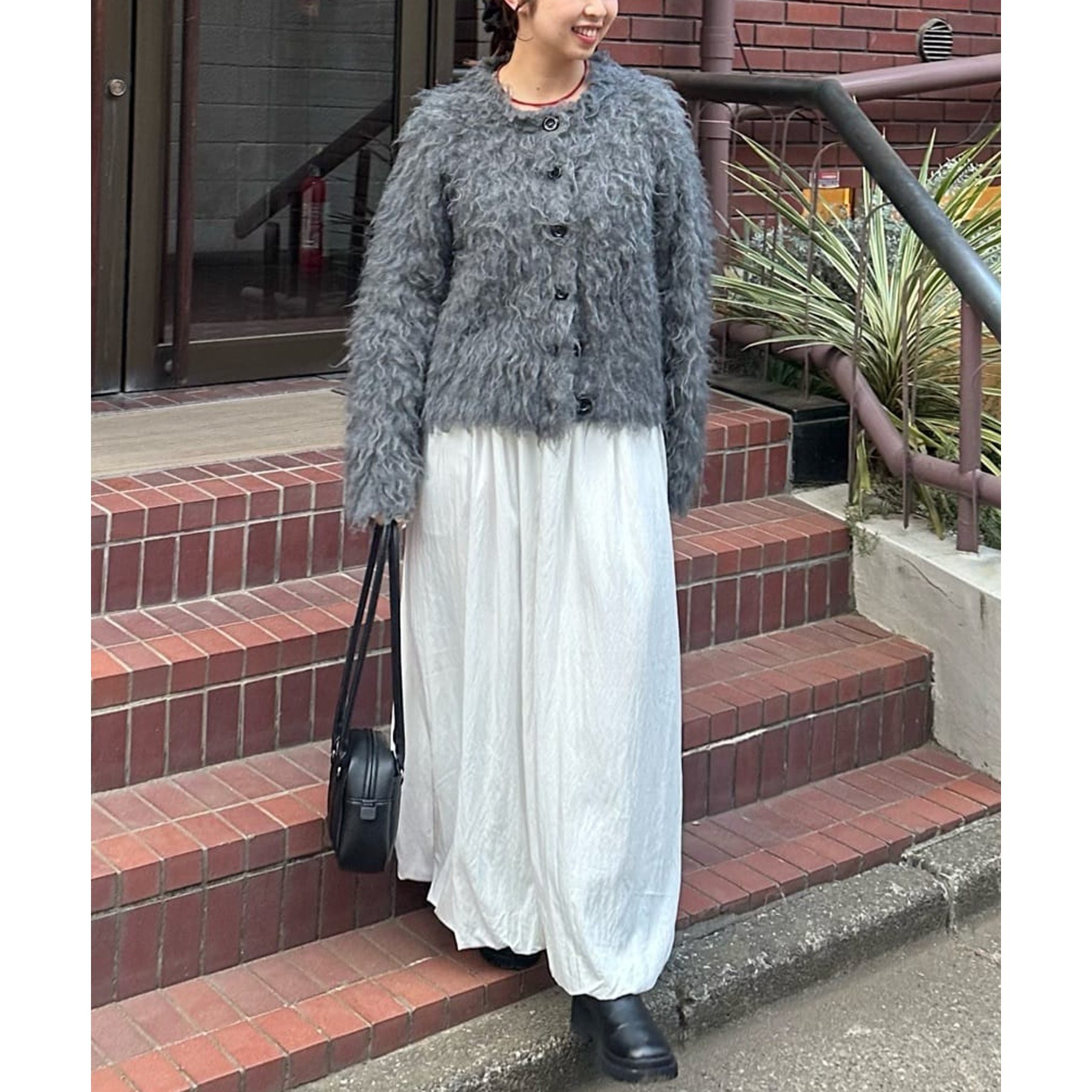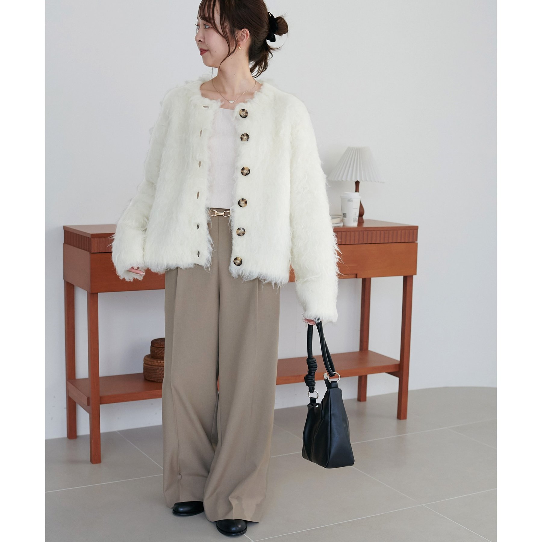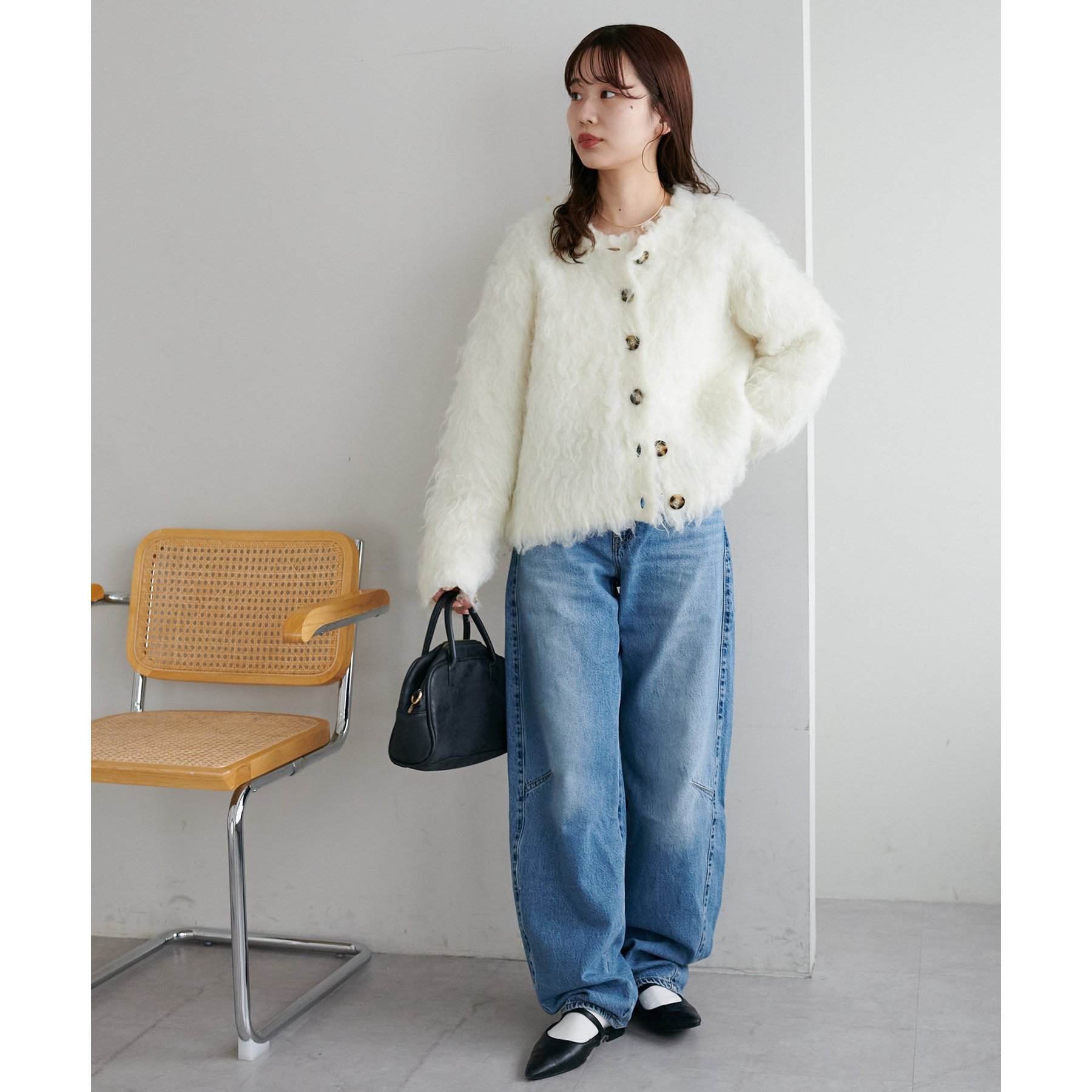 ふわふわのシャギー素材が主役になるので、シンプルなアイテムと合わせるだけでコーデが完成。