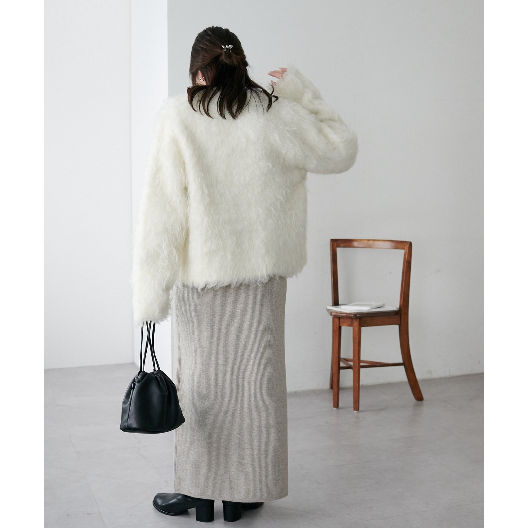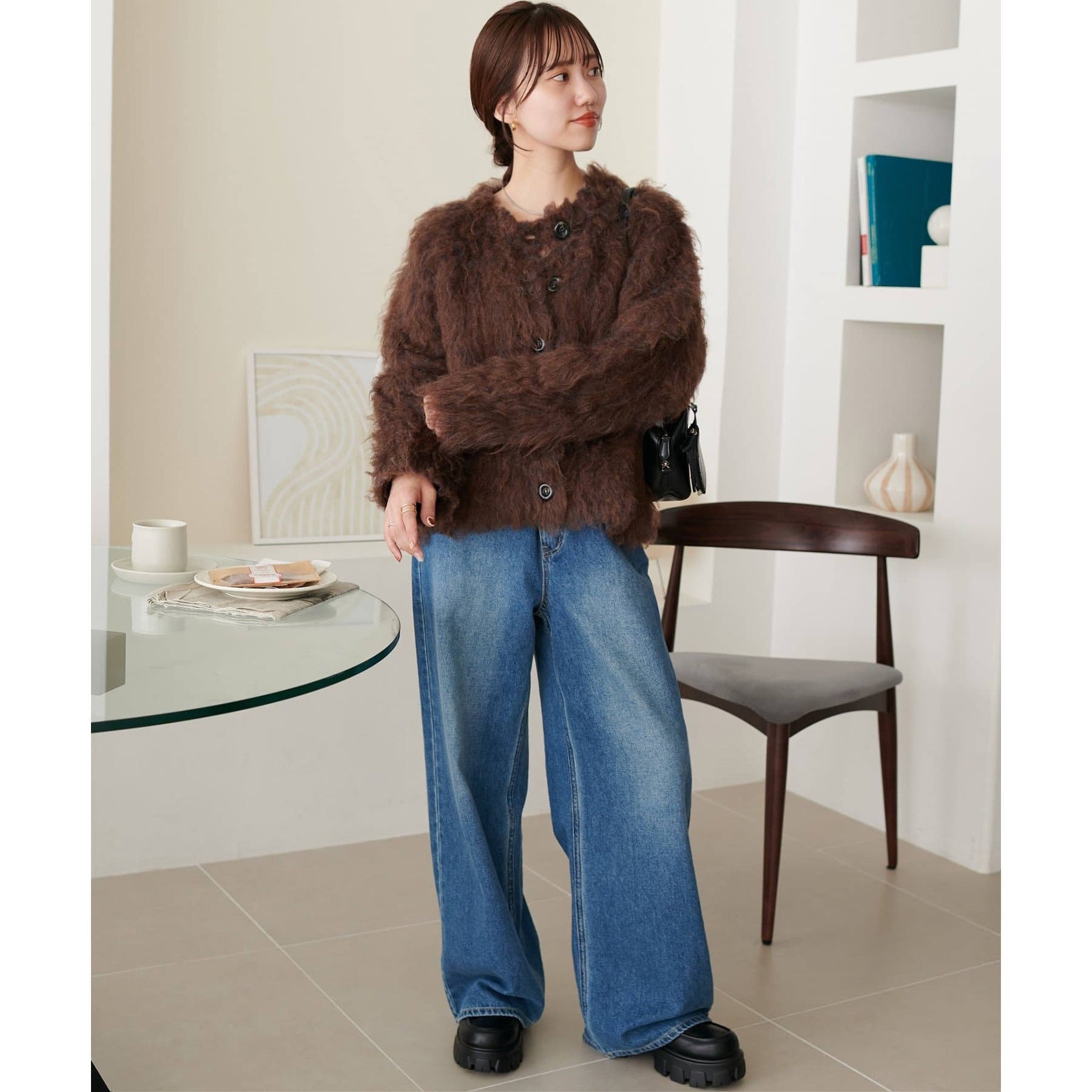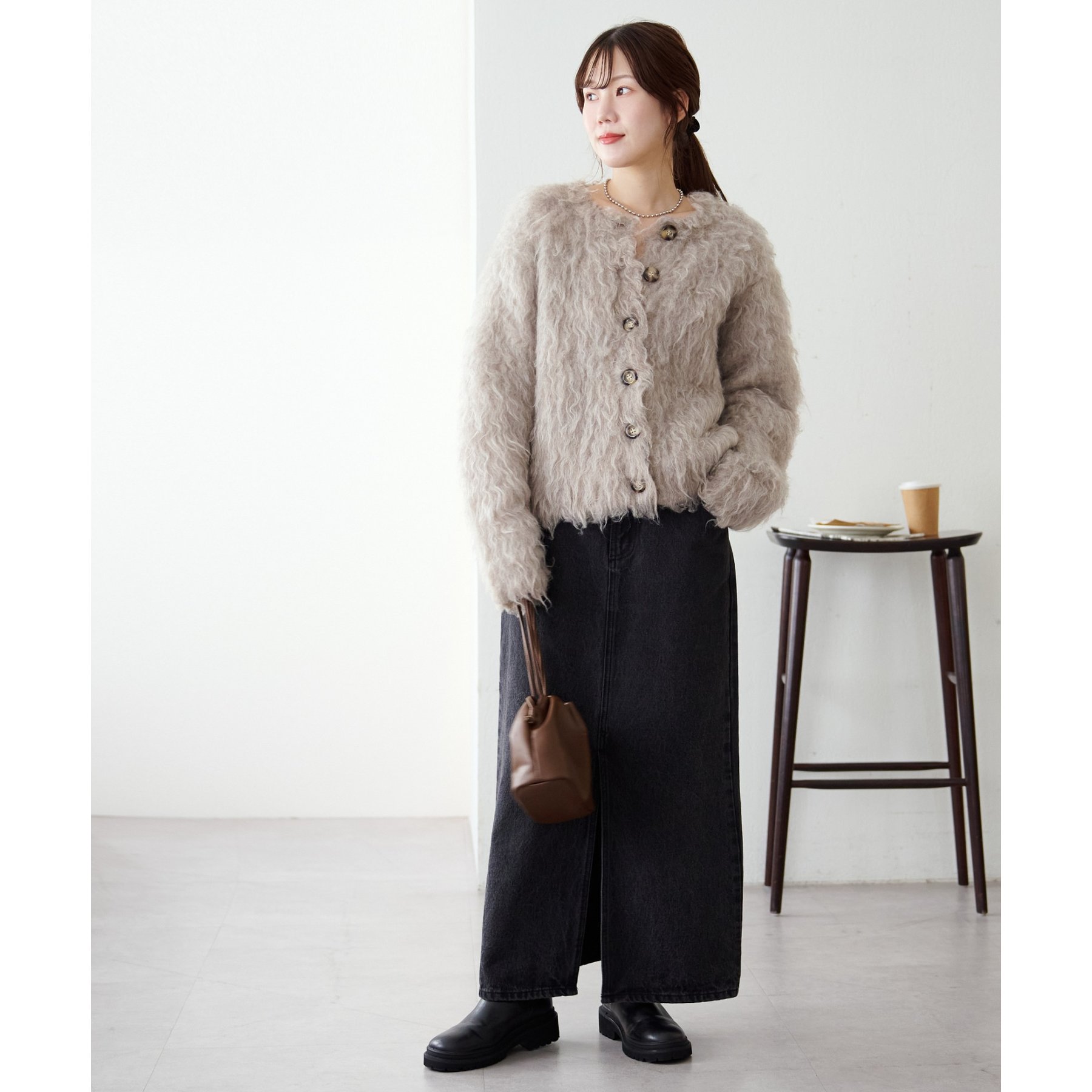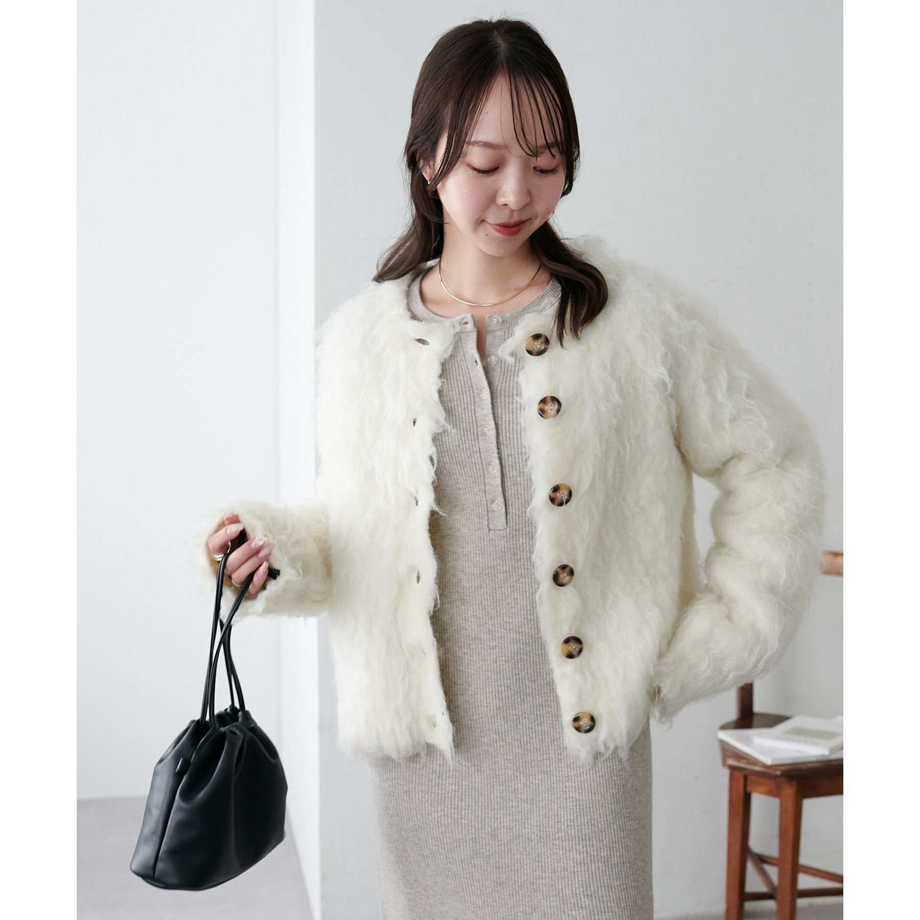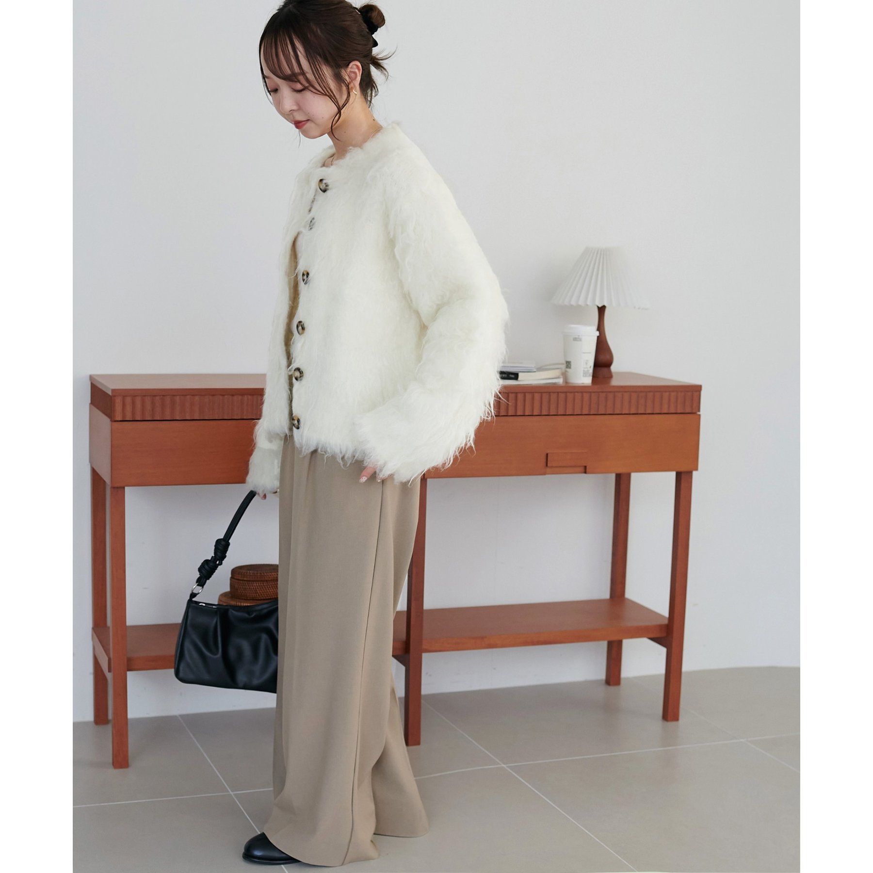 ふわふわのシャギー素材が主役になるので、シンプルなアイテムと合わせるだけでコーデが完成。