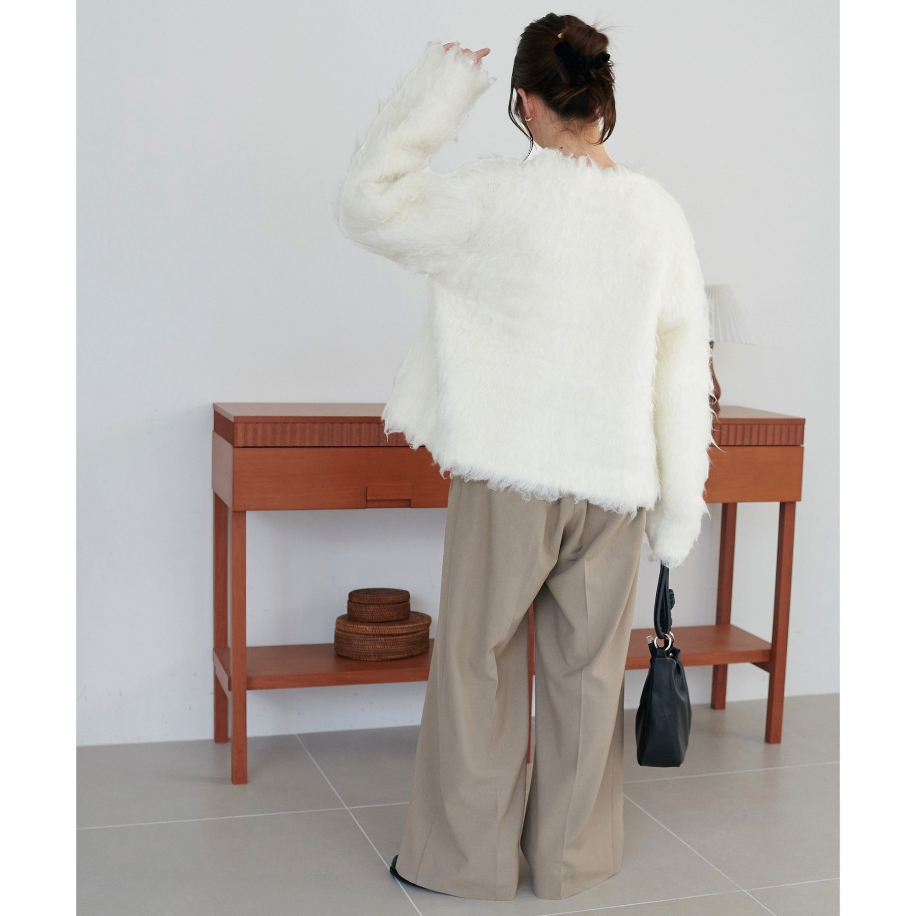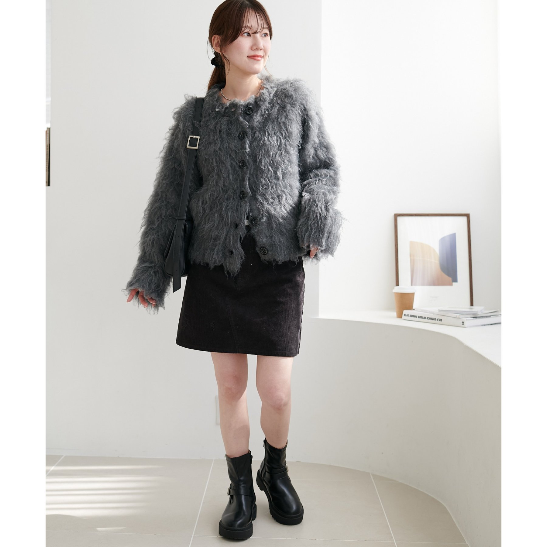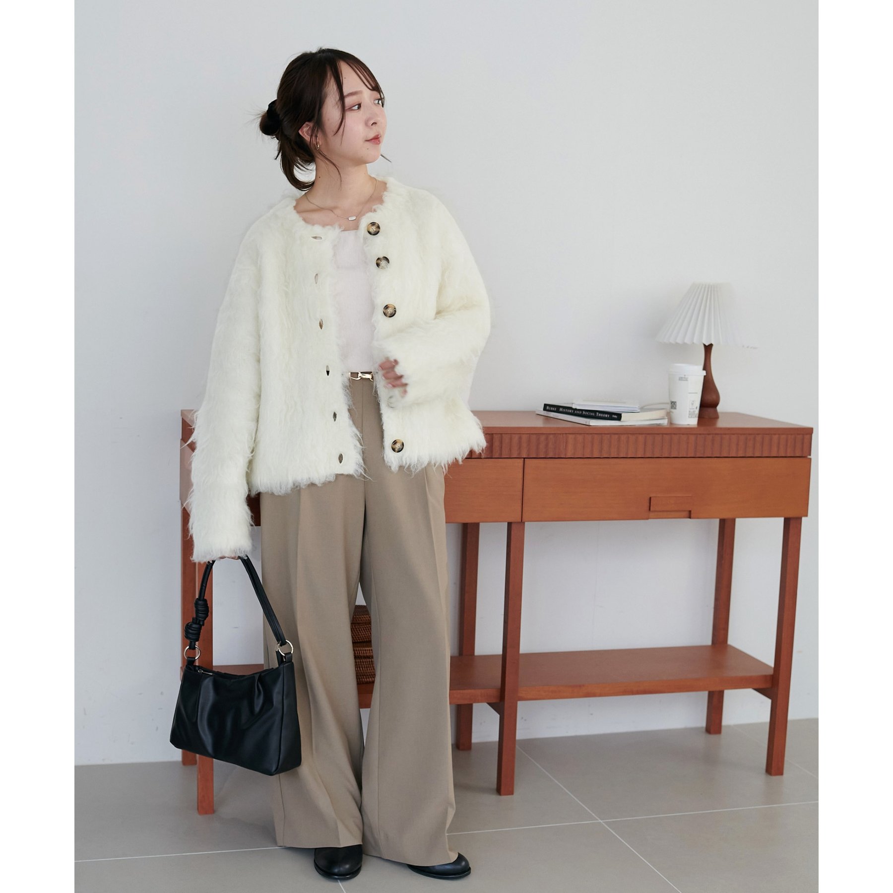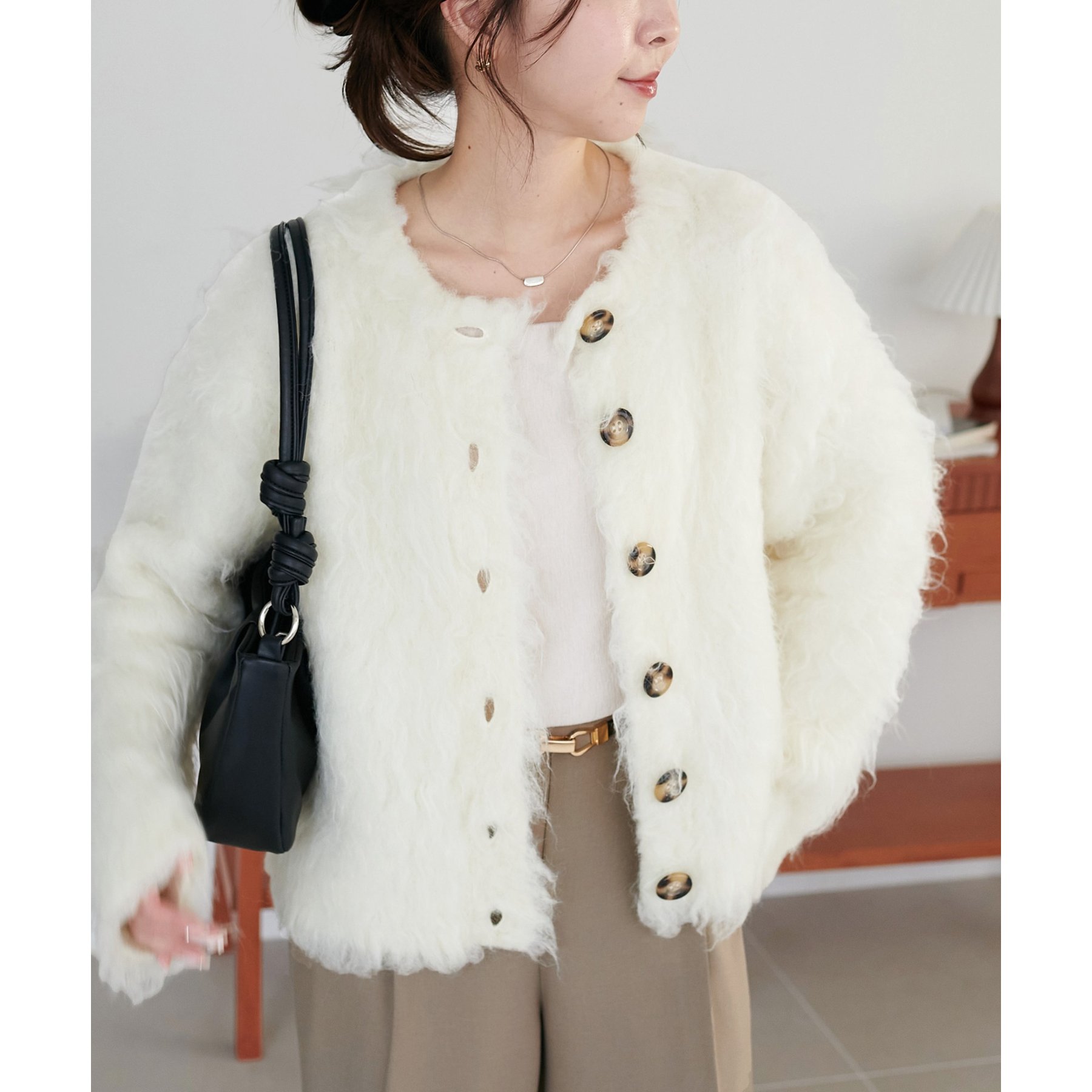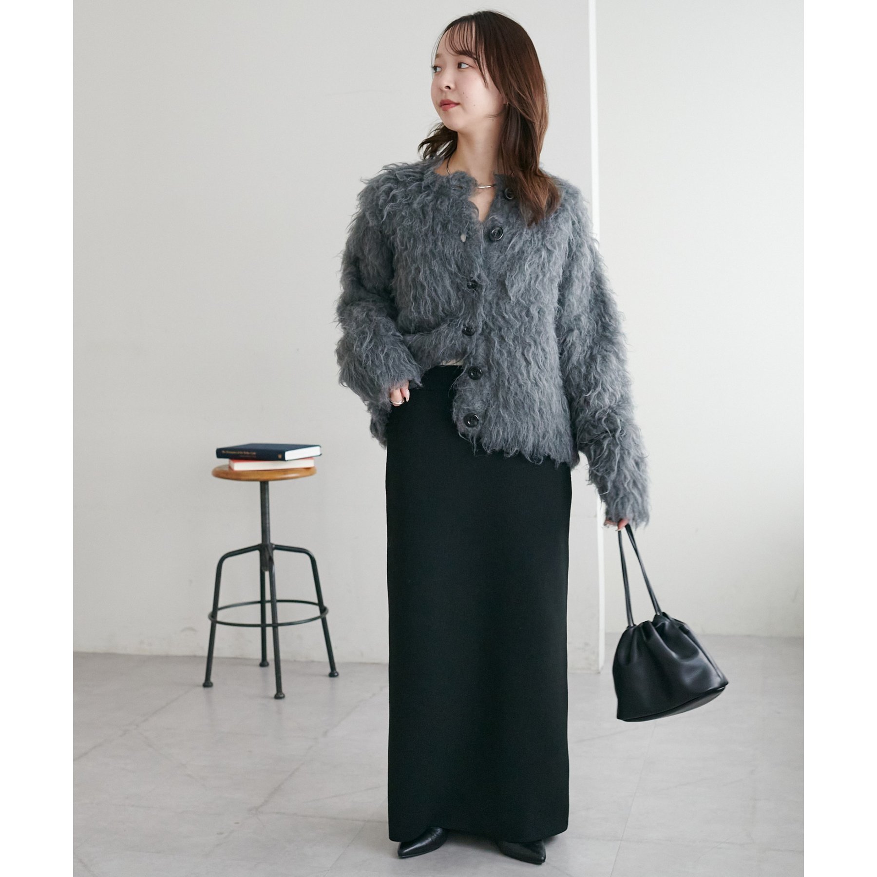 ふわふわのシャギー素材が主役になるので、シンプルなアイテムと合わせるだけでコーデが完成。