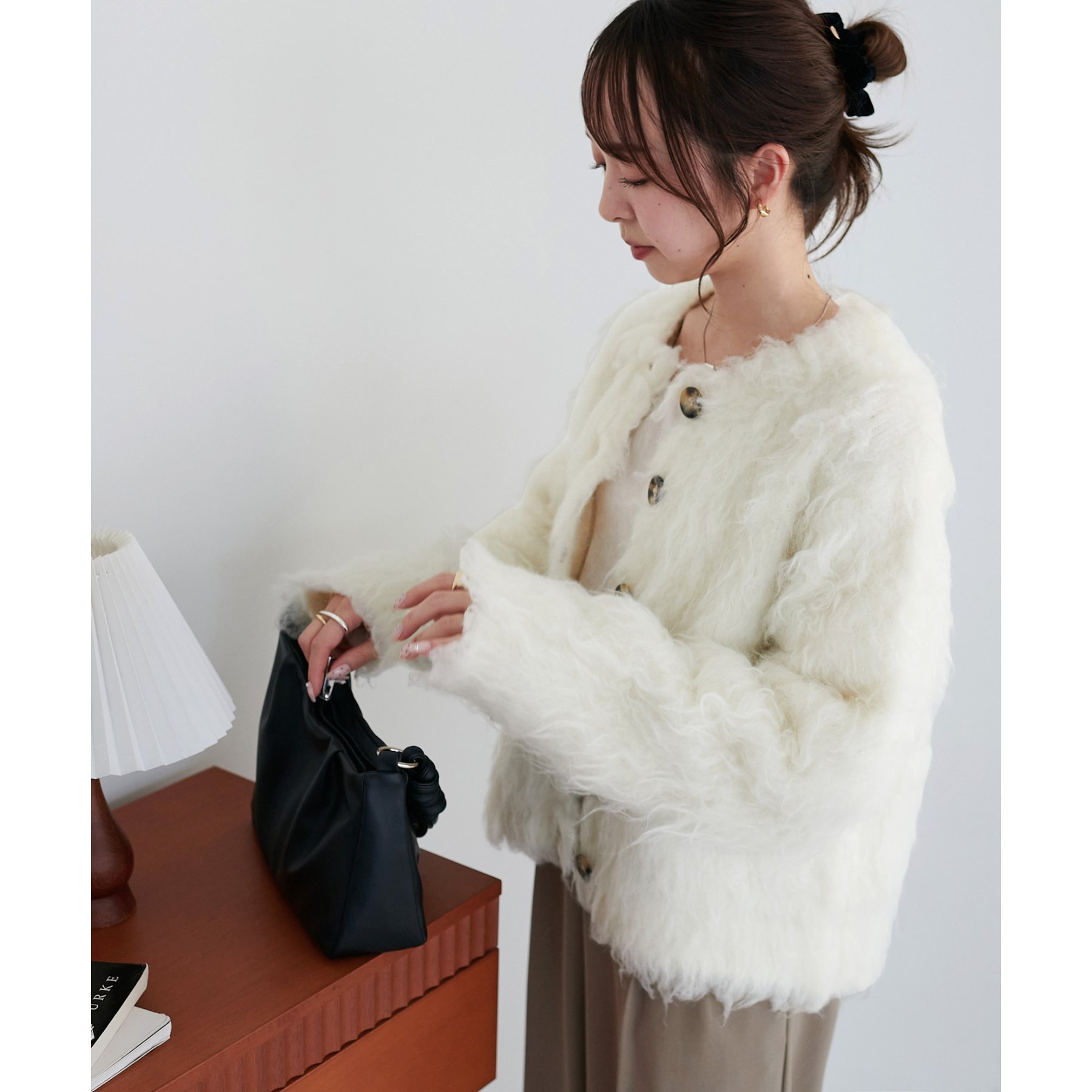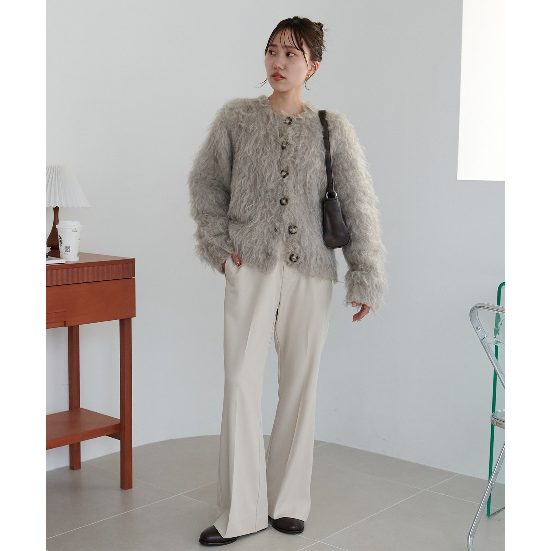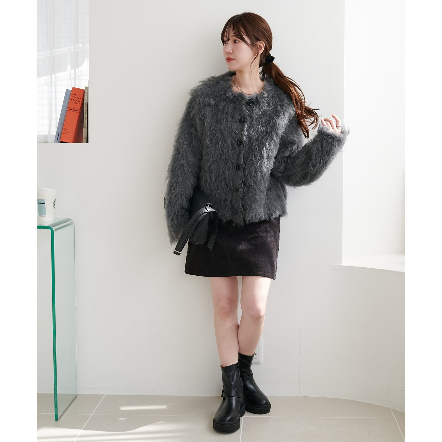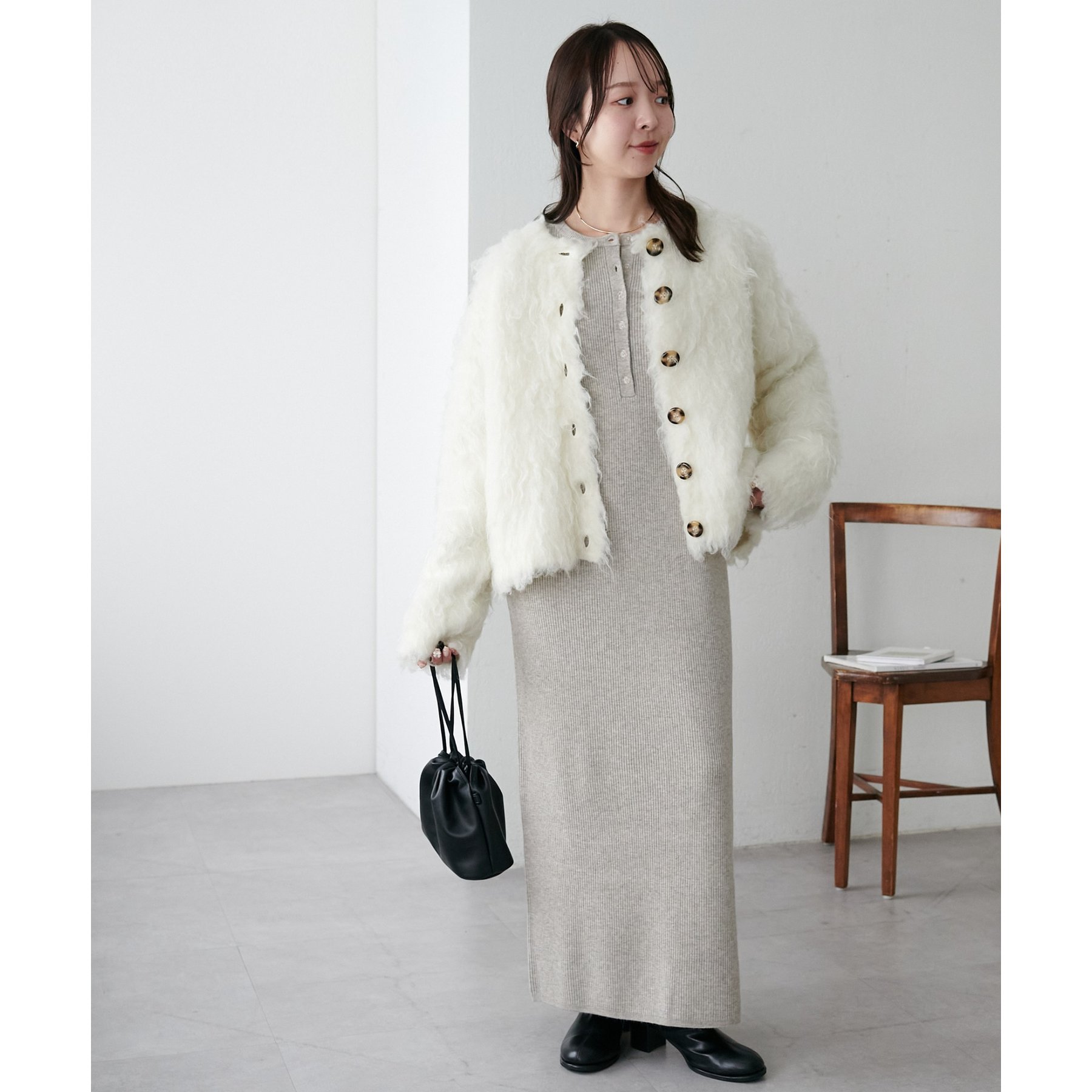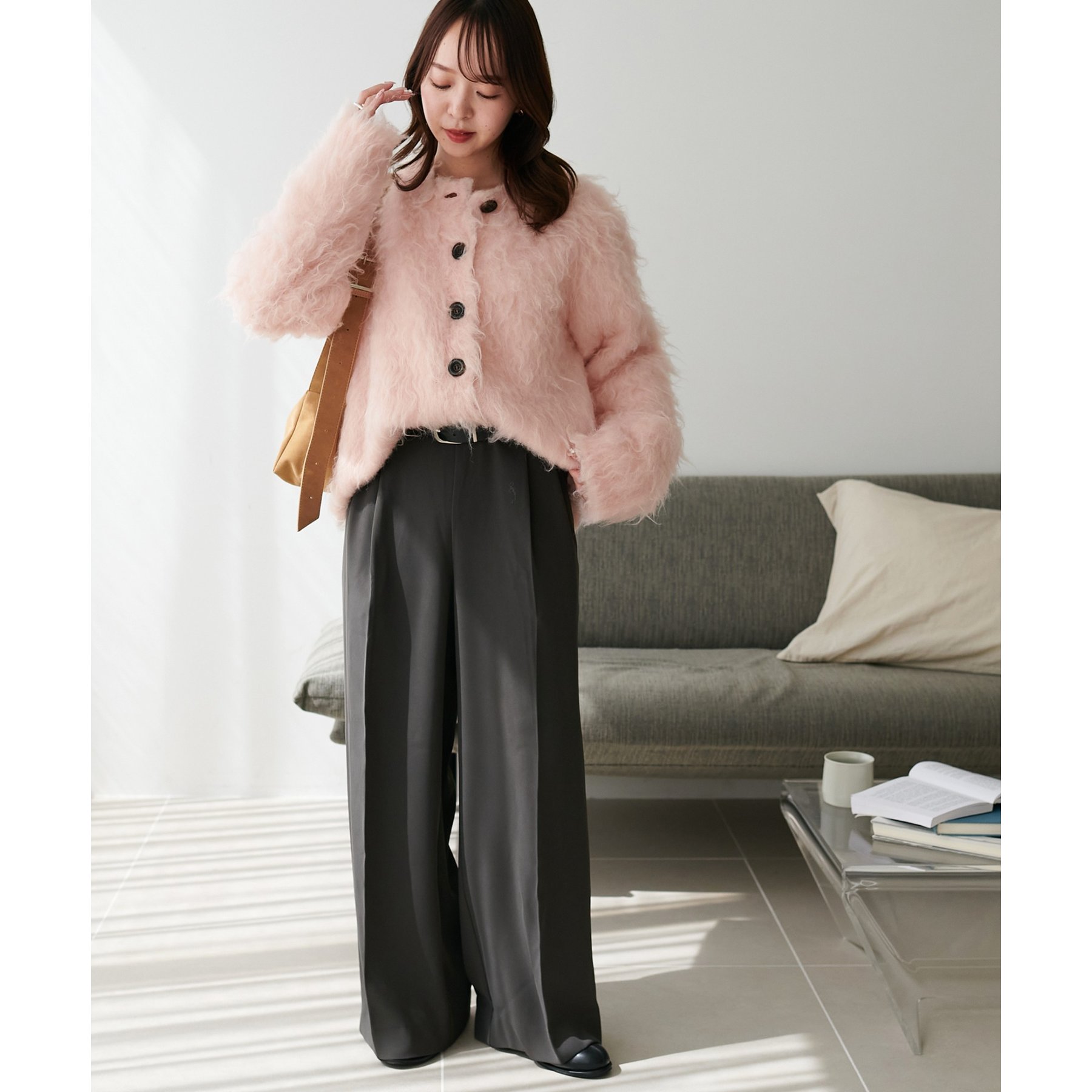 ふわふわのシャギー素材が主役になるので、シンプルなアイテムと合わせるだけでコーデが完成。