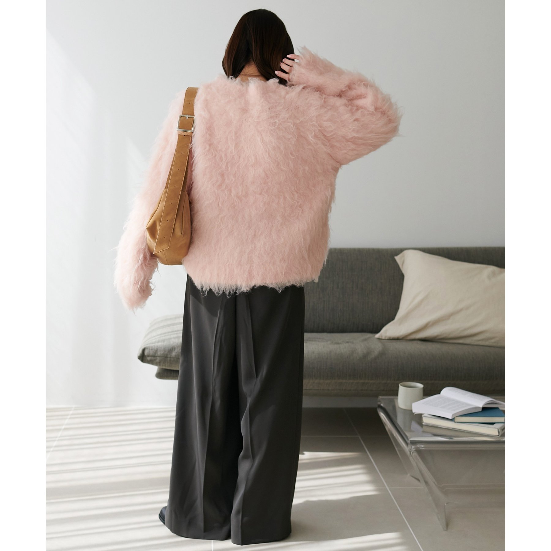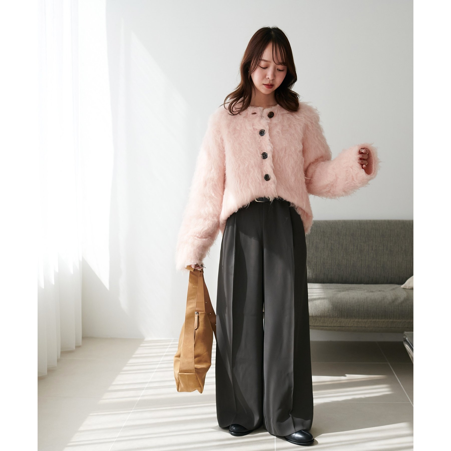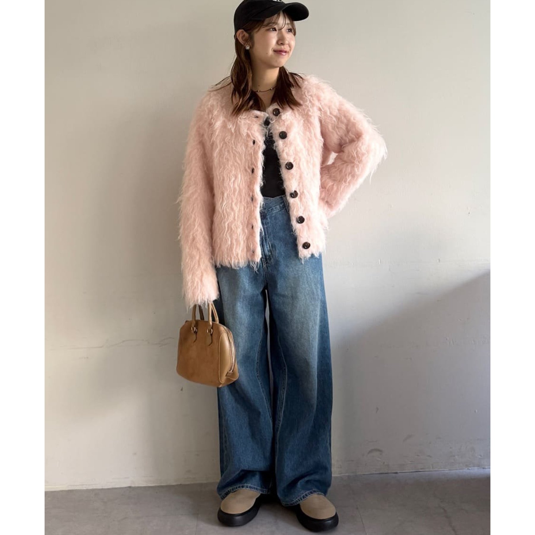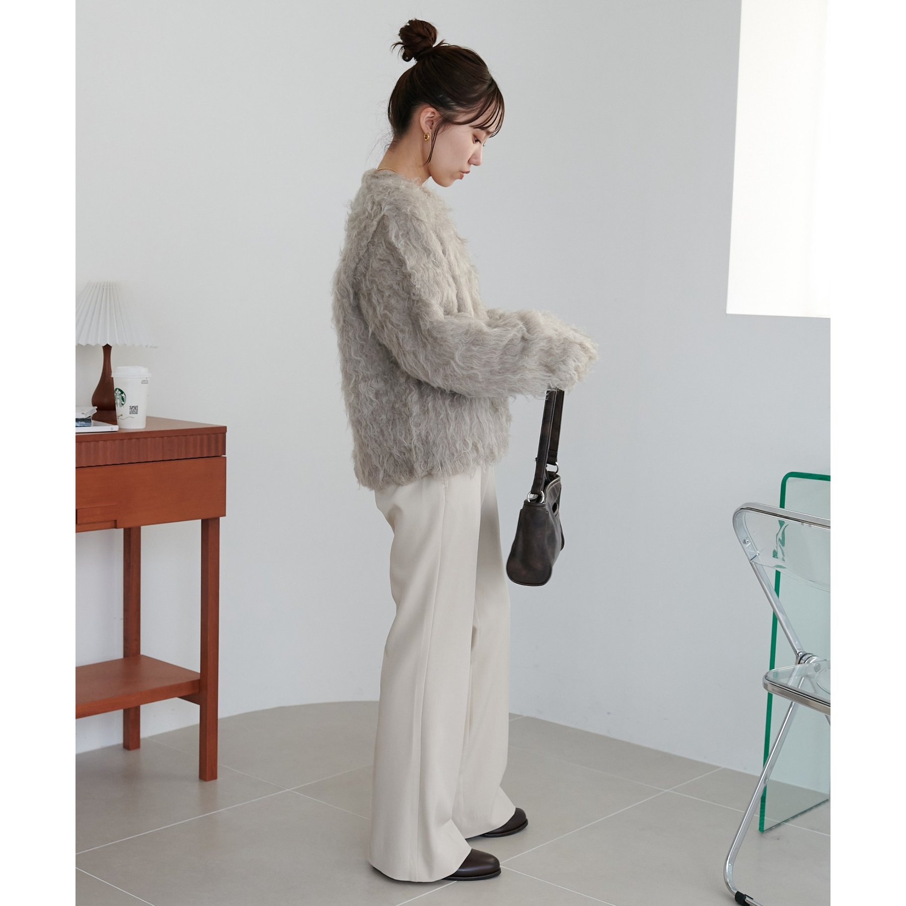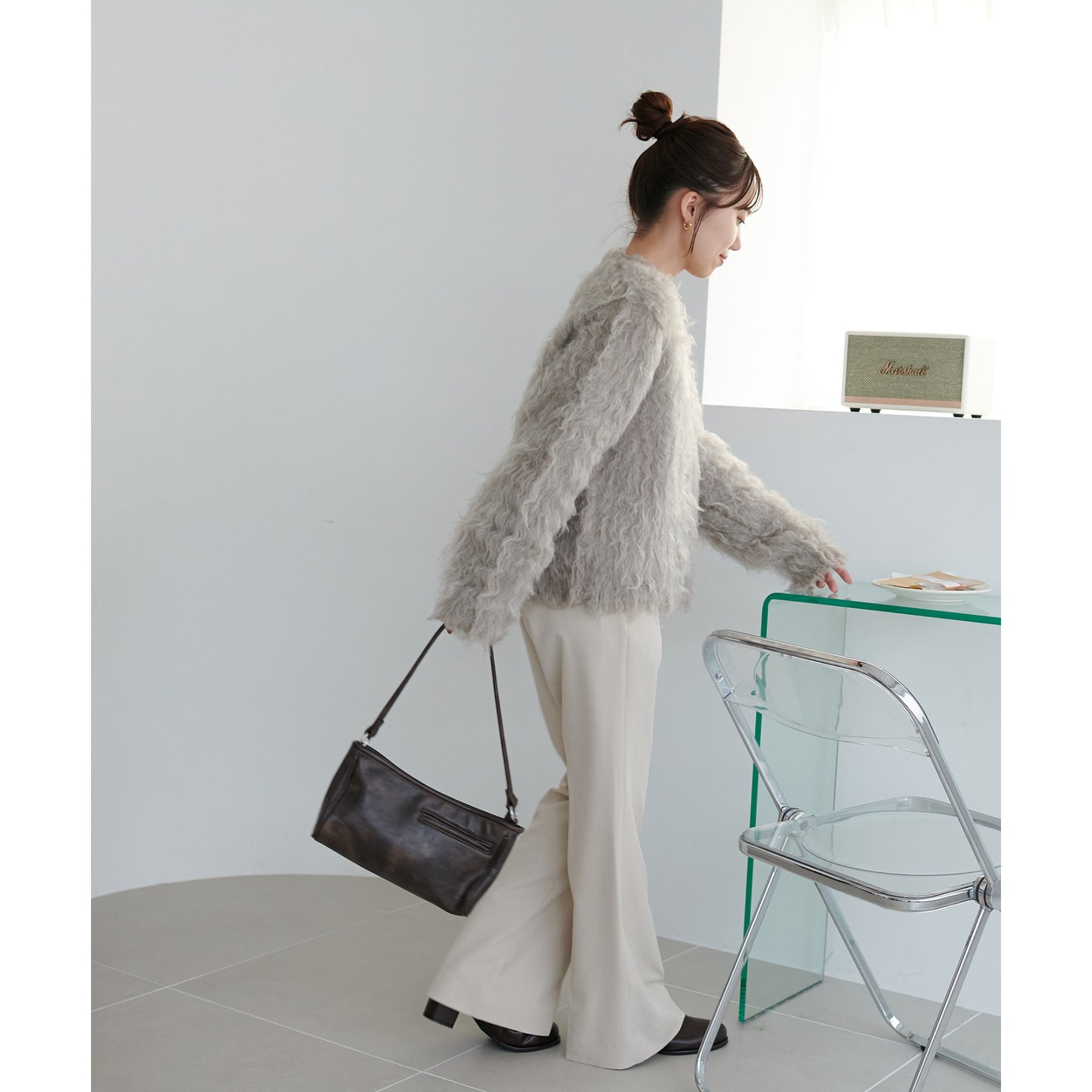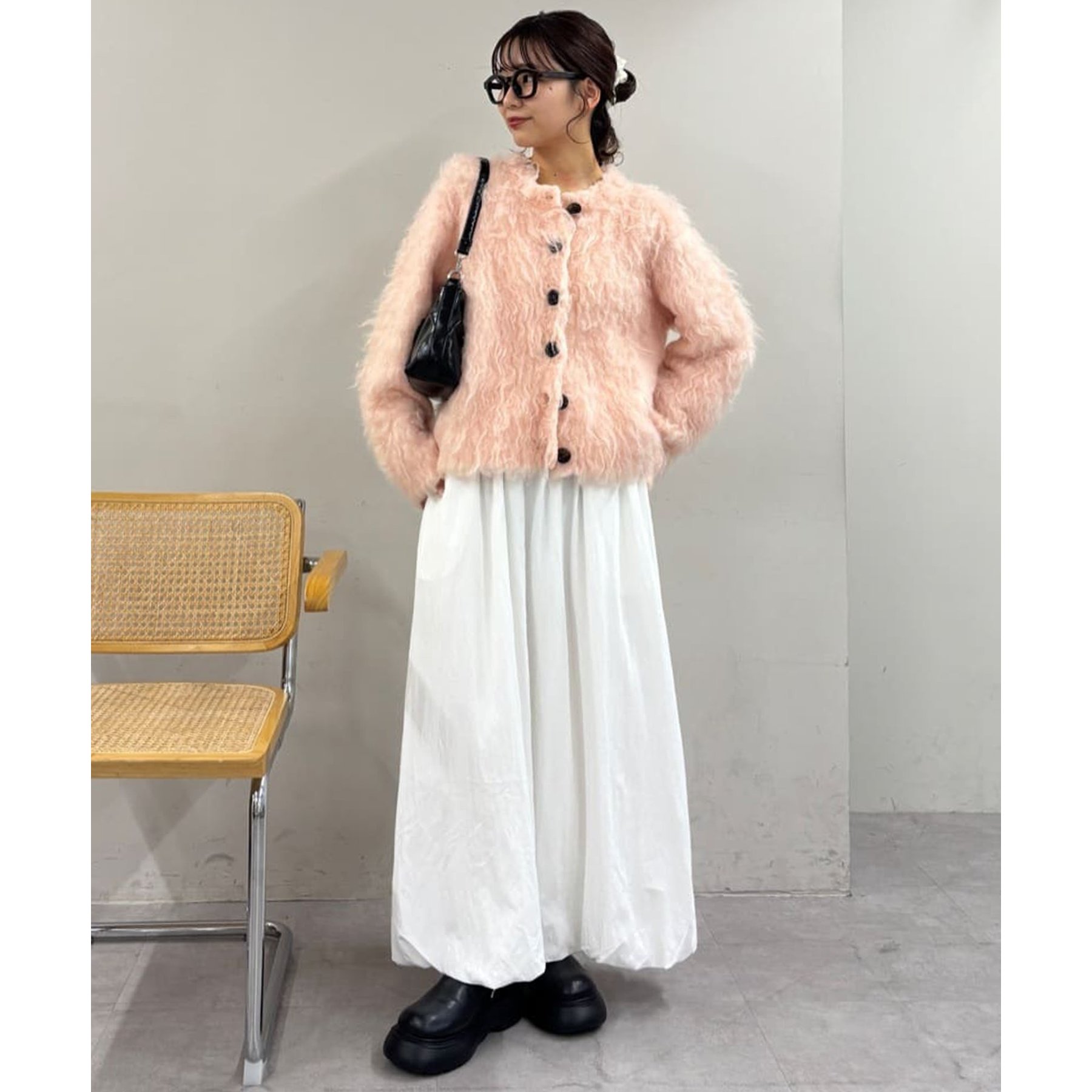 ふわふわのシャギー素材が主役になるので、シンプルなアイテムと合わせるだけでコーデが完成。