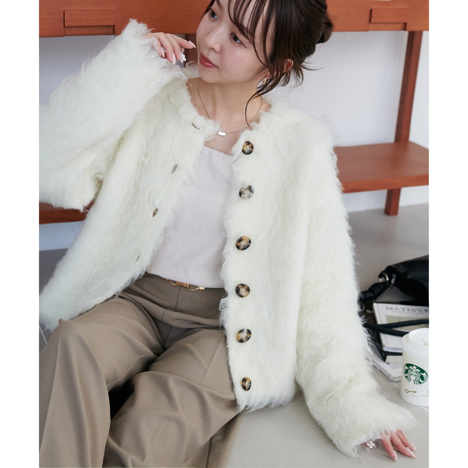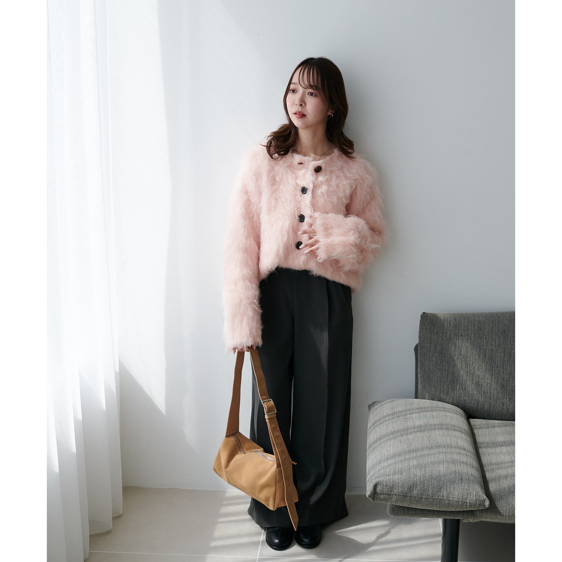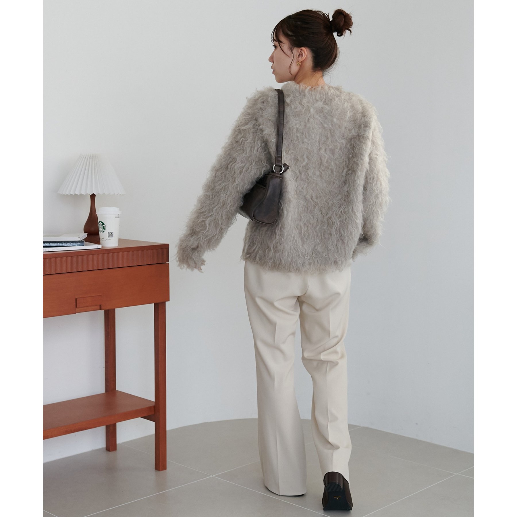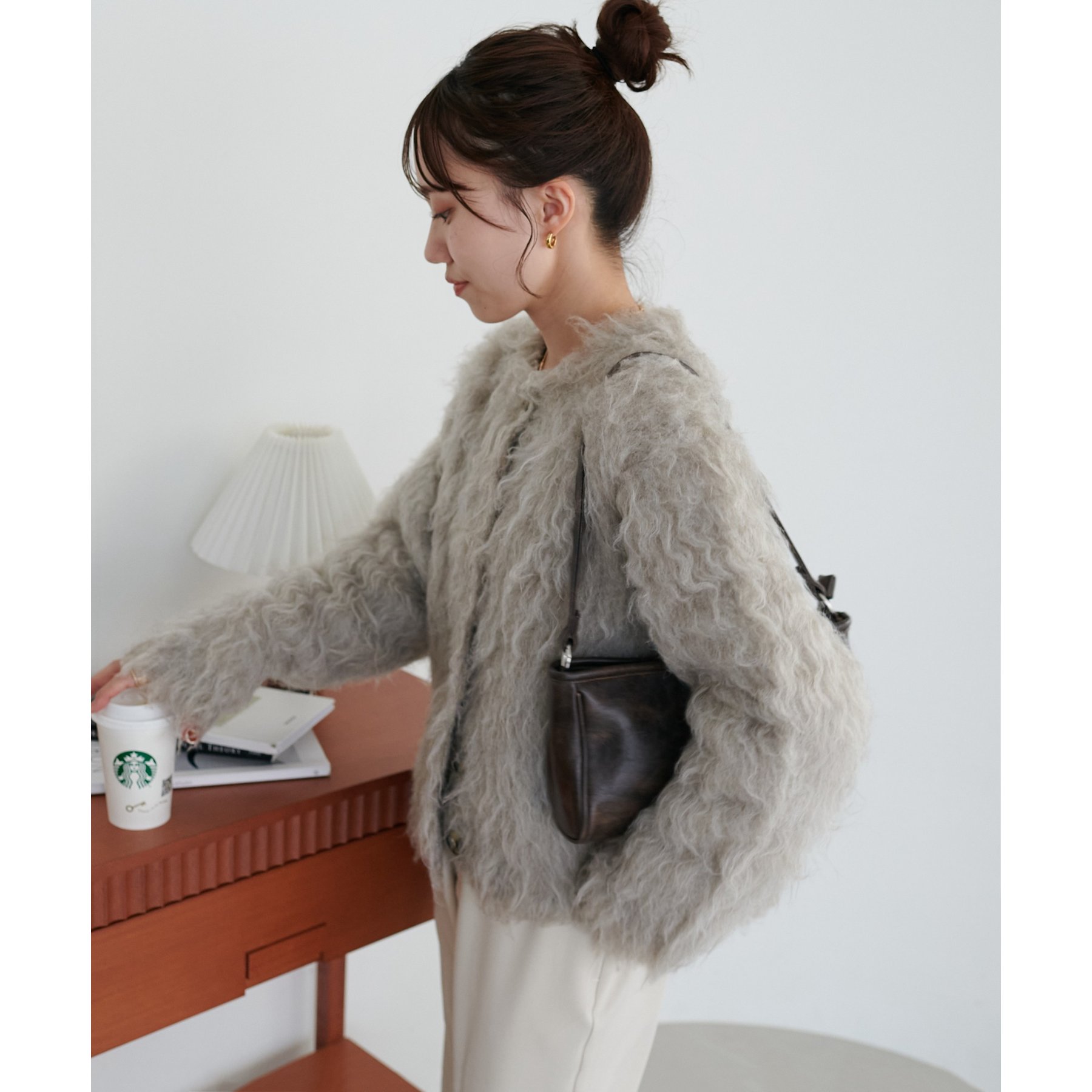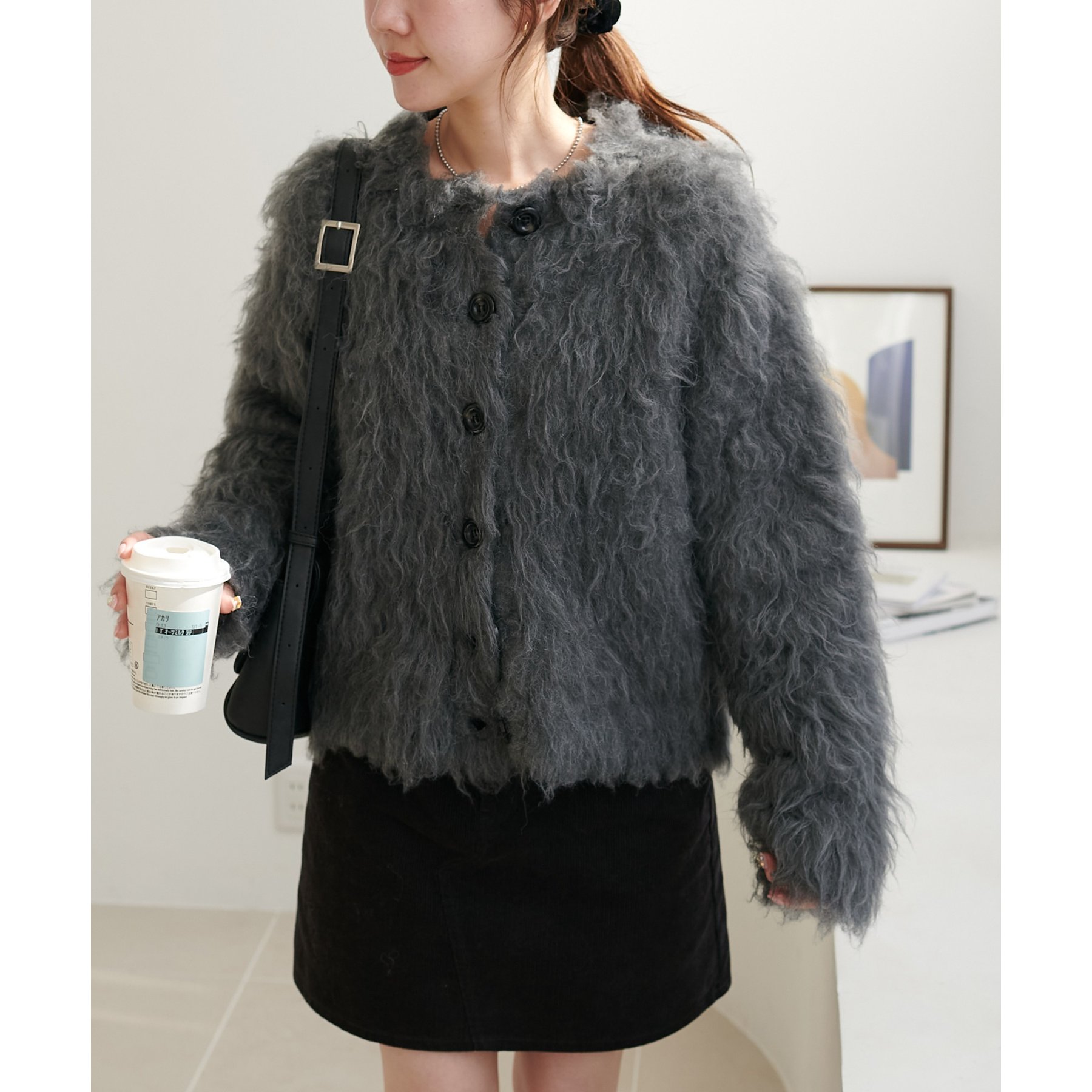 ふわふわのシャギー素材が主役になるので、シンプルなアイテムと合わせるだけでコーデが完成。