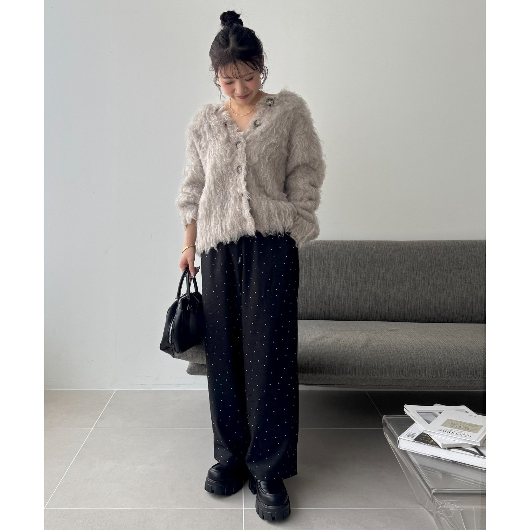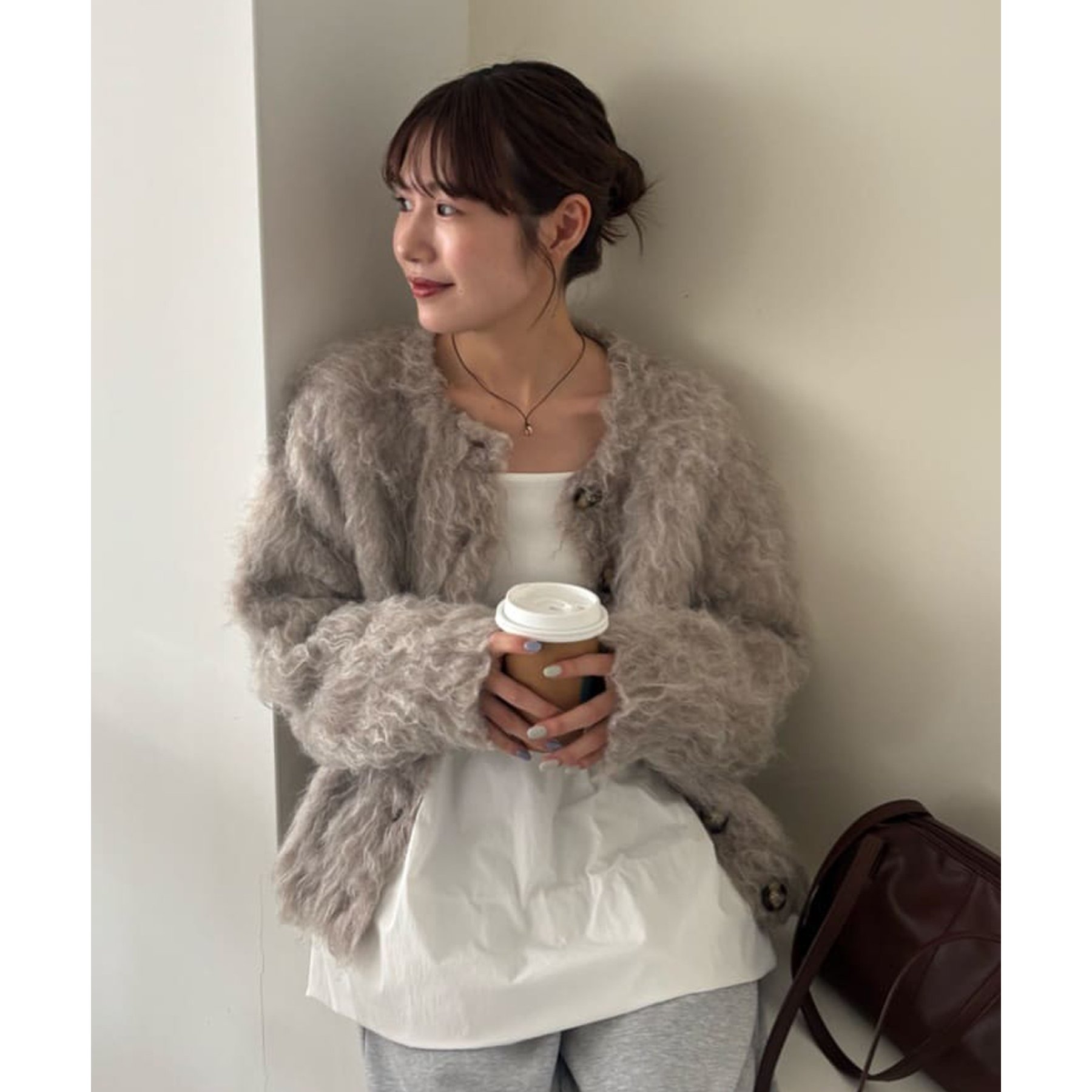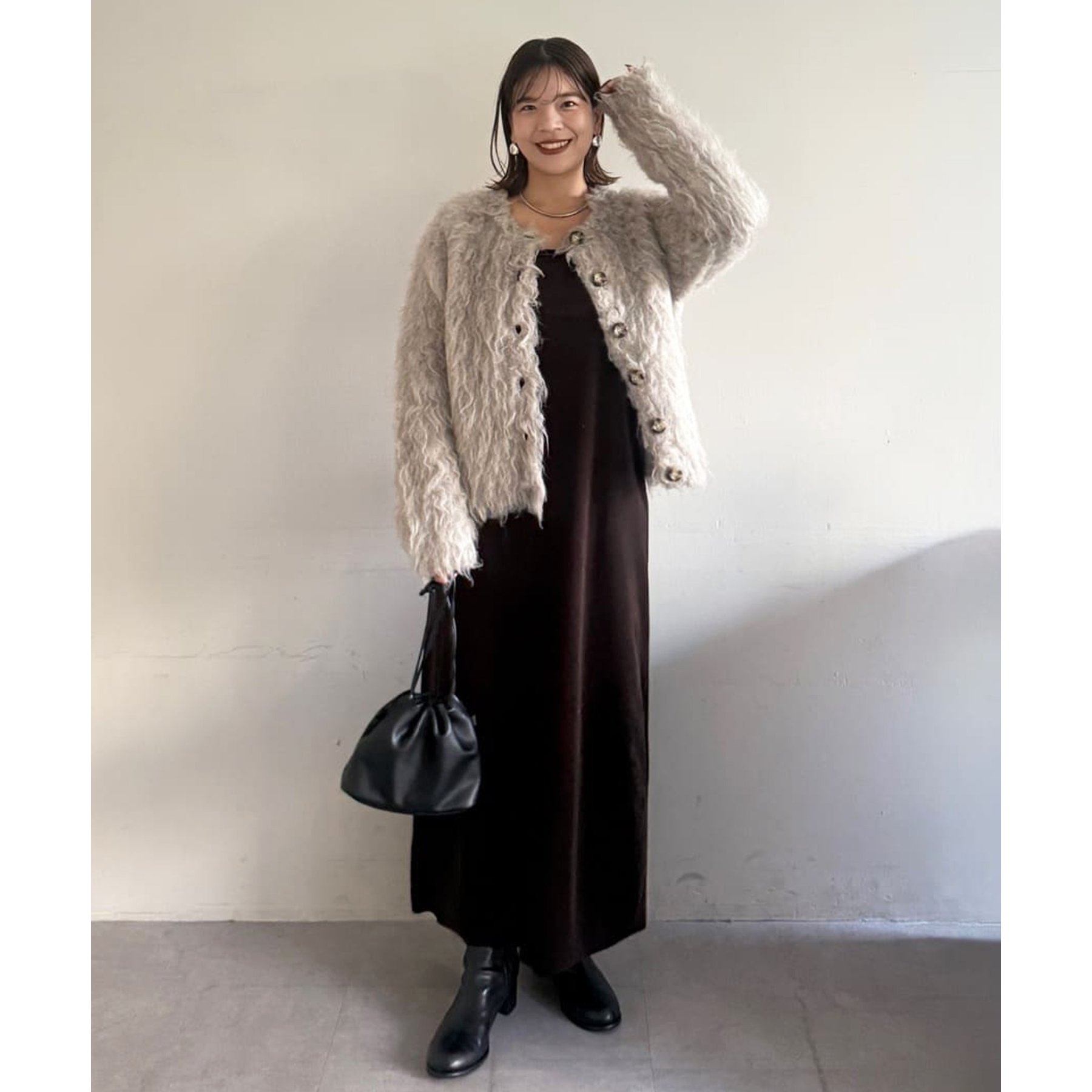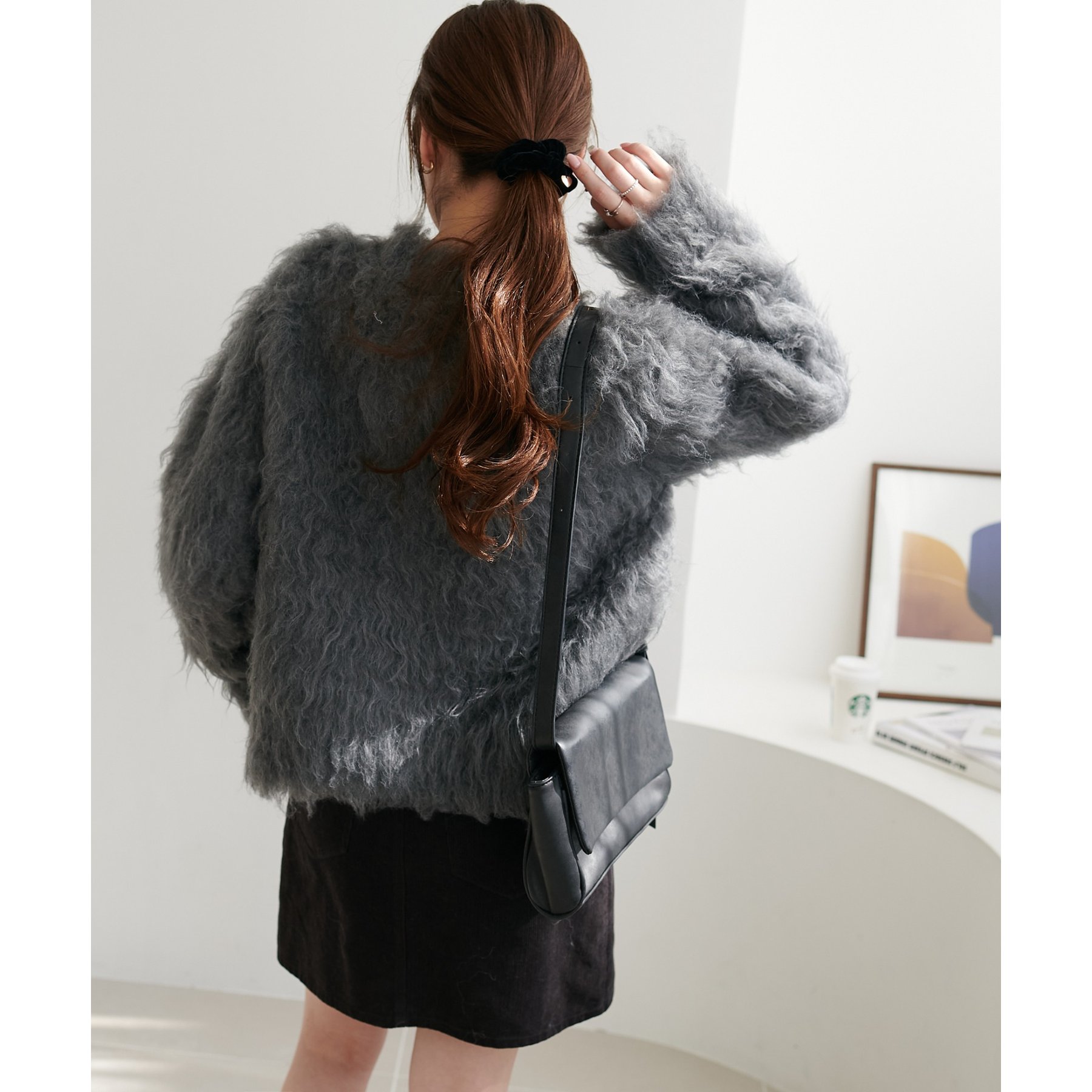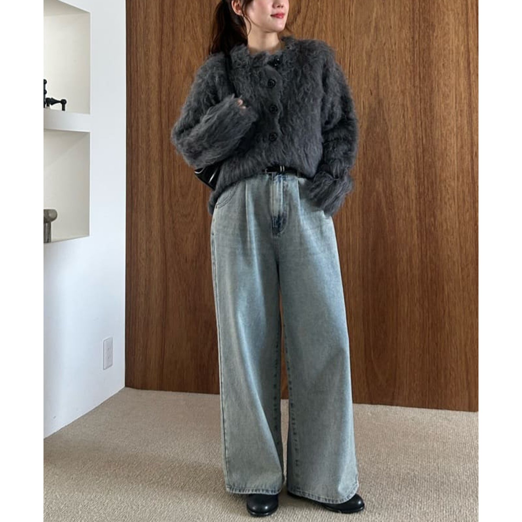 ふわふわのシャギー素材が主役になるので、シンプルなアイテムと合わせるだけでコーデが完成。
