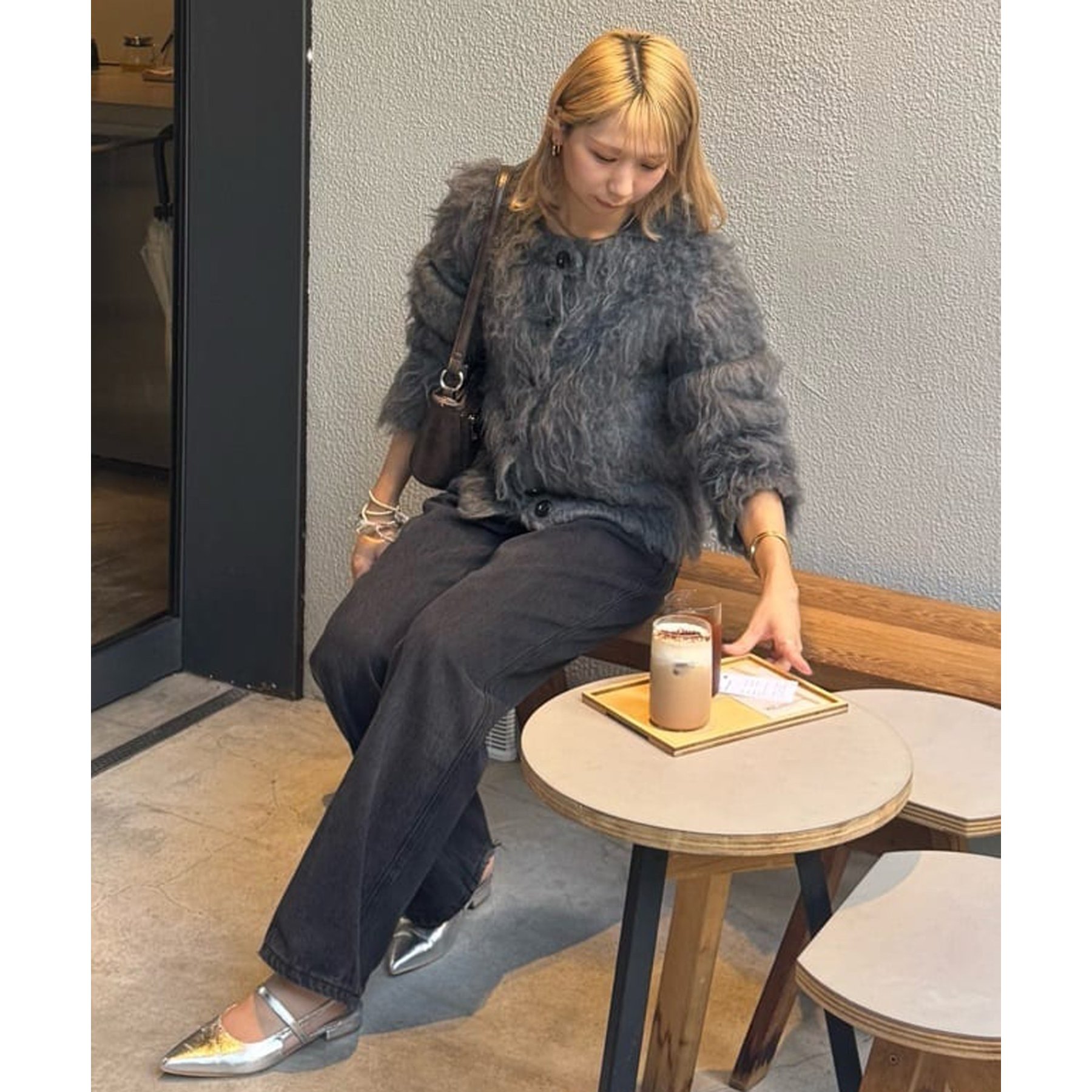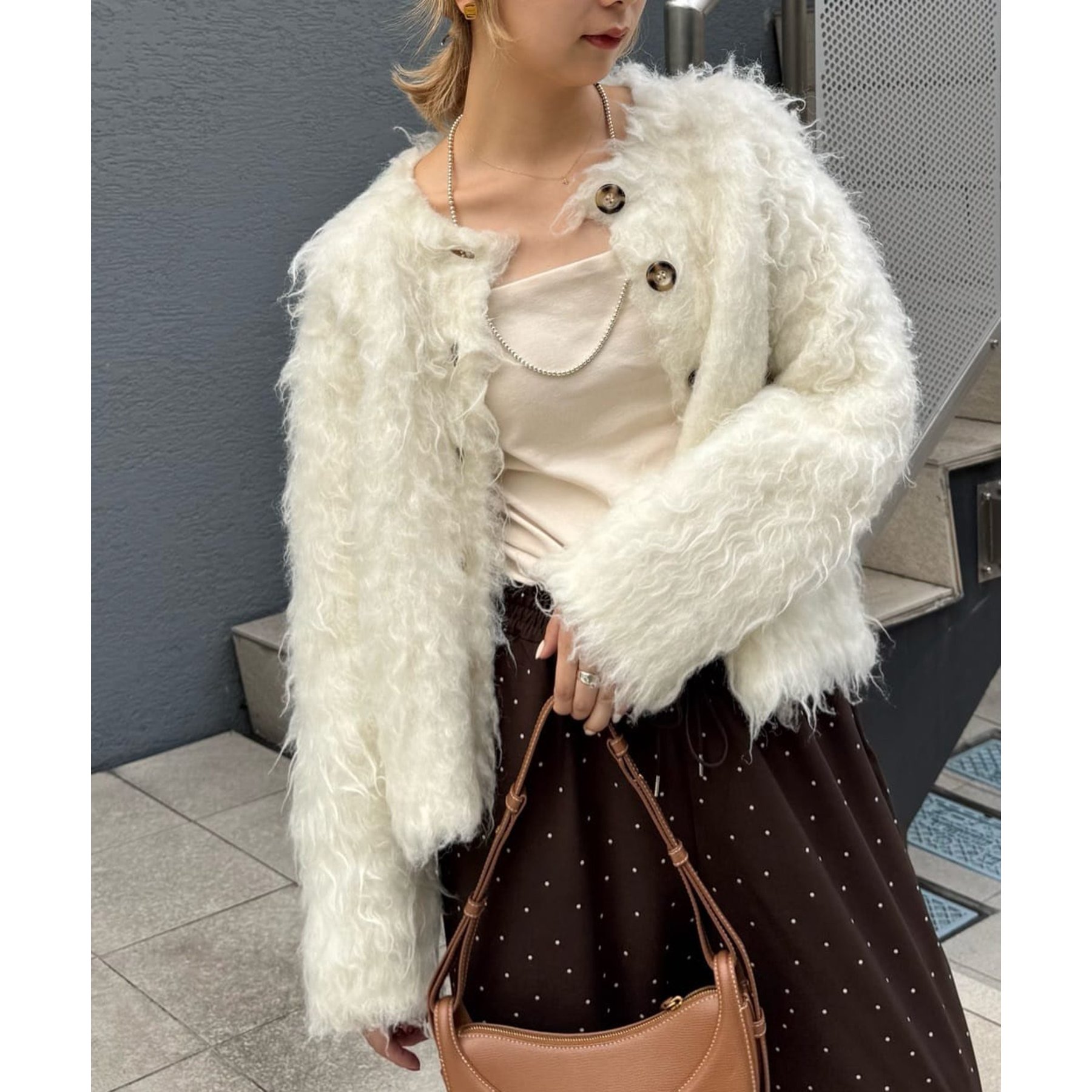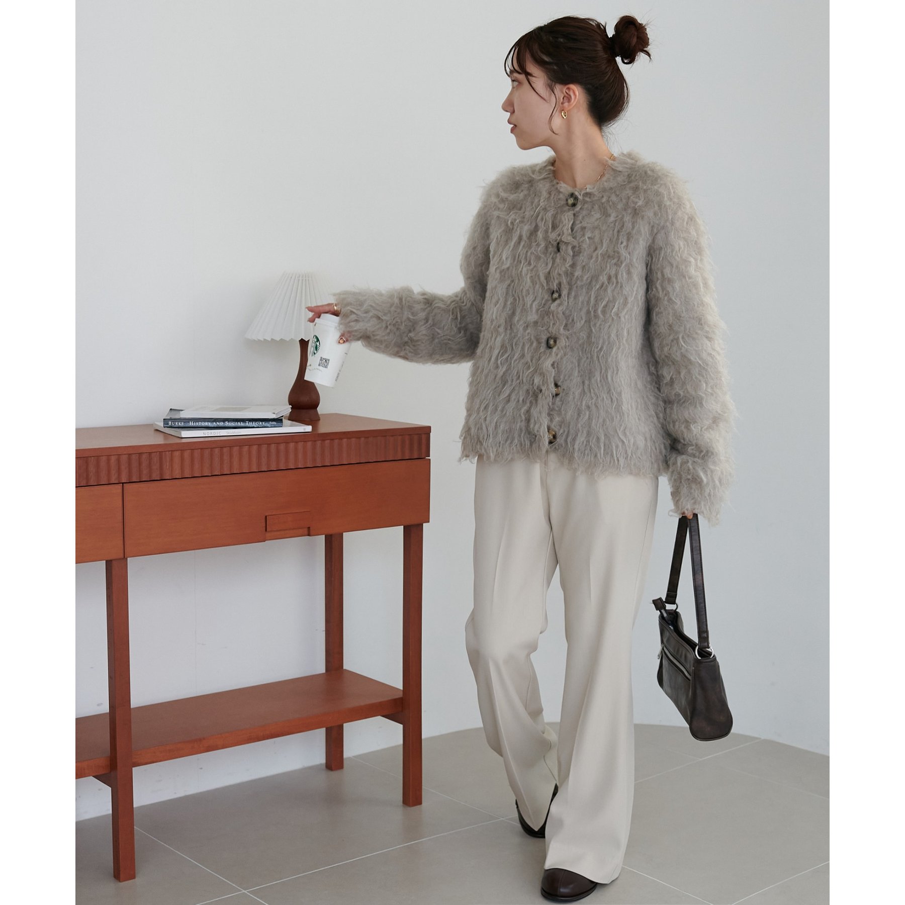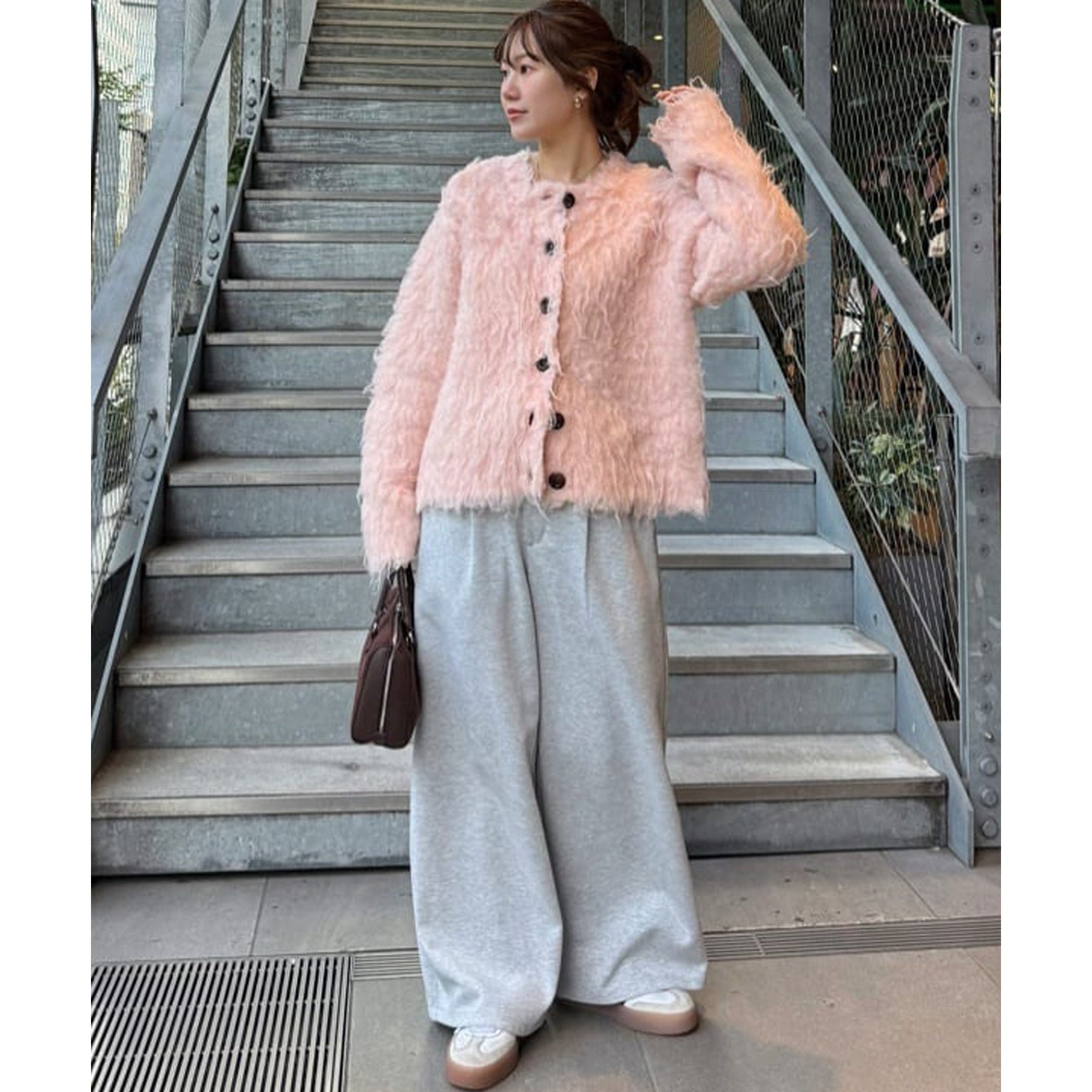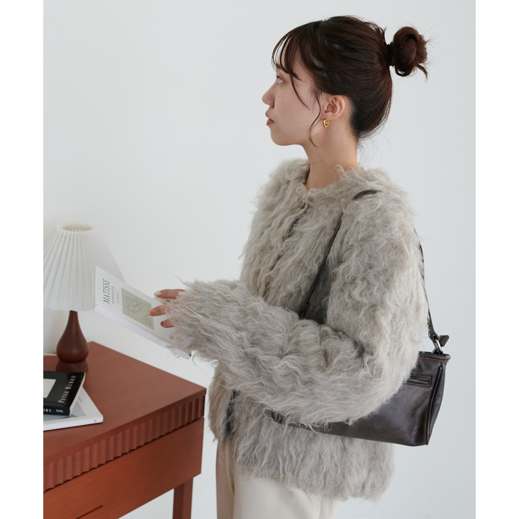 ふわふわのシャギー素材が主役になるので、シンプルなアイテムと合わせるだけでコーデが完成。