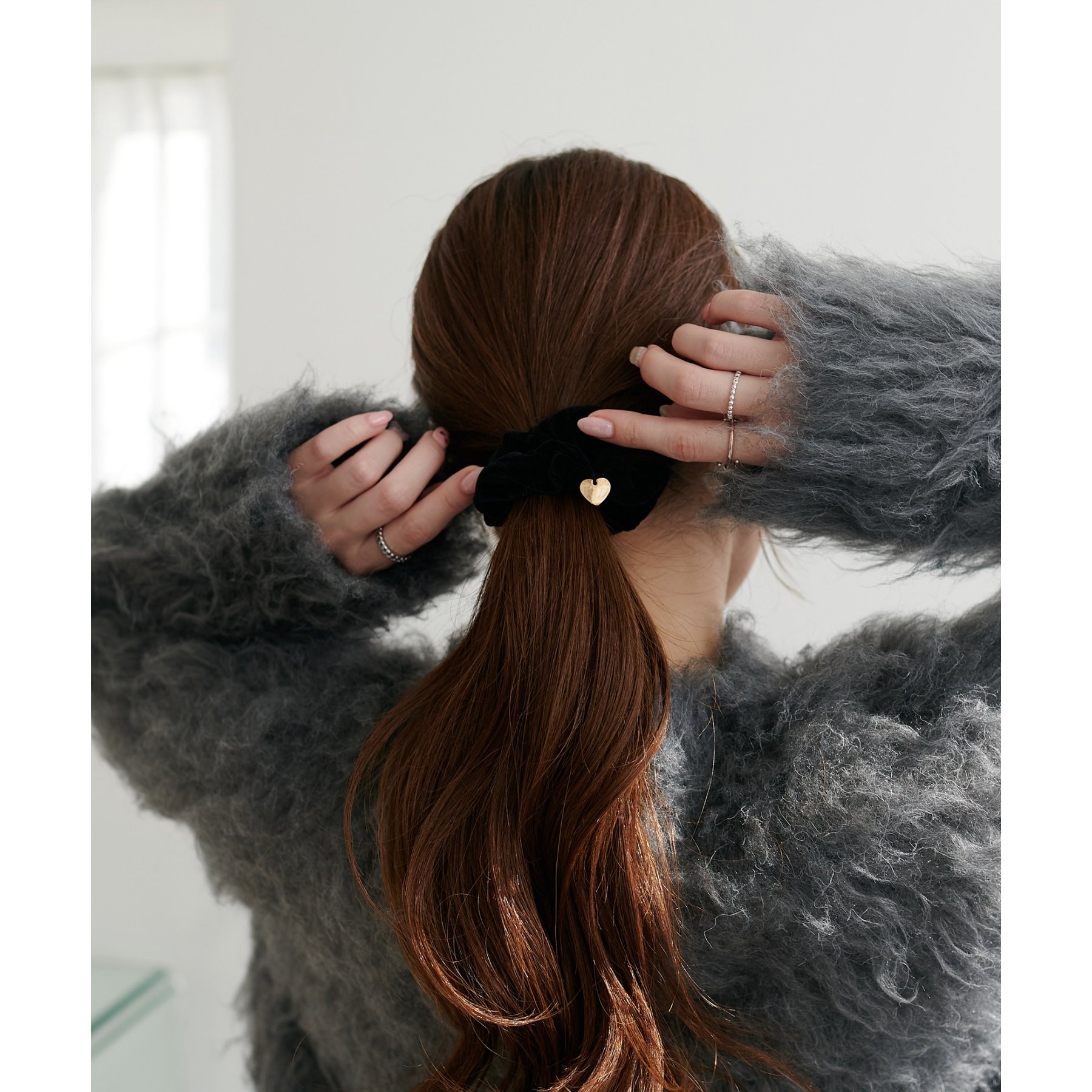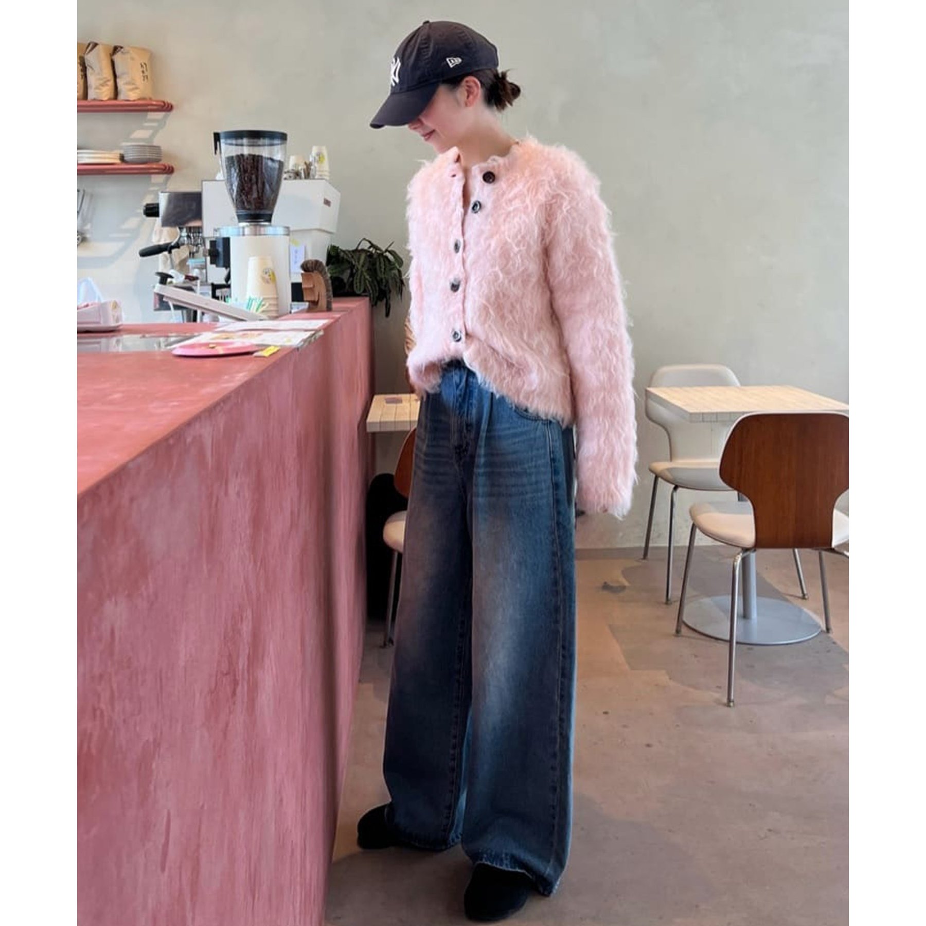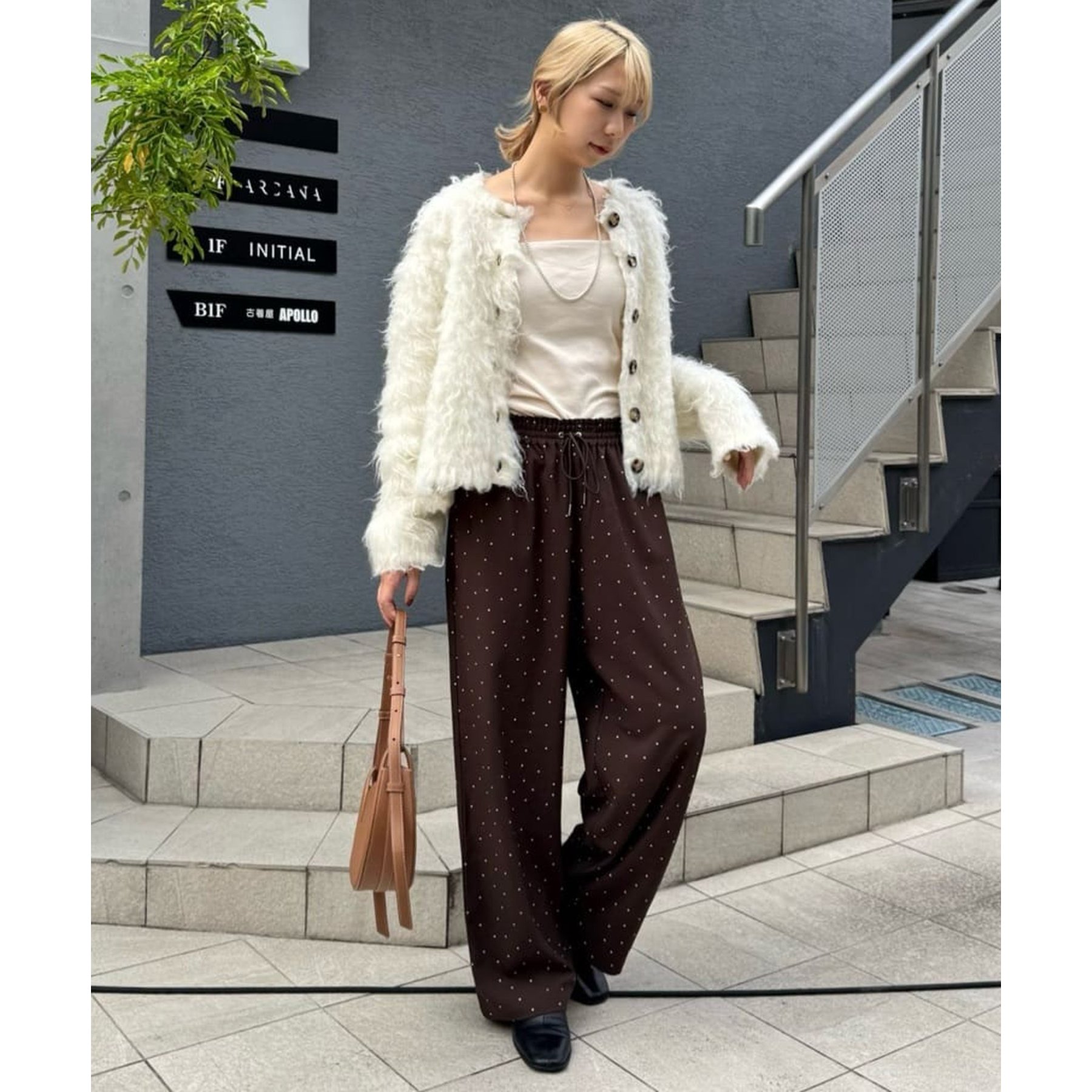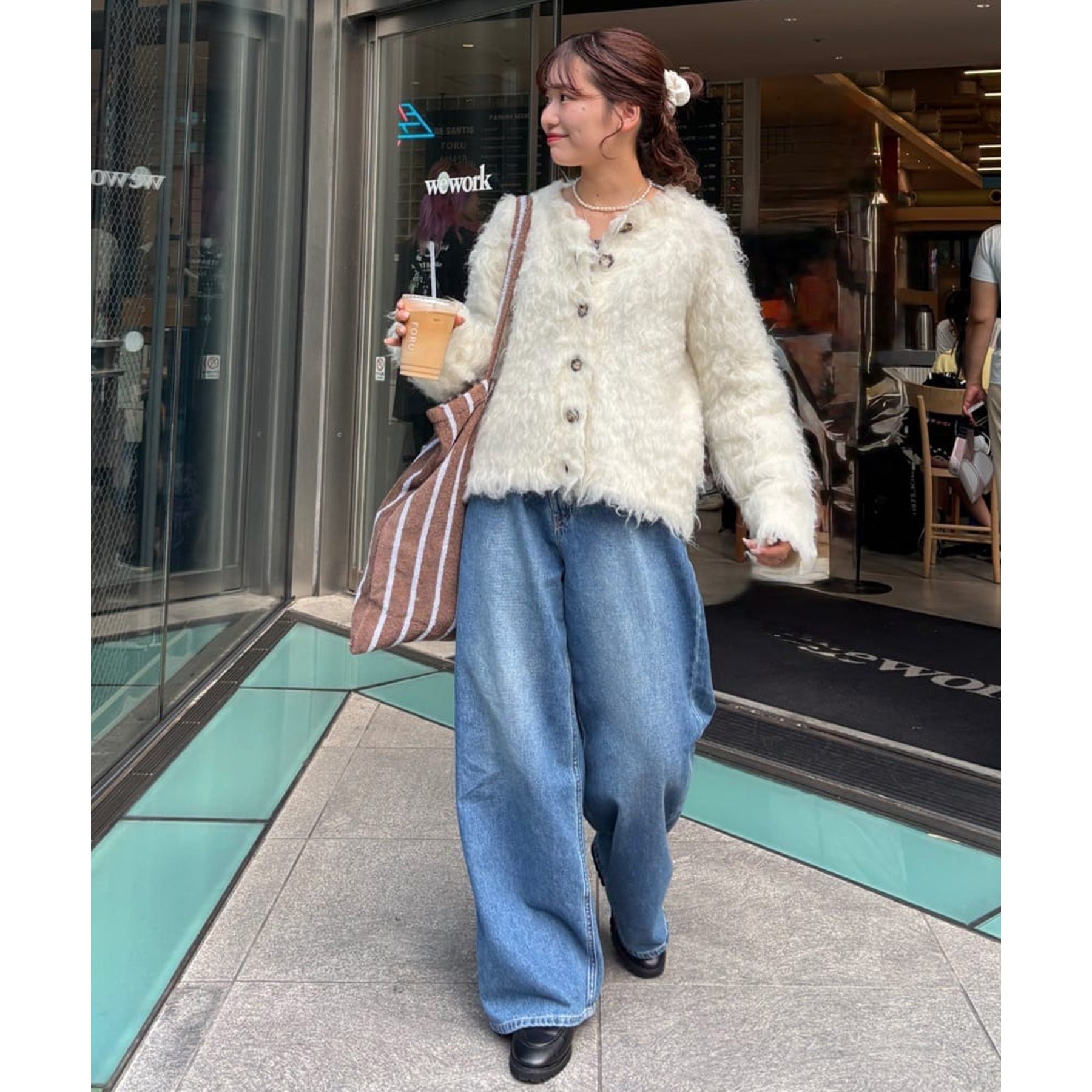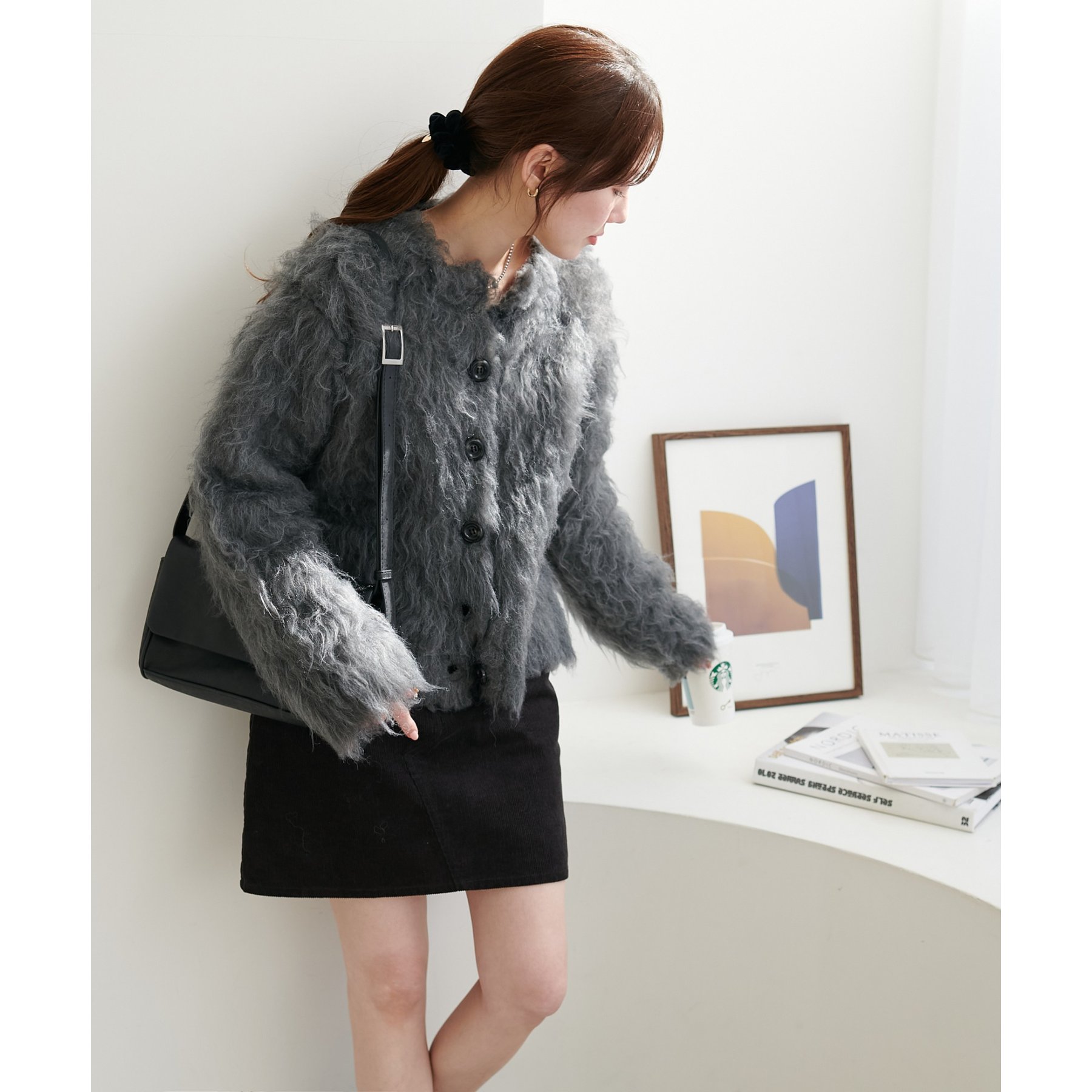ふわふわのシャギー素材が主役になるので、シンプルなアイテムと合わせるだけでコーデが完成。