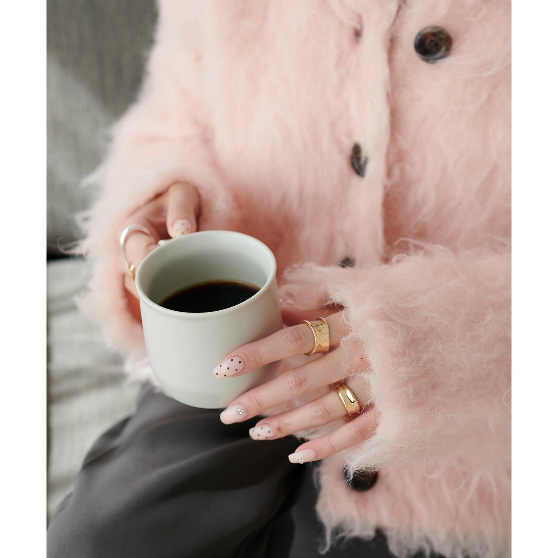 フロントには存在感のあるマーブル調のボタンを付け、コーディネートのアクセントに。
