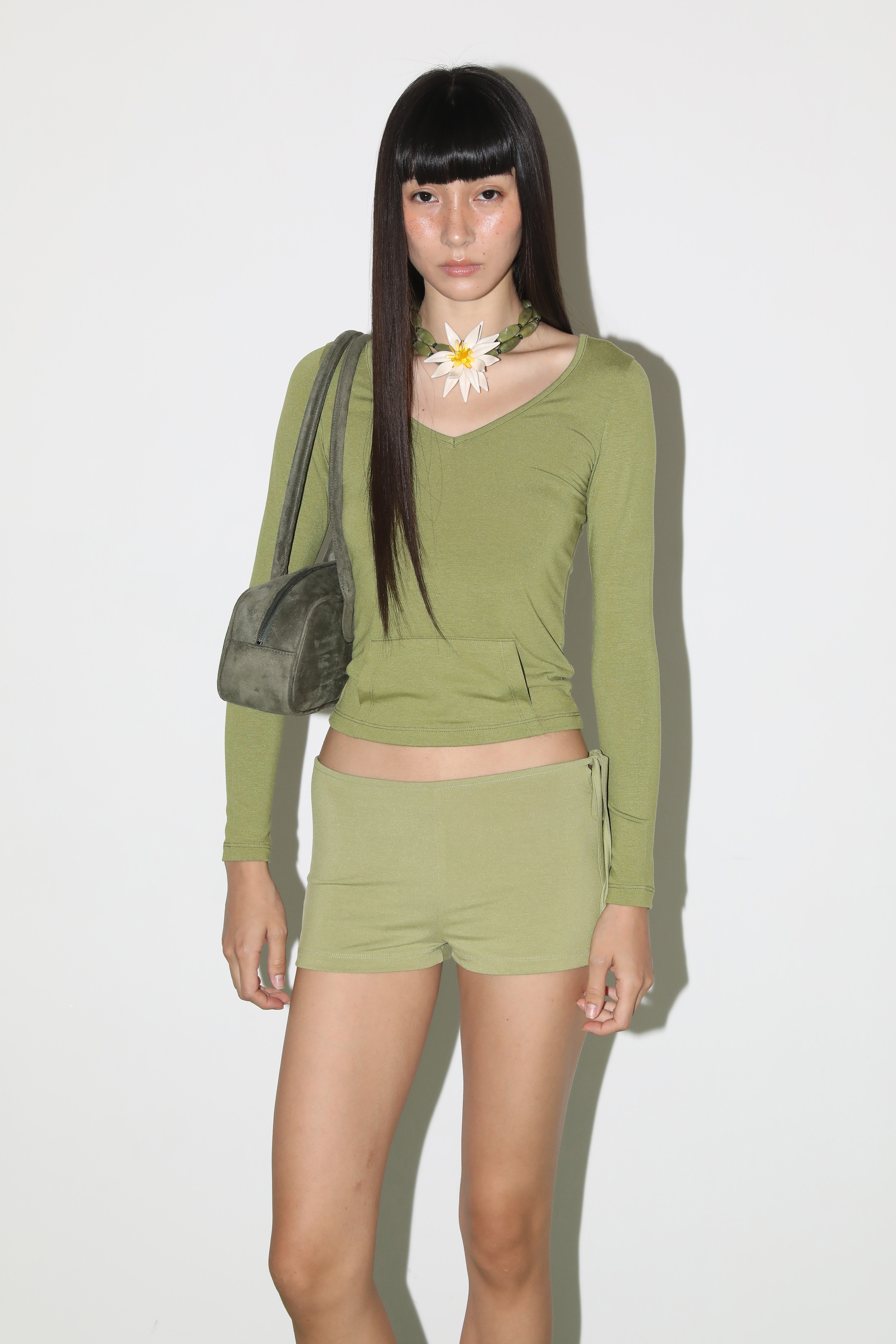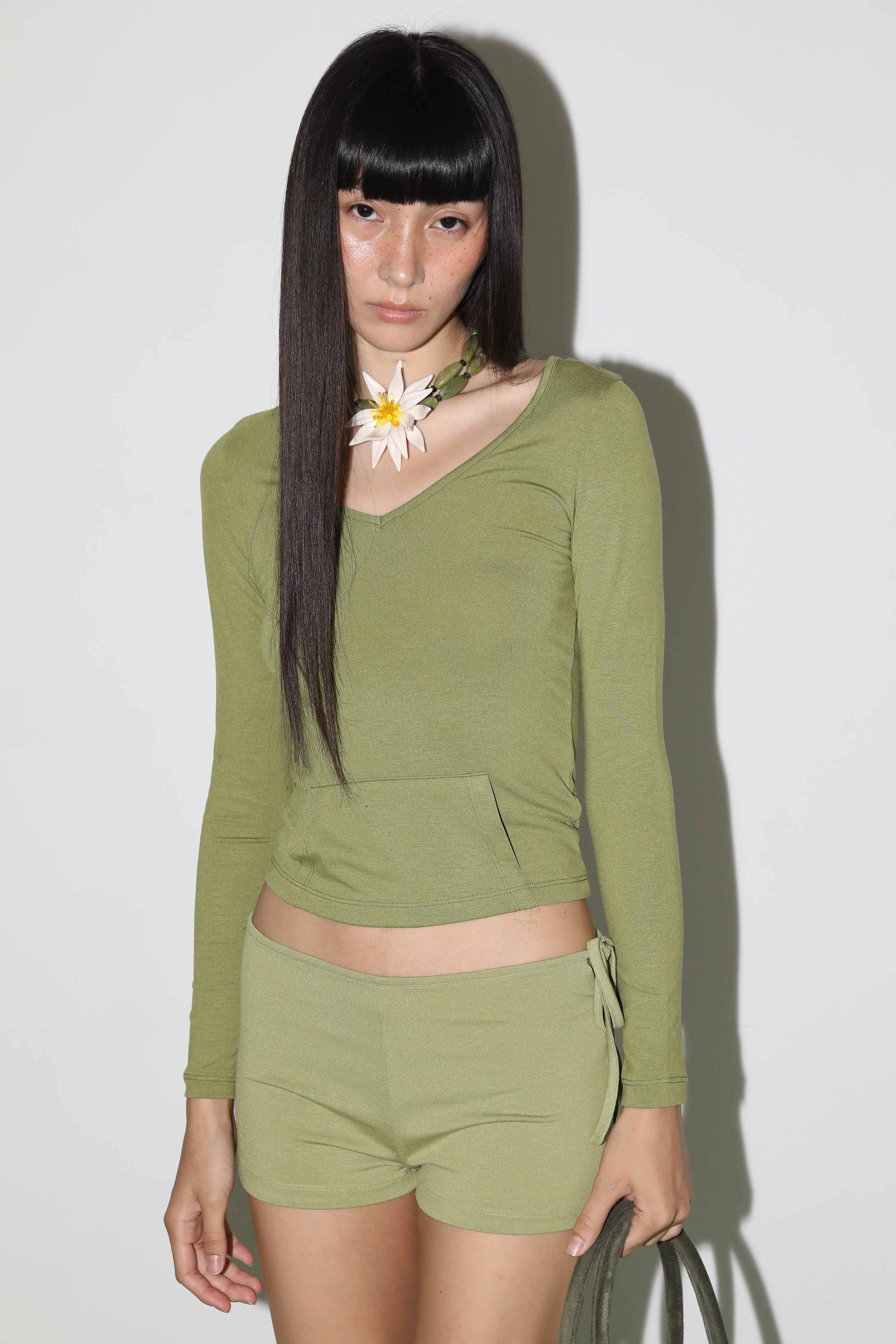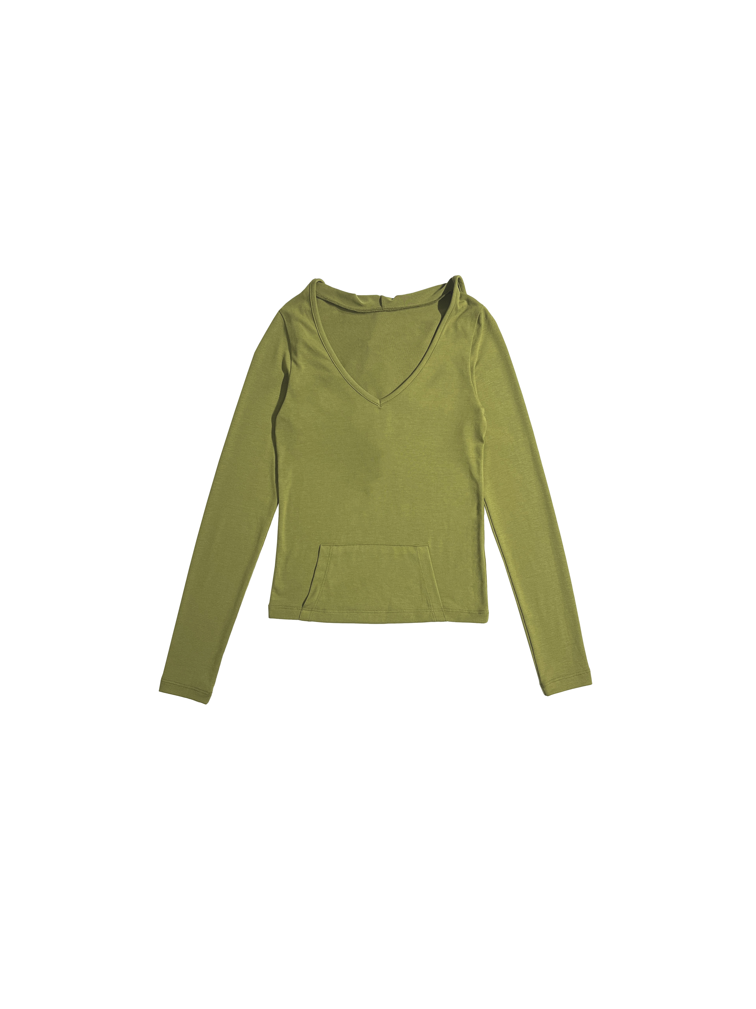 ビビッドカラーポイントのスリムフィットフードトップ。