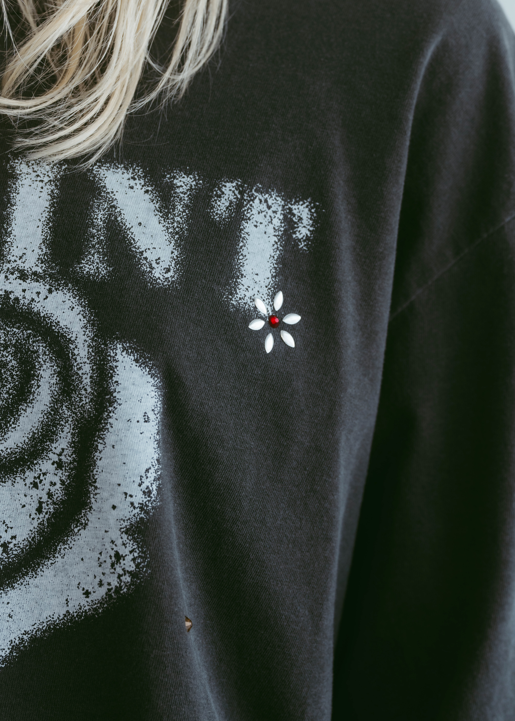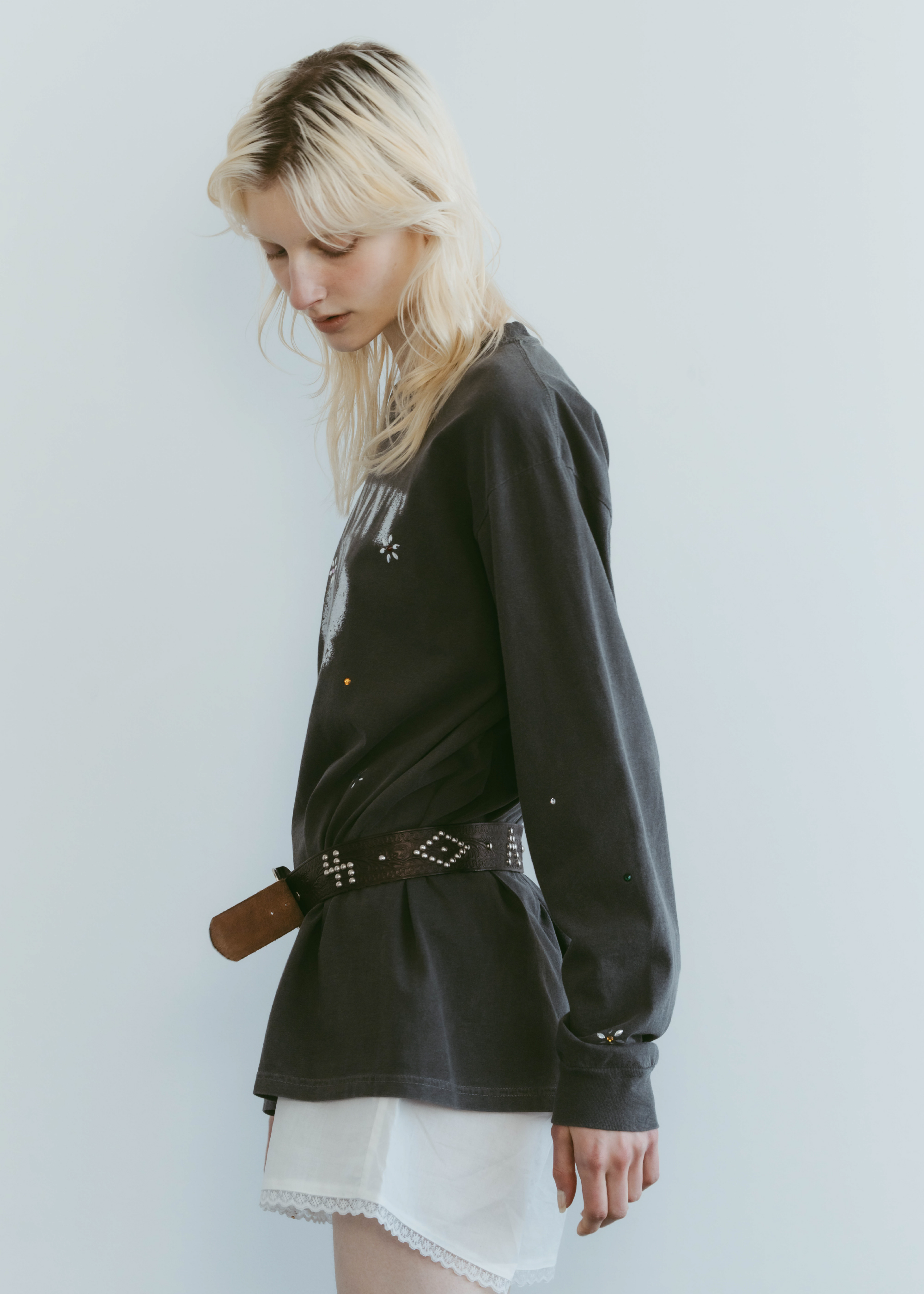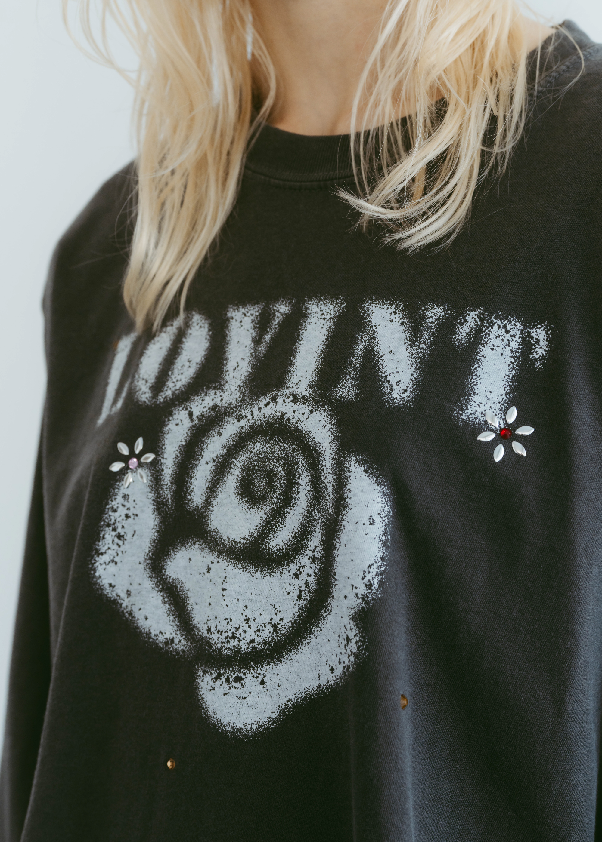 花を象ったスタッズを一点一点圧着し、繊細な立体感をプラス。
