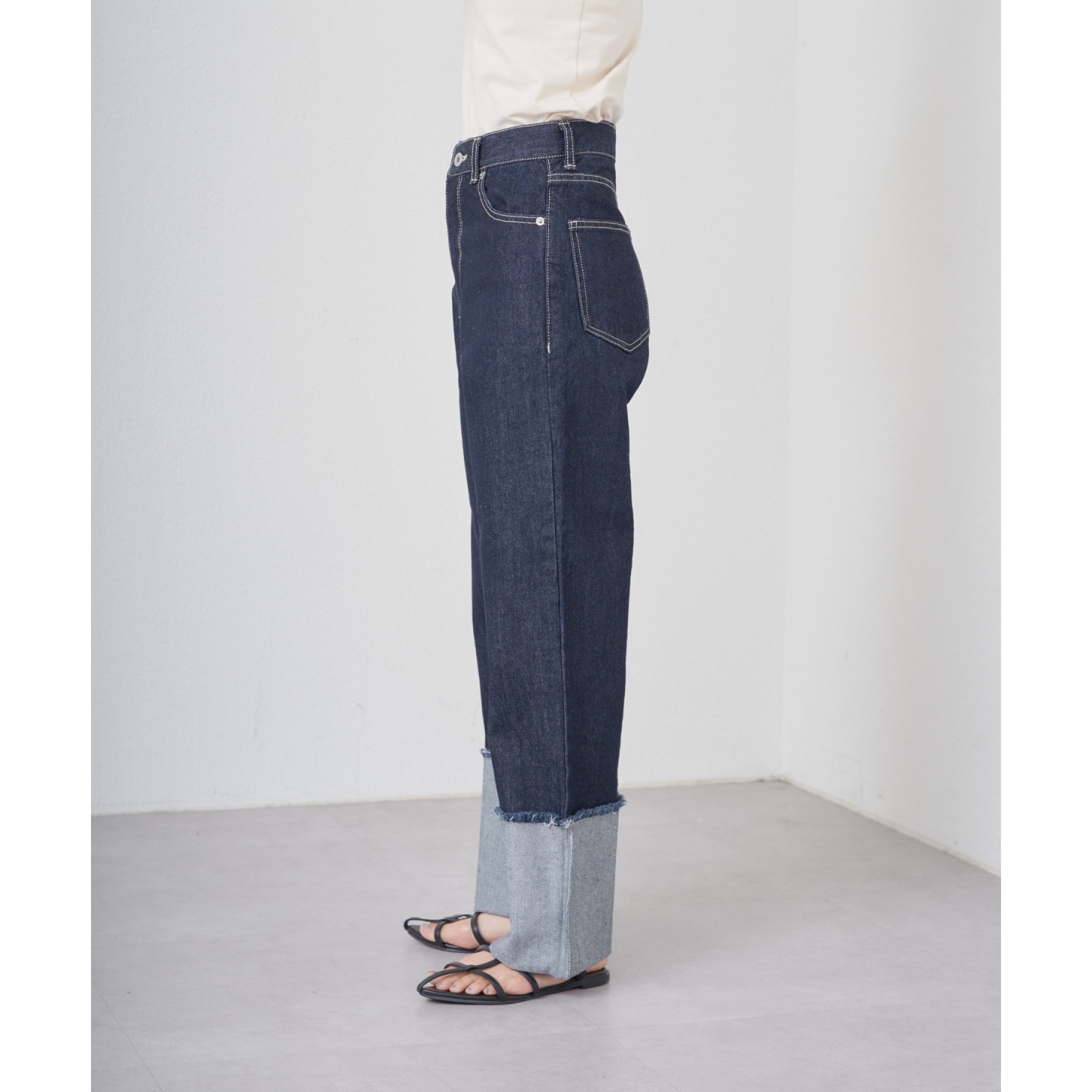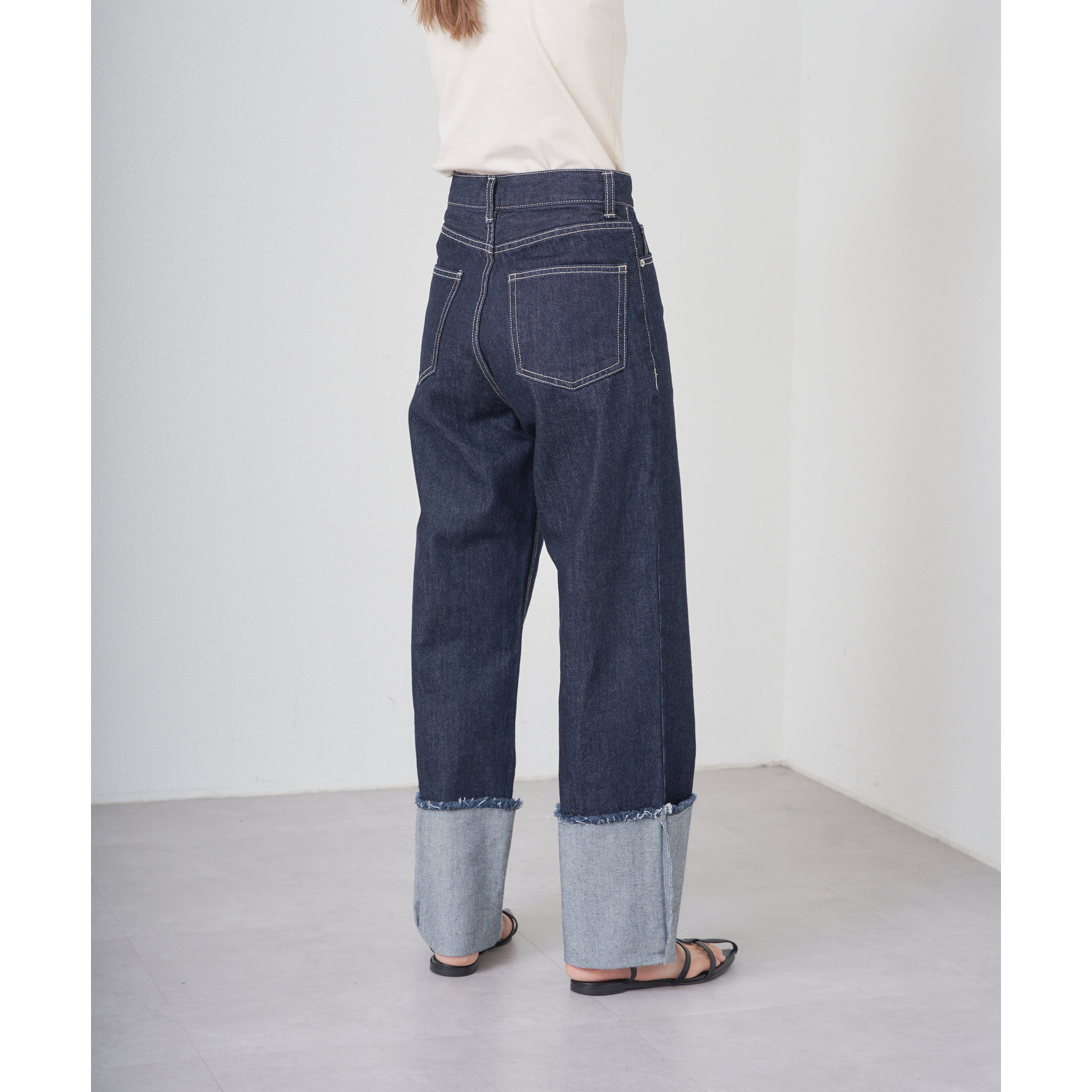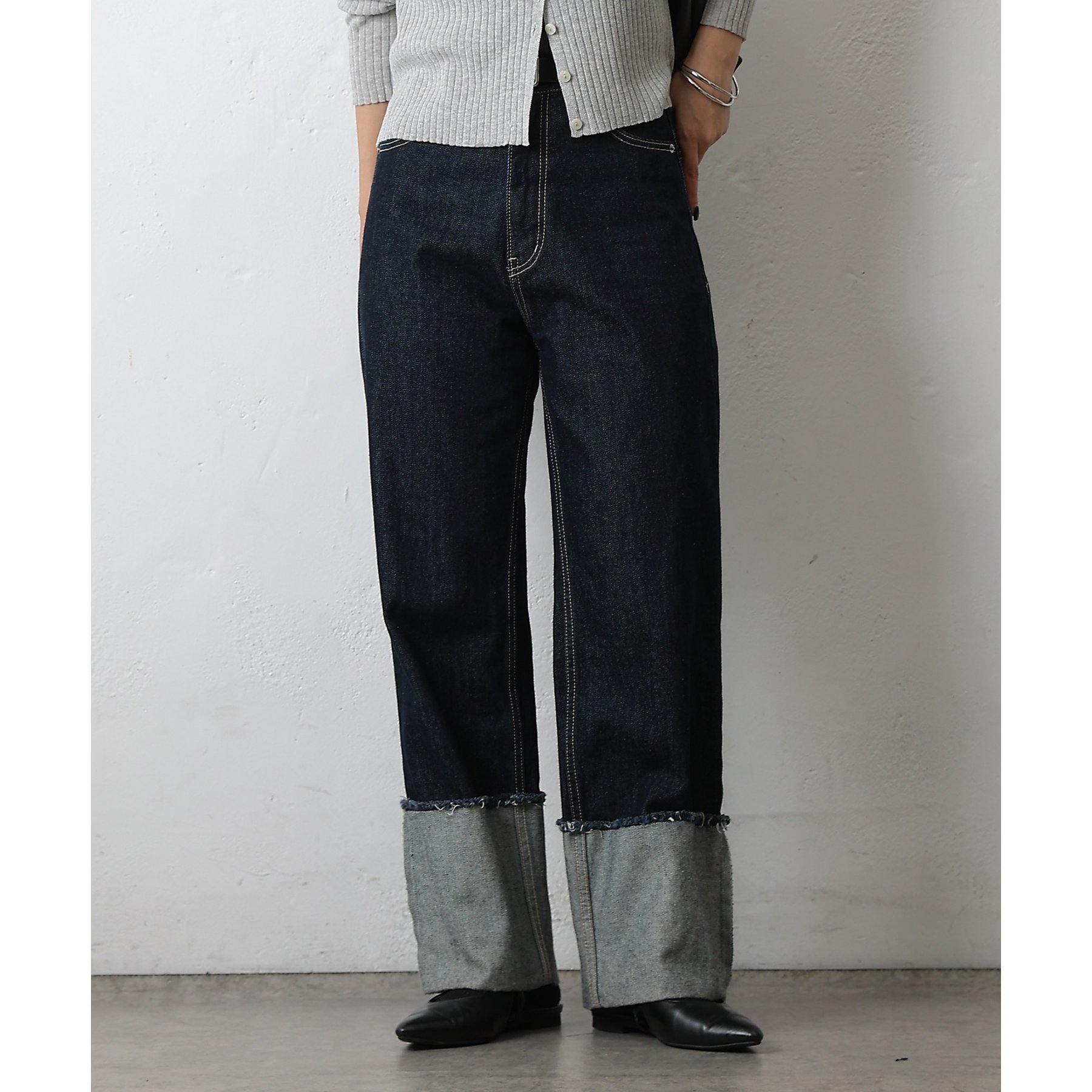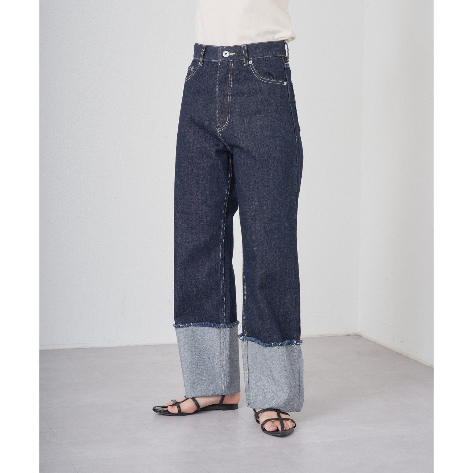 存在感のある太めなロールアップがオシャレなデニムパンツ。
