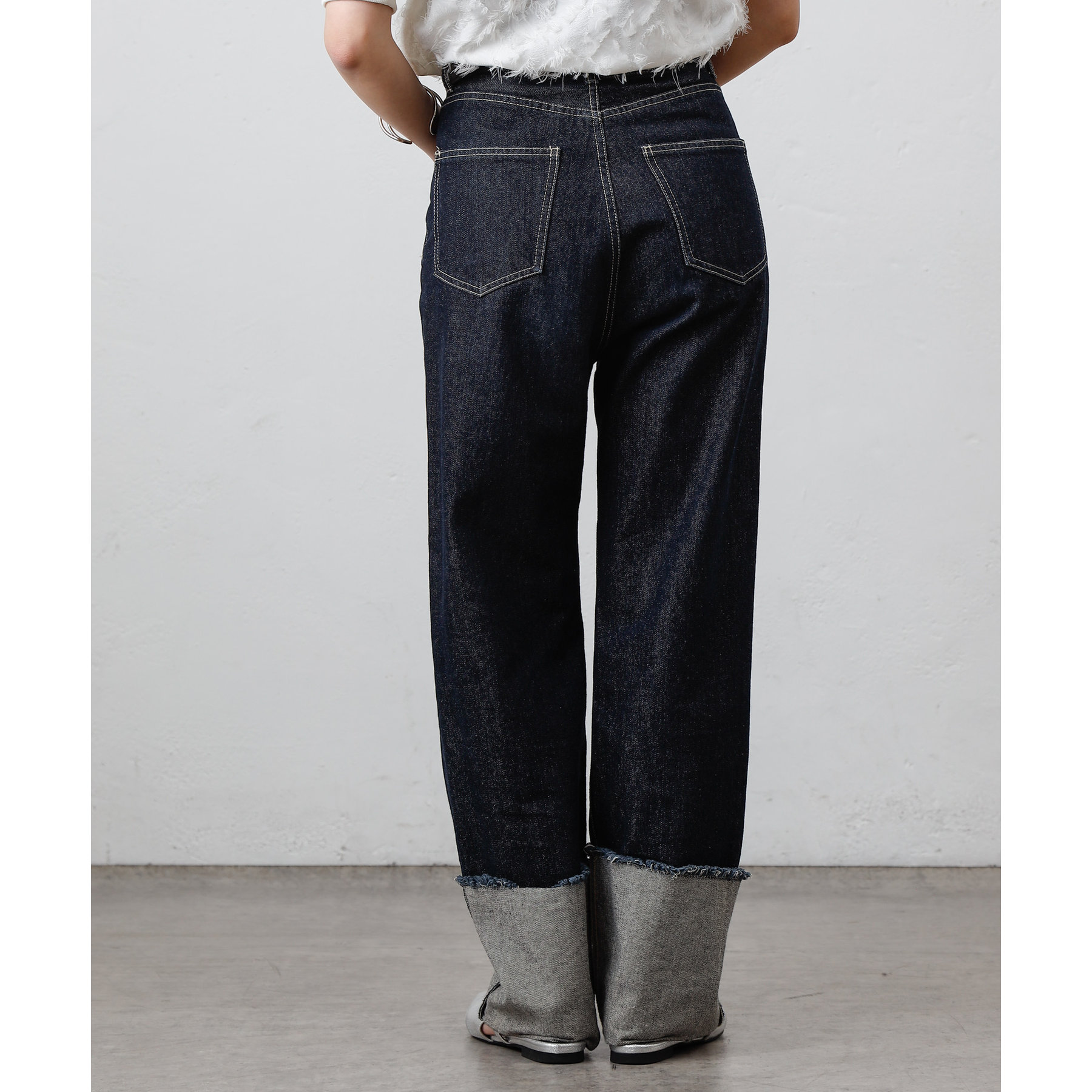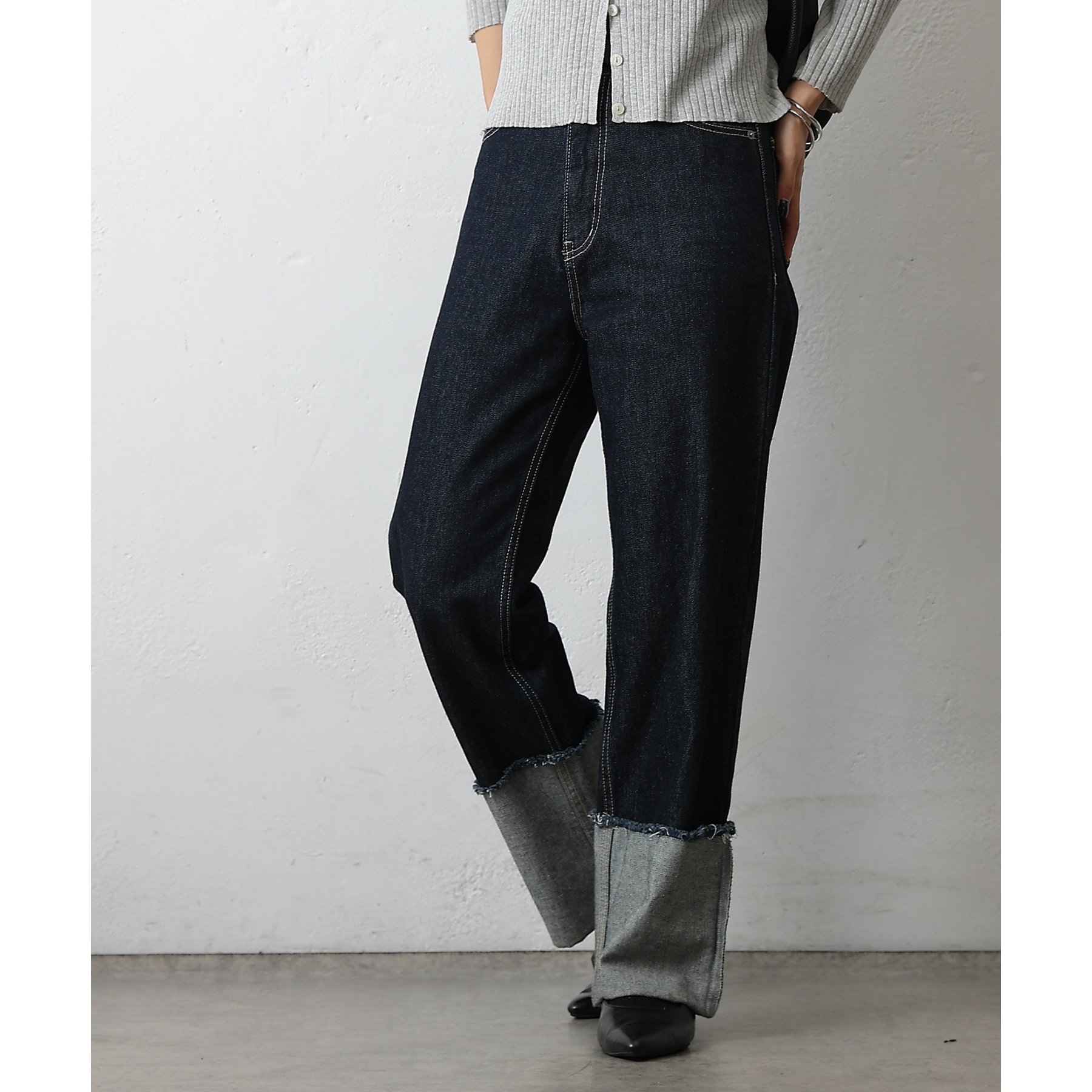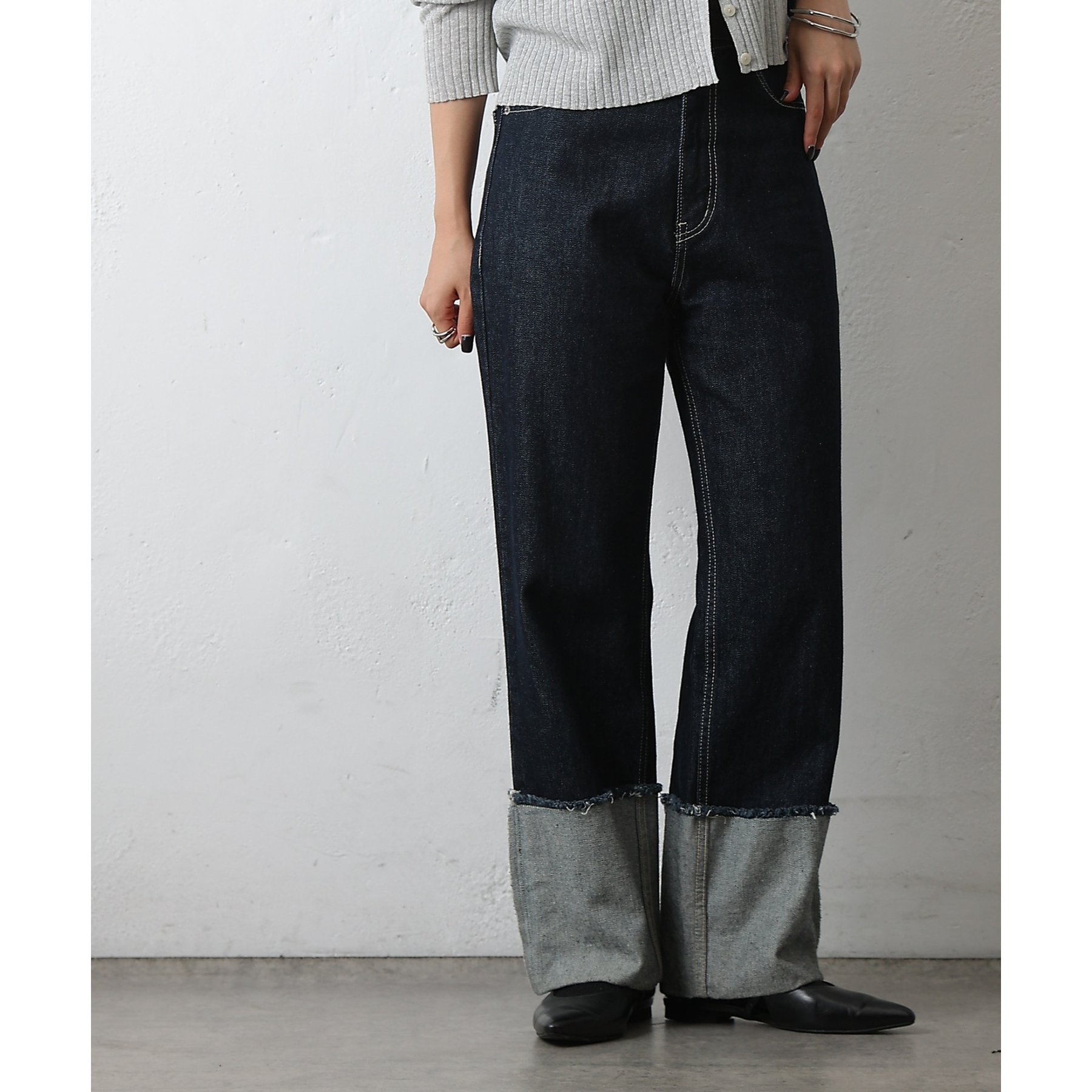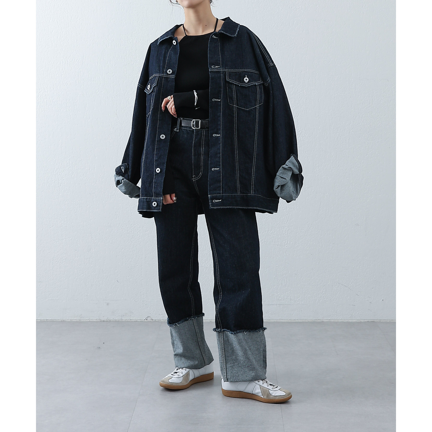 存在感のある太めなロールアップがオシャレなデニムパンツ。
