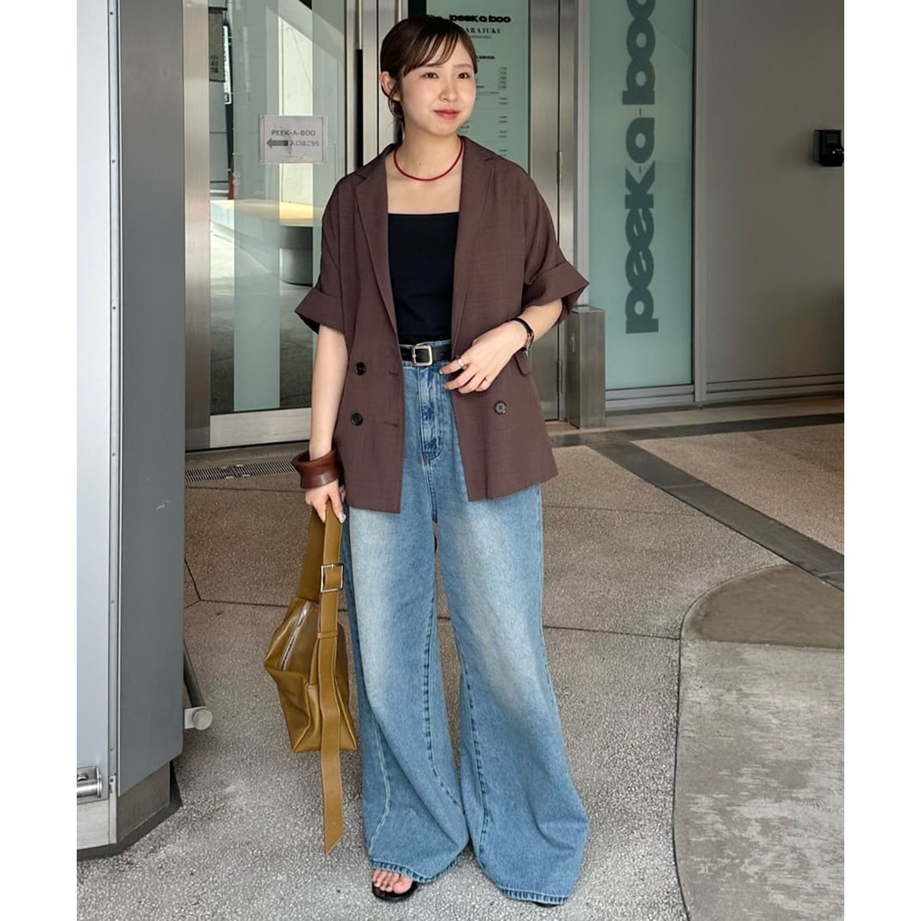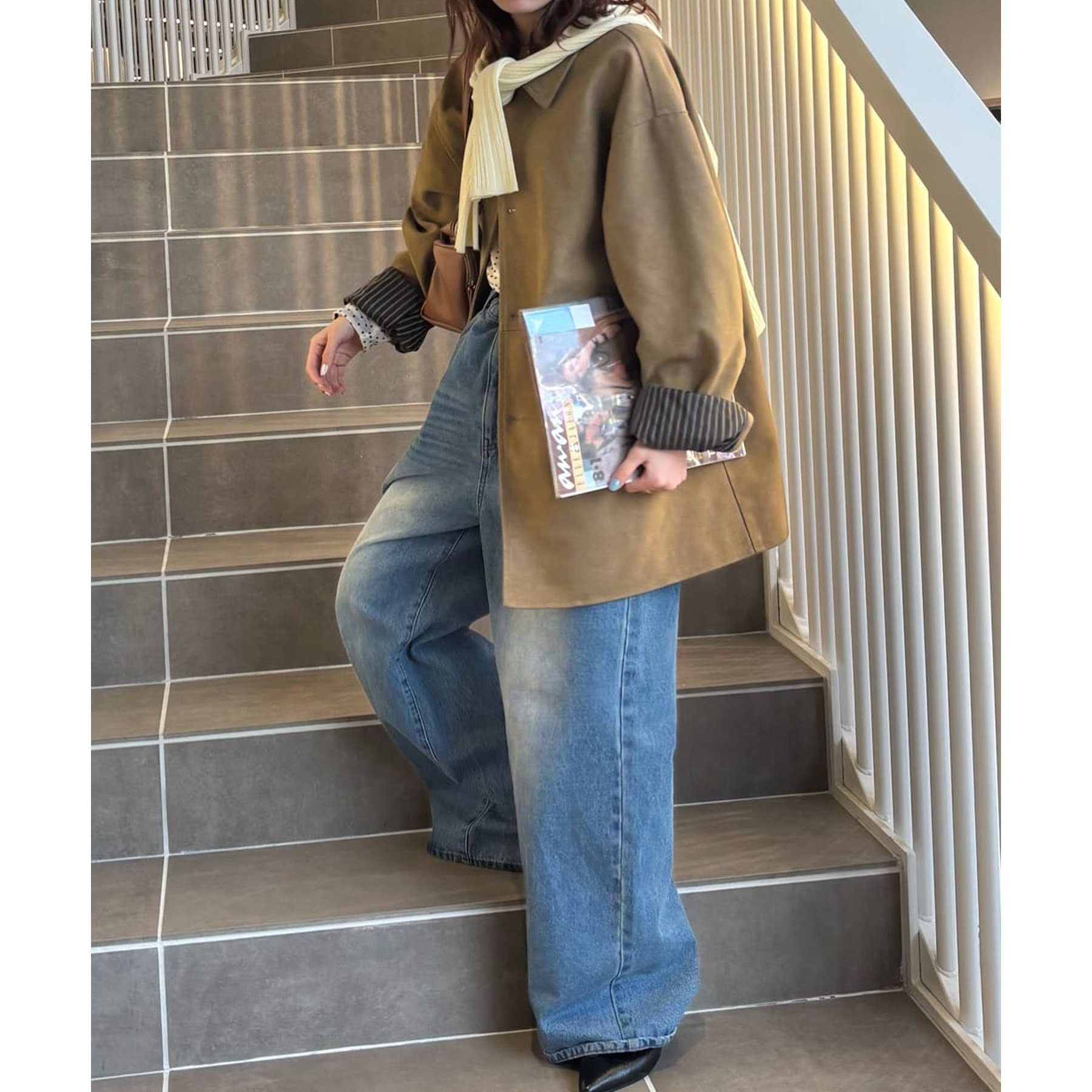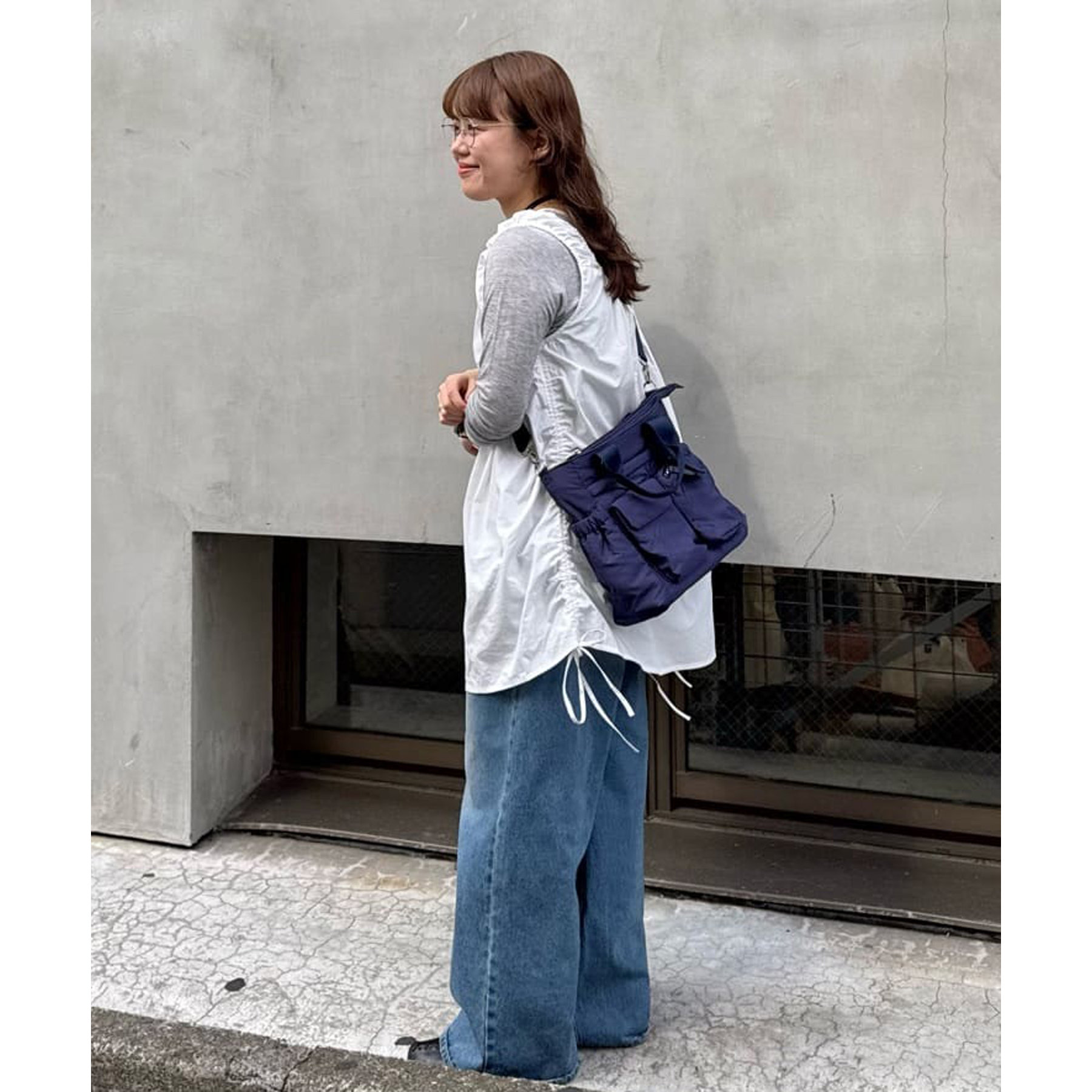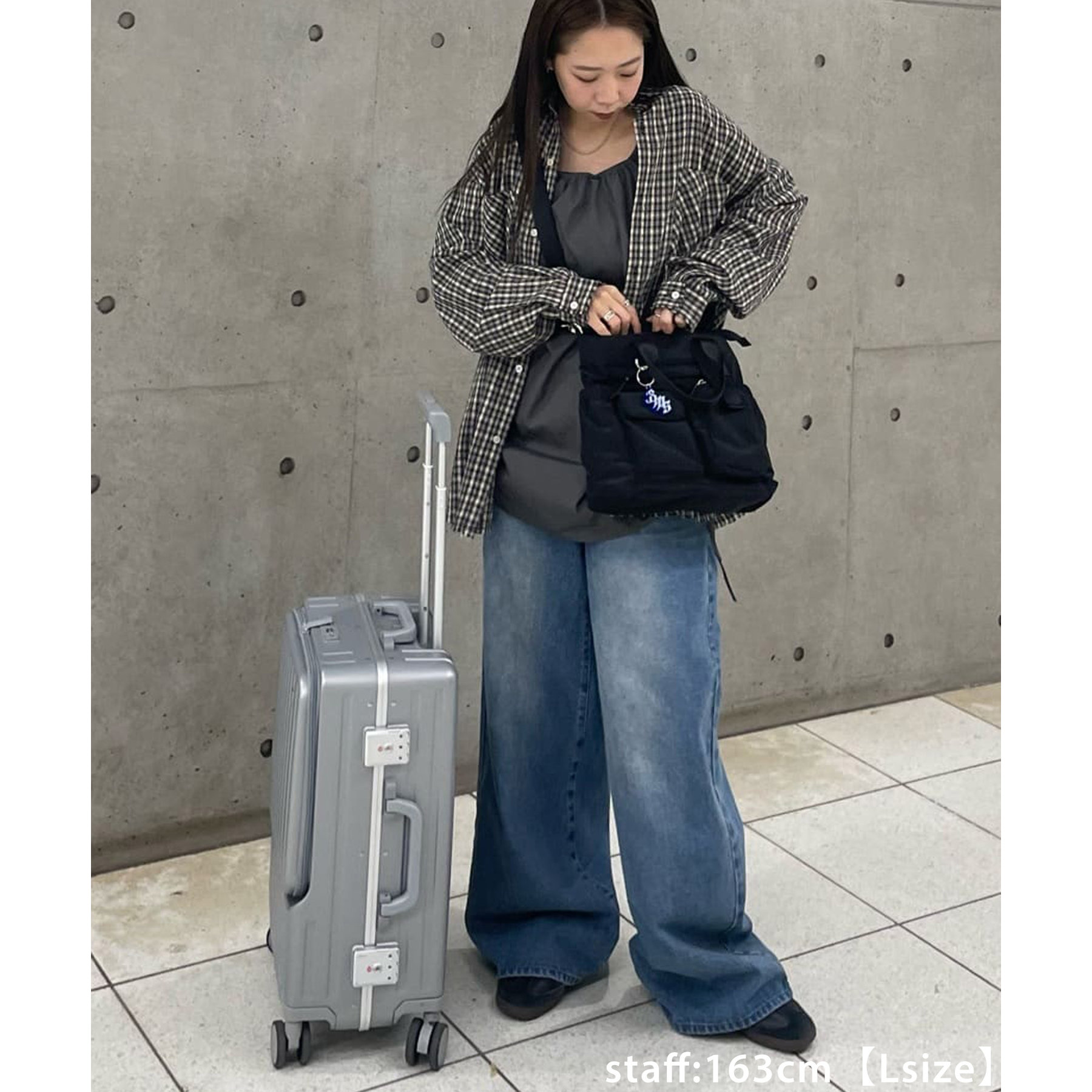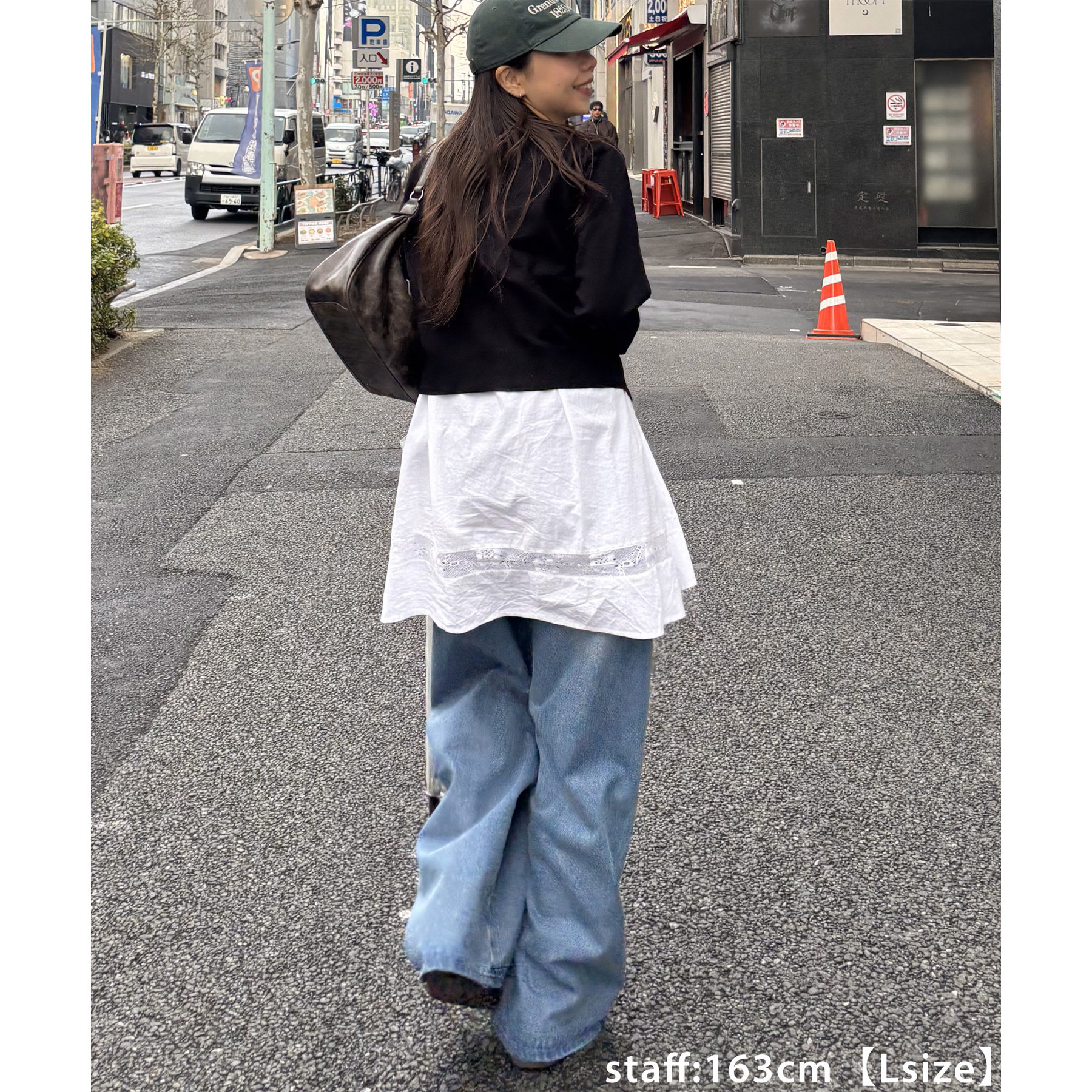 157cmスタッフ(Mサイズ着用):長めの着丈なのでブーツや少し高めのスニーカー合わせがおすすめ!甘めなブラウスと合わせてカジュアルダウンさせた着こなしも可愛い♡