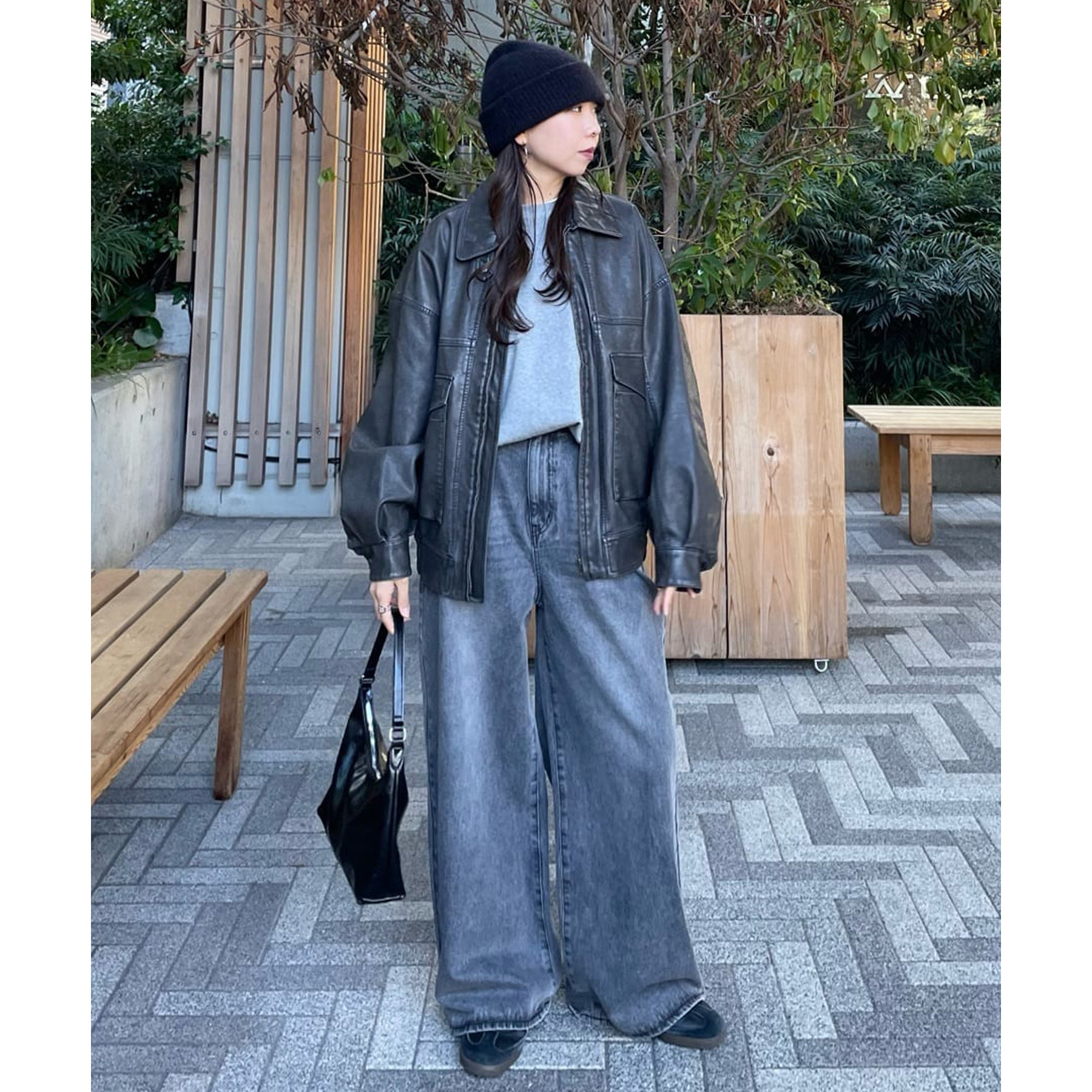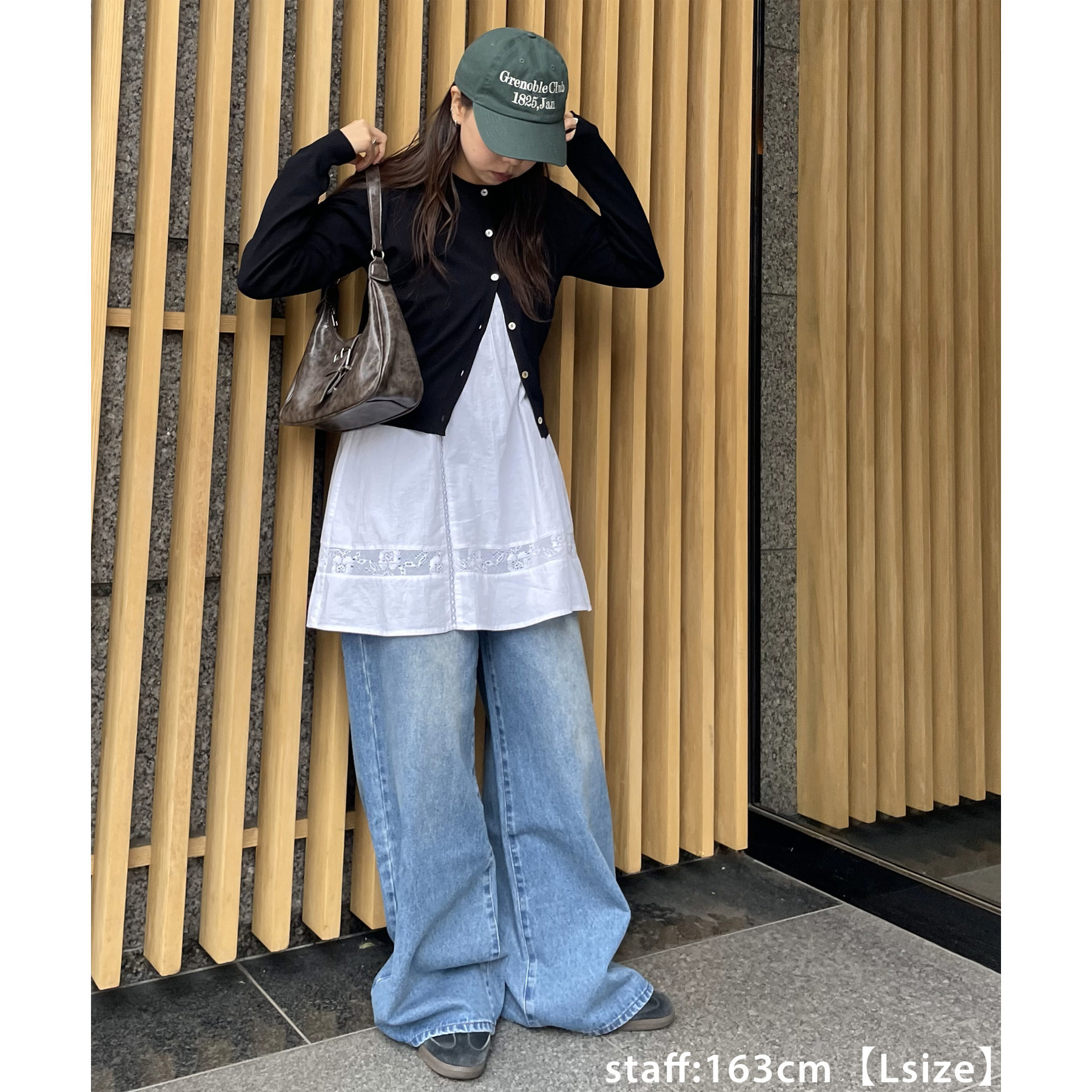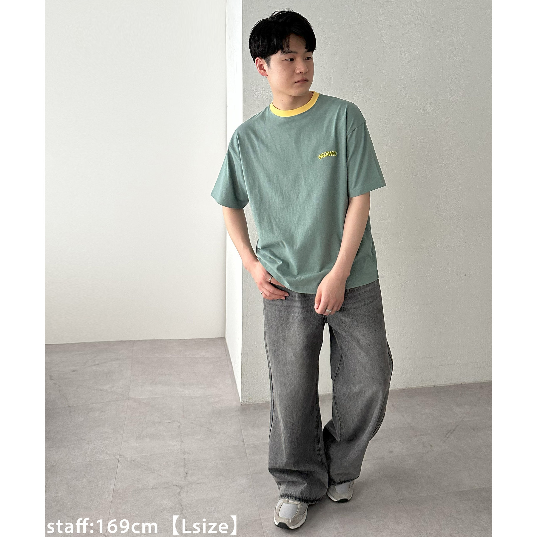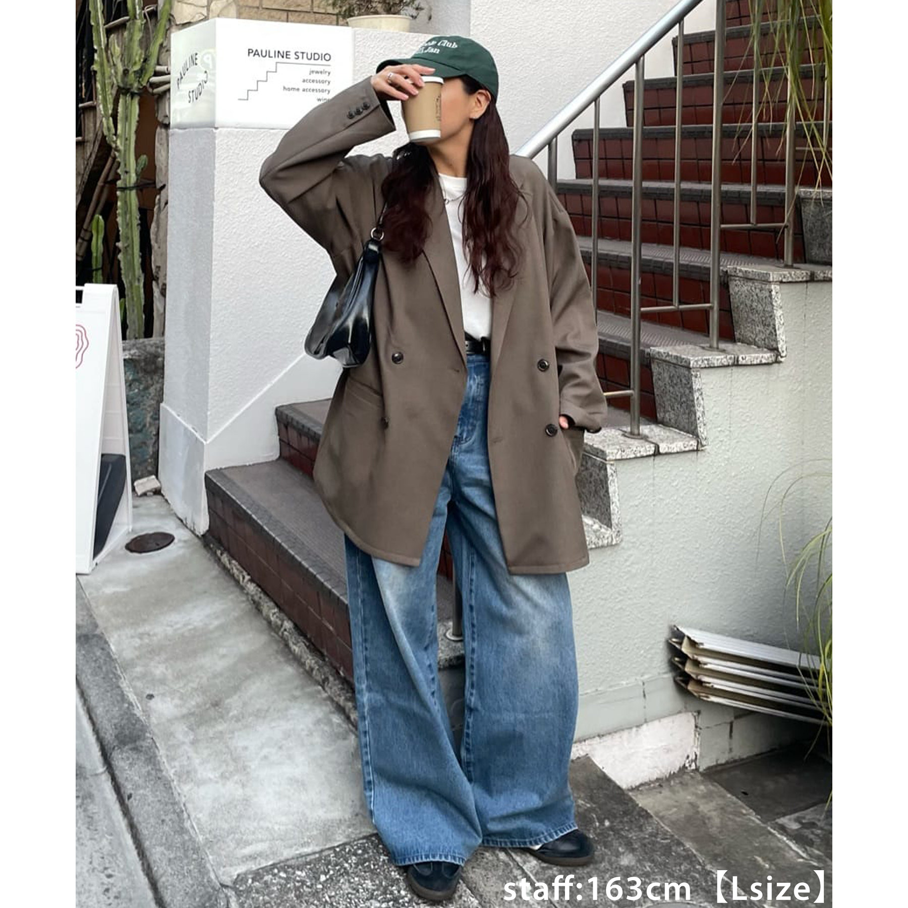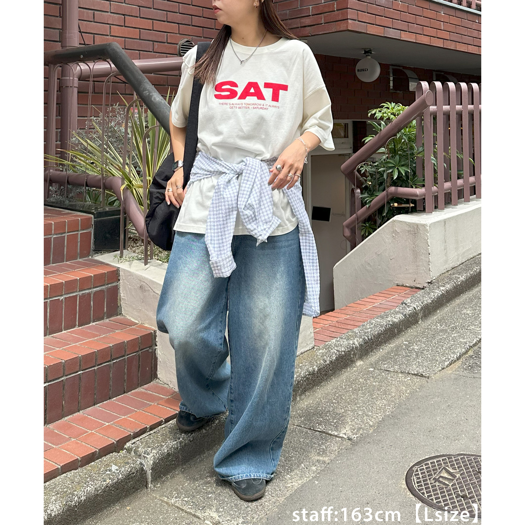 170cmスタッフ(Lサイズ着用):ゆったりめが好きな人にはLサイズがおすすめです。どんなトップスとも相性がよくたくさん着まわせます♩