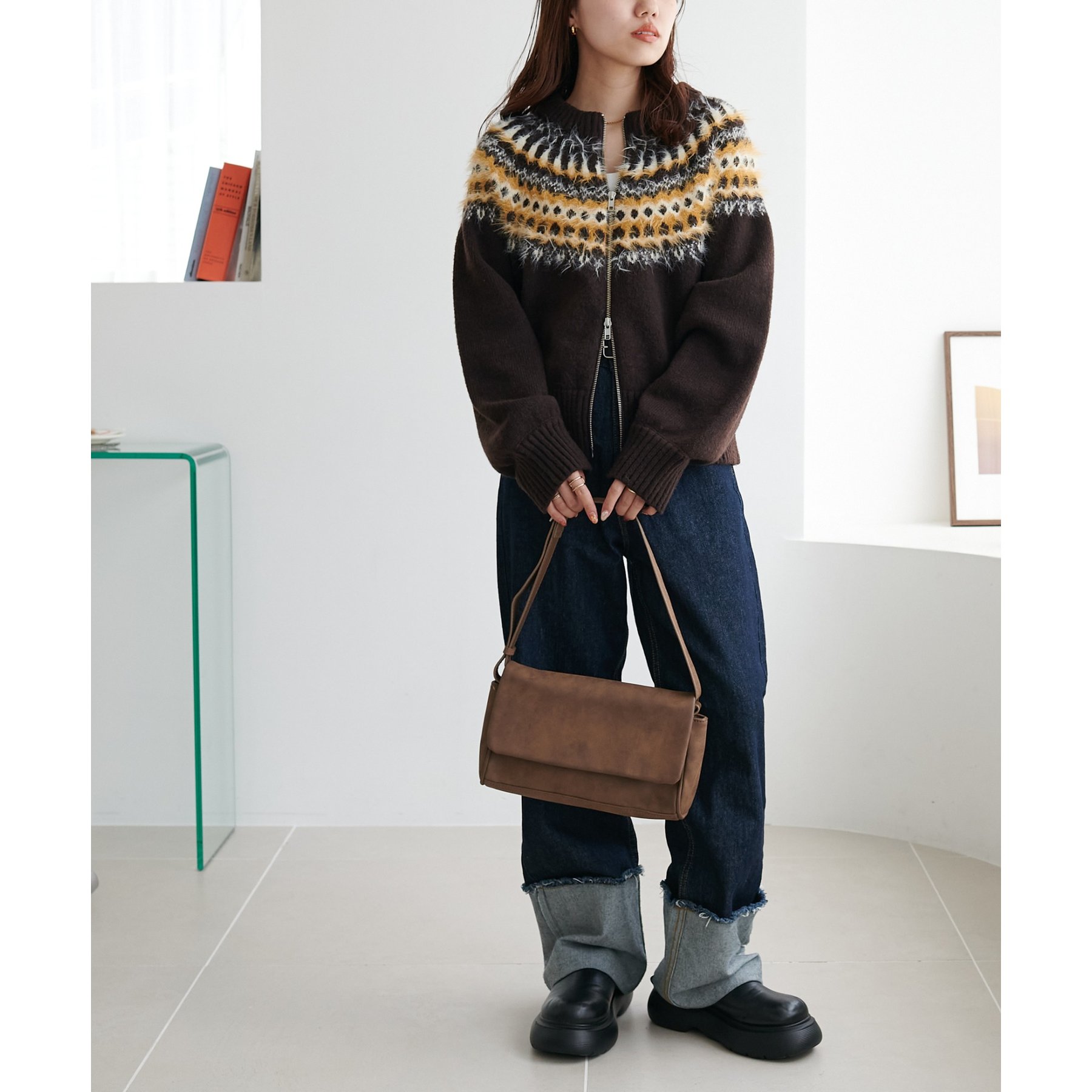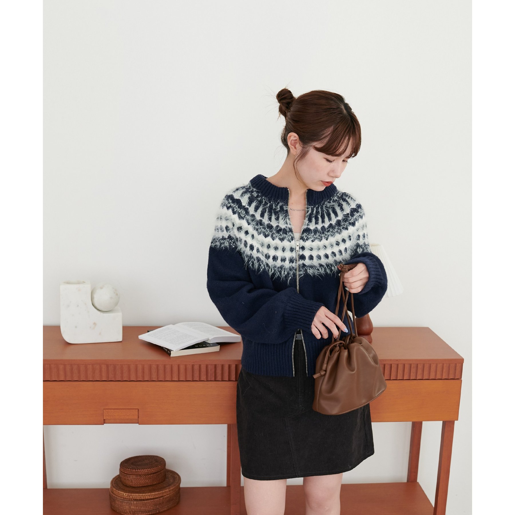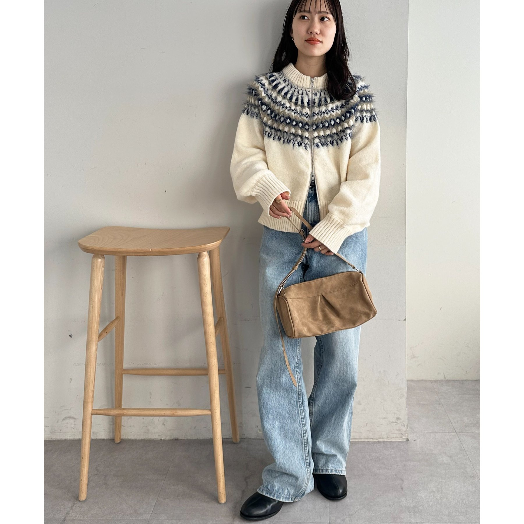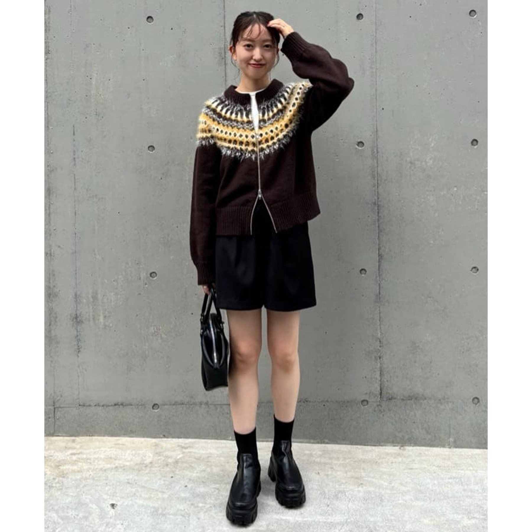 155cmスタッフ:求心柄デザインがコーデの主役に!ジップを少し開けると抜け感がでるのでおすすめです◎