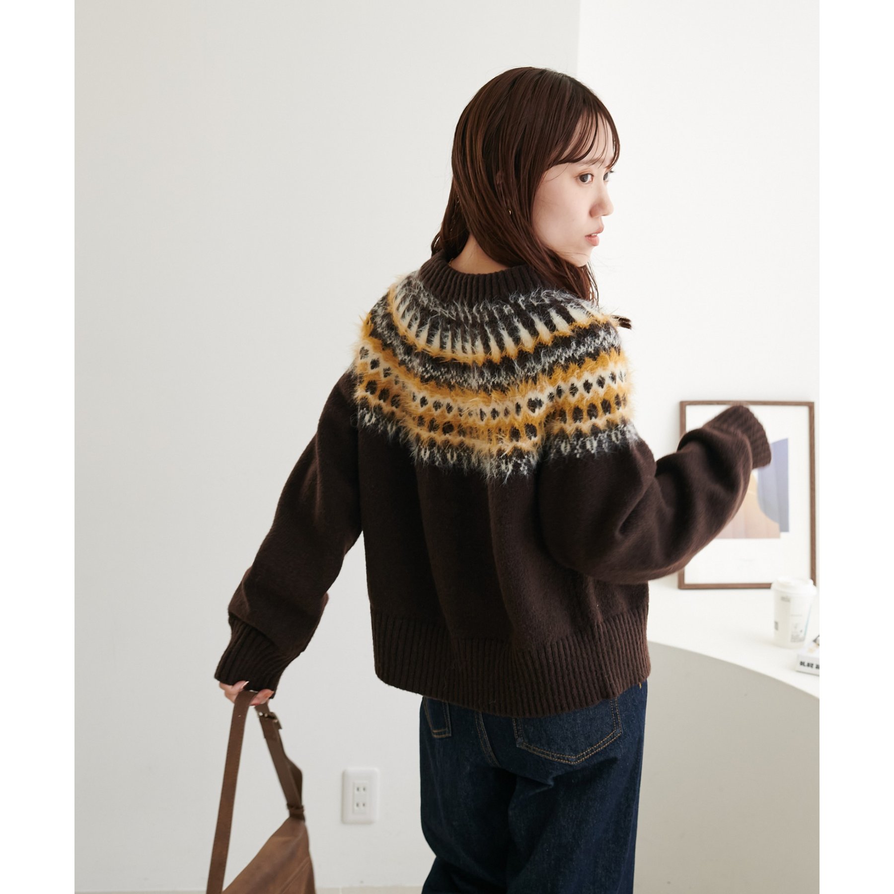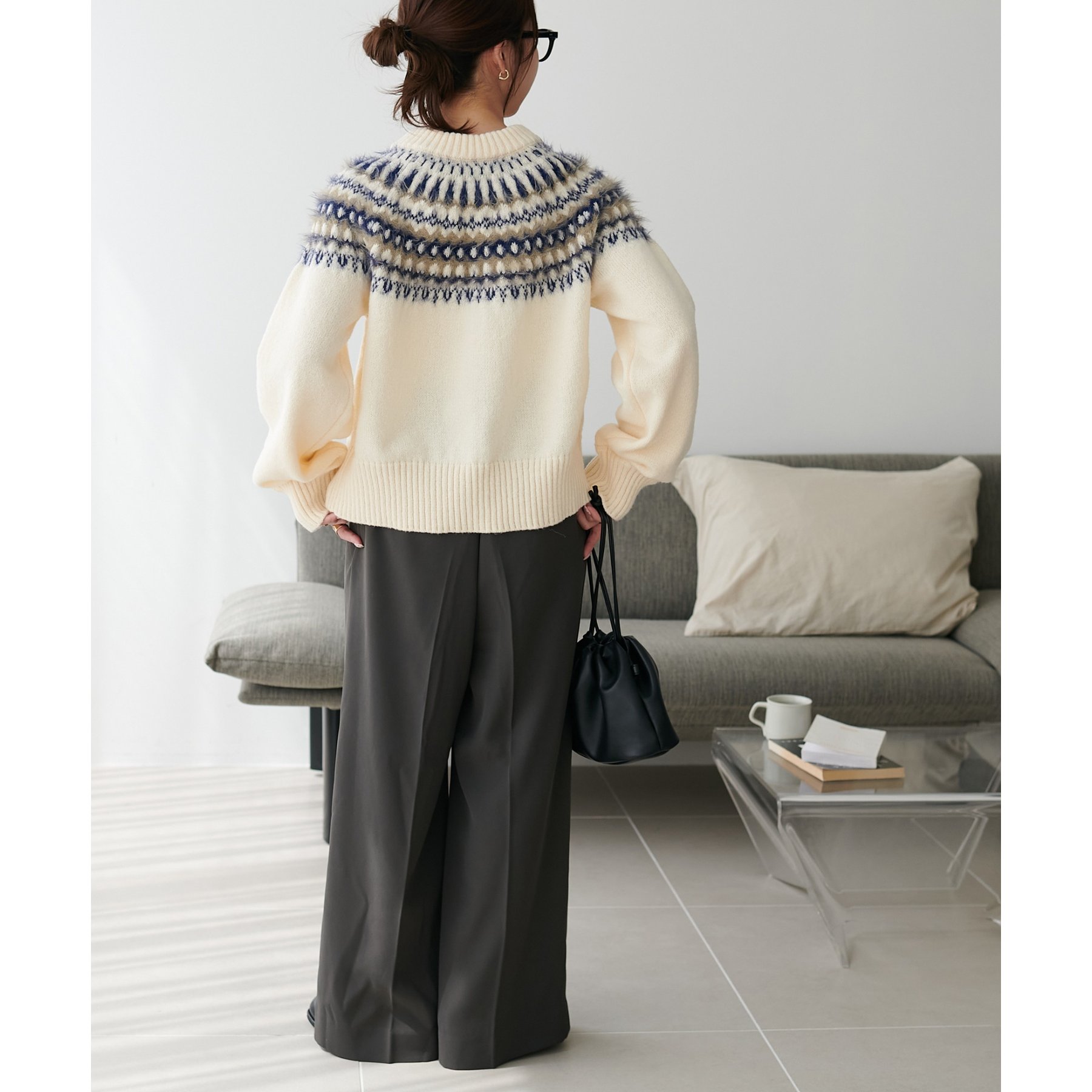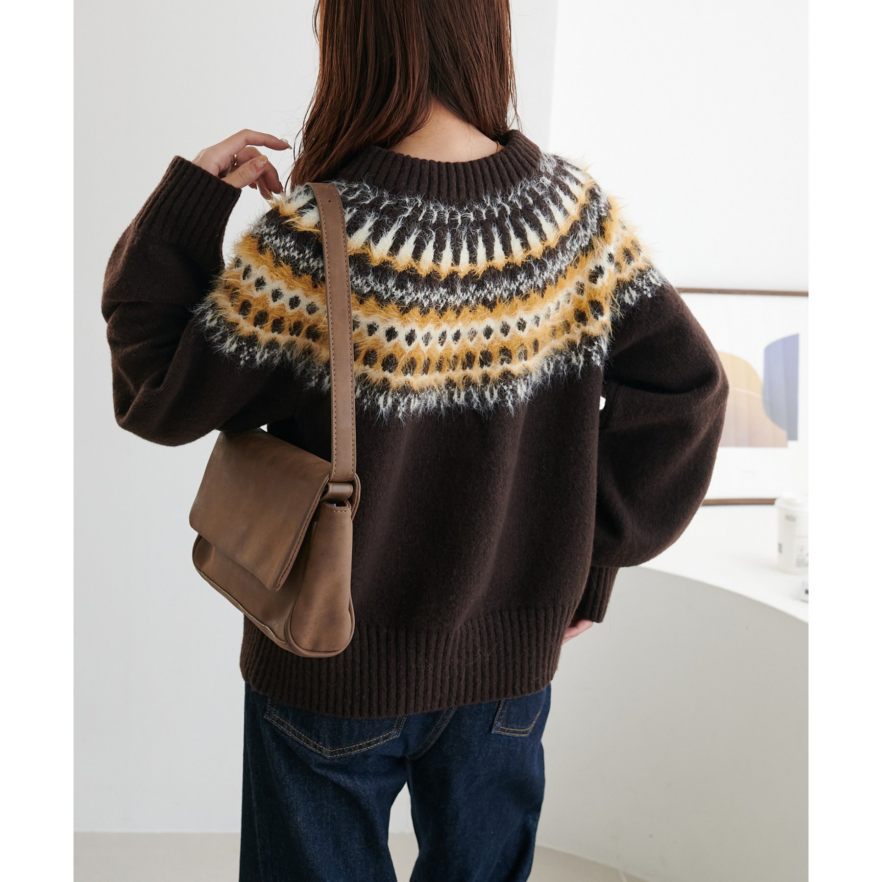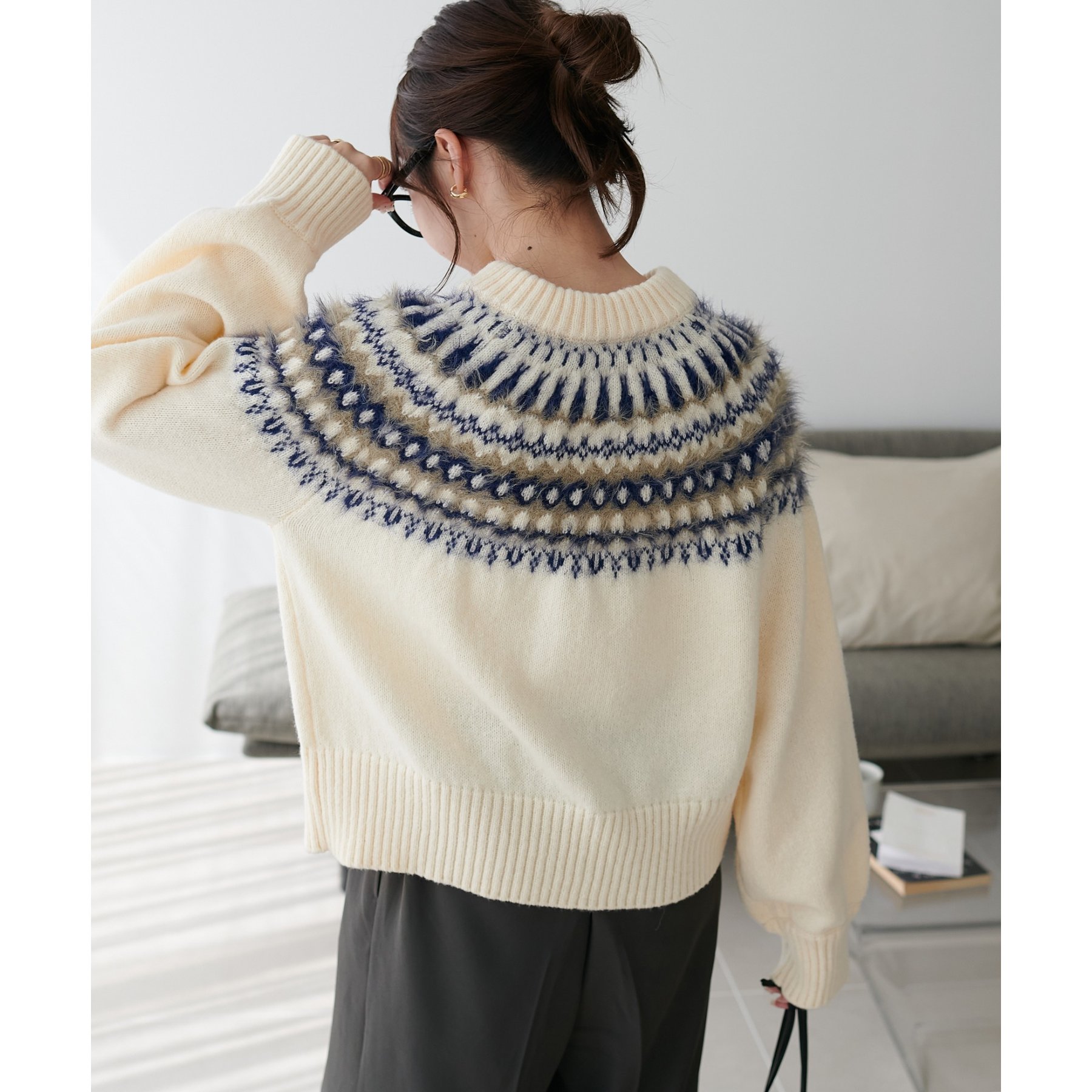シーズンムード漂う求心柄デザインを身頃から肩回りにかけて大胆にあしらった、存在感抜群のプルオーバー。