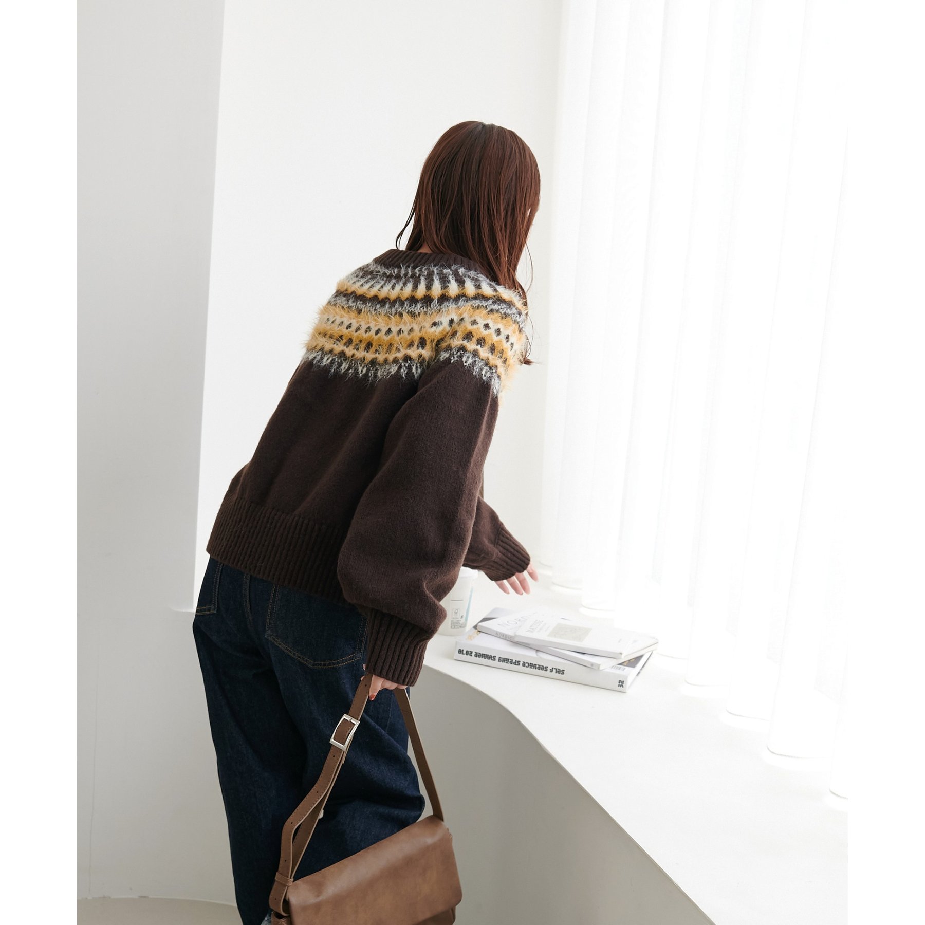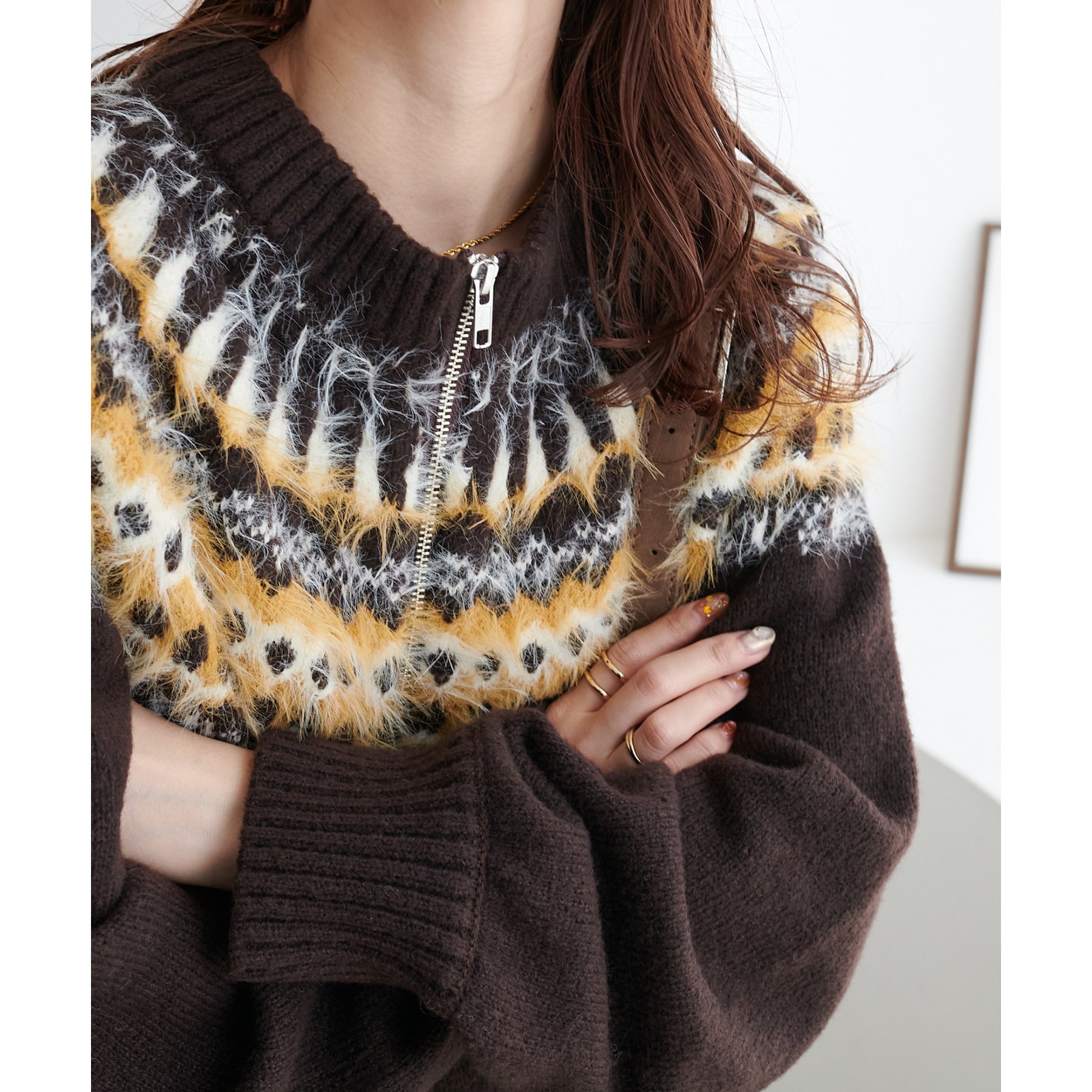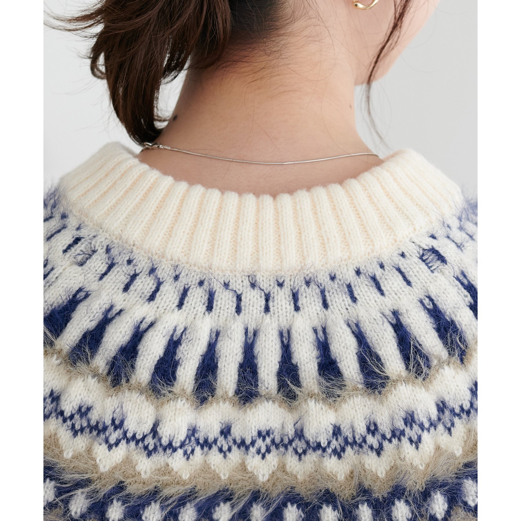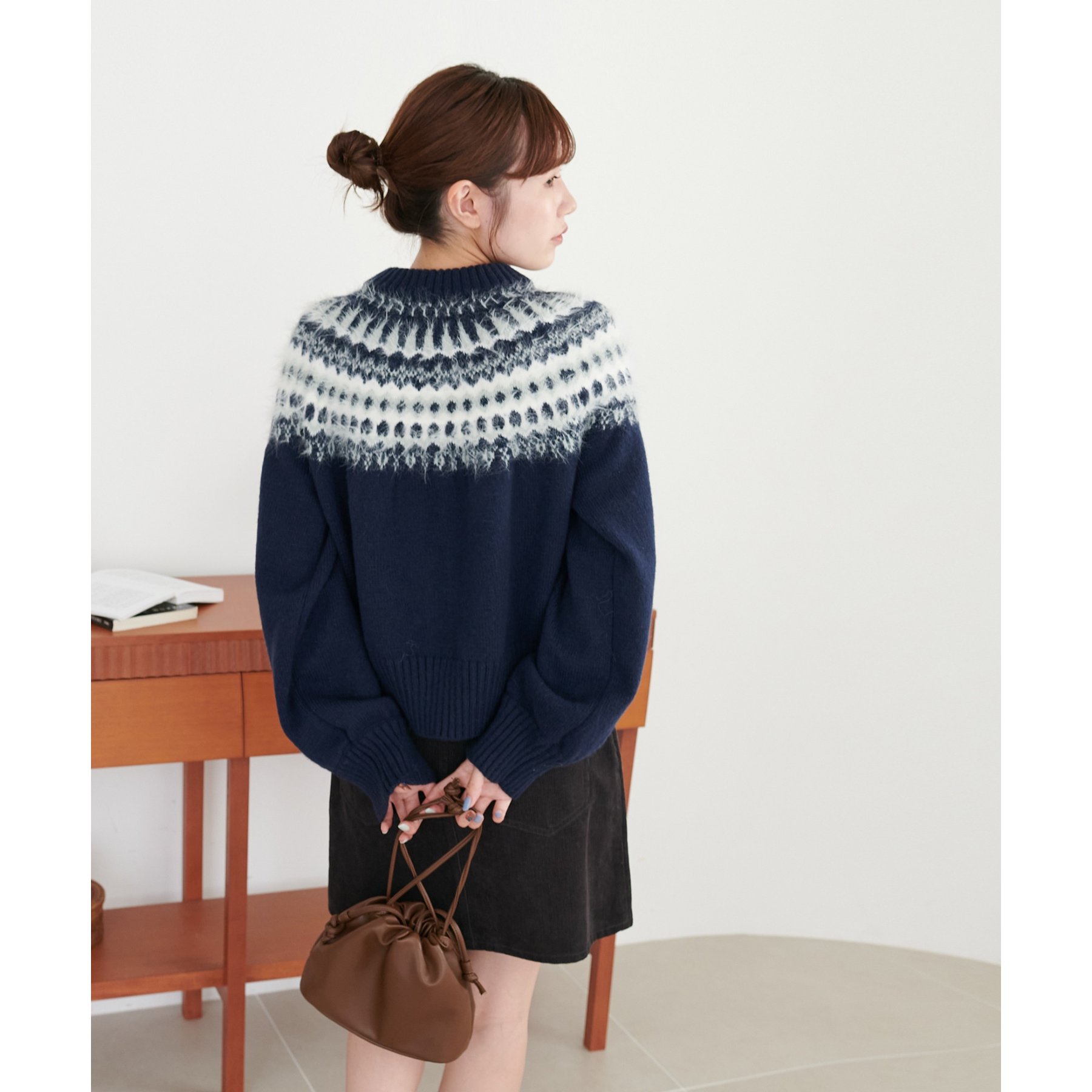 シーズンムード漂う求心柄デザインを身頃から肩回りにかけて大胆にあしらった、存在感抜群のプルオーバー。