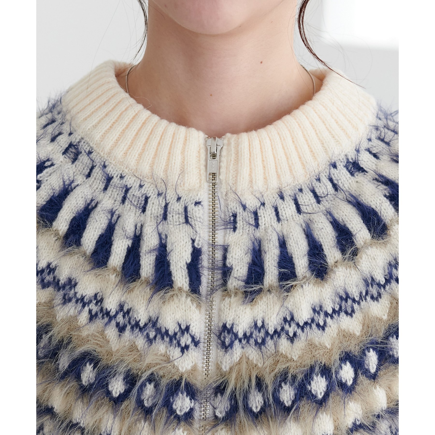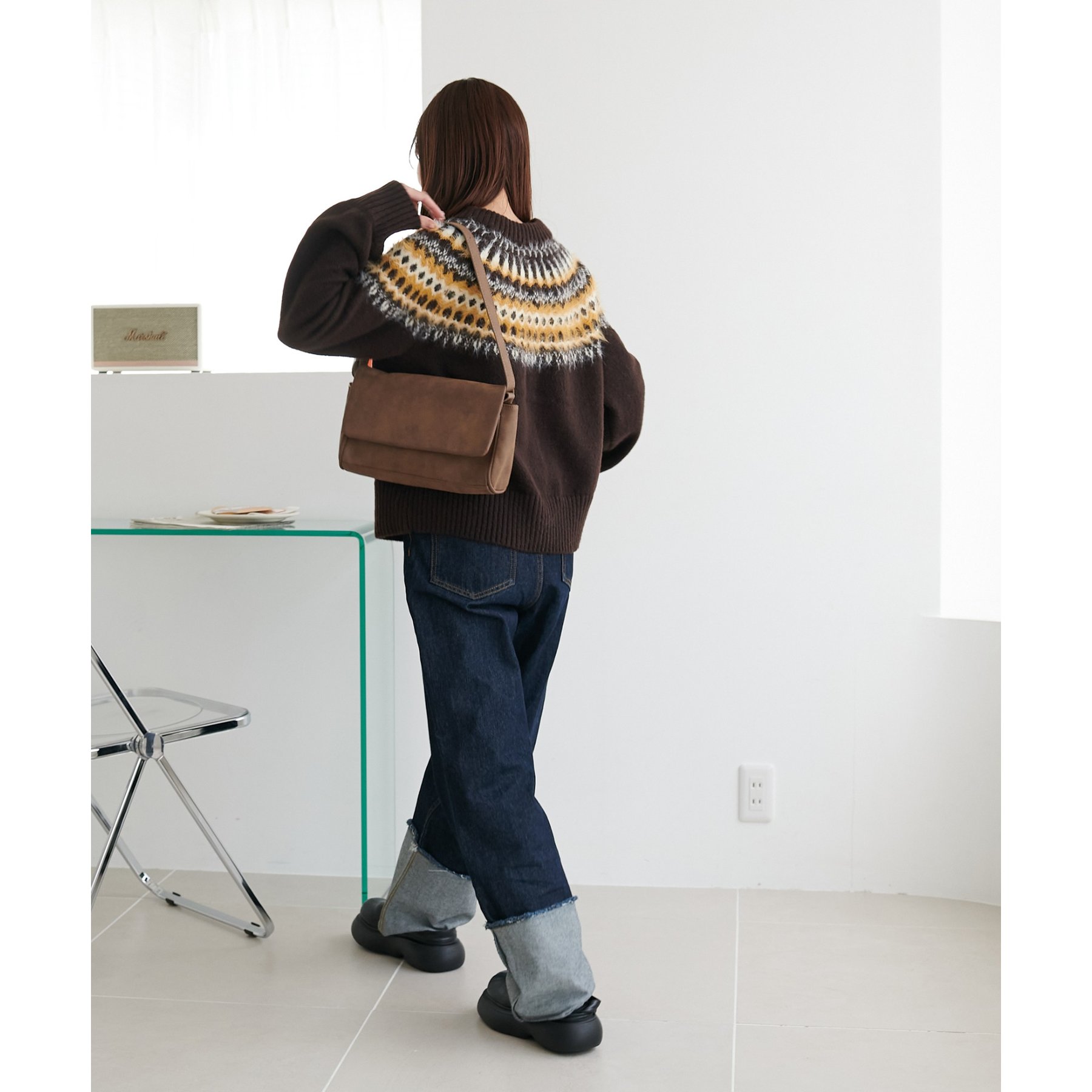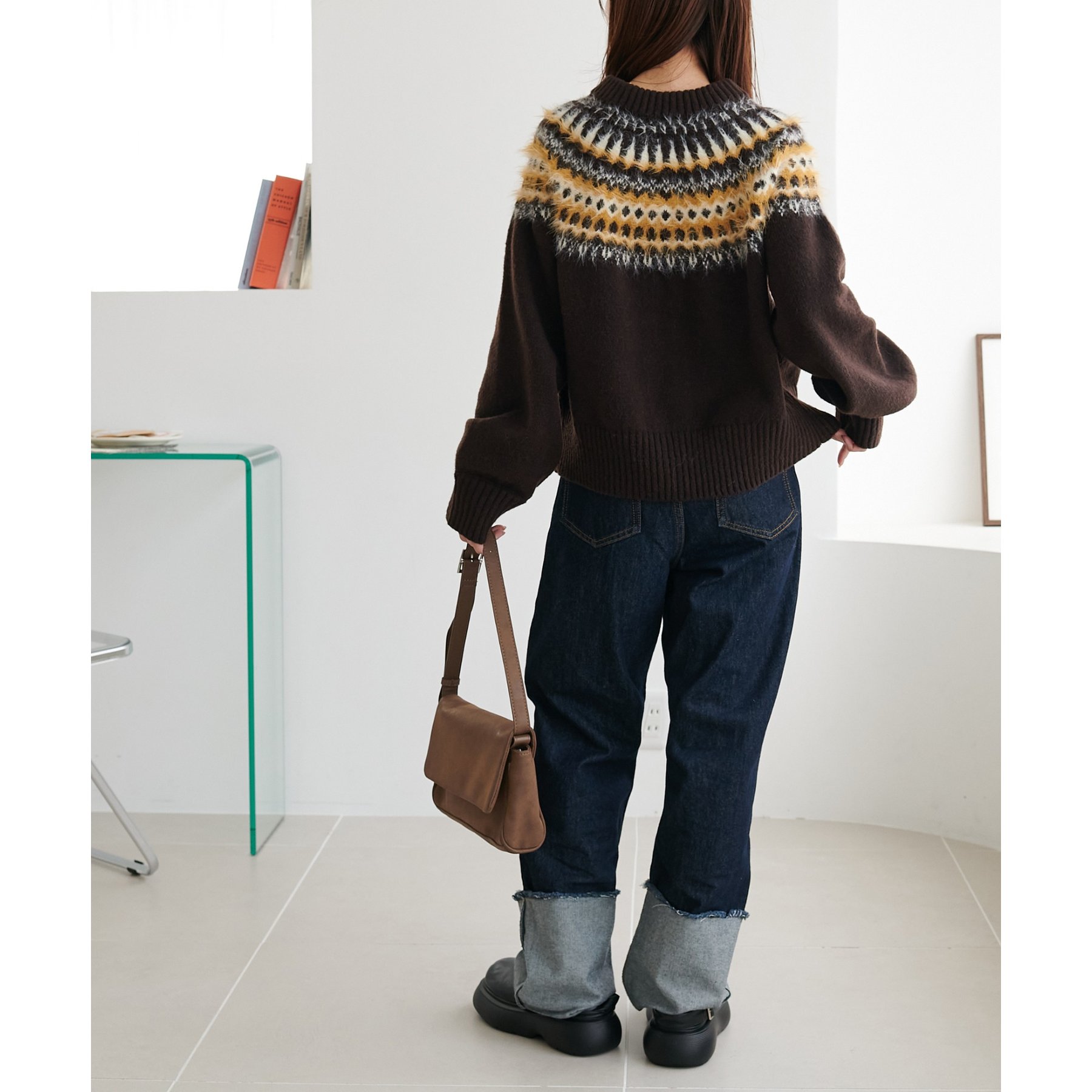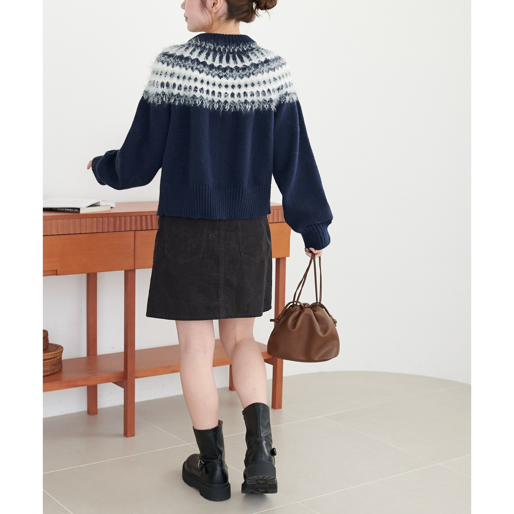 シーズンムード漂う求心柄デザインを身頃から肩回りにかけて大胆にあしらった、存在感抜群のプルオーバー。