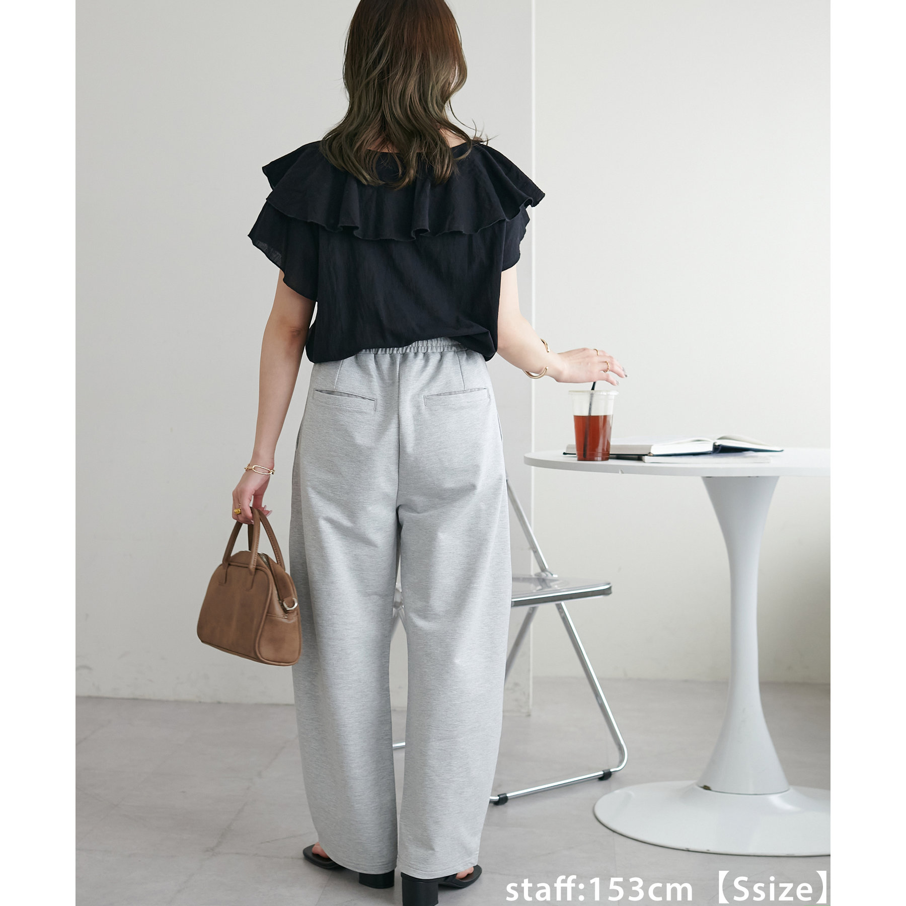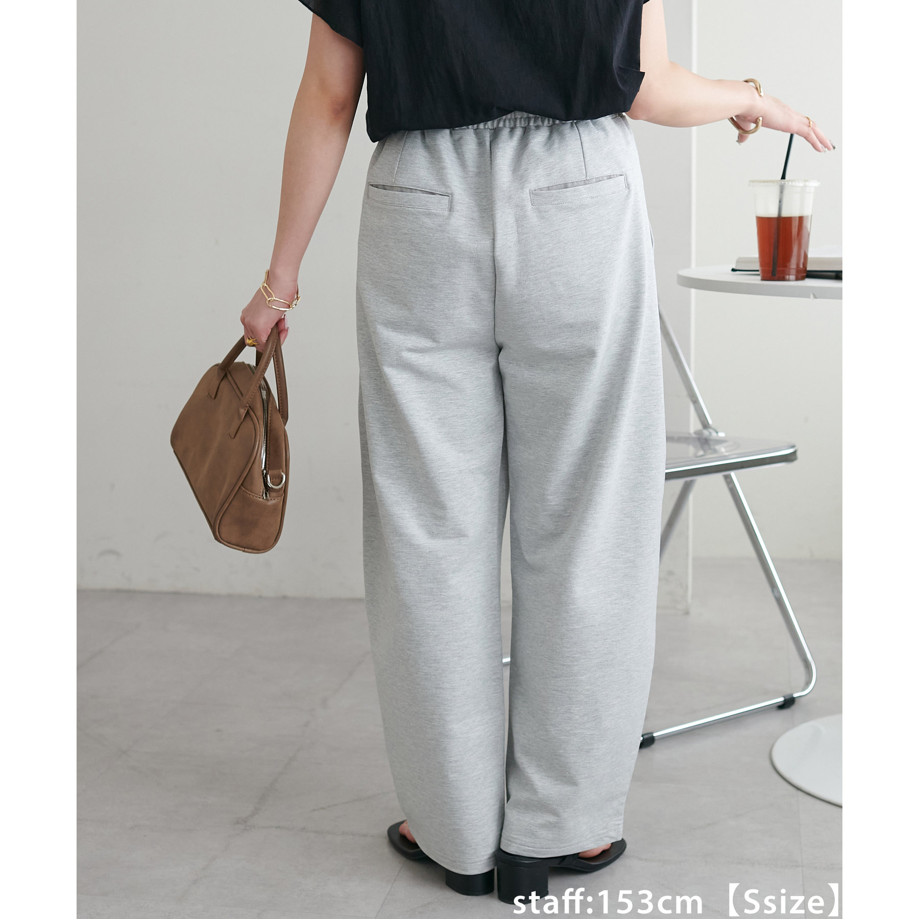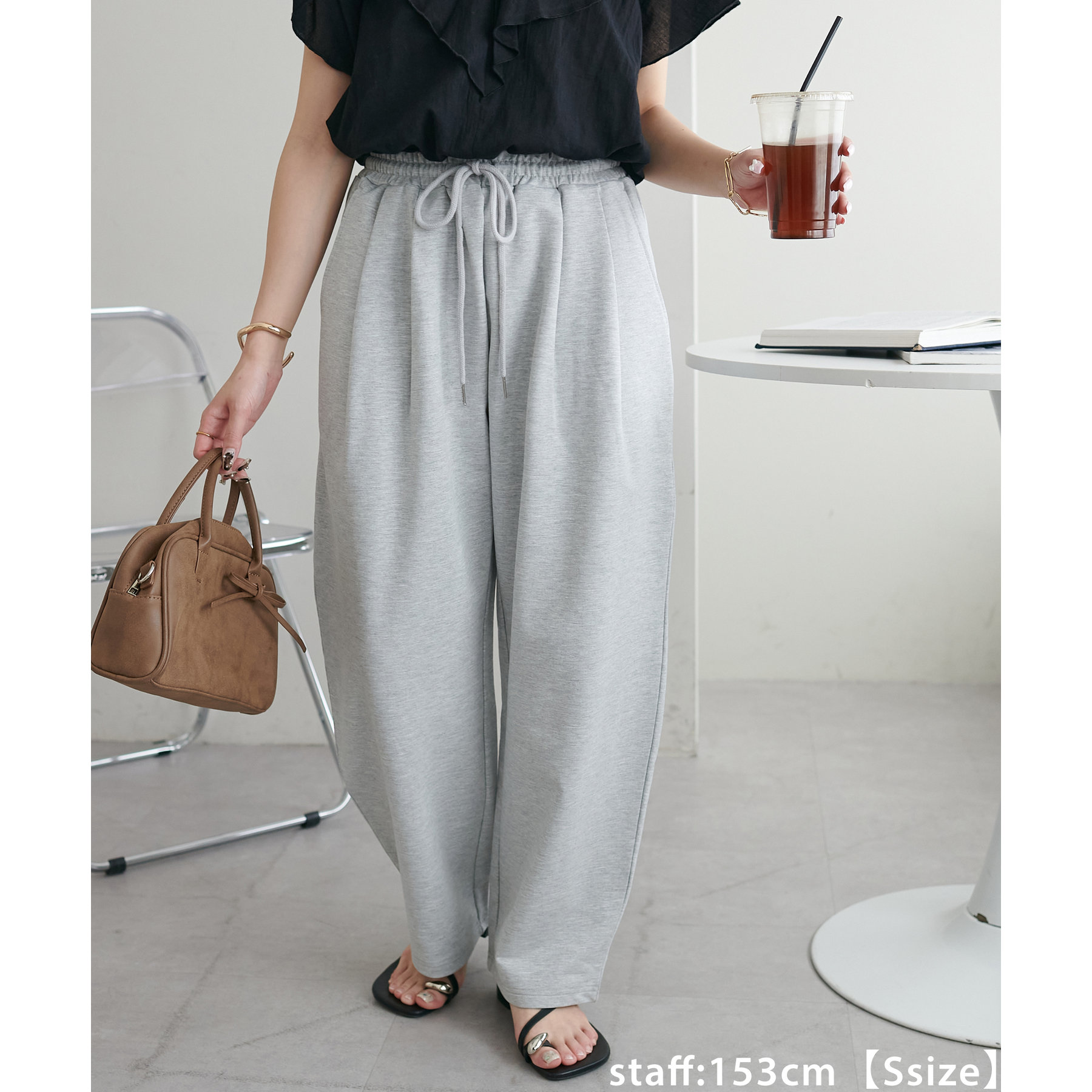152cmスタッフ(Sサイズ着用):シンプルなスウェットパンツはカジュアル感が強くなりますが、カーブデザインになっていることでこなれ感がアップします!