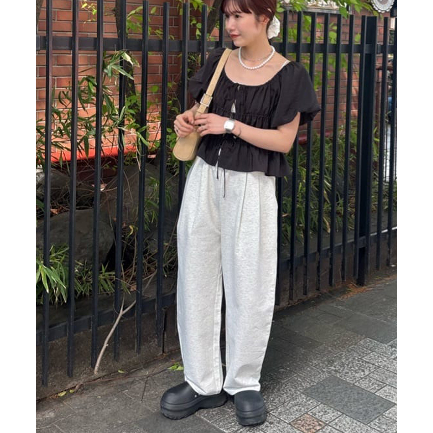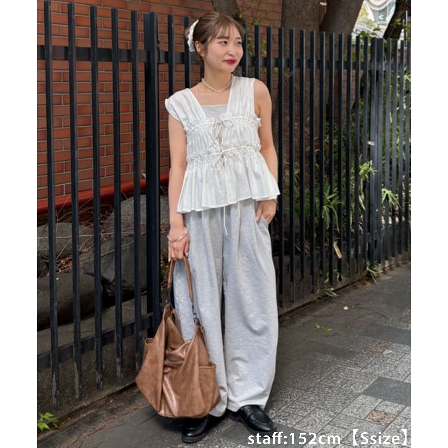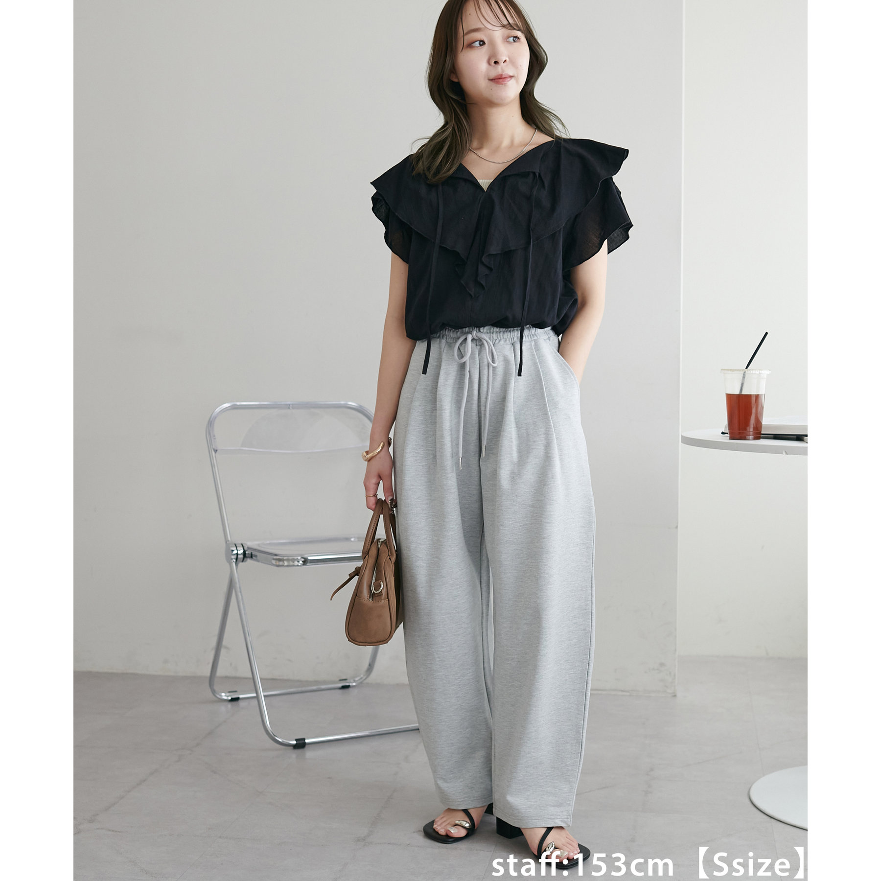 152cmスタッフ(Sサイズ着用):シンプルなスウェットパンツはカジュアル感が強くなりますが、カーブデザインになっていることでこなれ感がアップします!