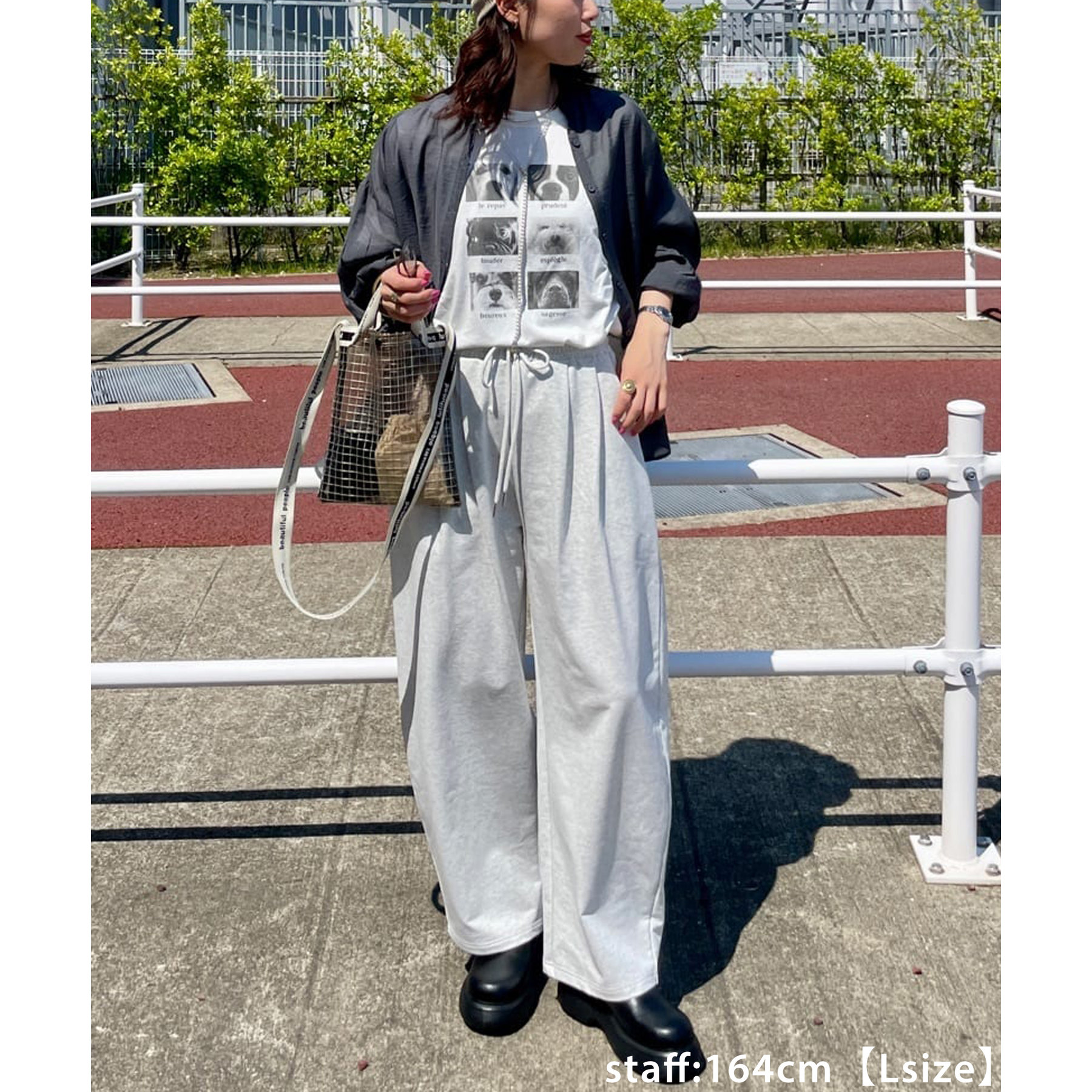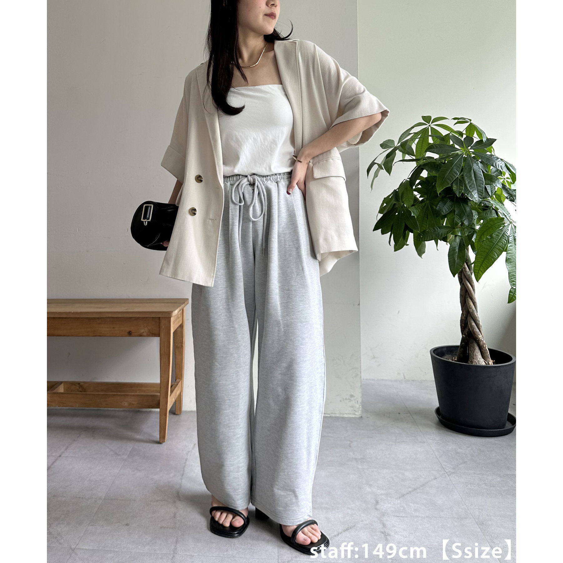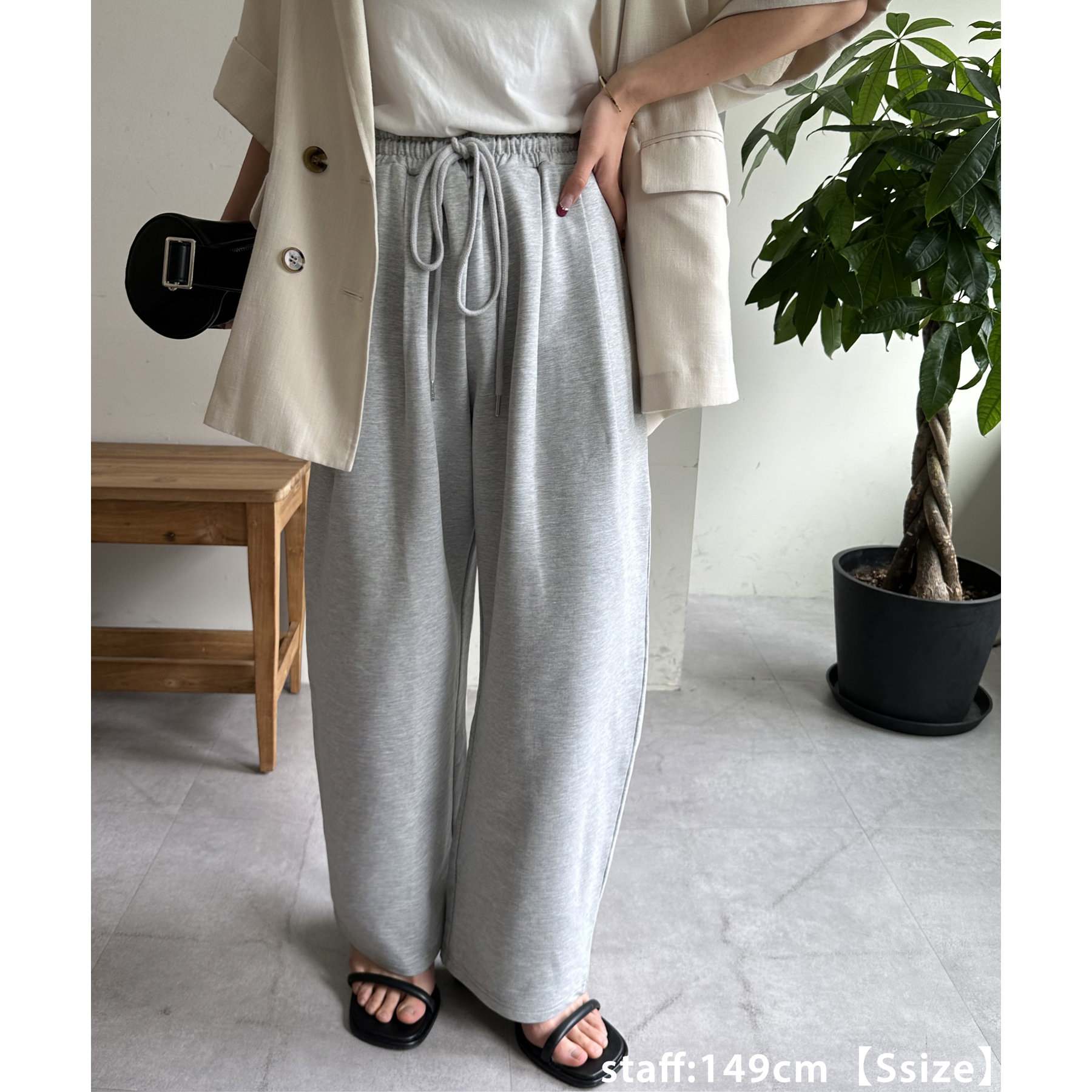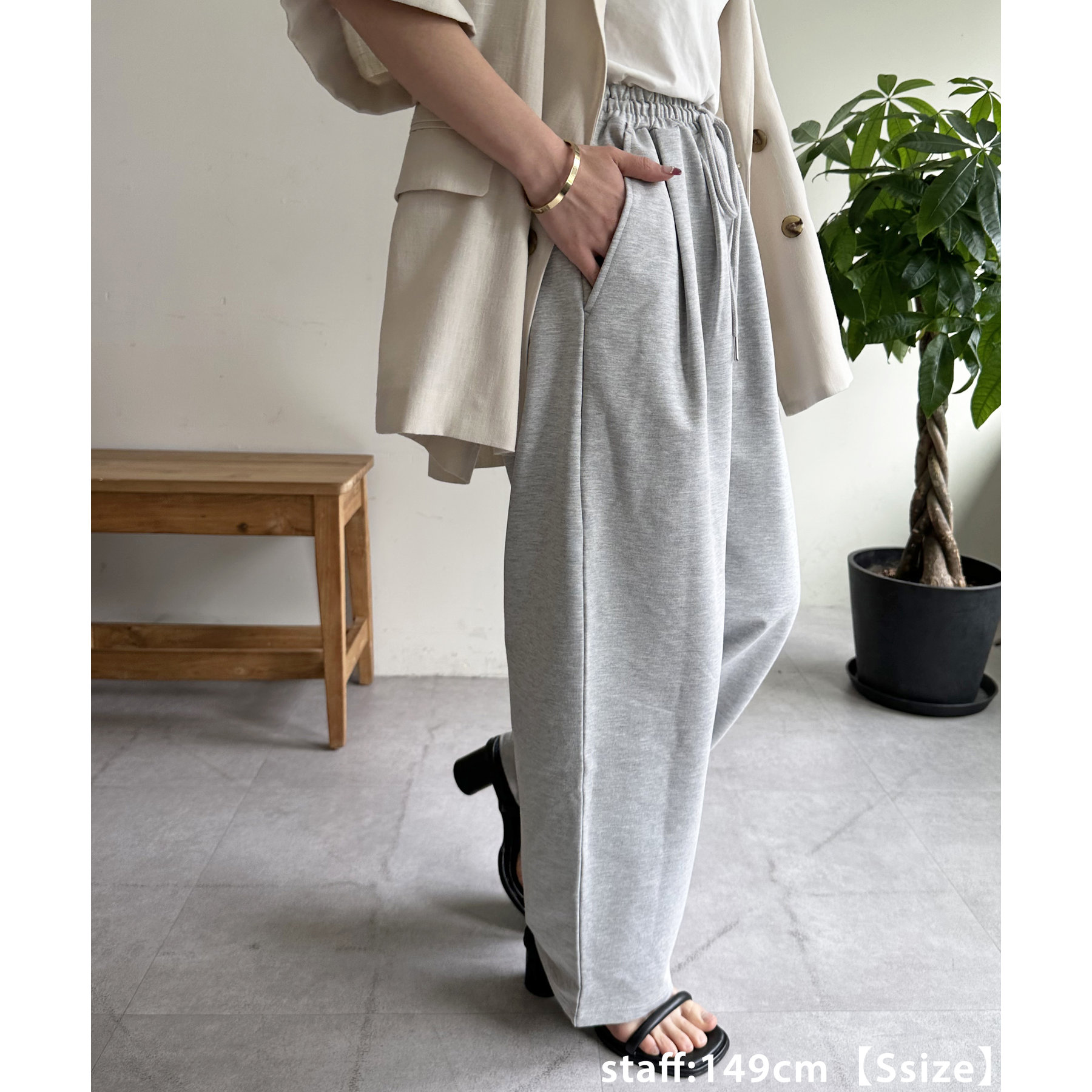 164cmスタッフ(Lサイズ着用):フラットシューズで床にギリギリつかないくらいの丈感。生地がさらっとしていて夏にもおすすめのスウェットパンツです!