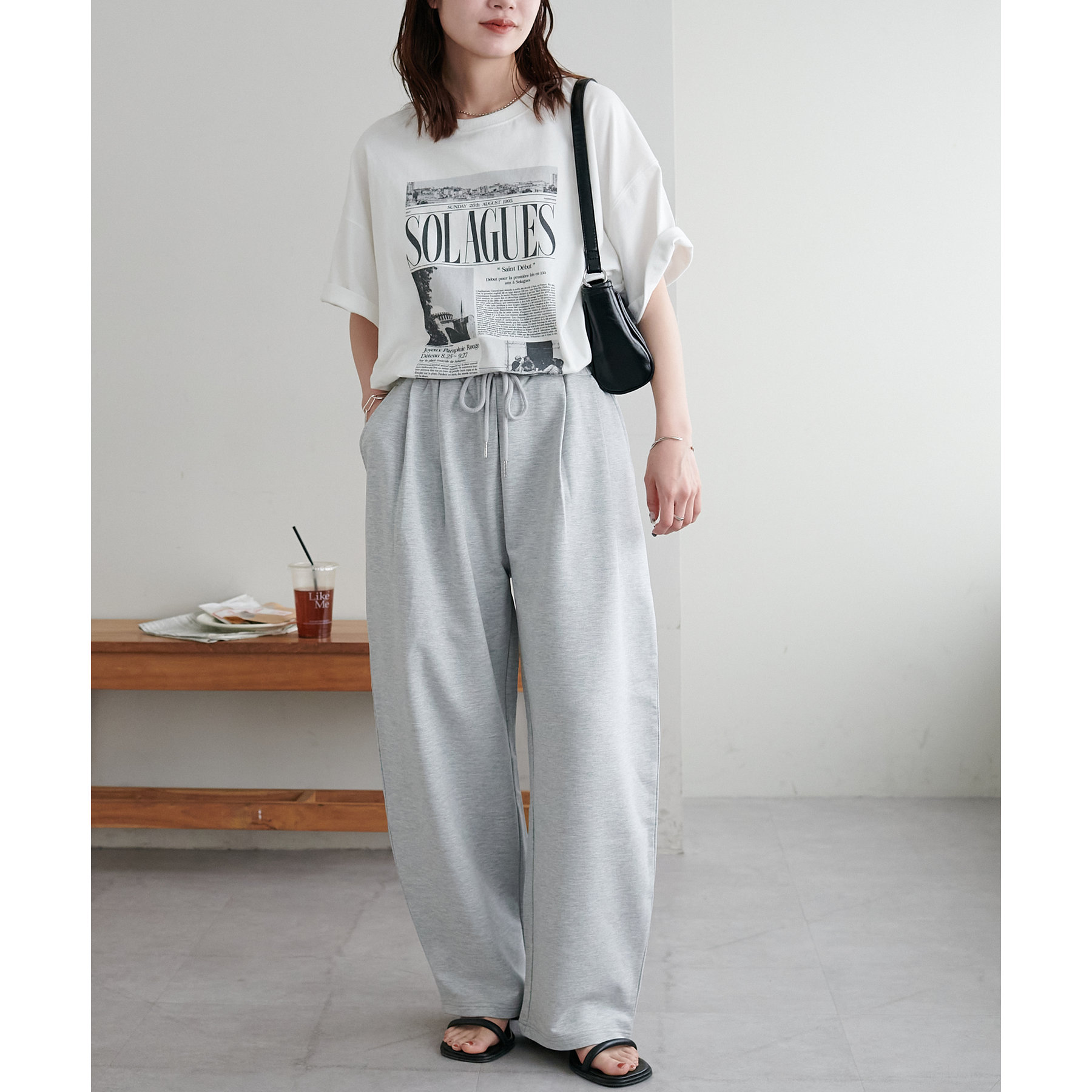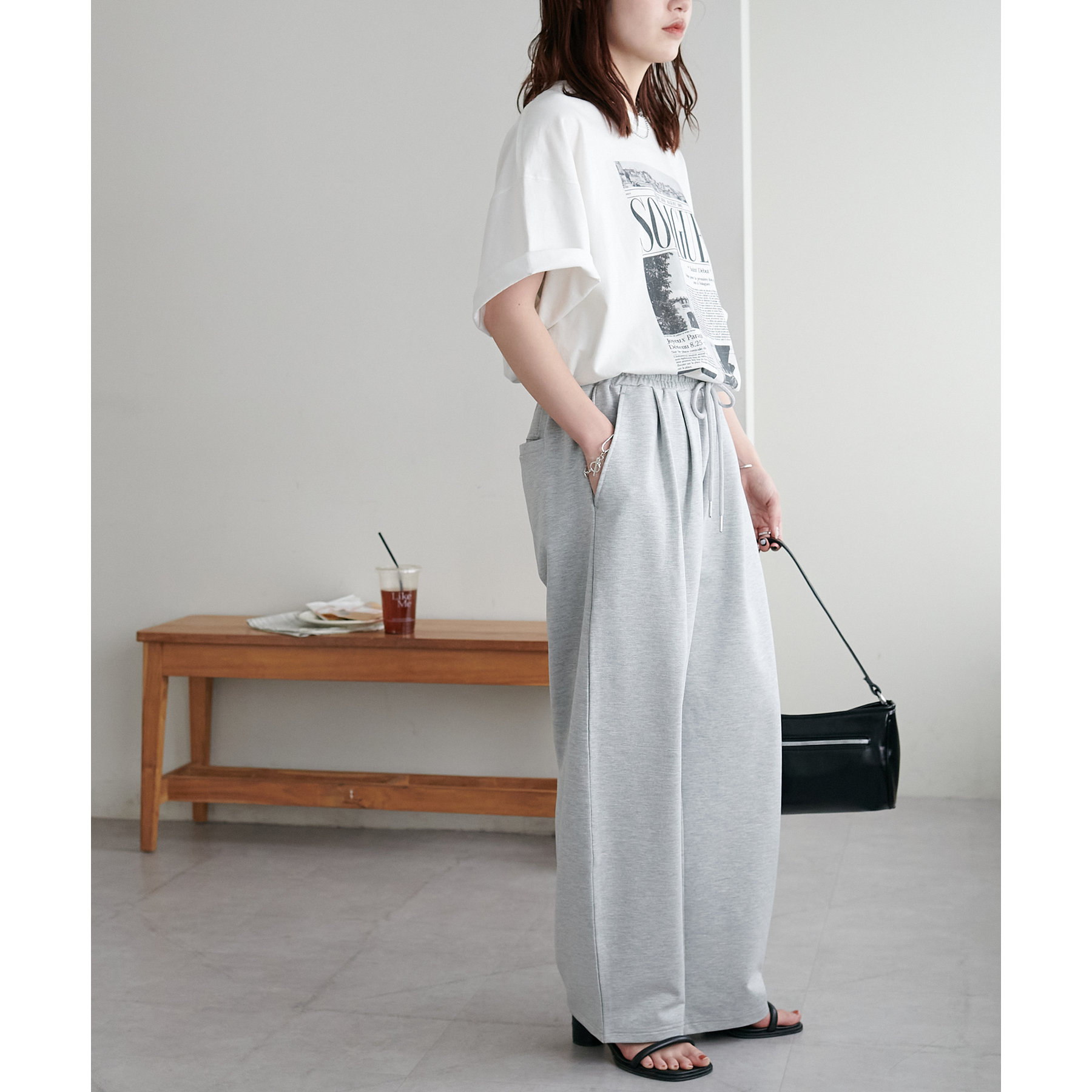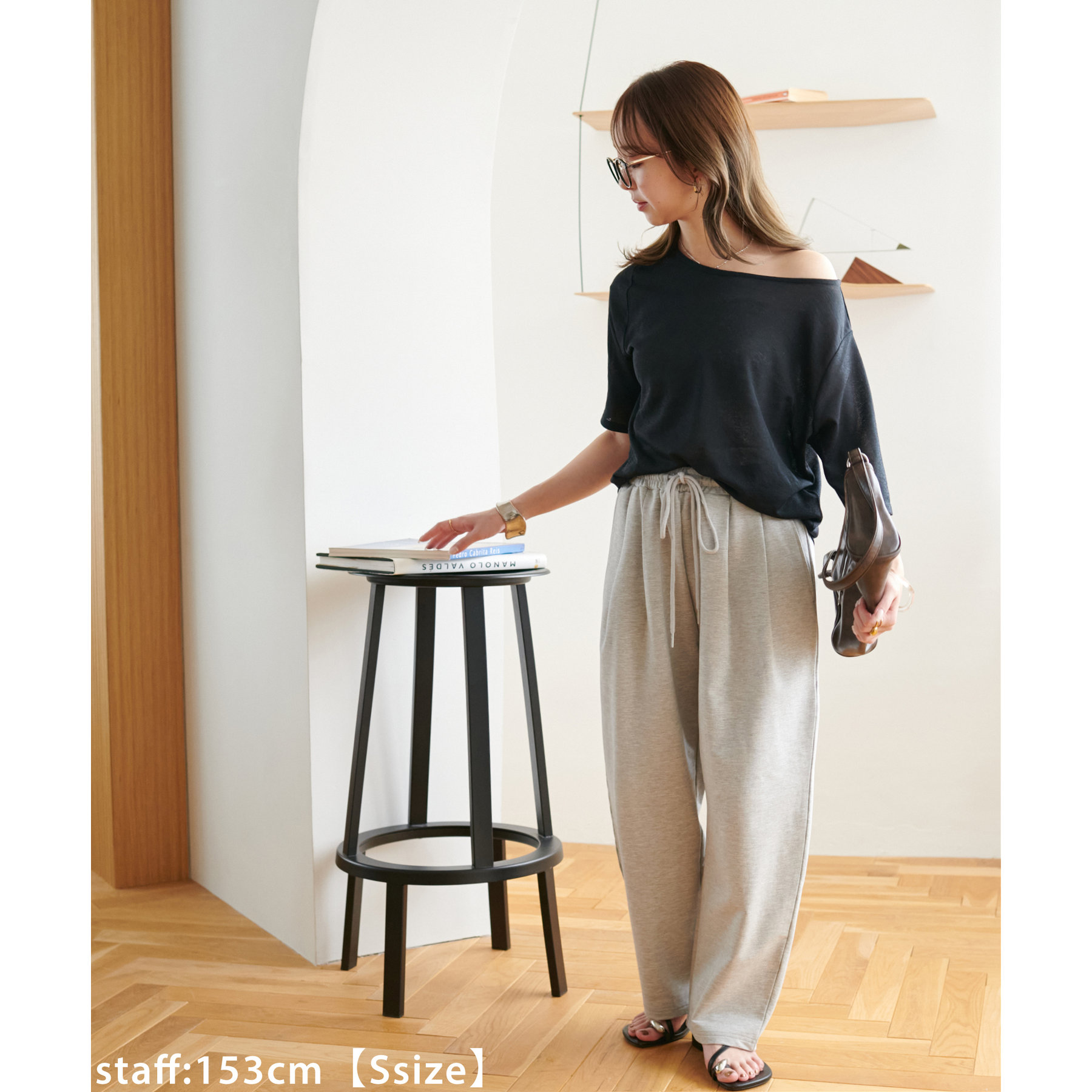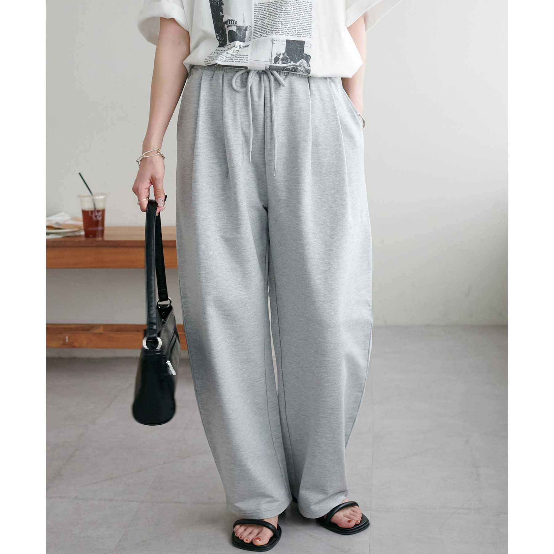 164cmスタッフ(Lサイズ着用):フラットシューズで床にギリギリつかないくらいの丈感。生地がさらっとしていて夏にもおすすめのスウェットパンツです!