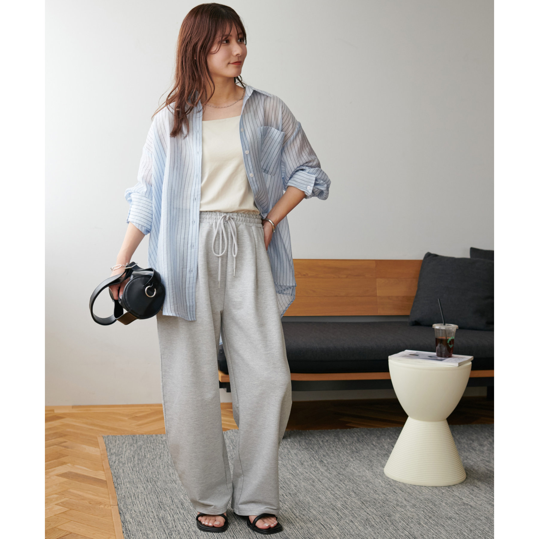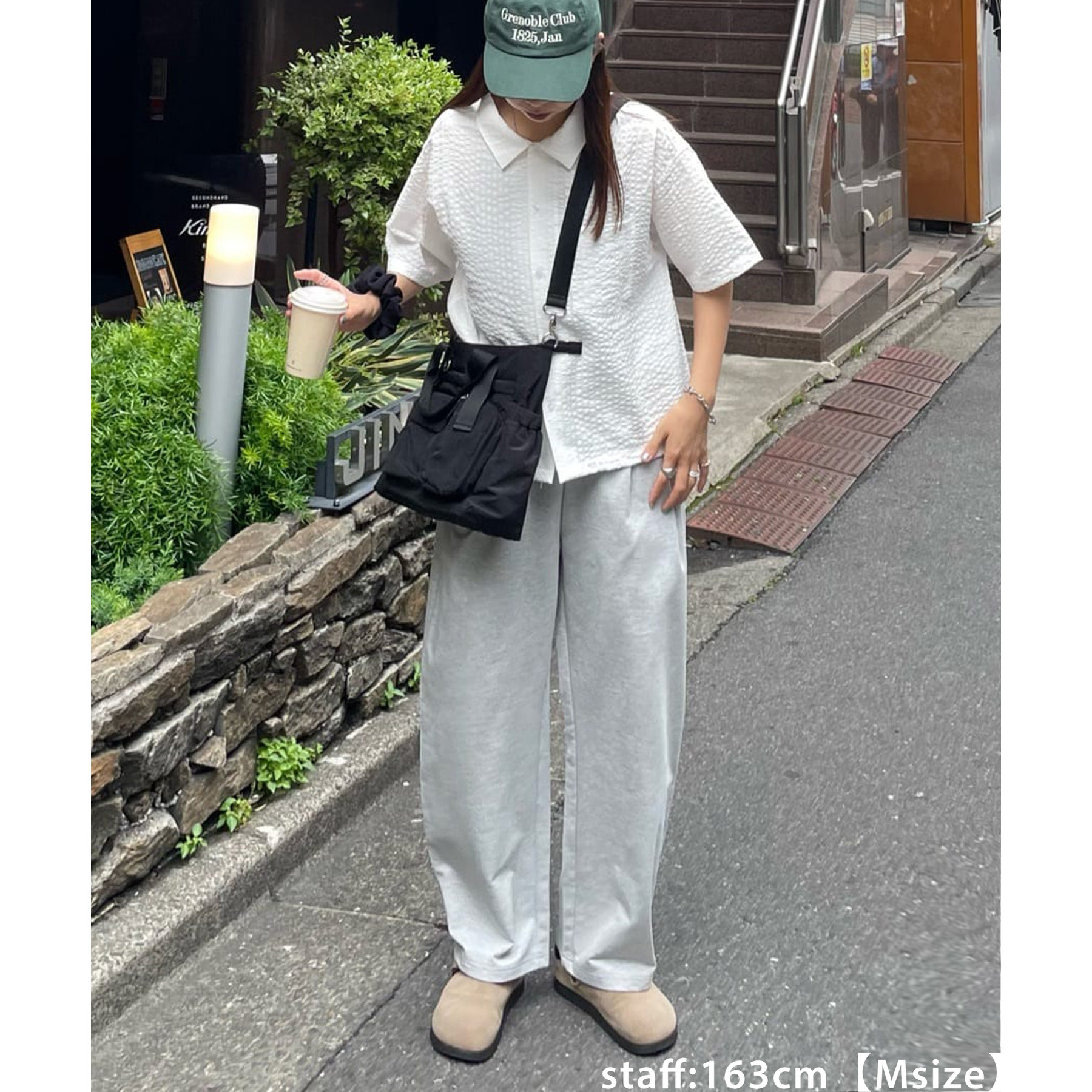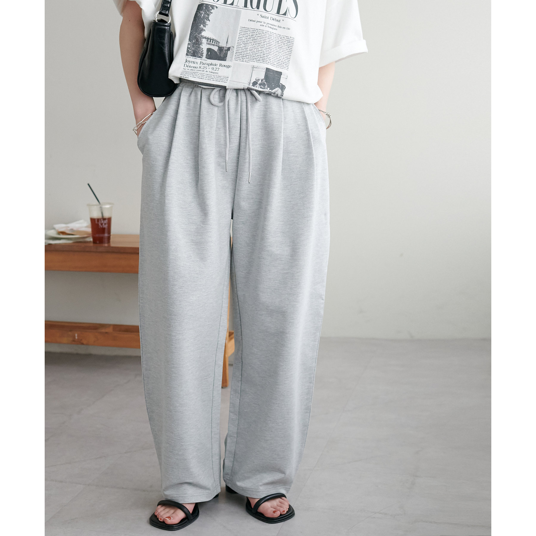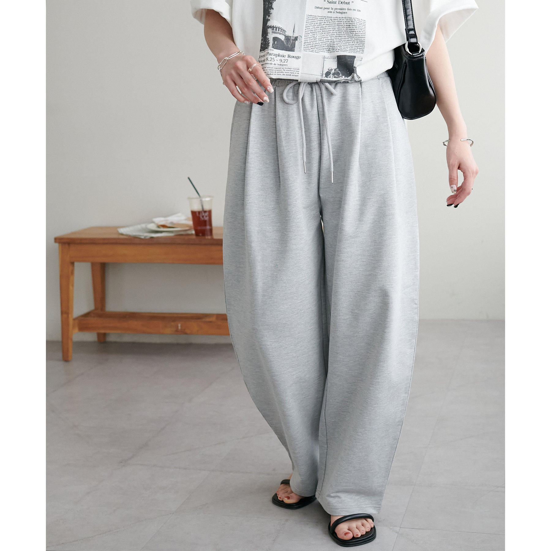 164cmスタッフ(Lサイズ着用):フラットシューズで床にギリギリつかないくらいの丈感。生地がさらっとしていて夏にもおすすめのスウェットパンツです!