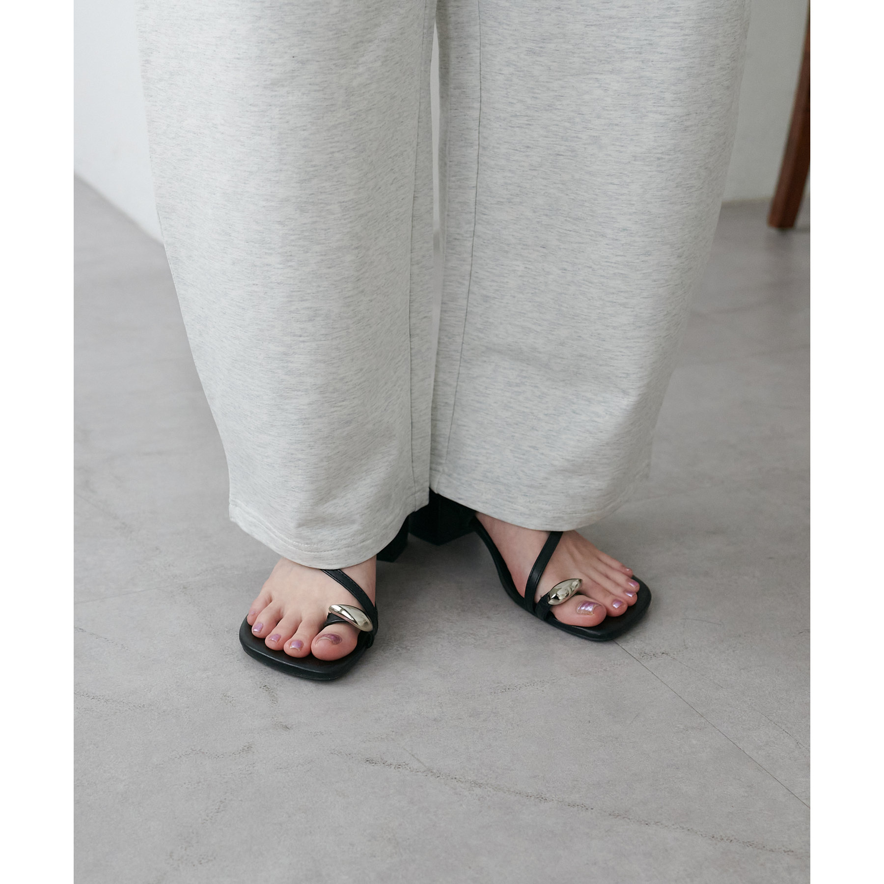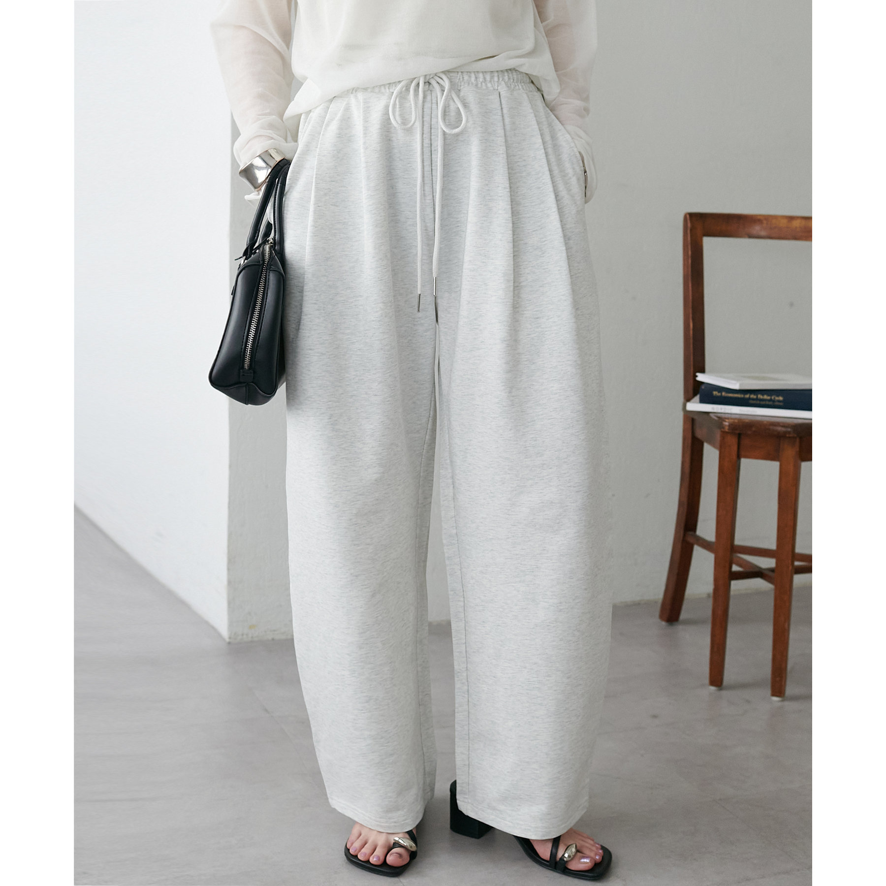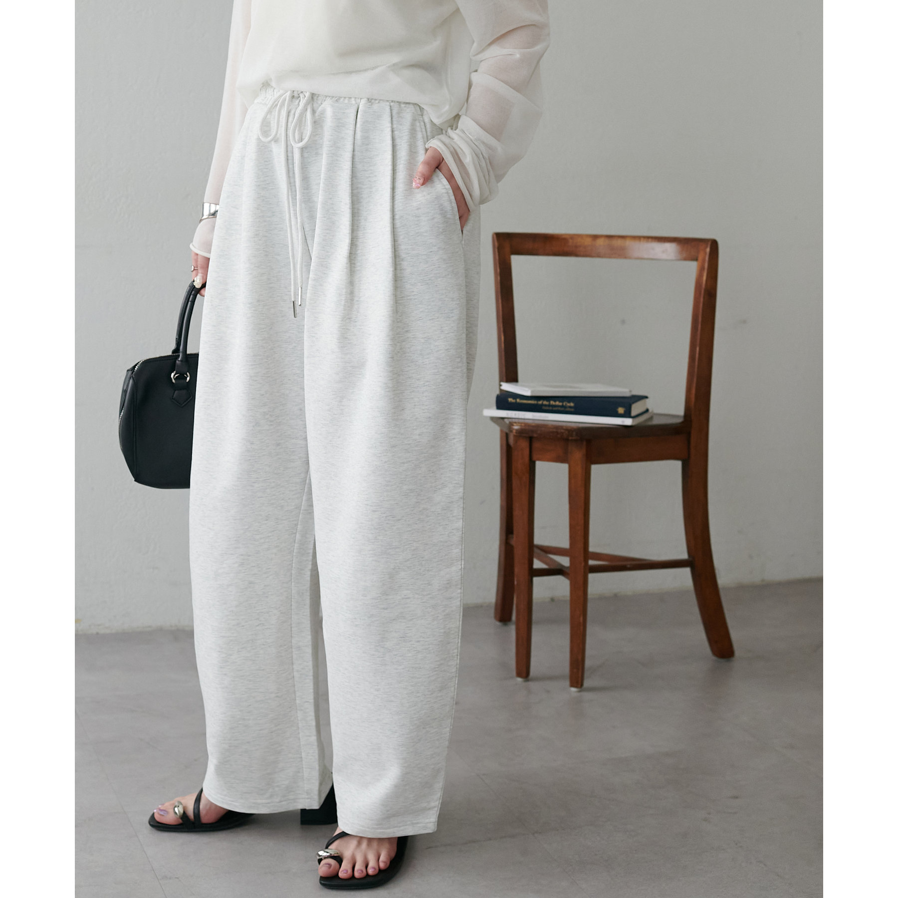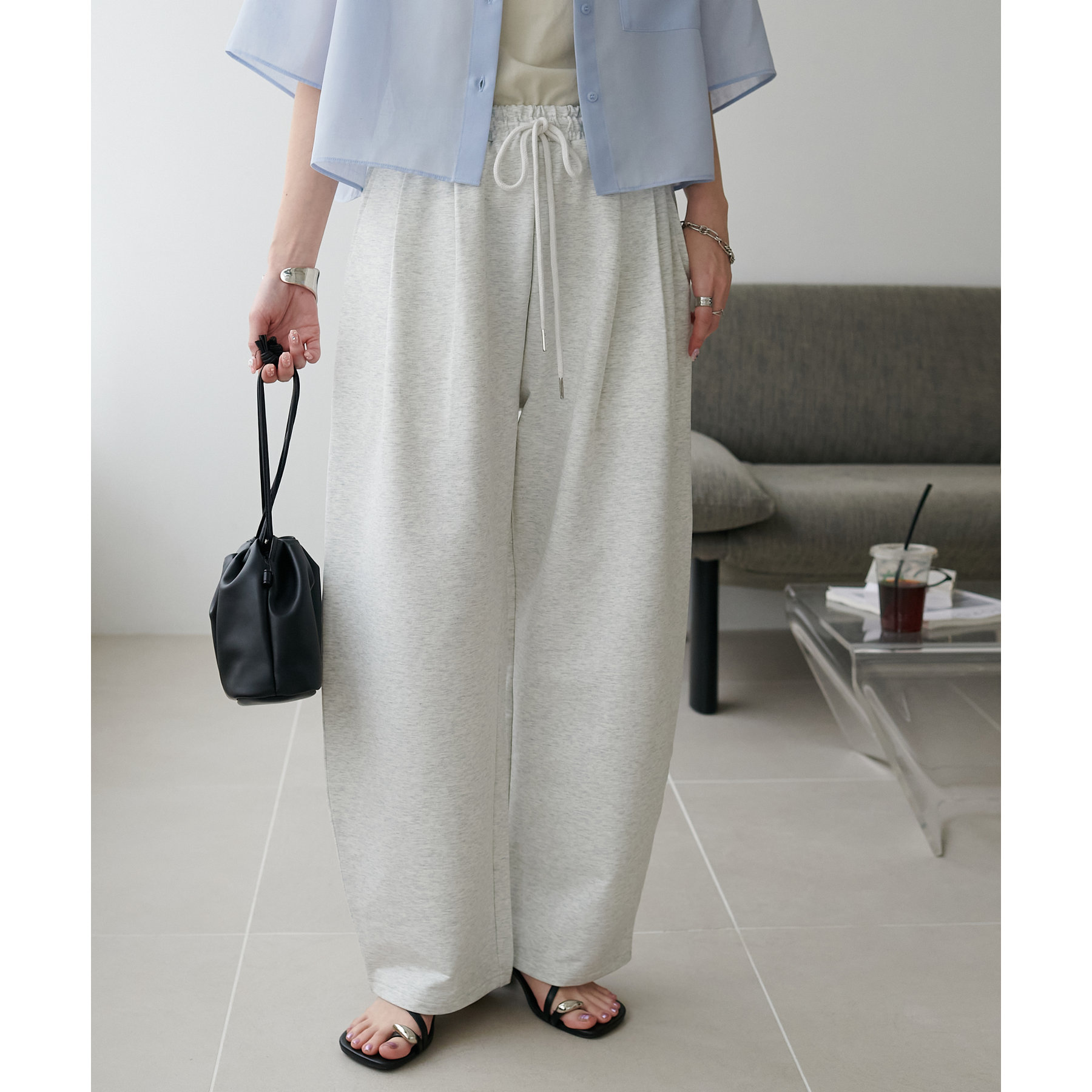 164cmスタッフ(Lサイズ着用):フラットシューズで床にギリギリつかないくらいの丈感。生地がさらっとしていて夏にもおすすめのスウェットパンツです!