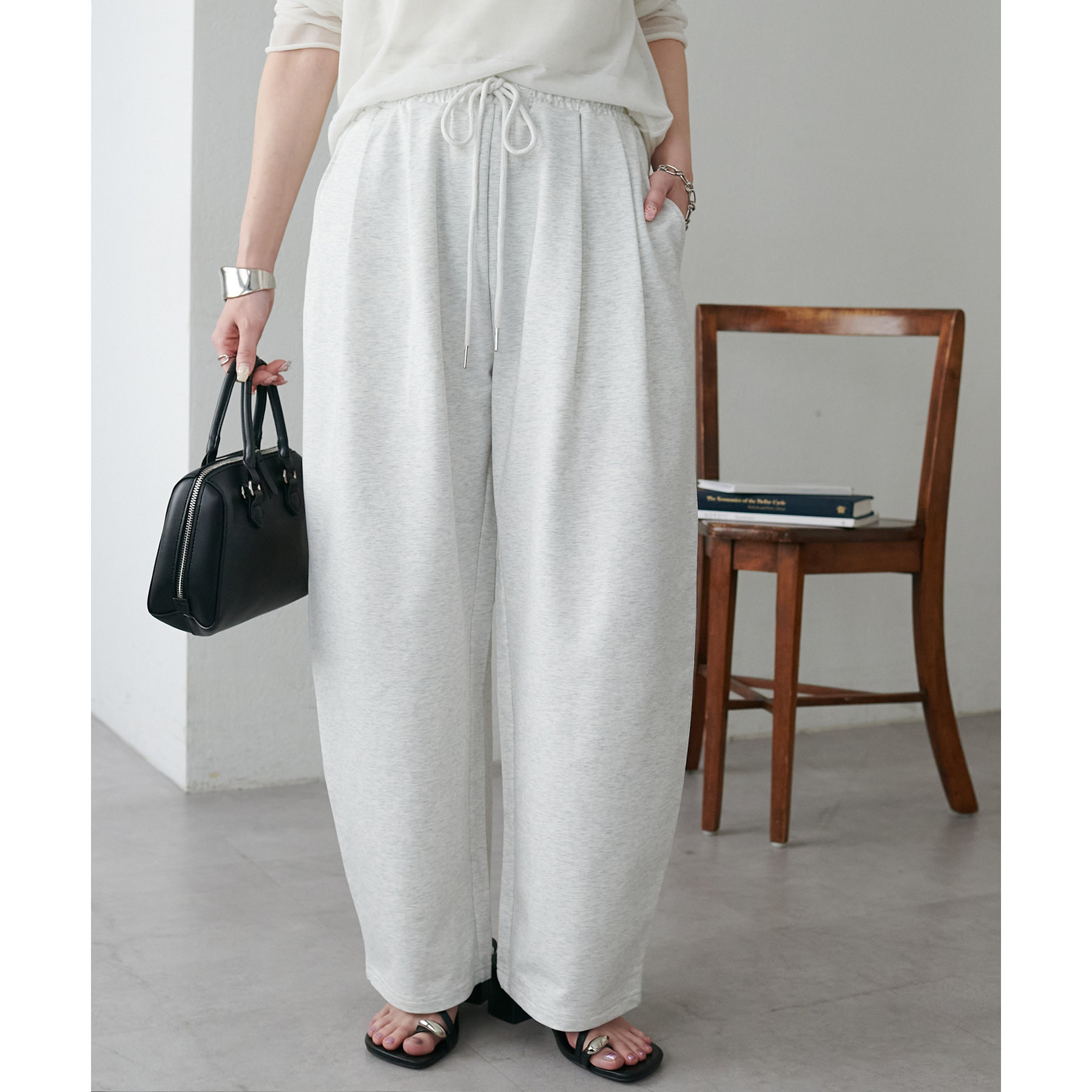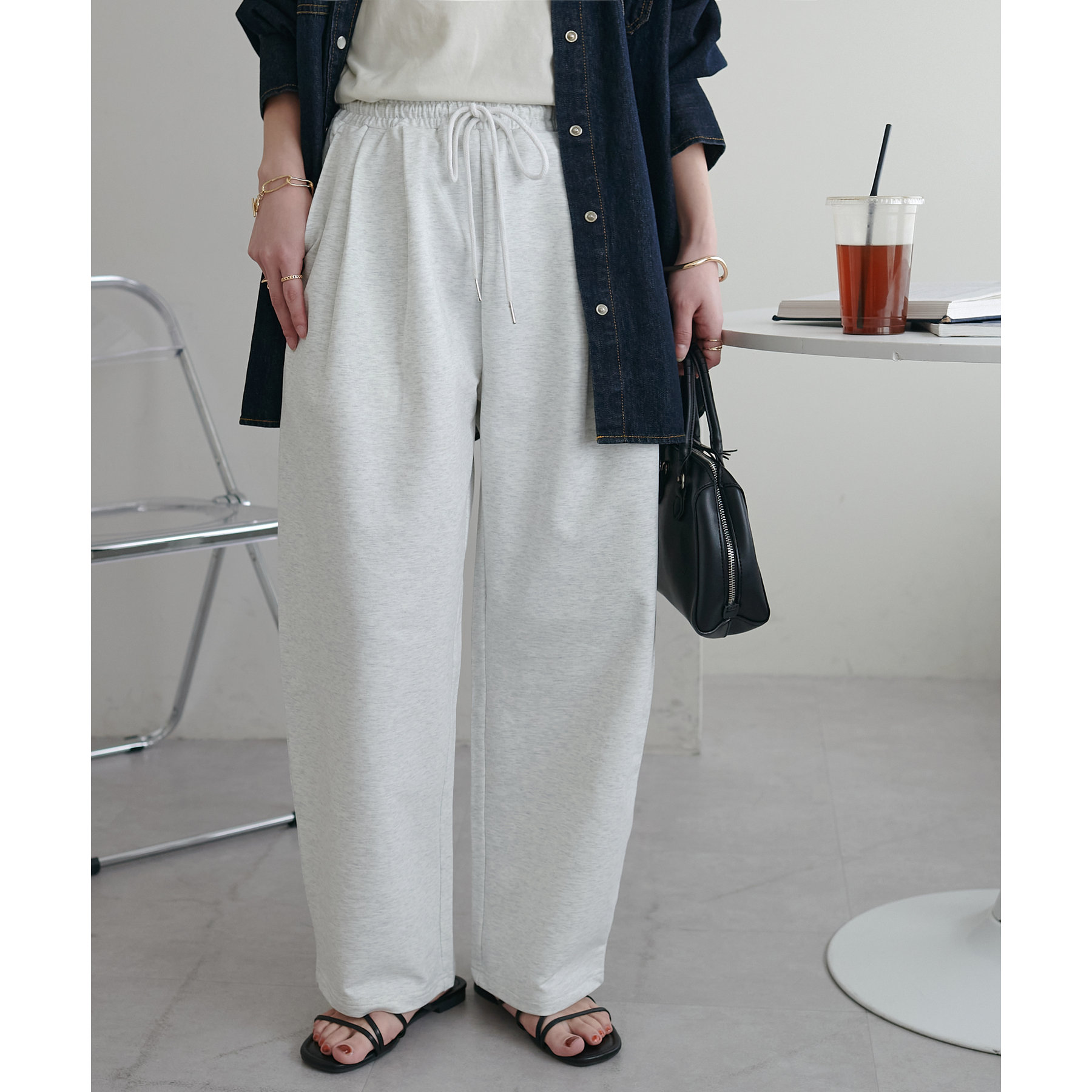カジュアルな印象のスウェットパンツですが、カーブデザインにしたことでこなれ感をプラス!