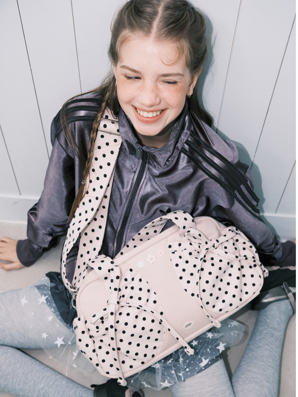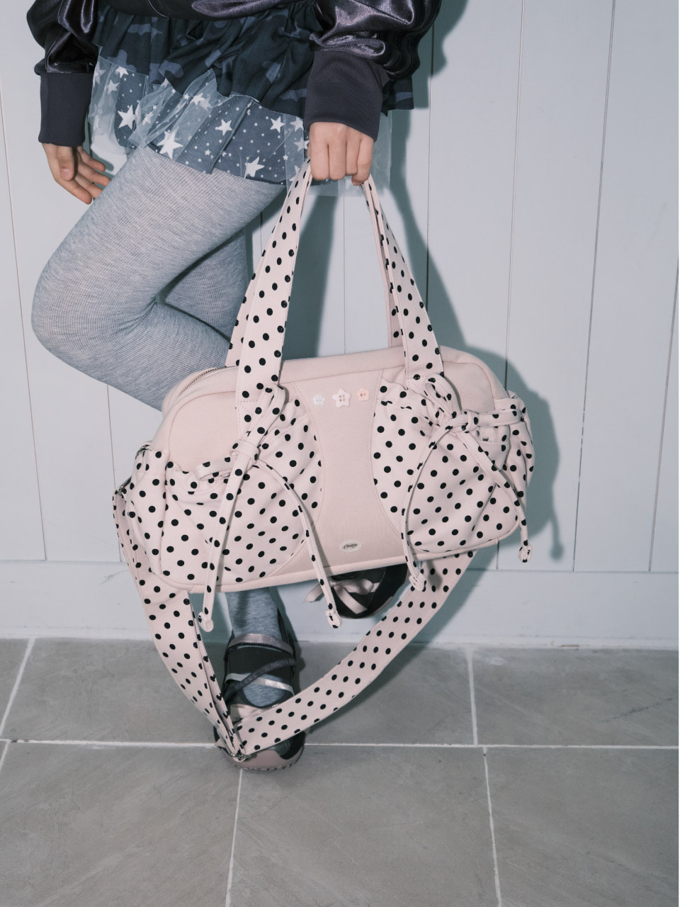 ドット柄と異なる形のボタン、フロントのリボンシャーリングポケットが調和し、