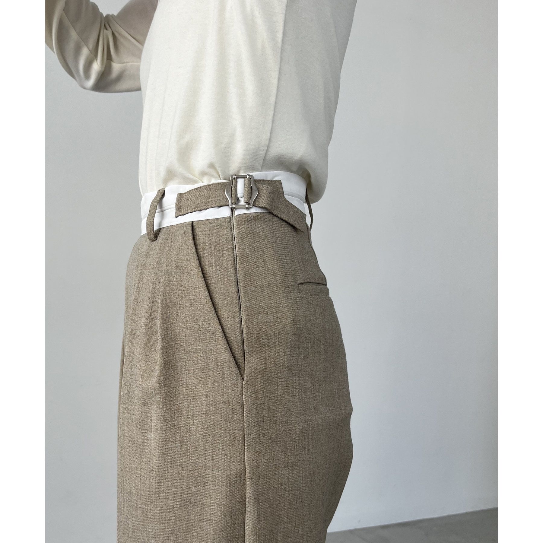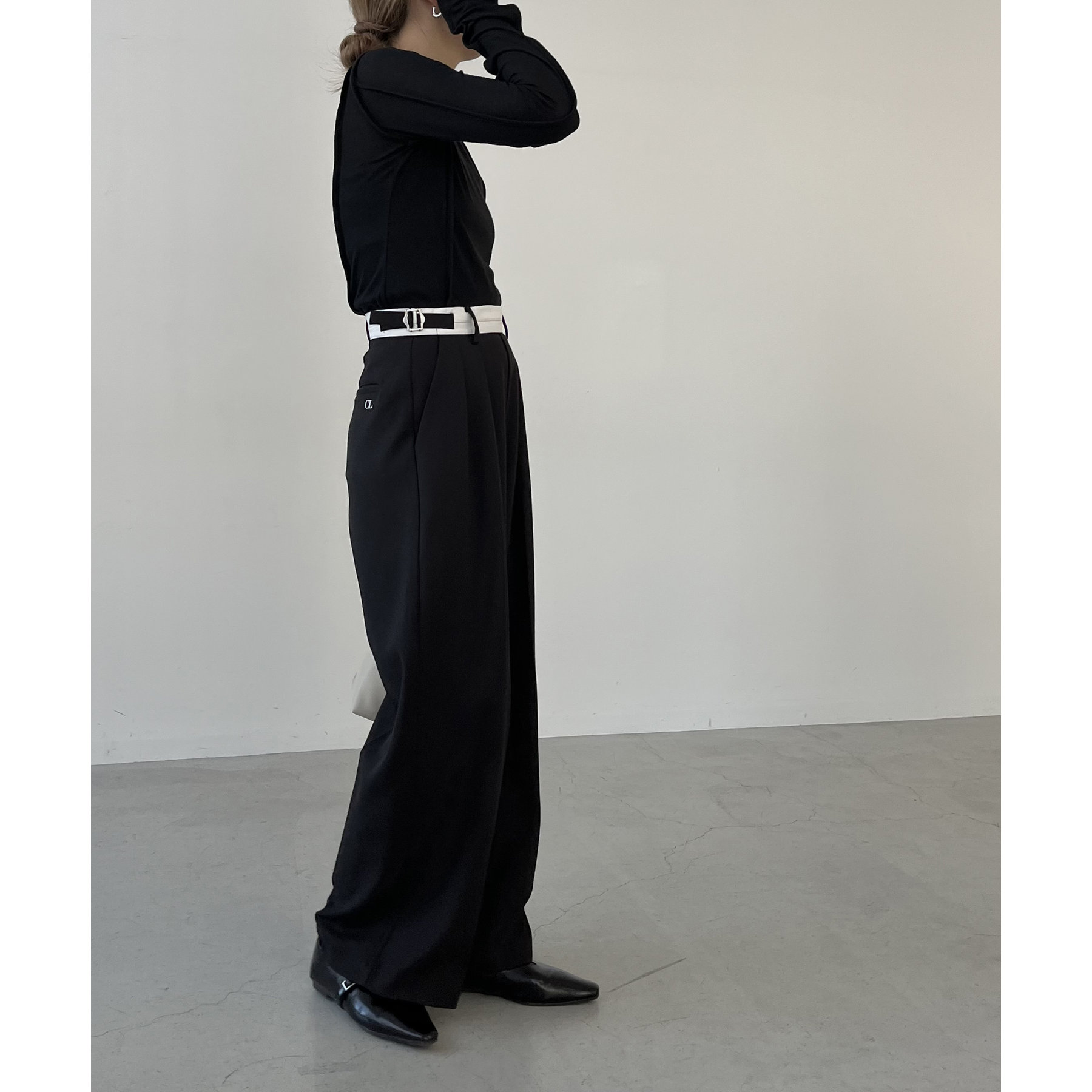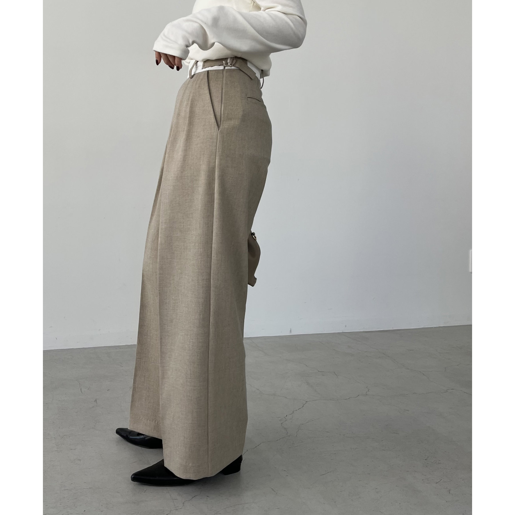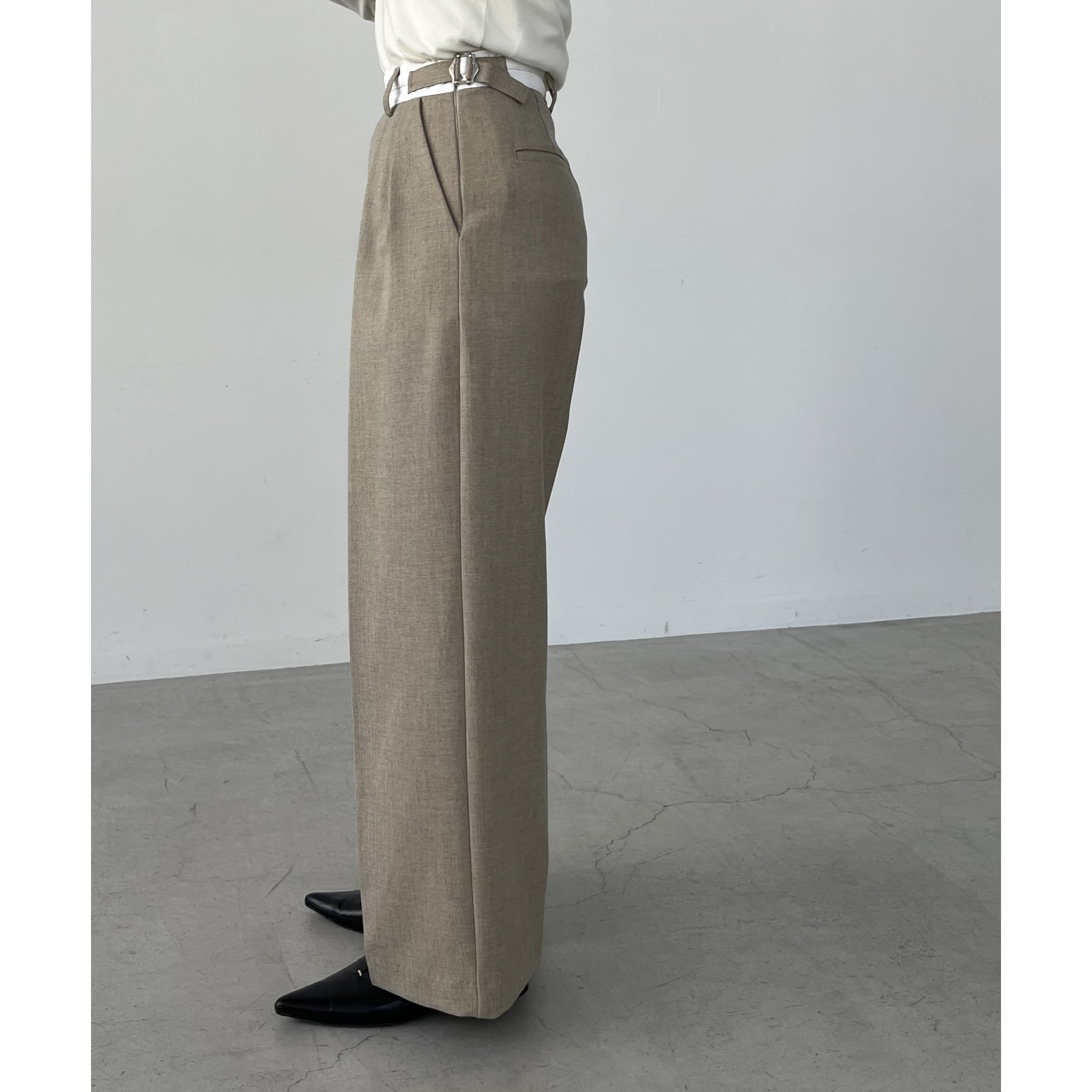 ・サイドのベルトを絞らずローウエストで穿くと、メンズライクでモードなシルエットに