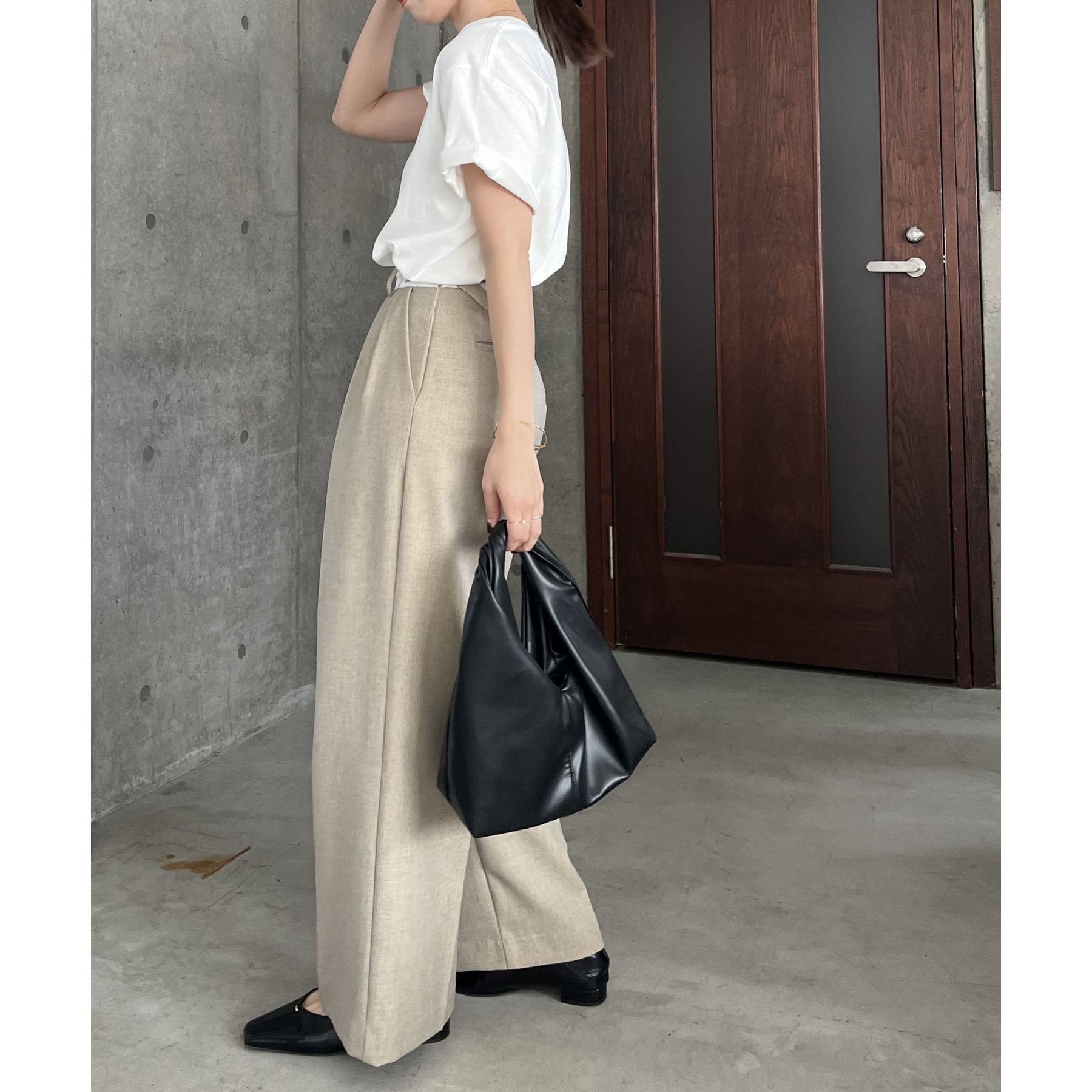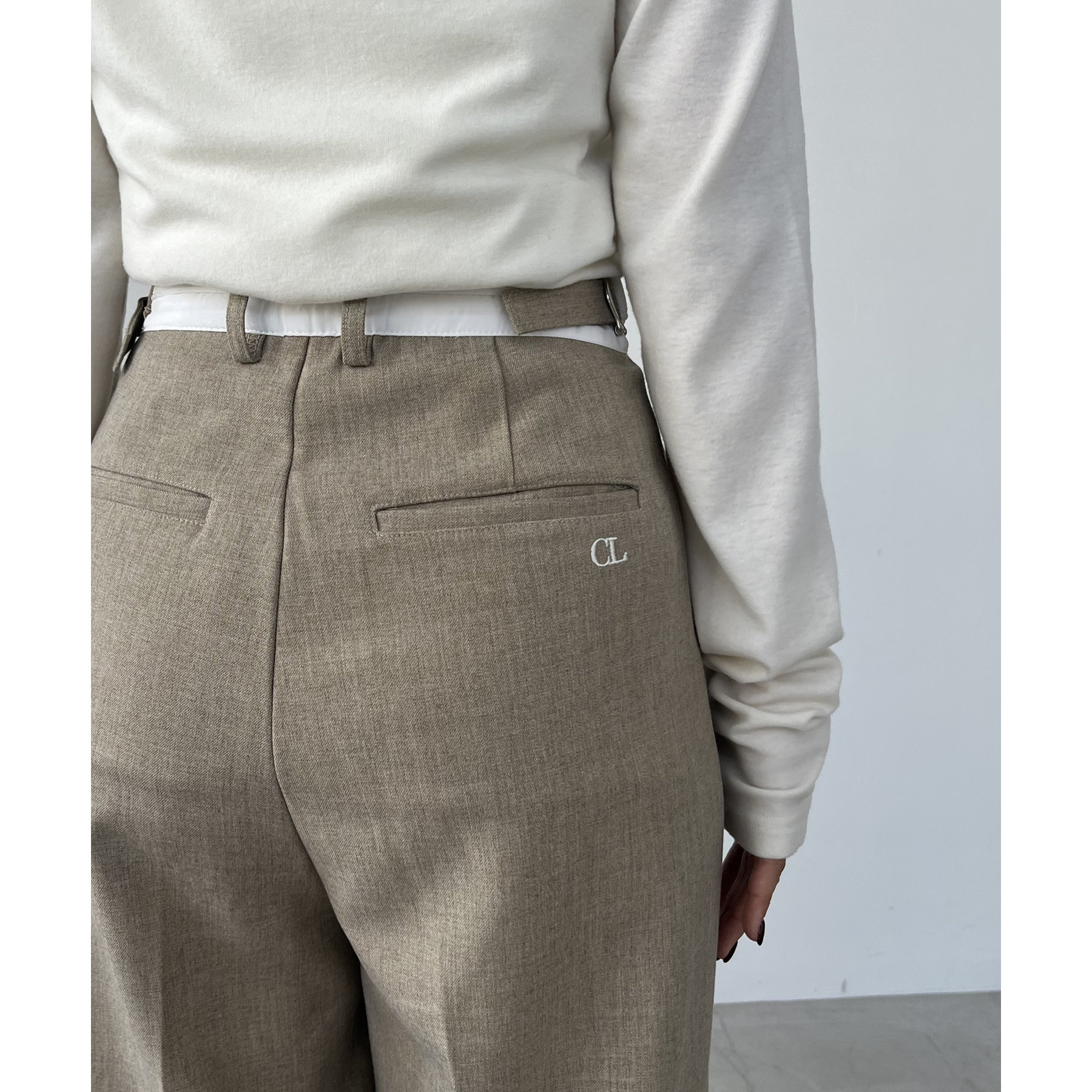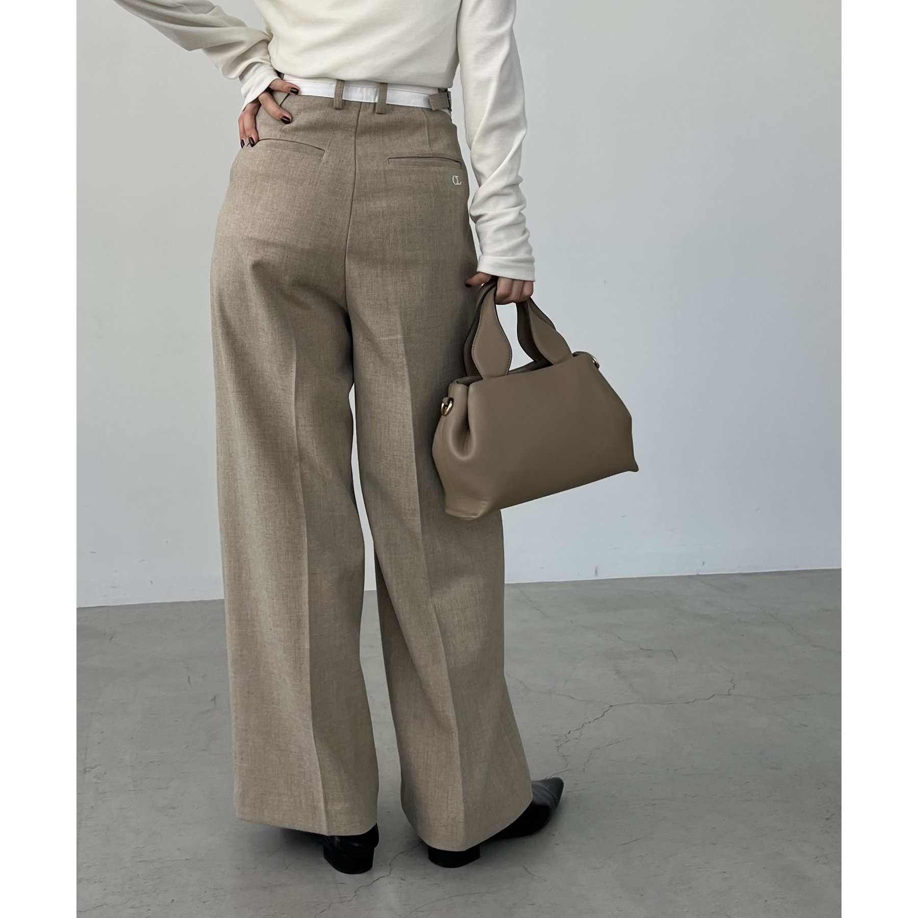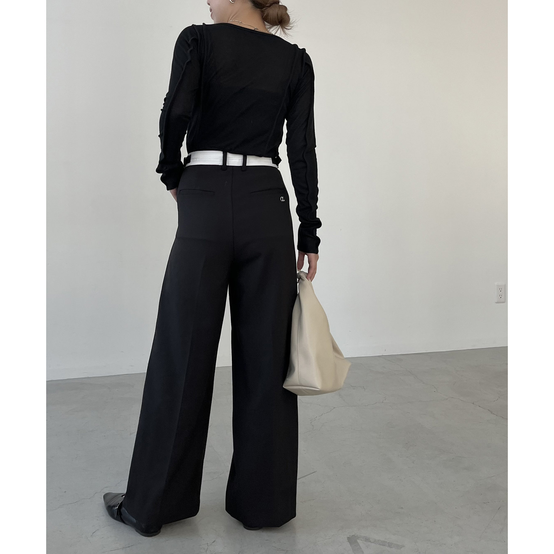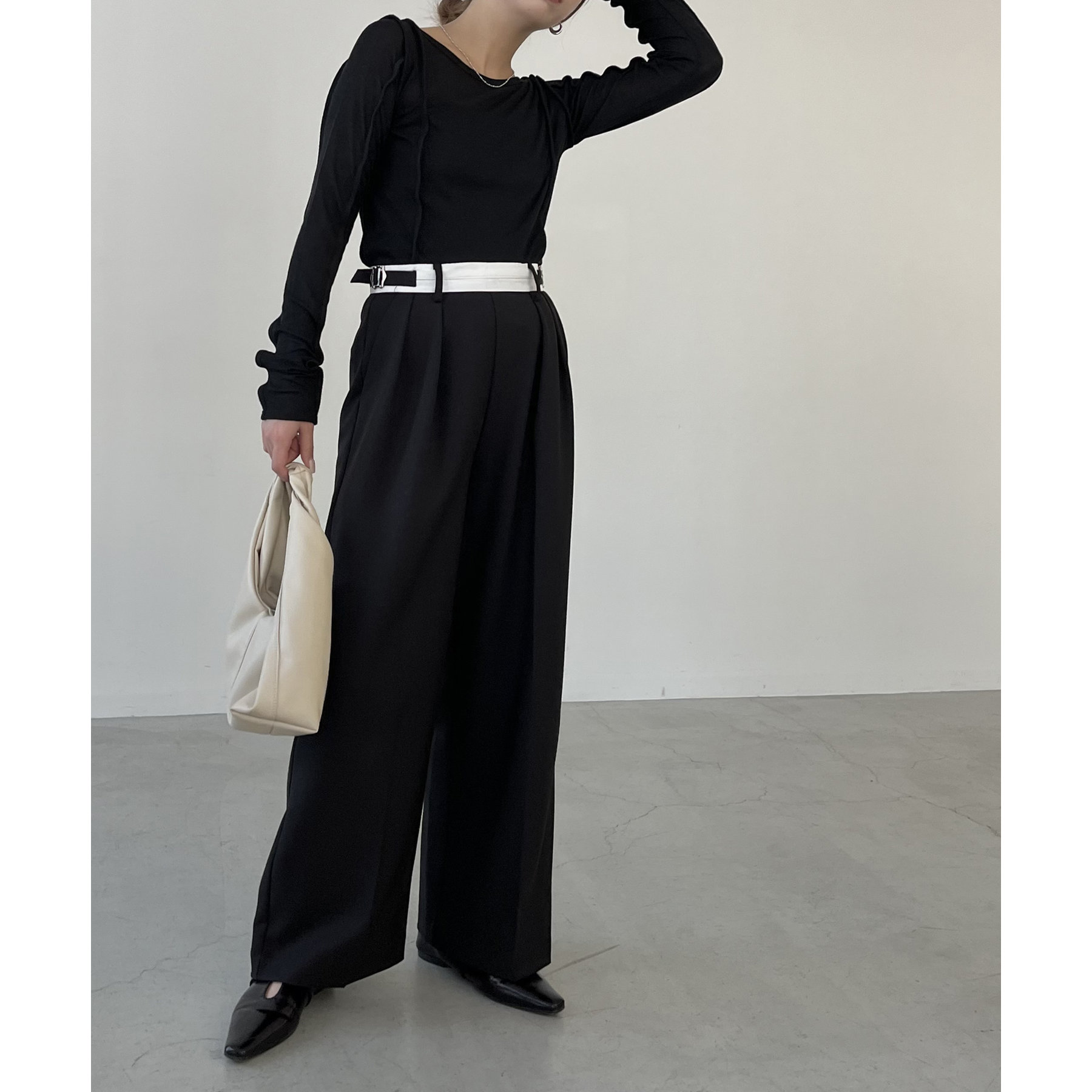 ・サイドのベルトを絞らずローウエストで穿くと、メンズライクでモードなシルエットに