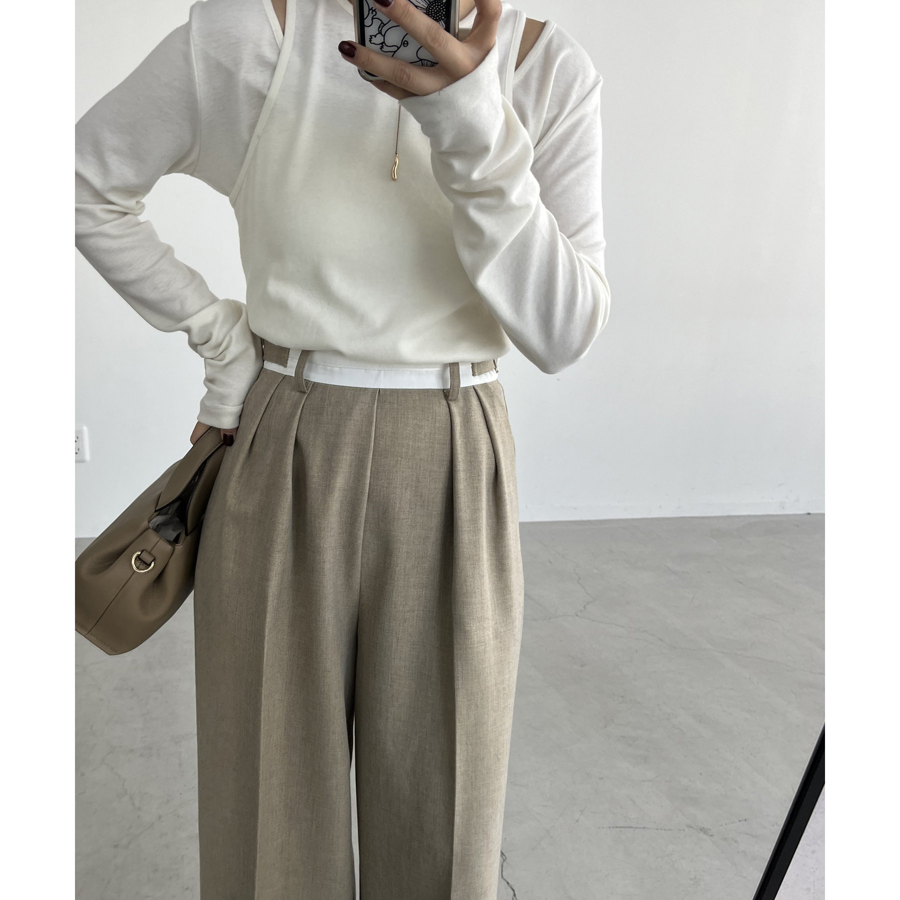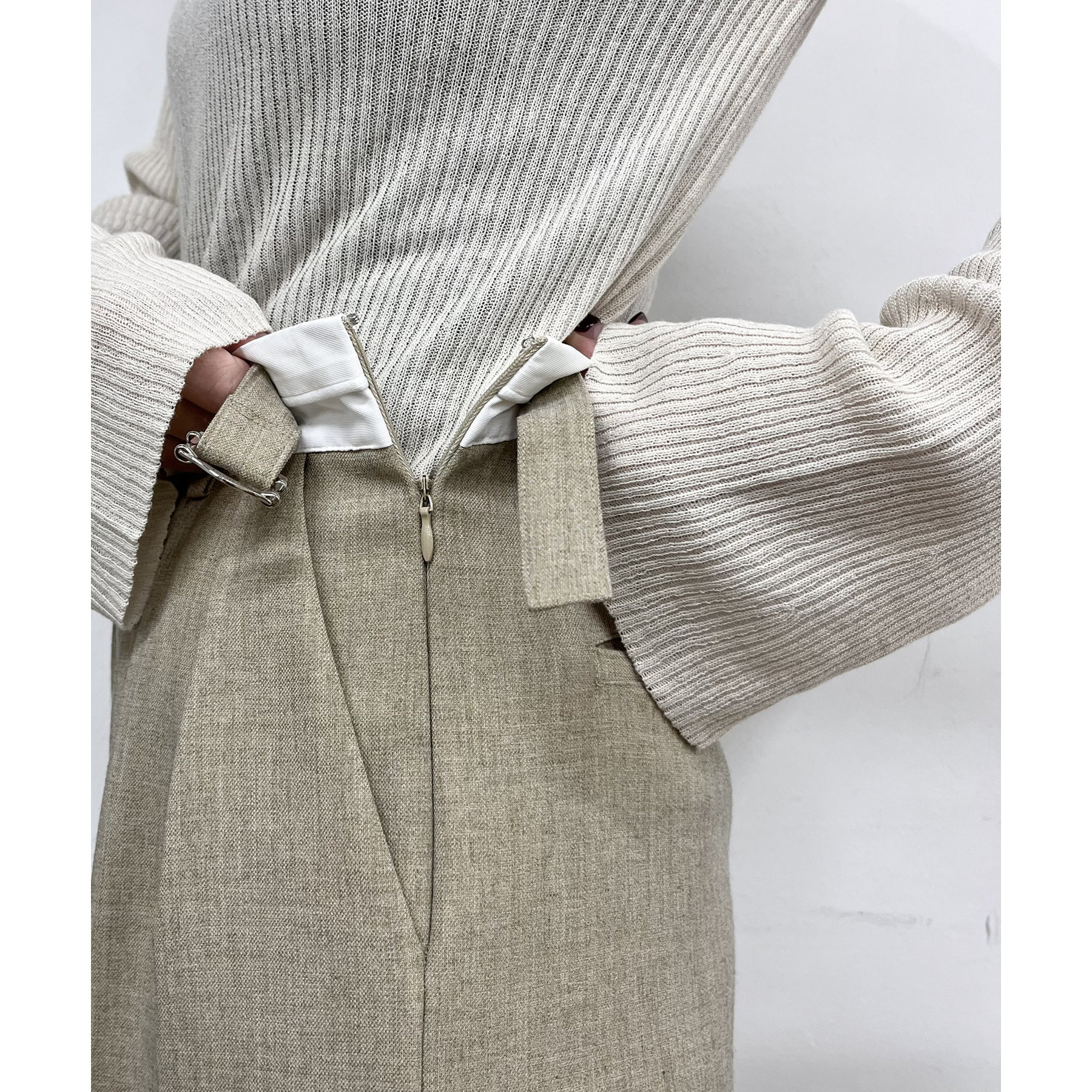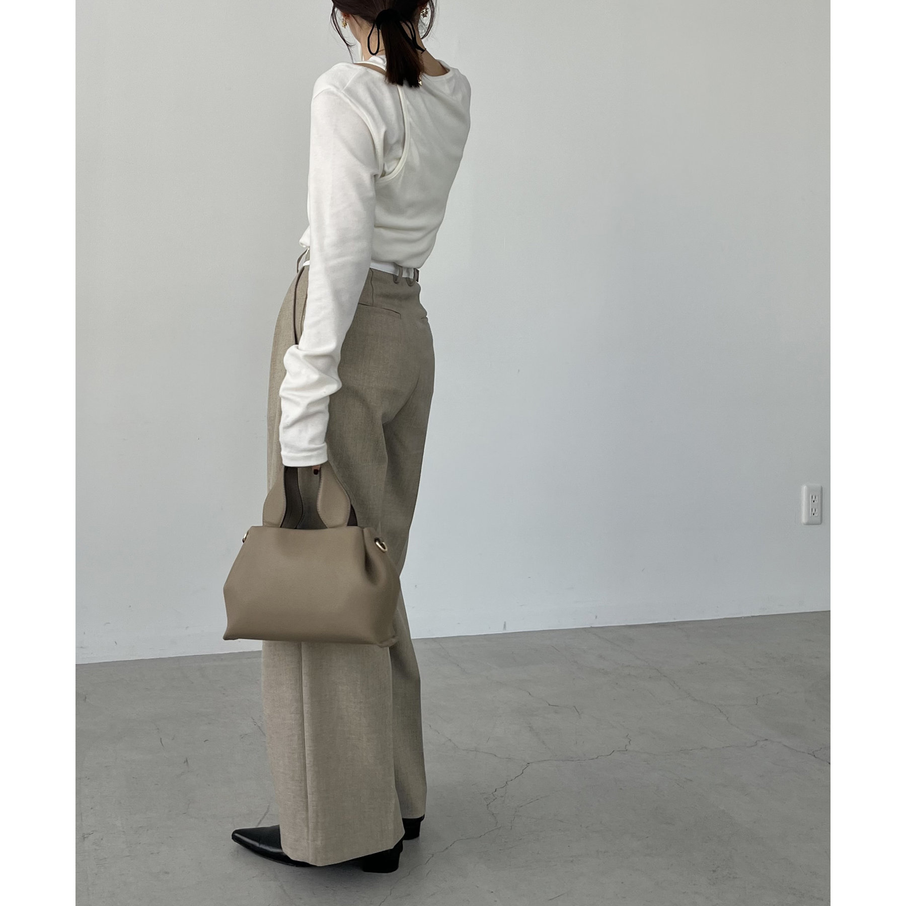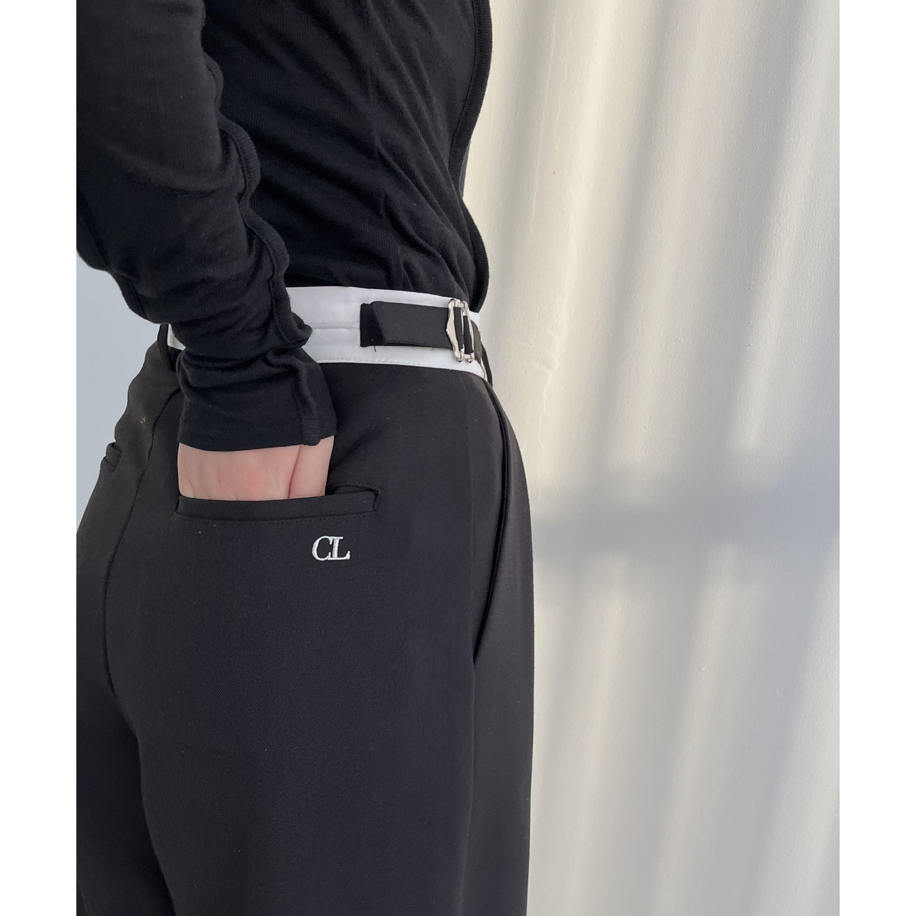 ・サイドのベルトを絞らずローウエストで穿くと、メンズライクでモードなシルエットに