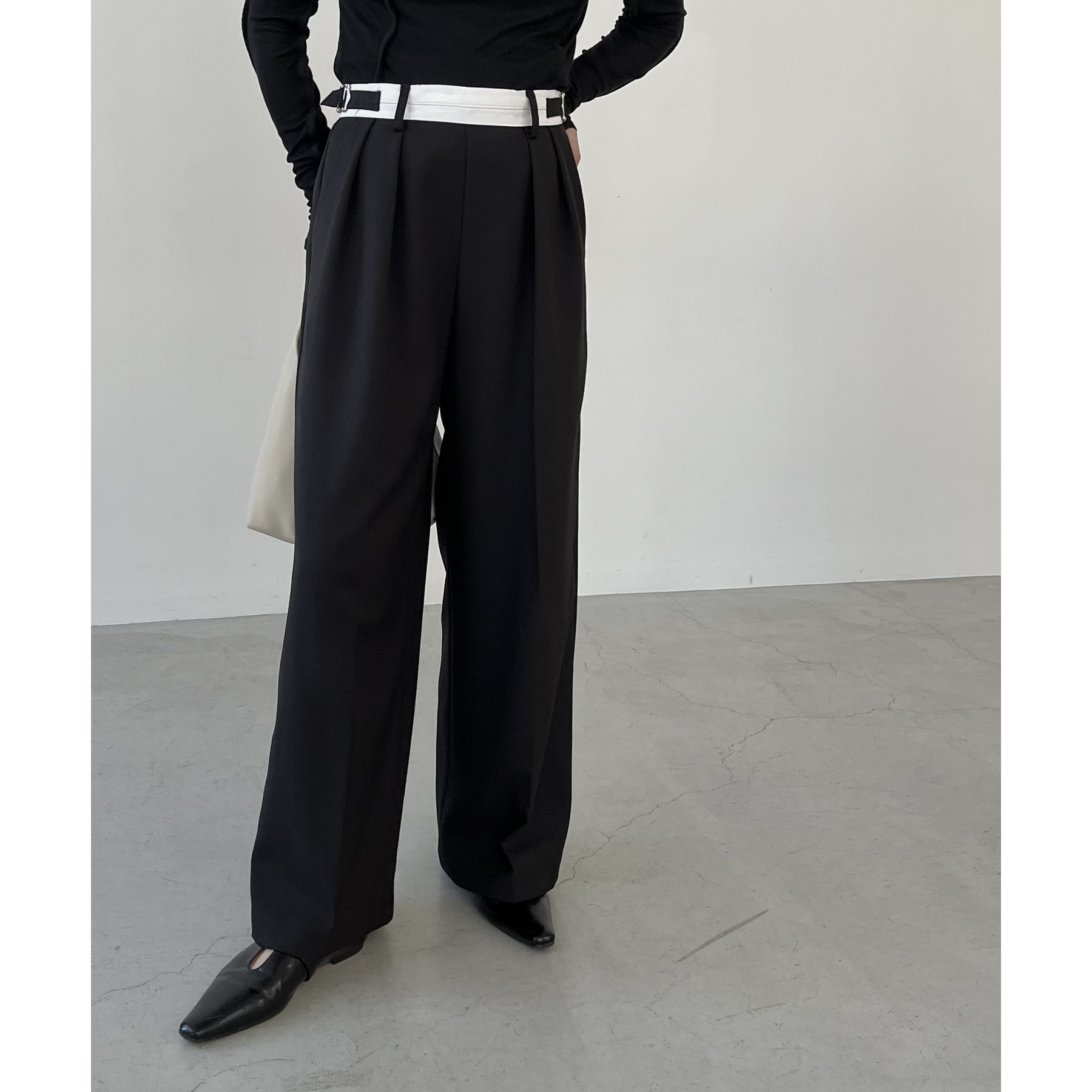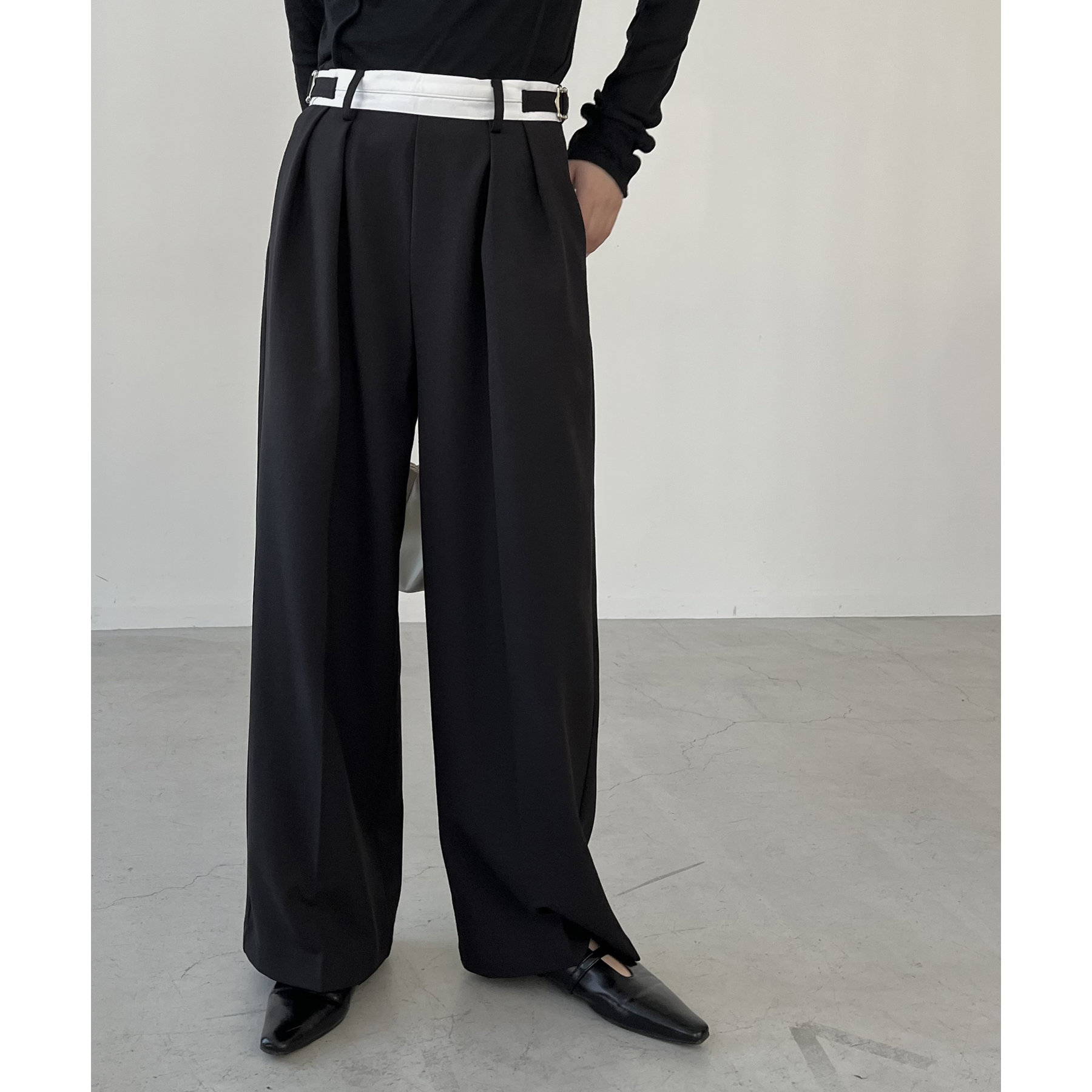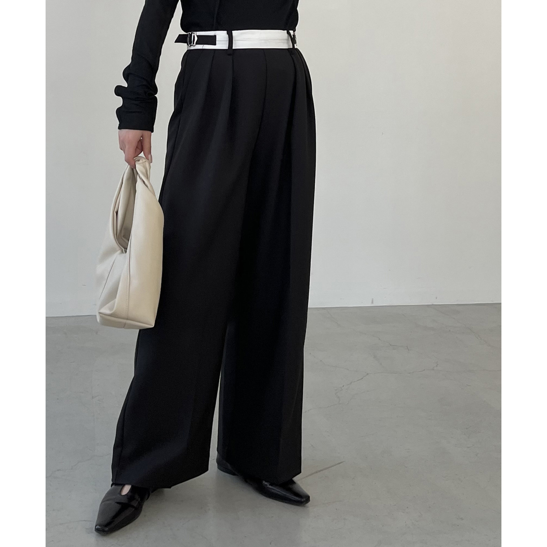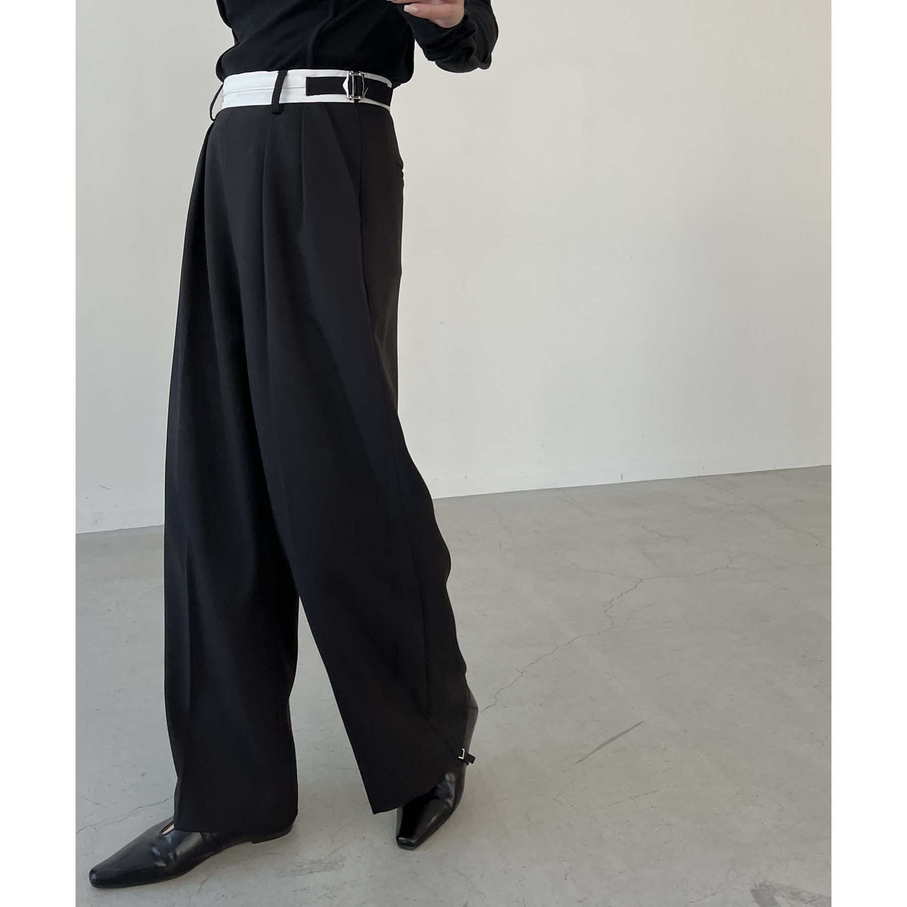 ・インしたときに配色ベルトがポイントになるタックパンツ