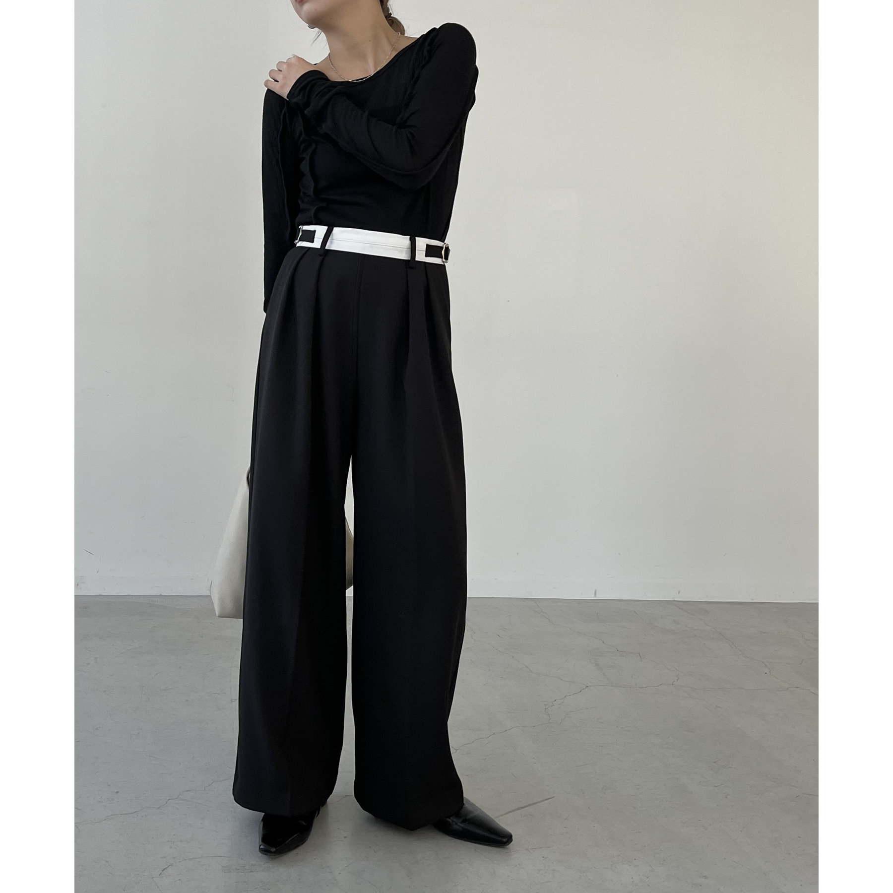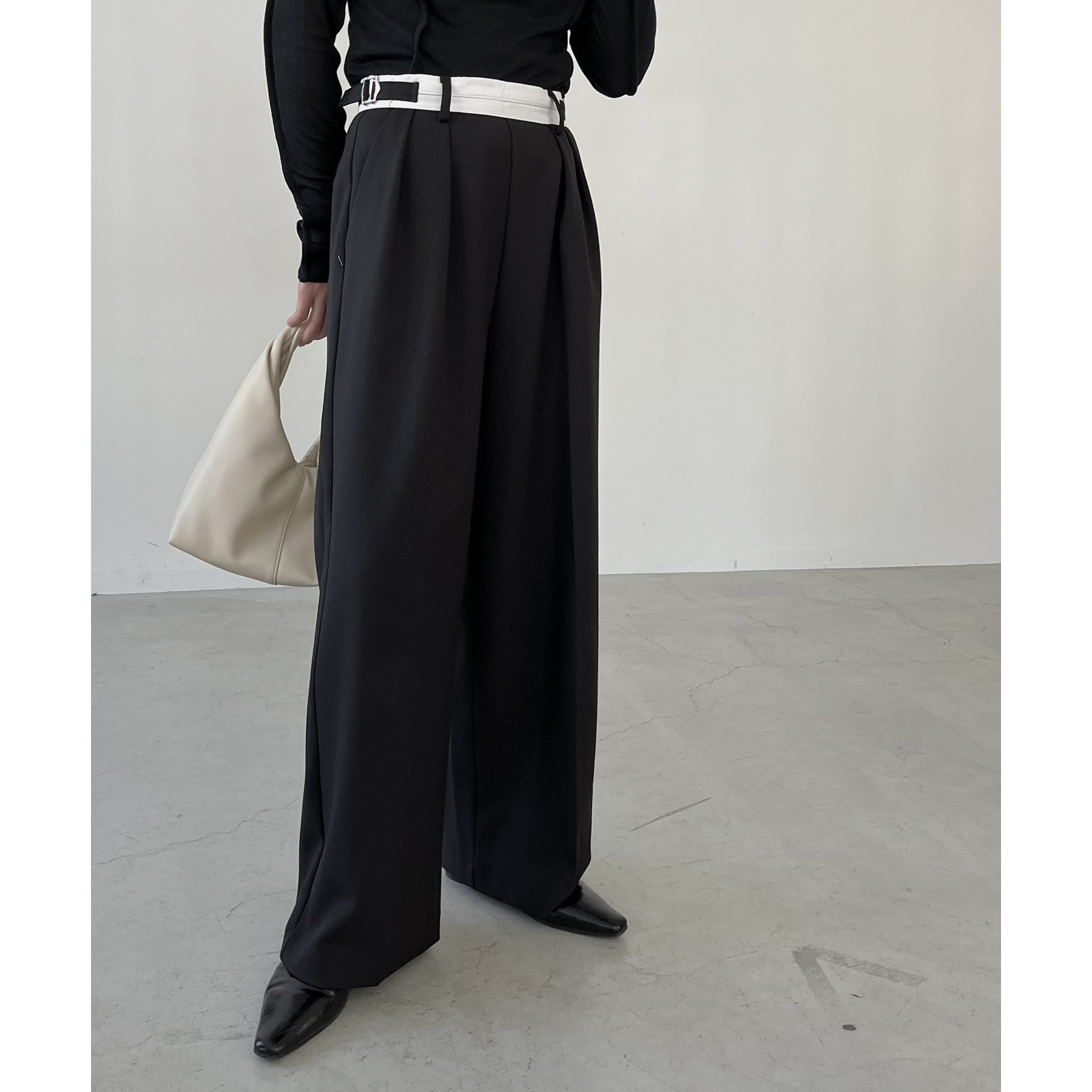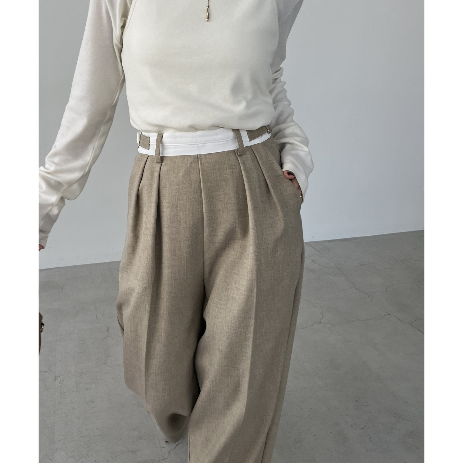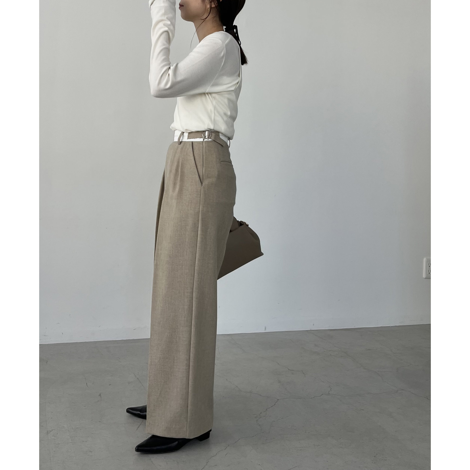 ・インしたときに配色ベルトがポイントになるタックパンツ