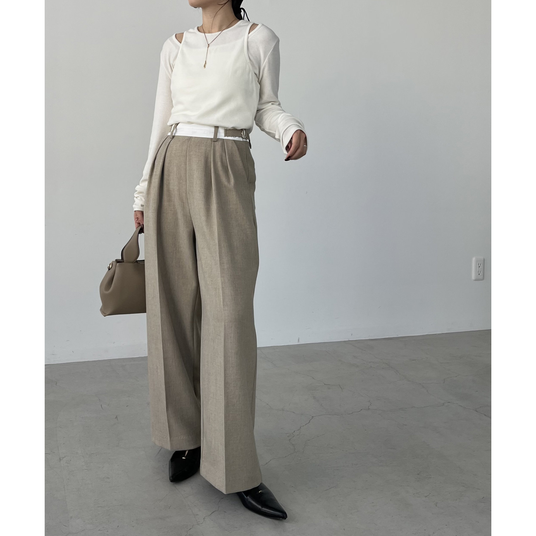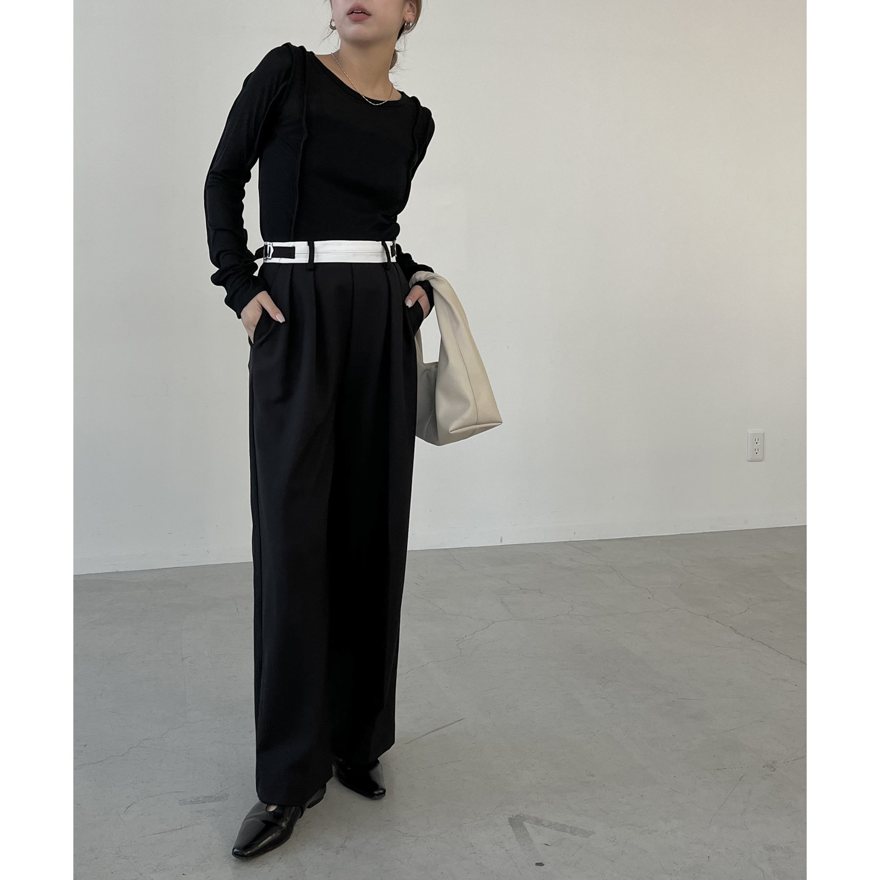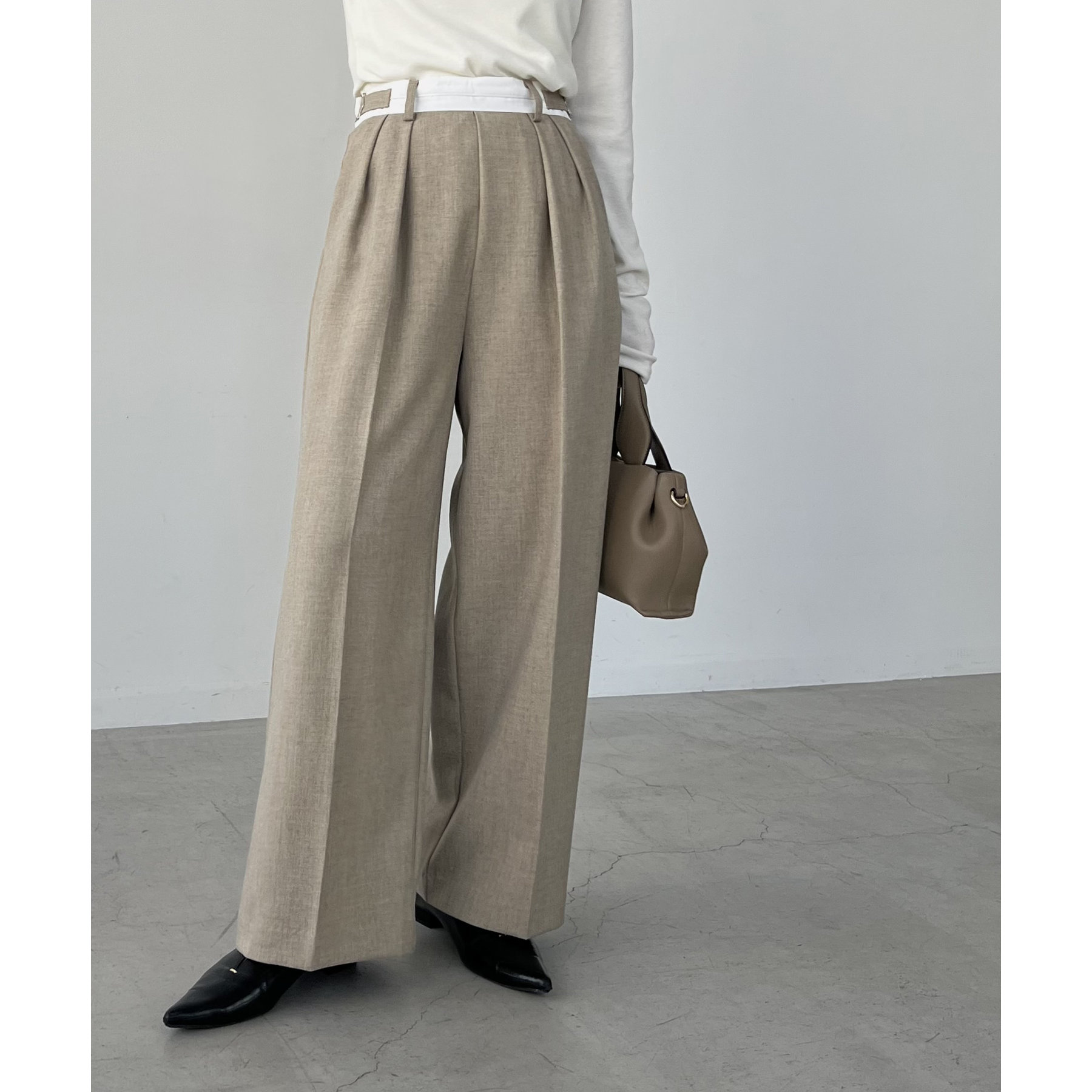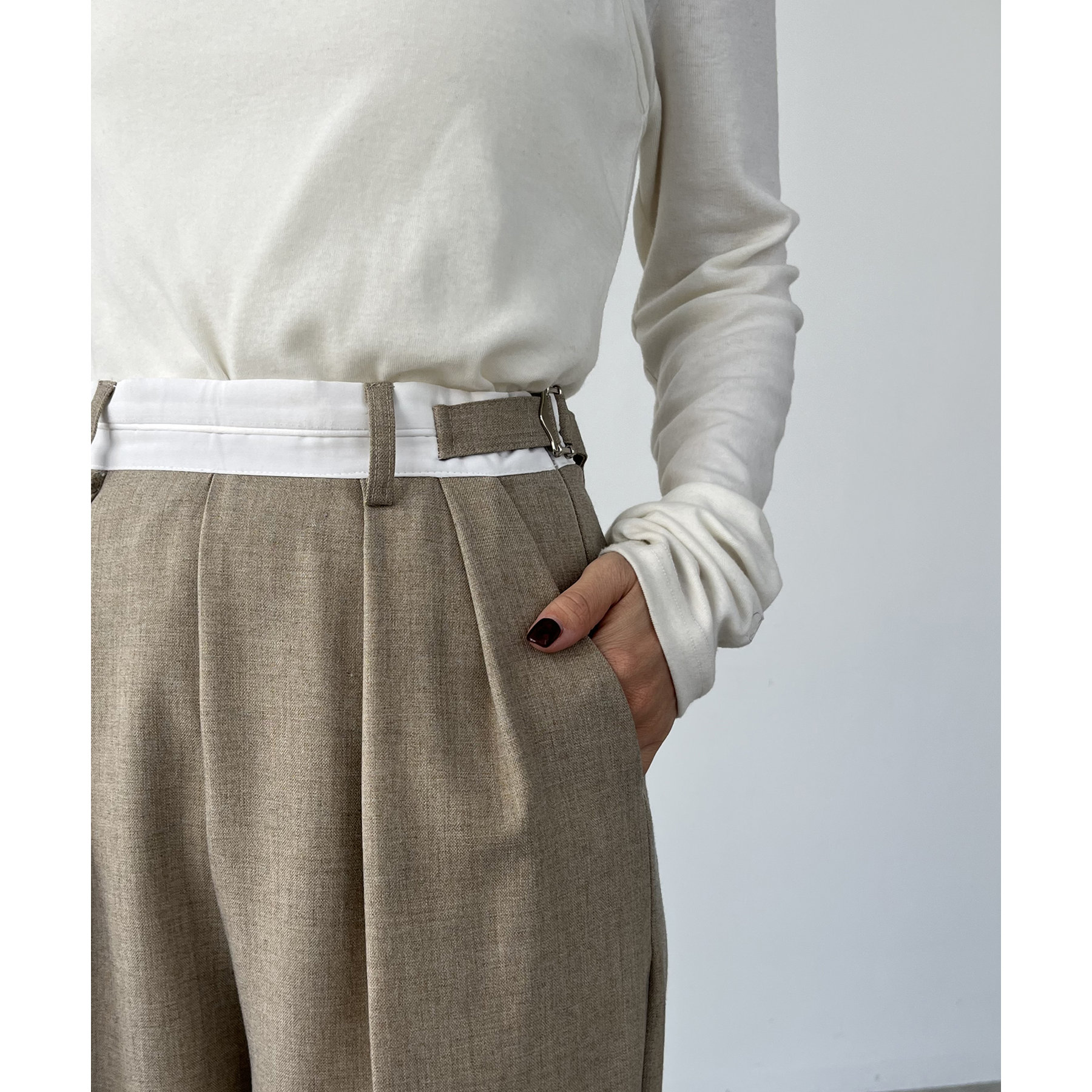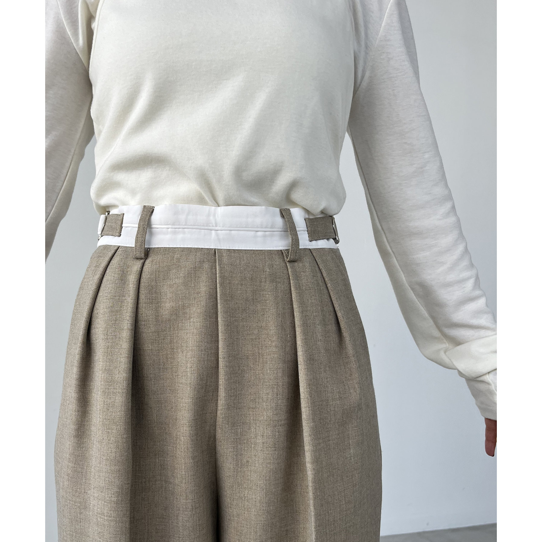 ・インしたときに配色ベルトがポイントになるタックパンツ