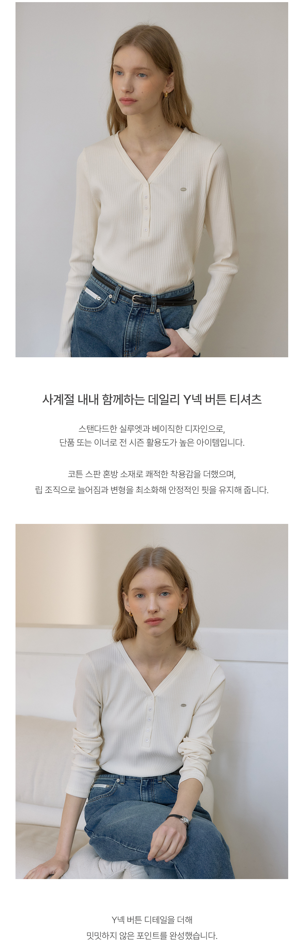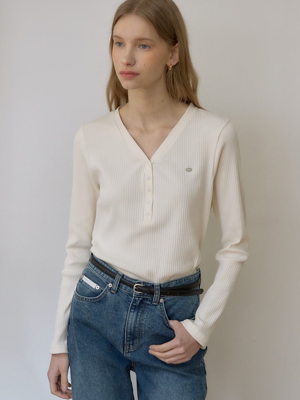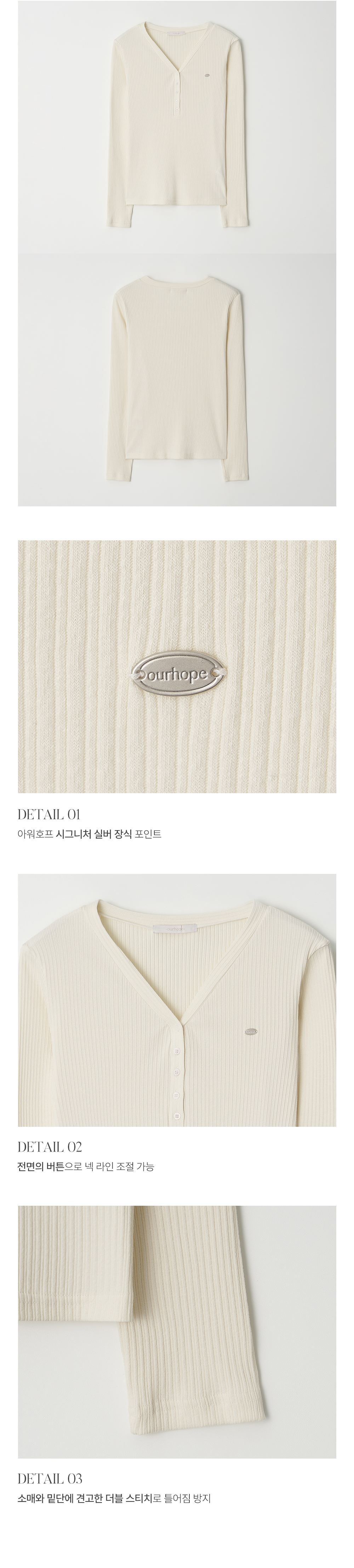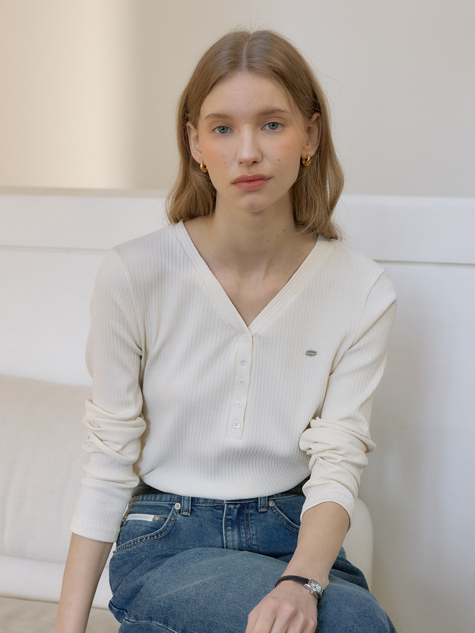 Logo V-neck Button Sleeves T-shirt - Cream